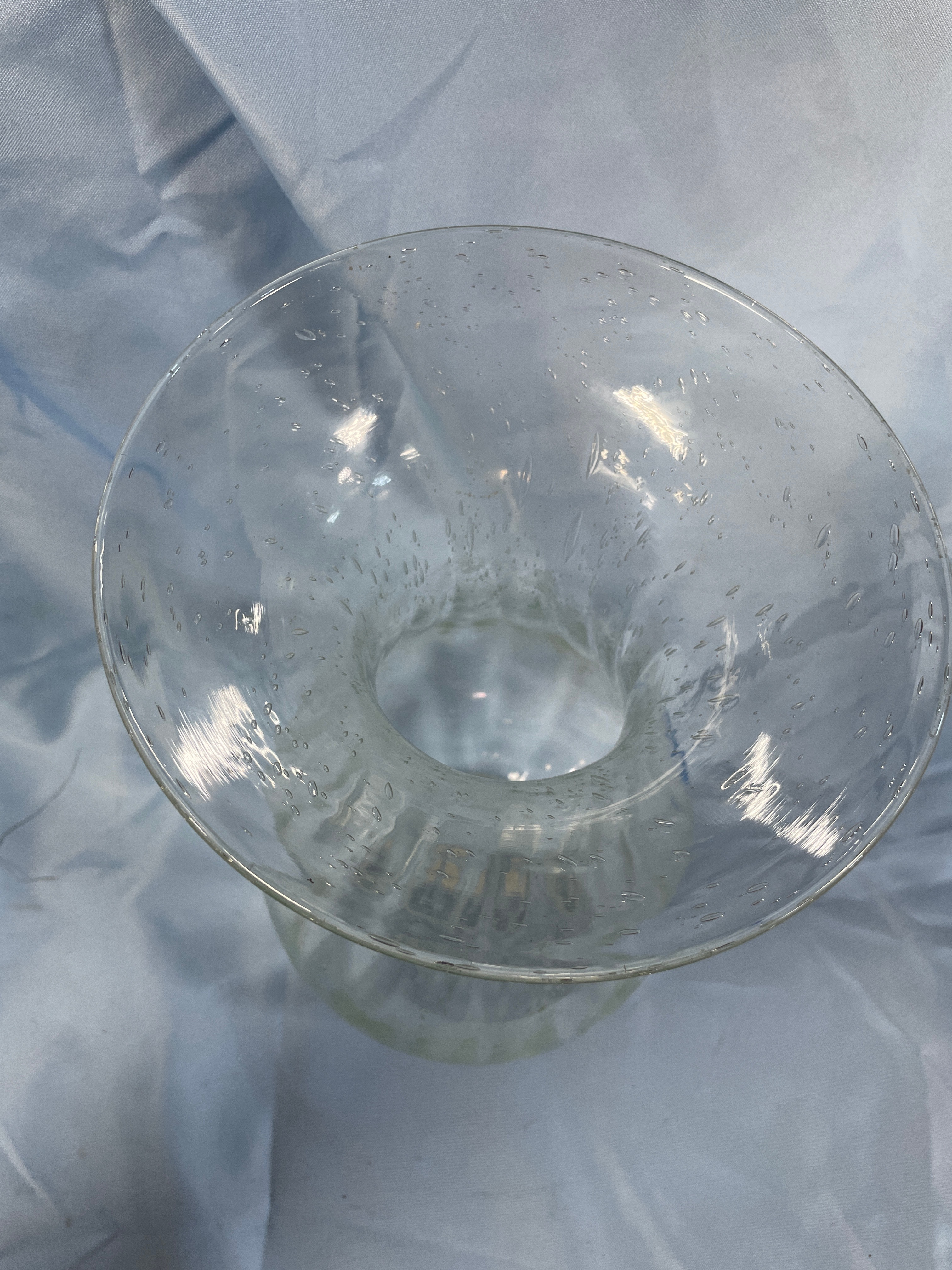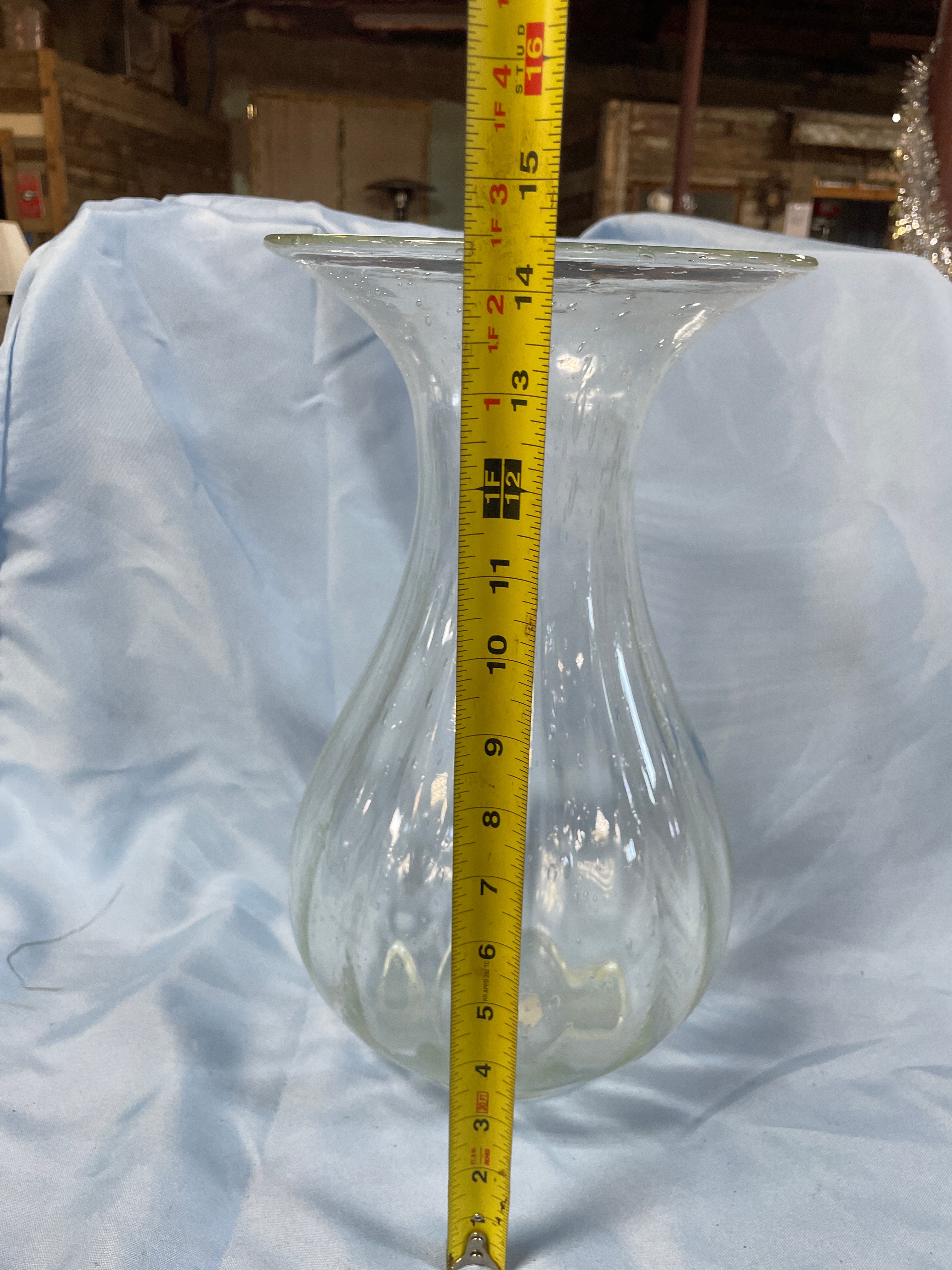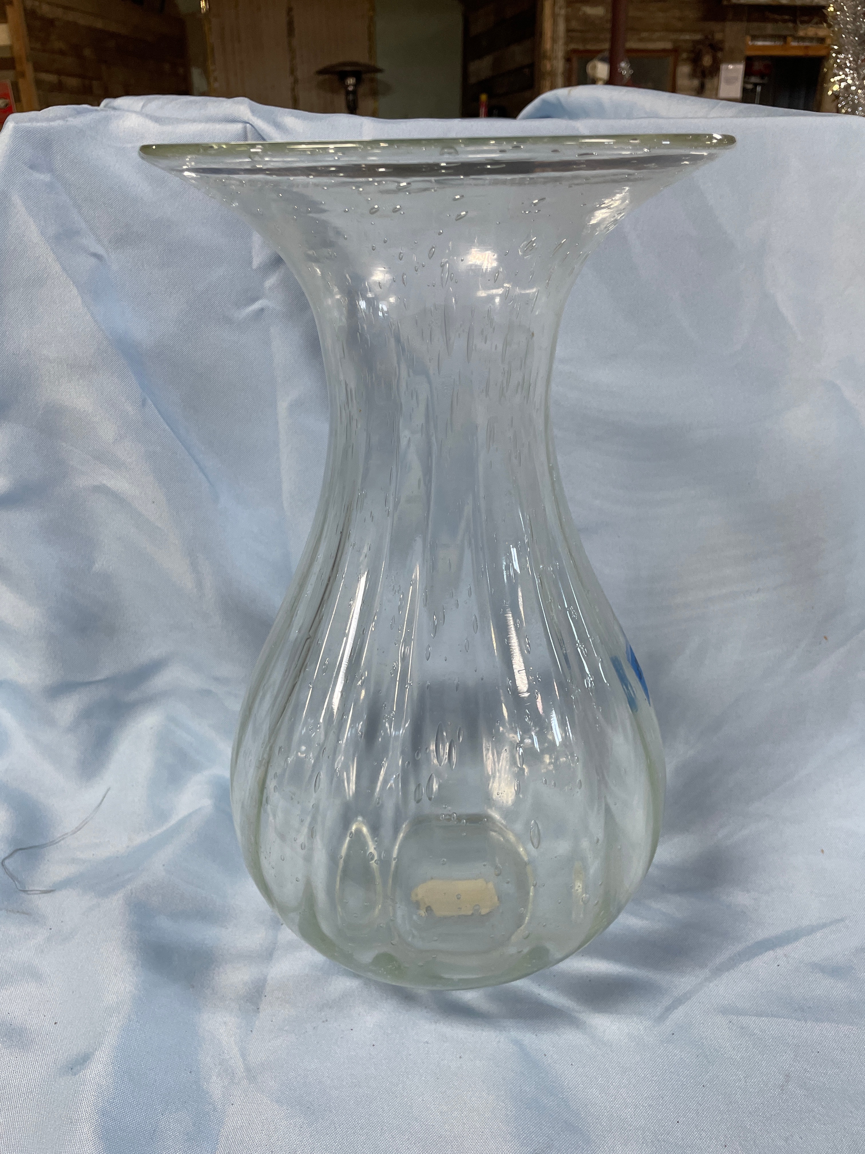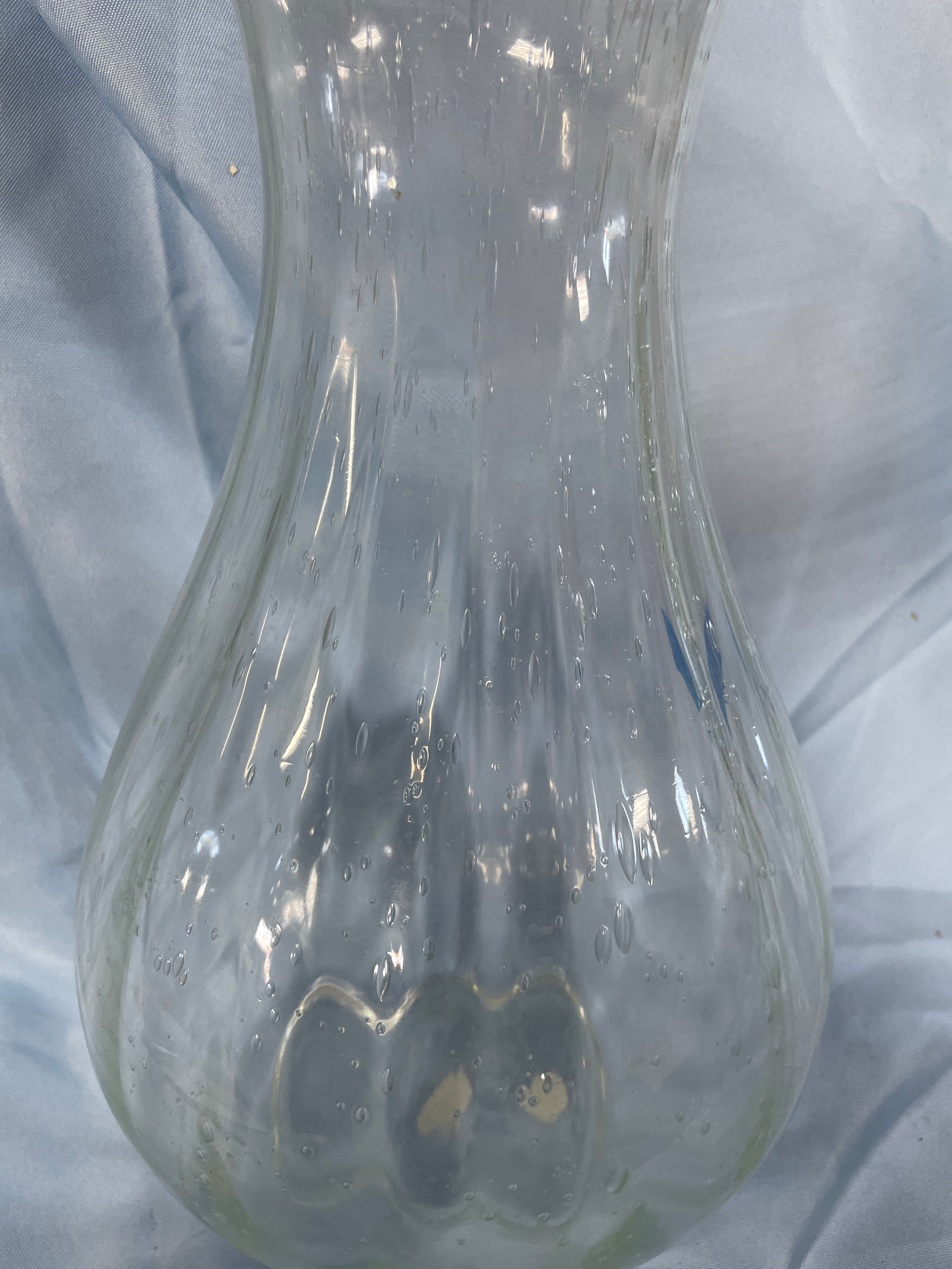 A clear glass vase, approximately 13 inches tall, featuring a flared rim, a wide body, and numerous small air bubbles embedded throughout the glass.