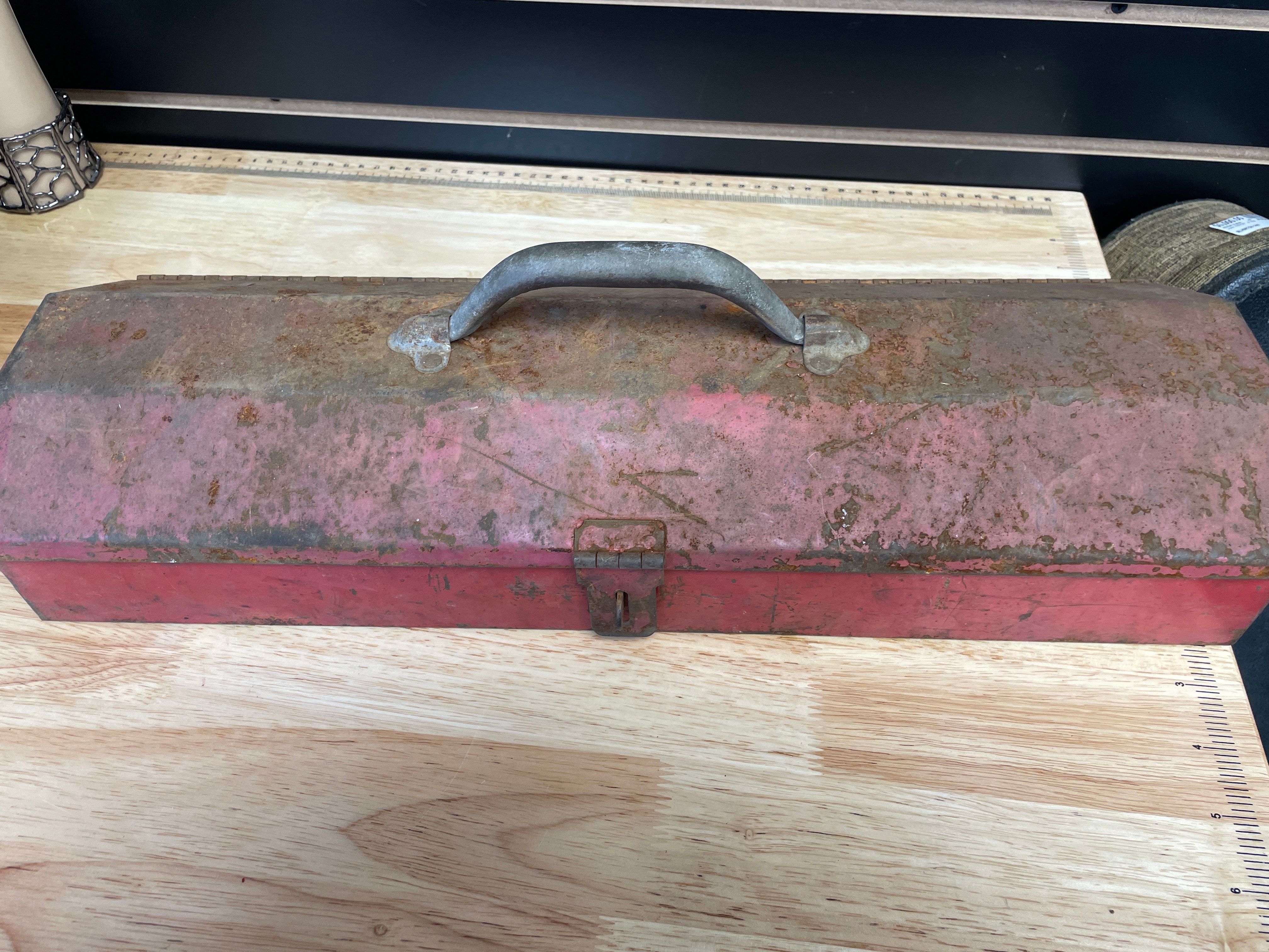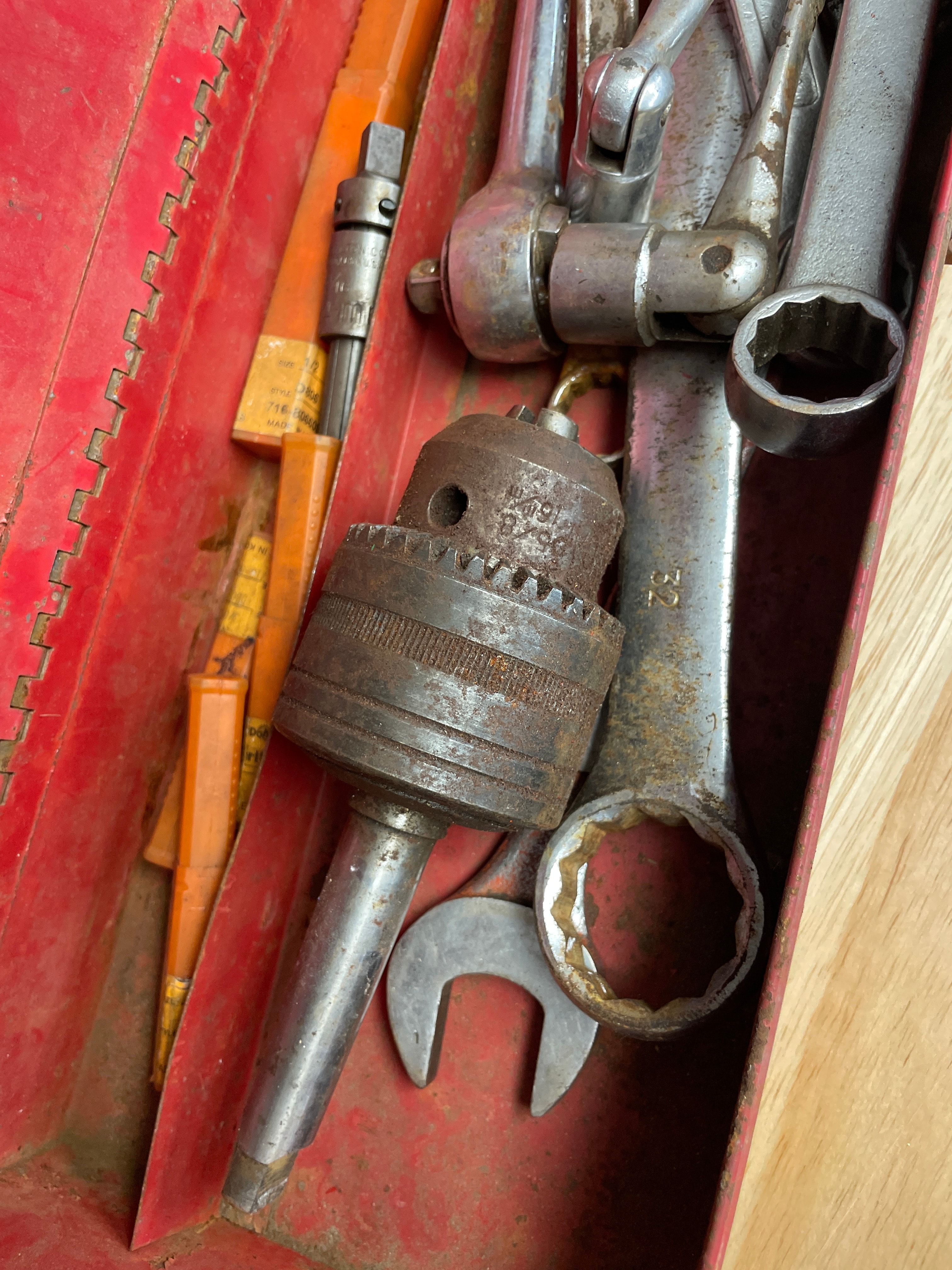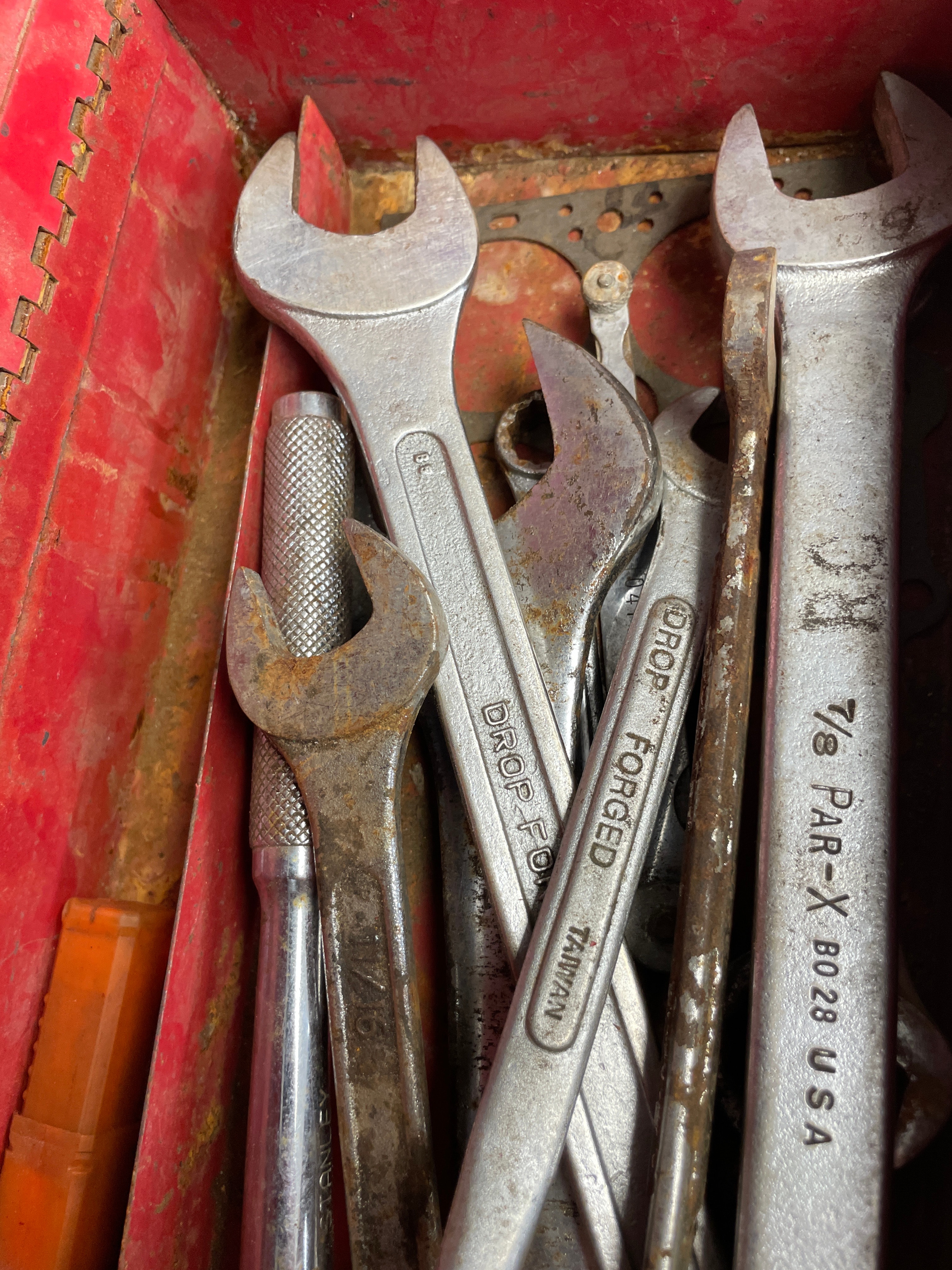 A Craftsman red painted metal toolbox, rectangular in shape with a hinged lid and a fixed metal handle. It contains a varied assortment of metal hand tools, primarily wrenches and a drill chuck. Visible markings on the tools include "7/8 PAR-X 8028 USA, " "DROP FORGED TAIWAN, " and "JACOBS CHUCK, " with others showing sizes like "5/8" and "32." The tools generally appear to be steel.