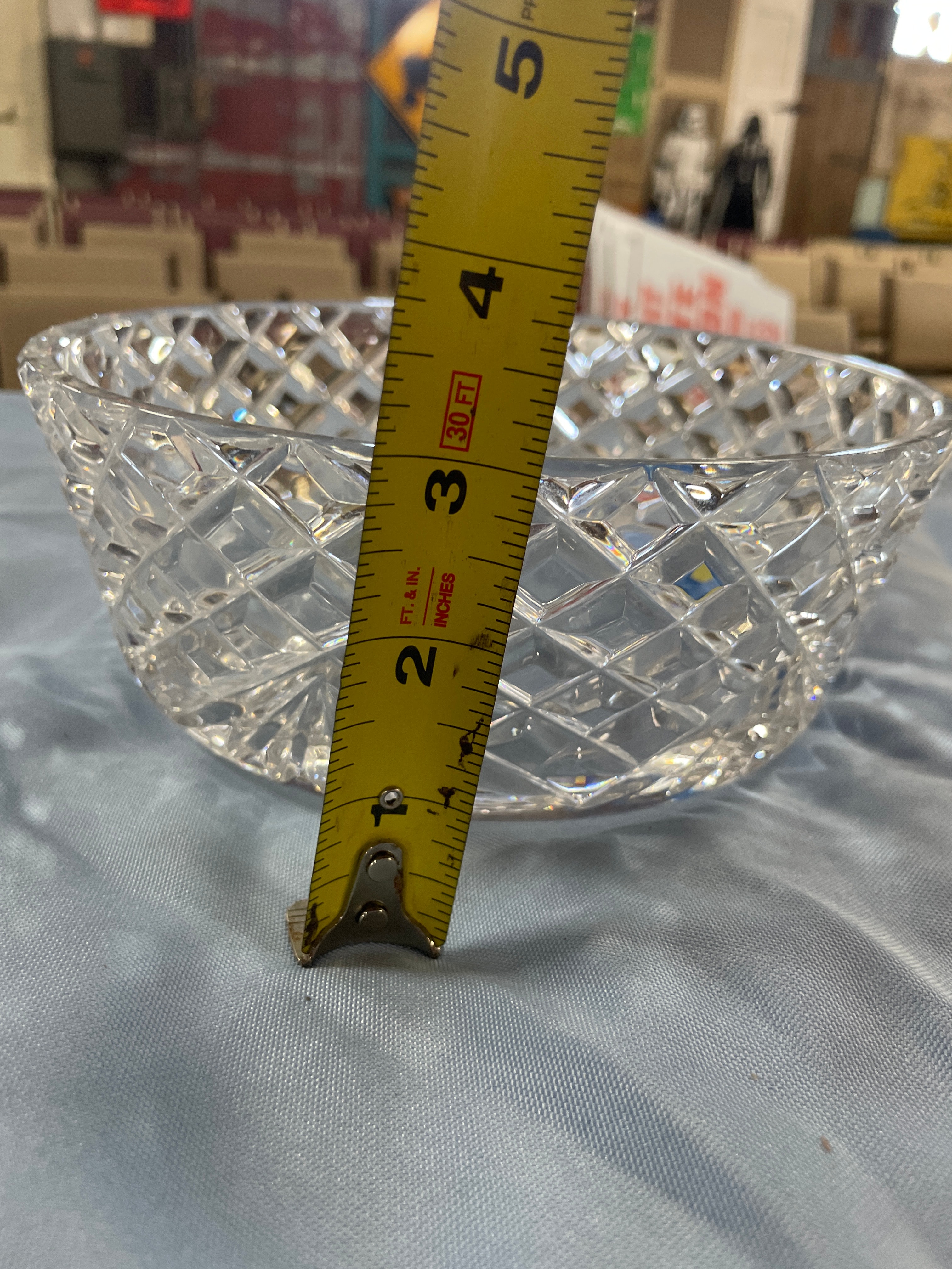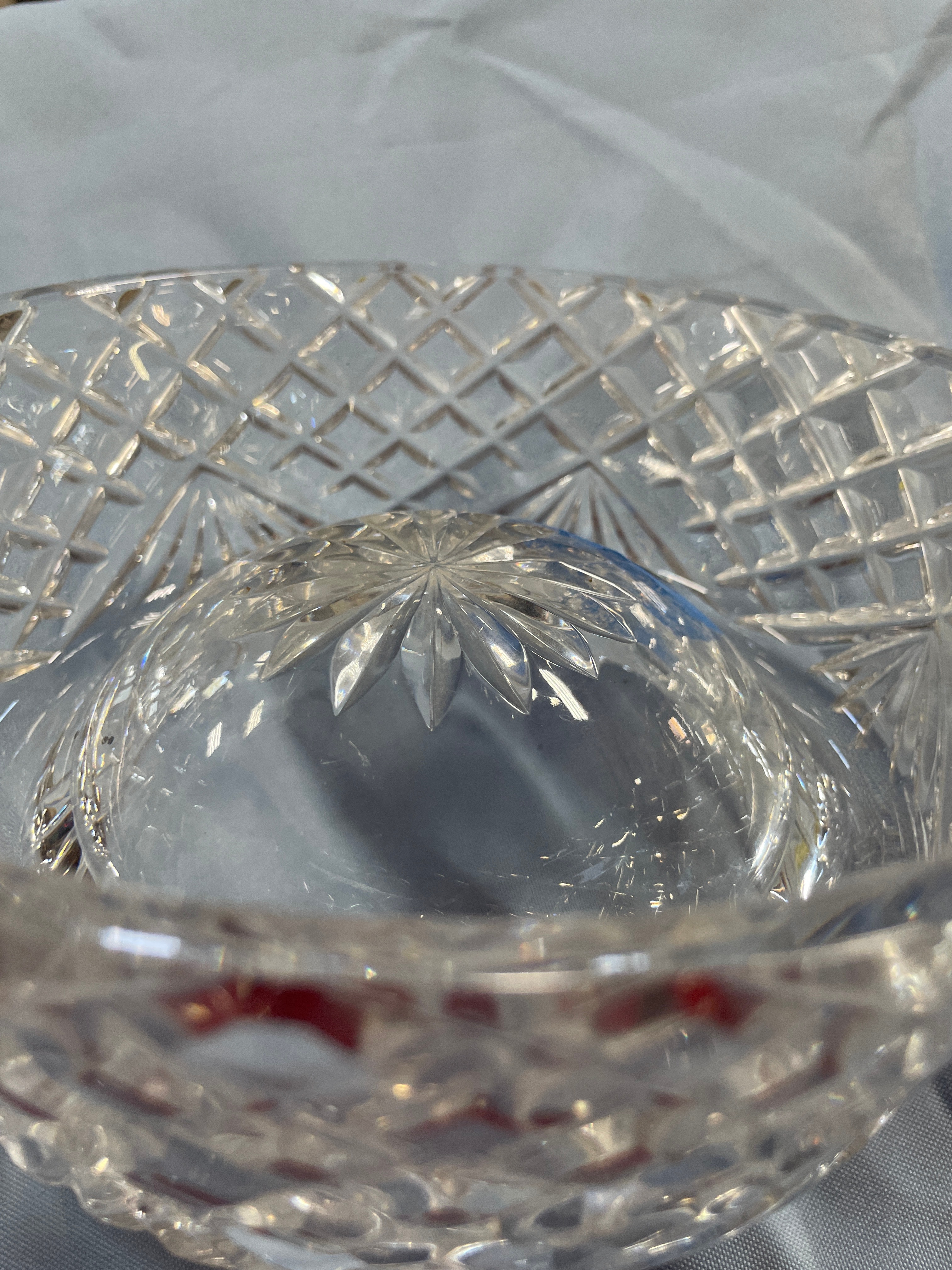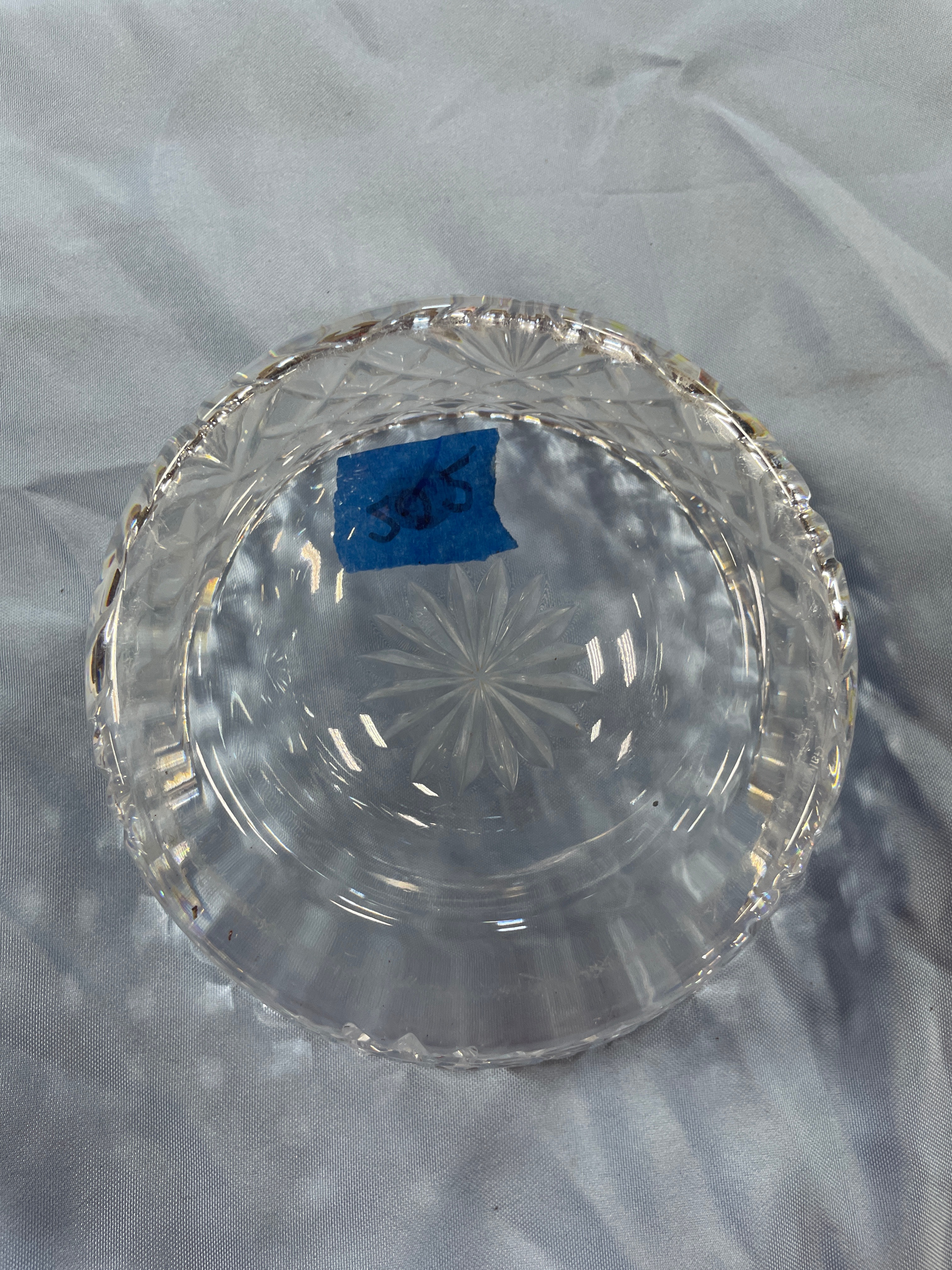 crystal bowl with a diamond cut pattern, approximately 6 inches in diameter and 3 inches high.