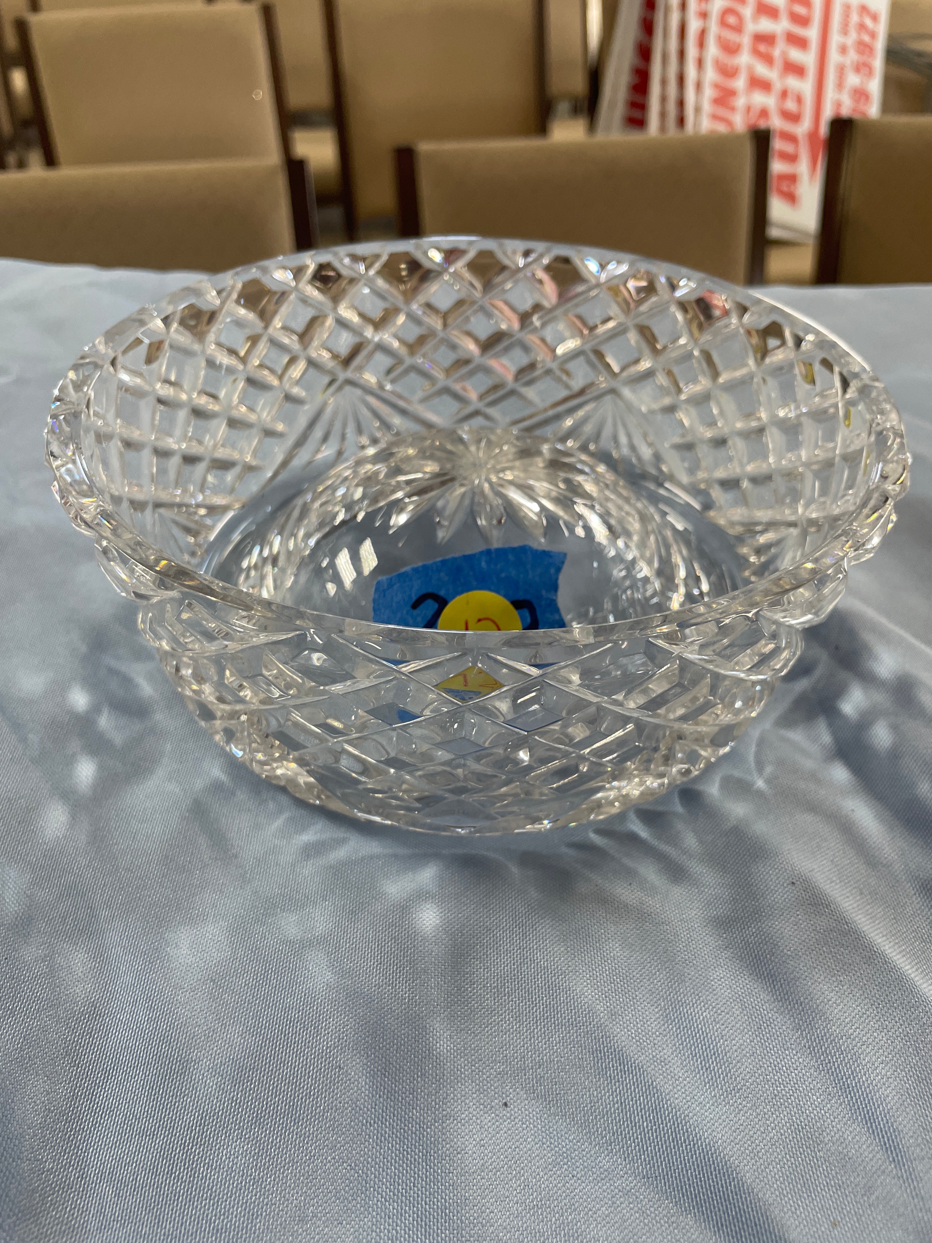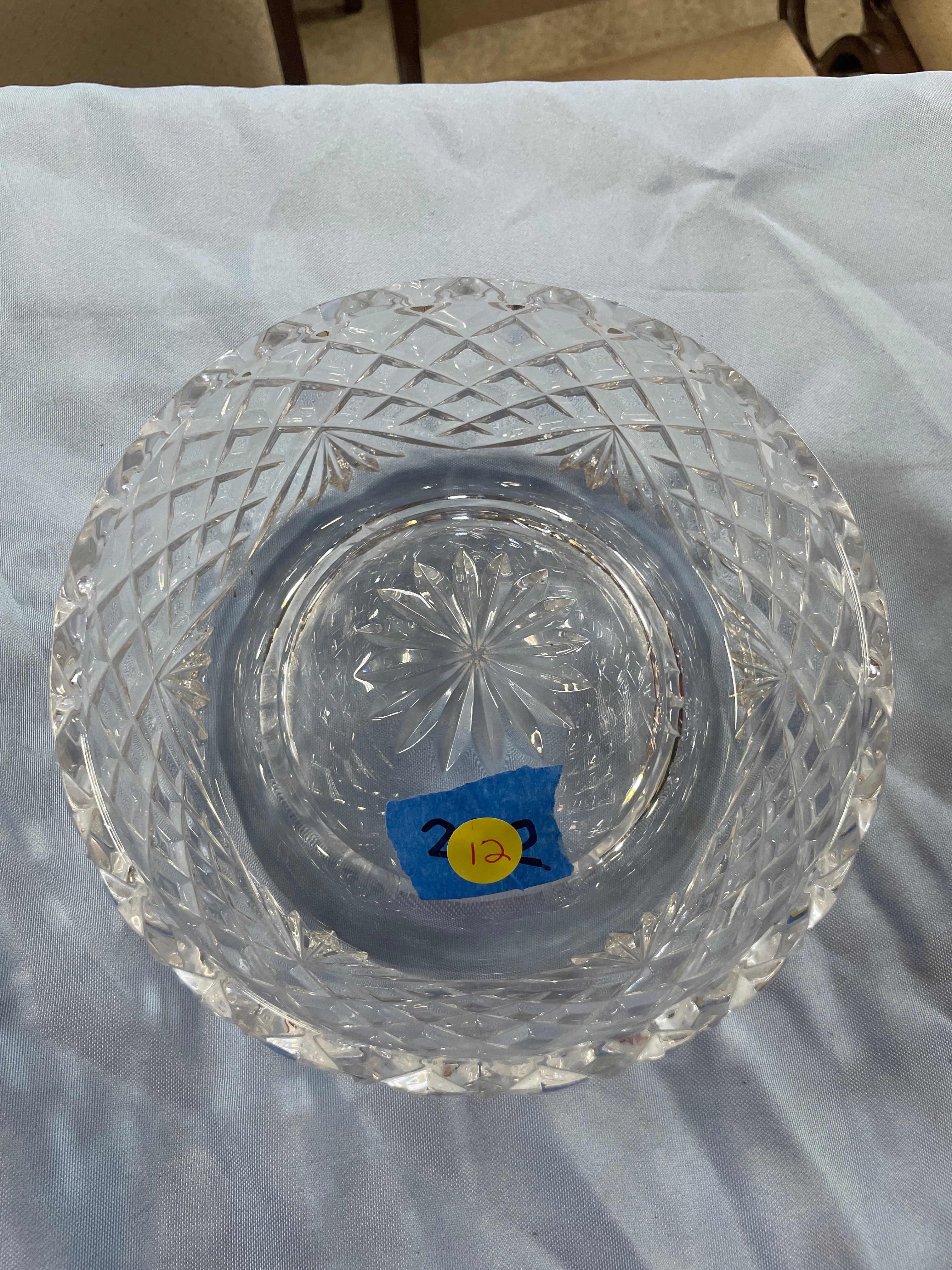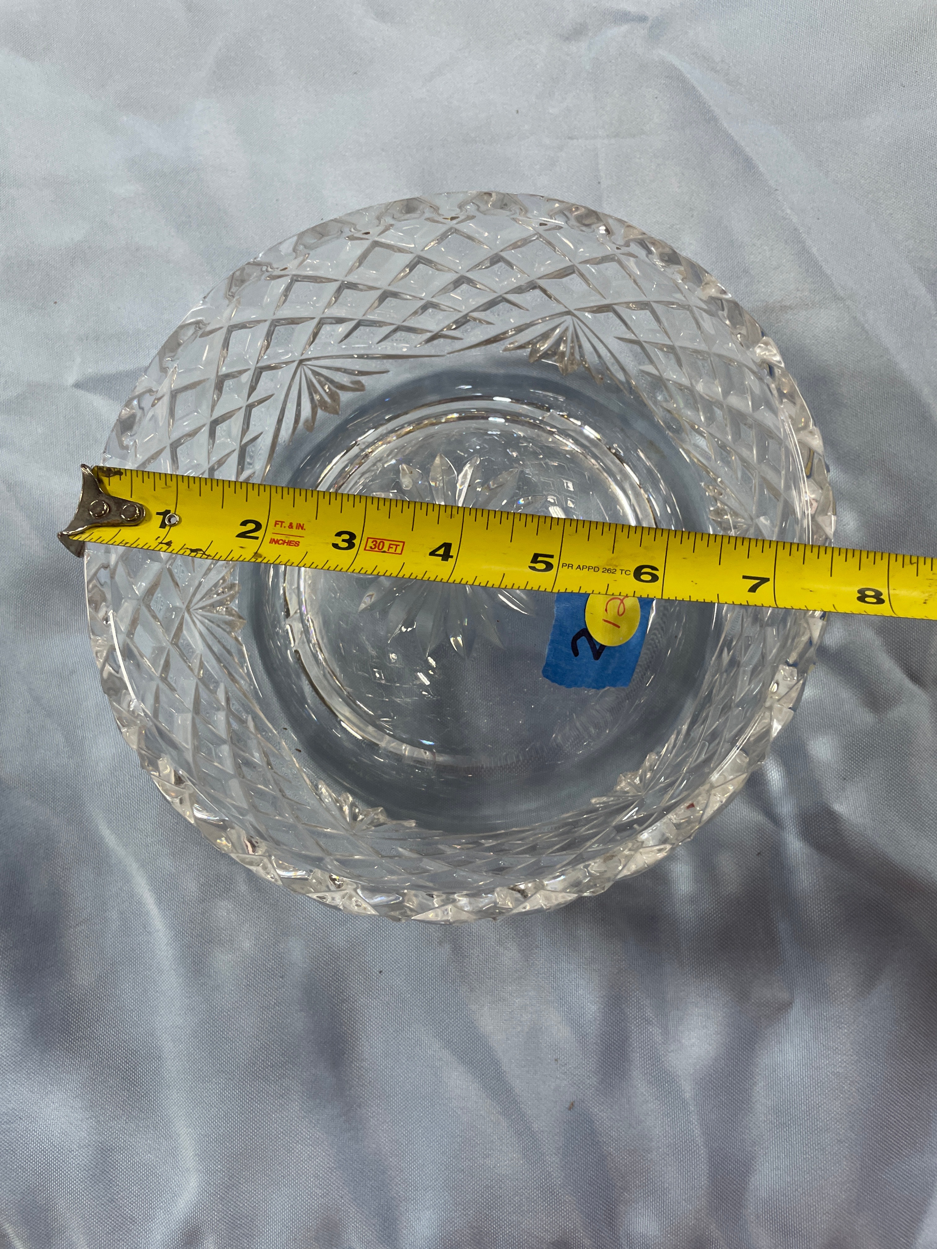 crystal bowl with a diamond cut pattern, approximately 6 inches in diameter and 3 inches high.