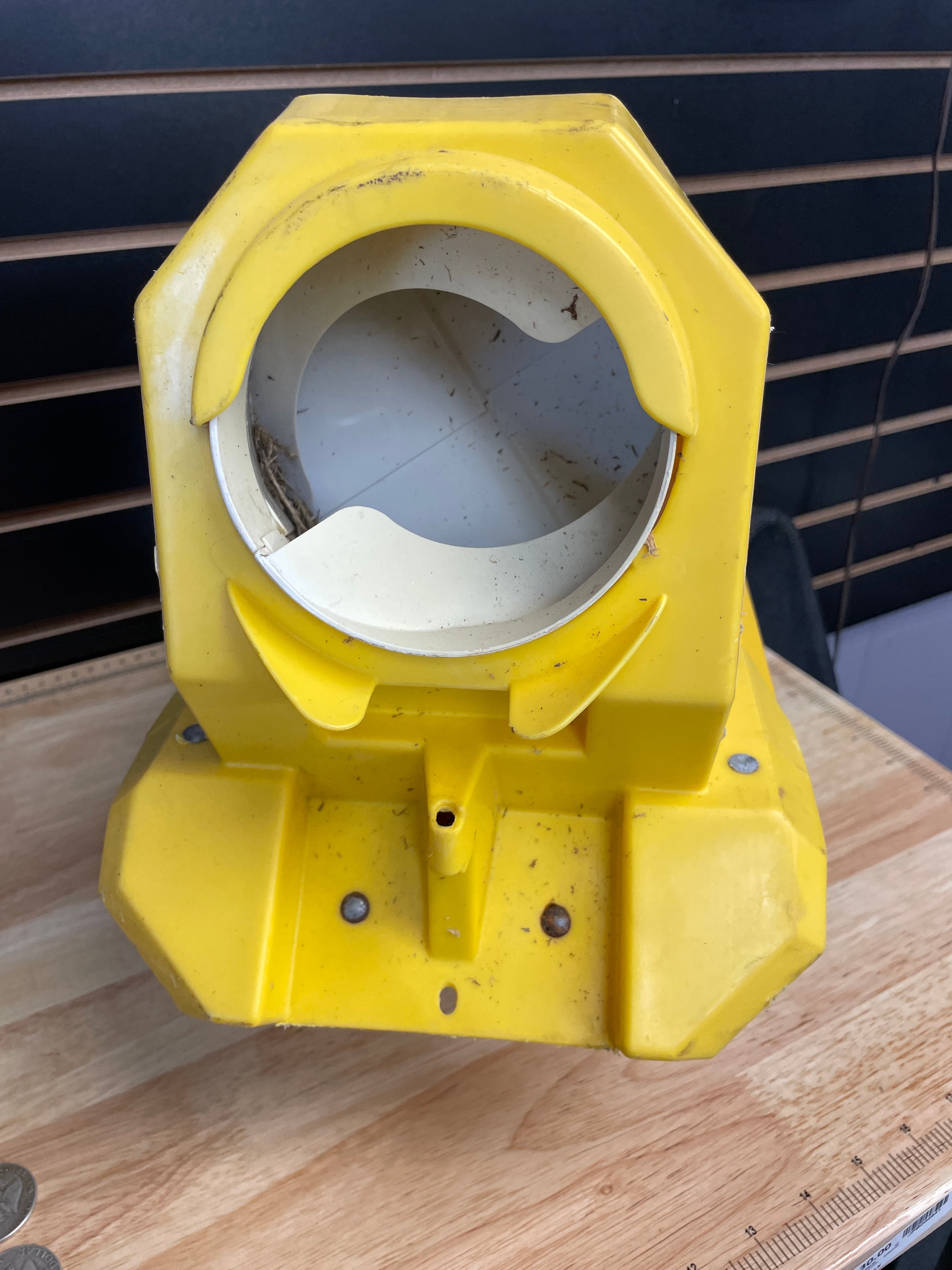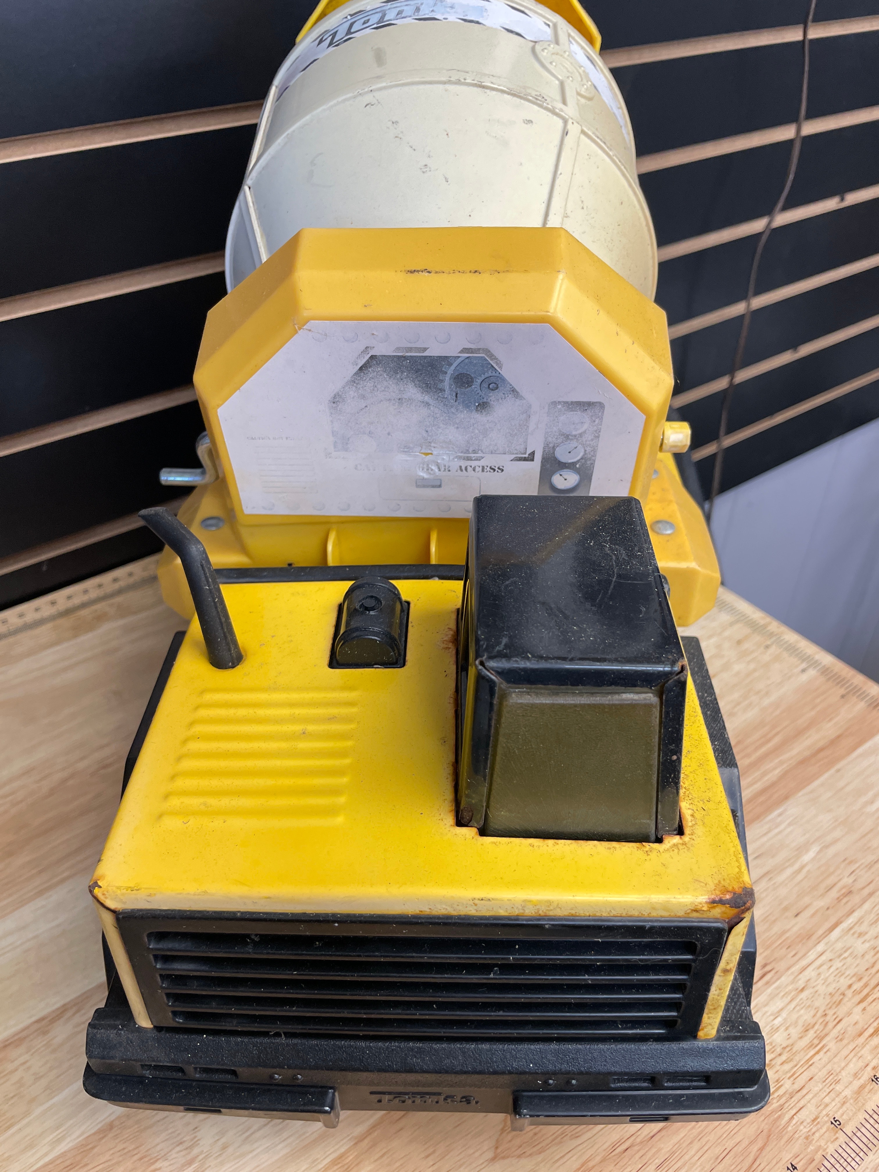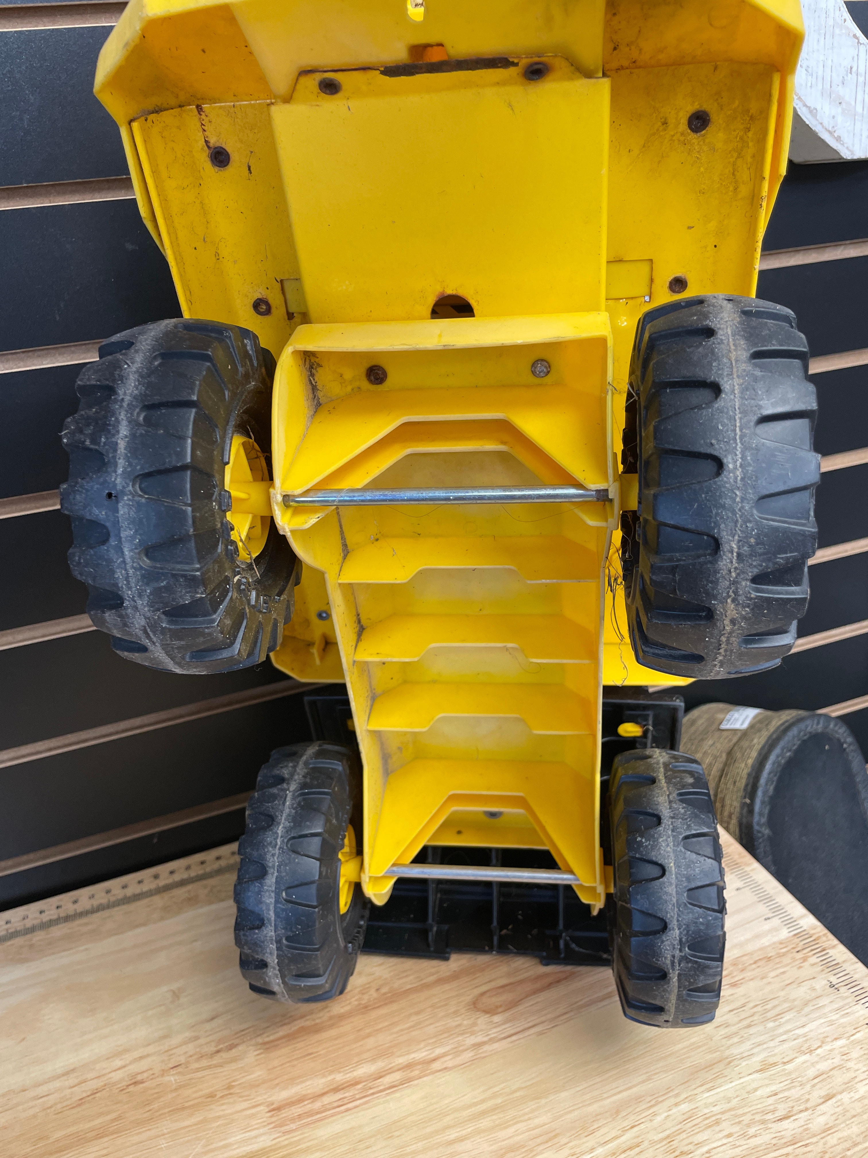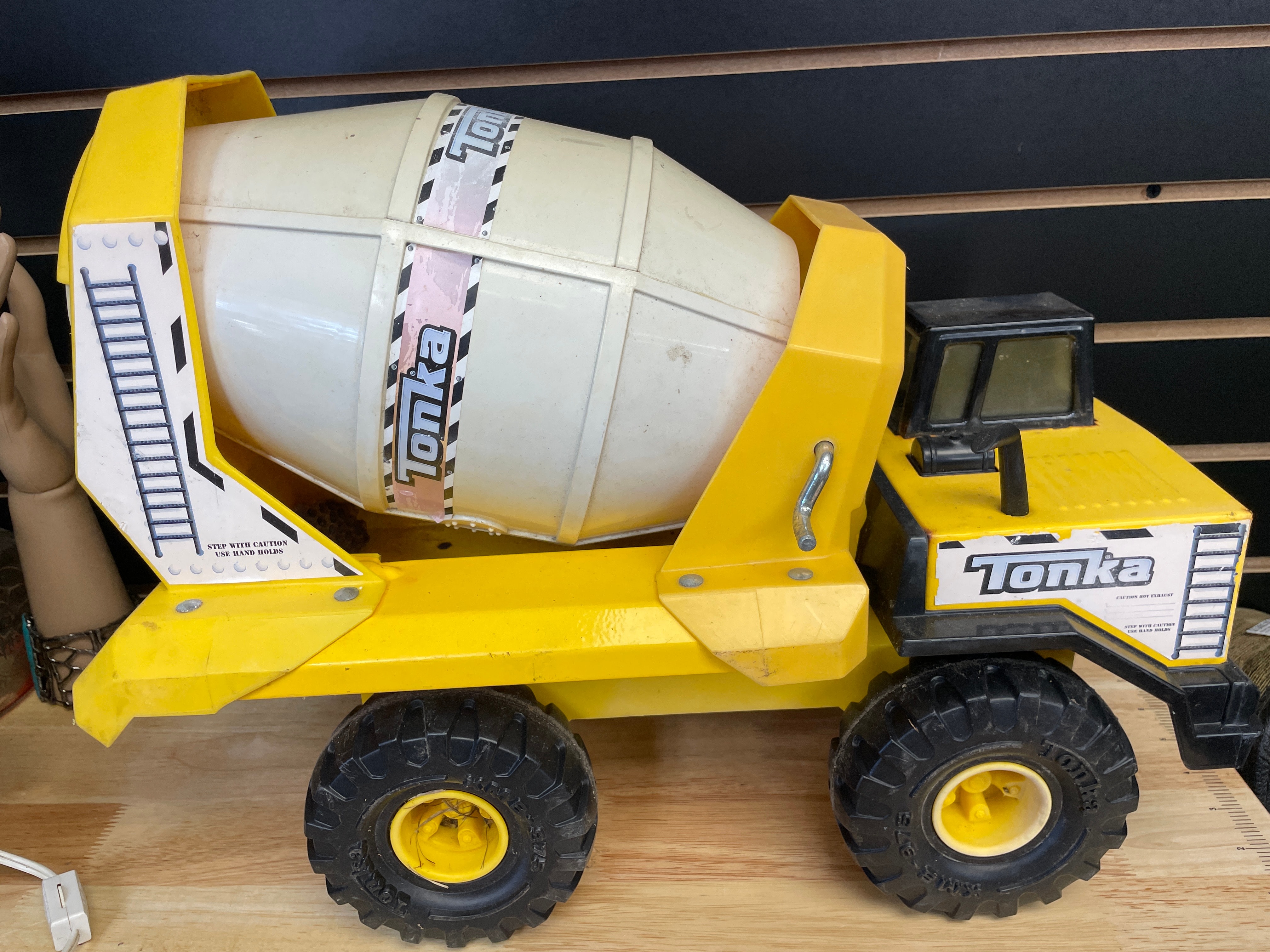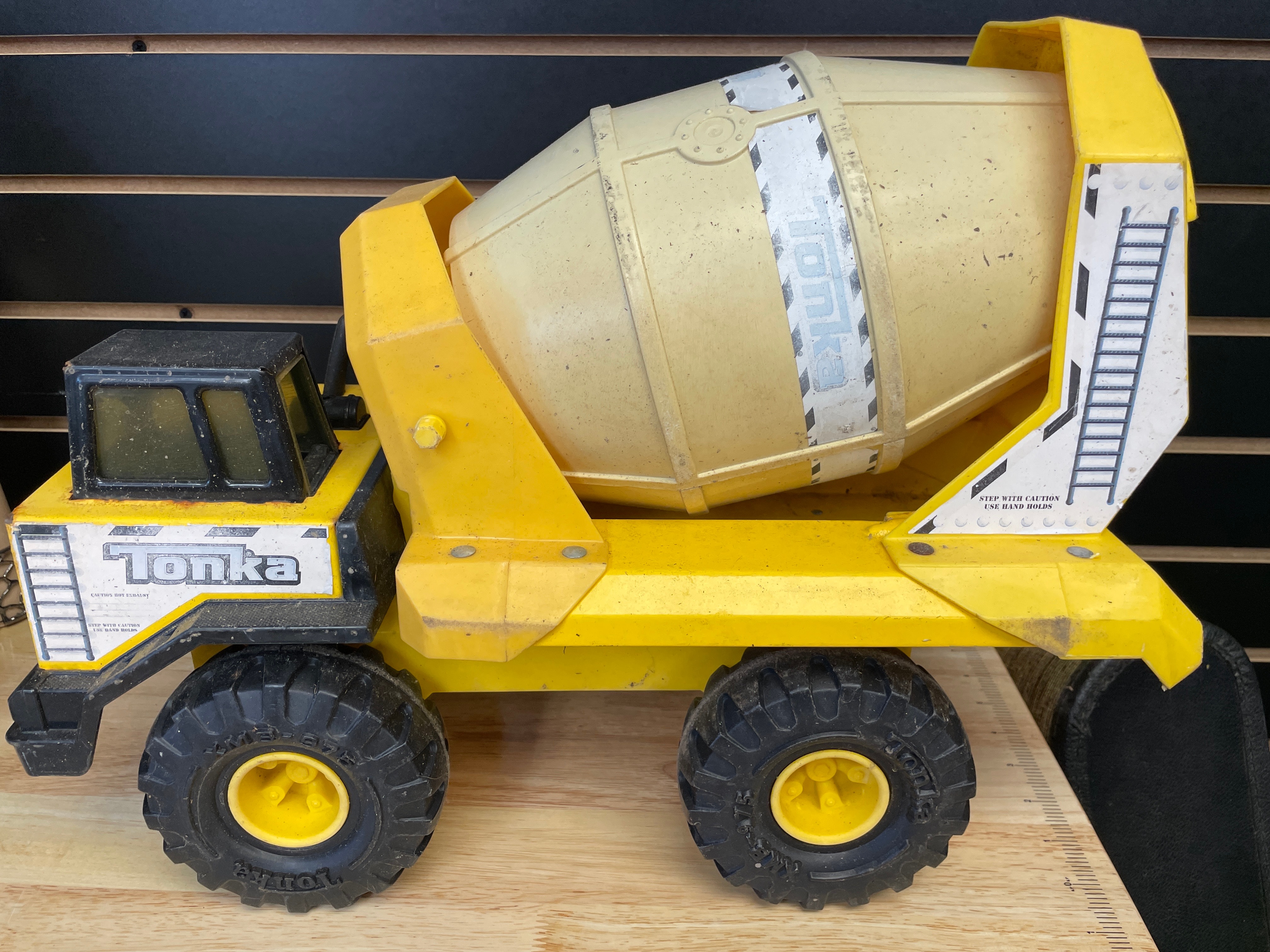 A yellow and black Tonka toy cement mixer truck with an off-white drum, featuring “Tonka” brand names on the cab, mixer drum, and tires, along with the text “STEP WITH CAUTION / USE HAND BREAK” on the cab and mixer’s rear panel.