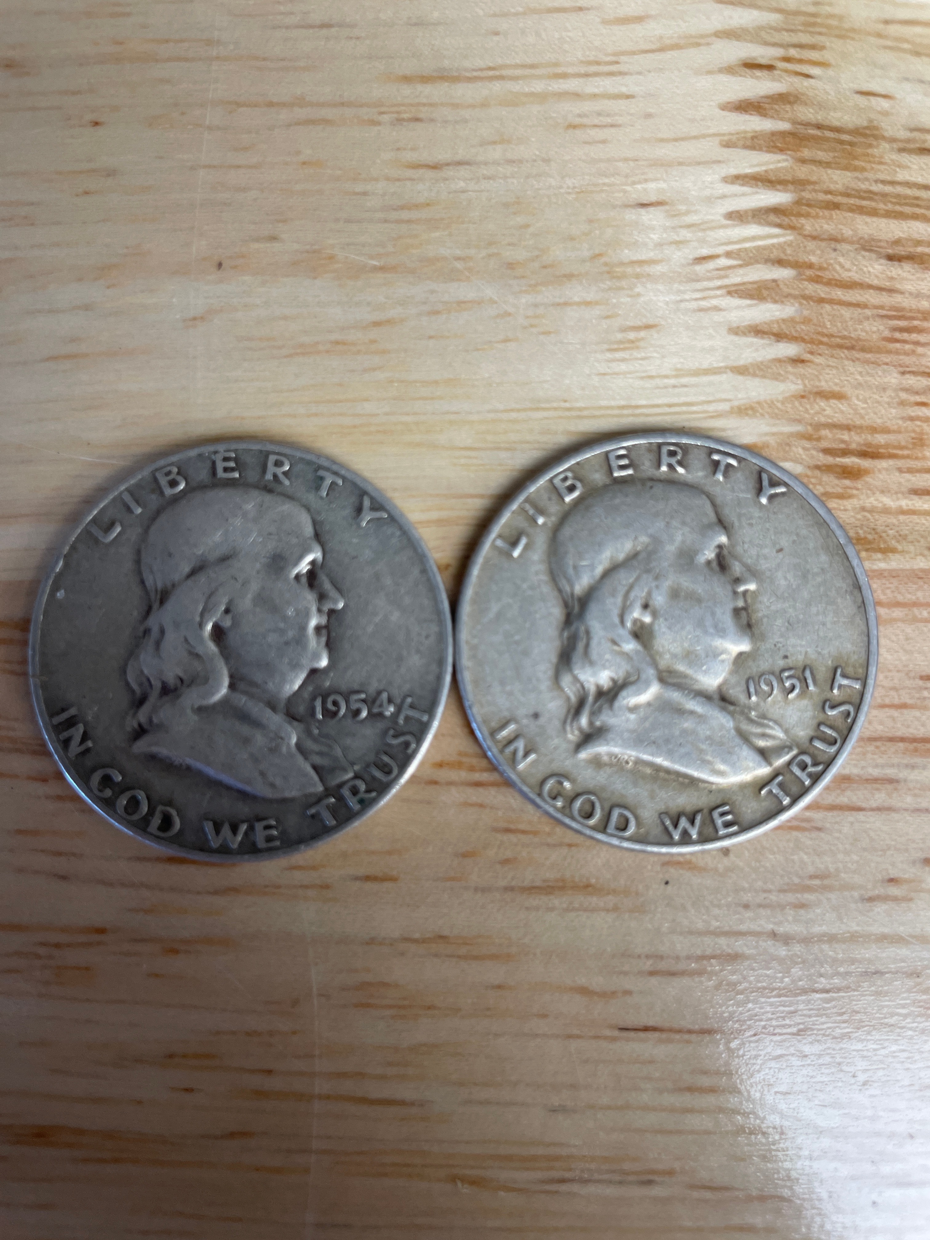 A pair of silver-colored Franklin Half Dollar coins, dated 1954 and 1951 D, featuring Benjamin Franklin on the obverse and the Liberty Bell on the reverse.