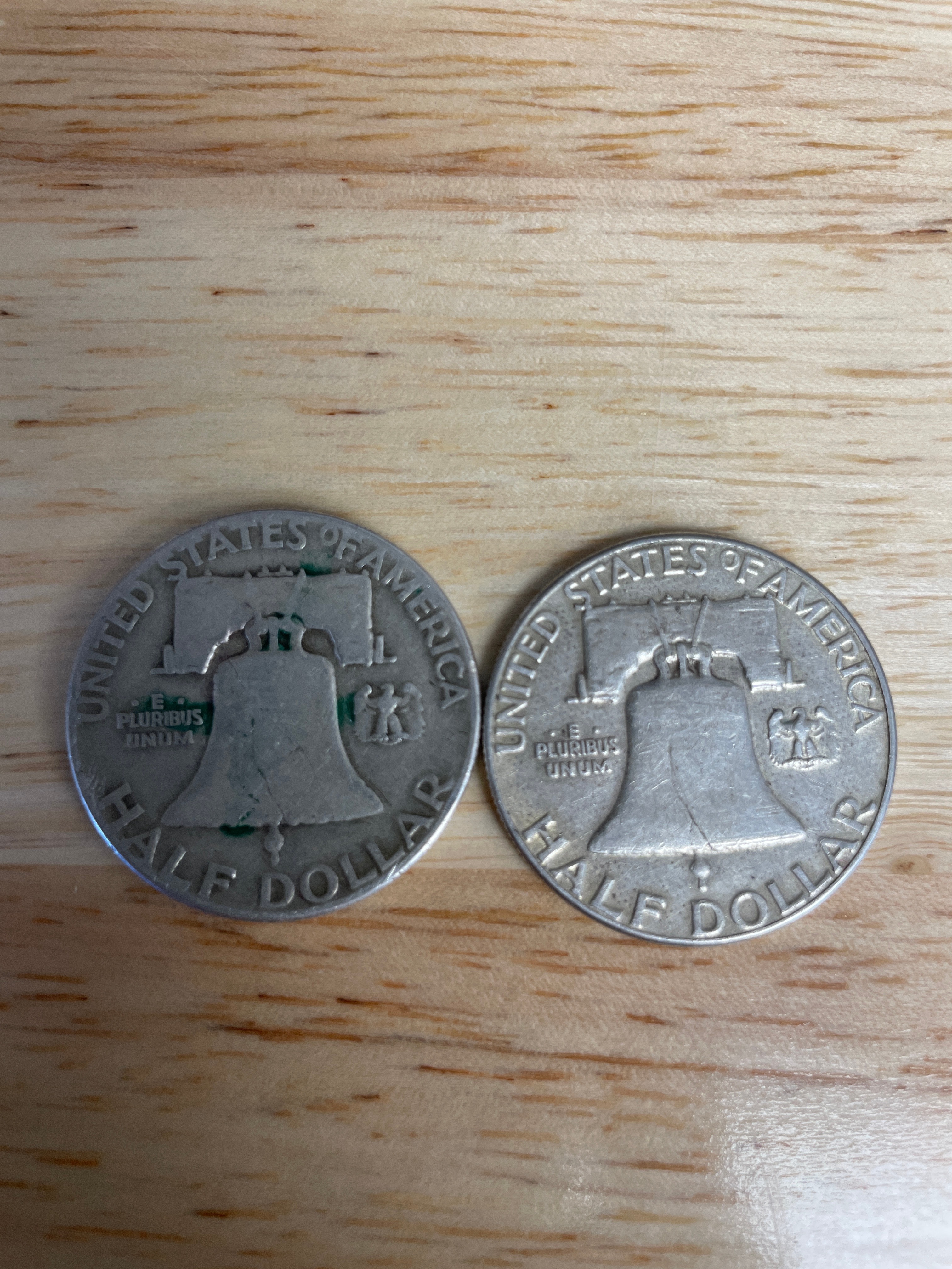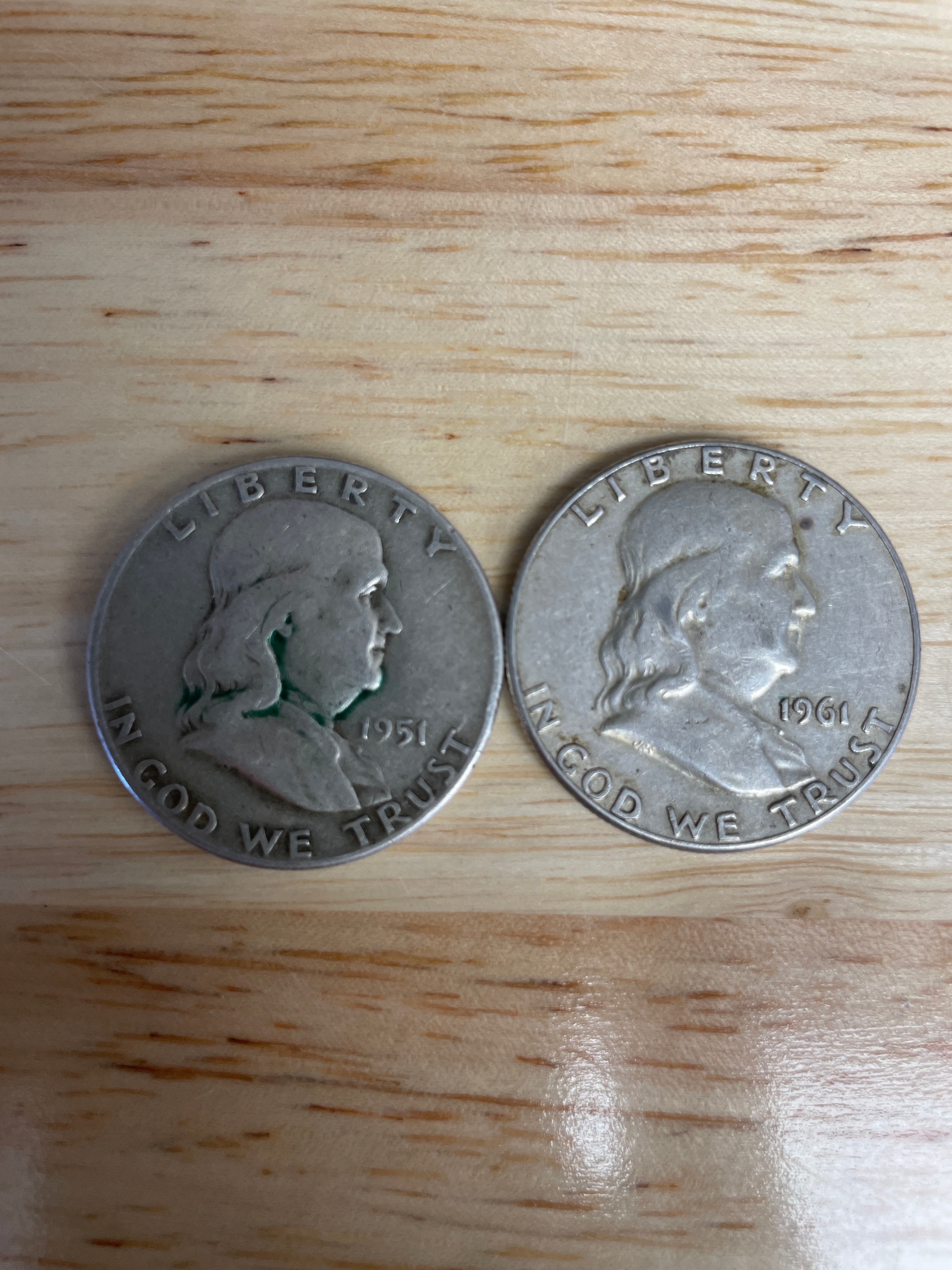 A pair of 90% silver Franklin Half Dollar coins, dated 1951 and 1961, inscribed ‘LIBERTY’, ‘IN GOD WE TRUST’, ‘UNITED STATES OF AMERICA’, ‘E PLURIBUS UNUM’, and ‘HALF DOLLAR’.