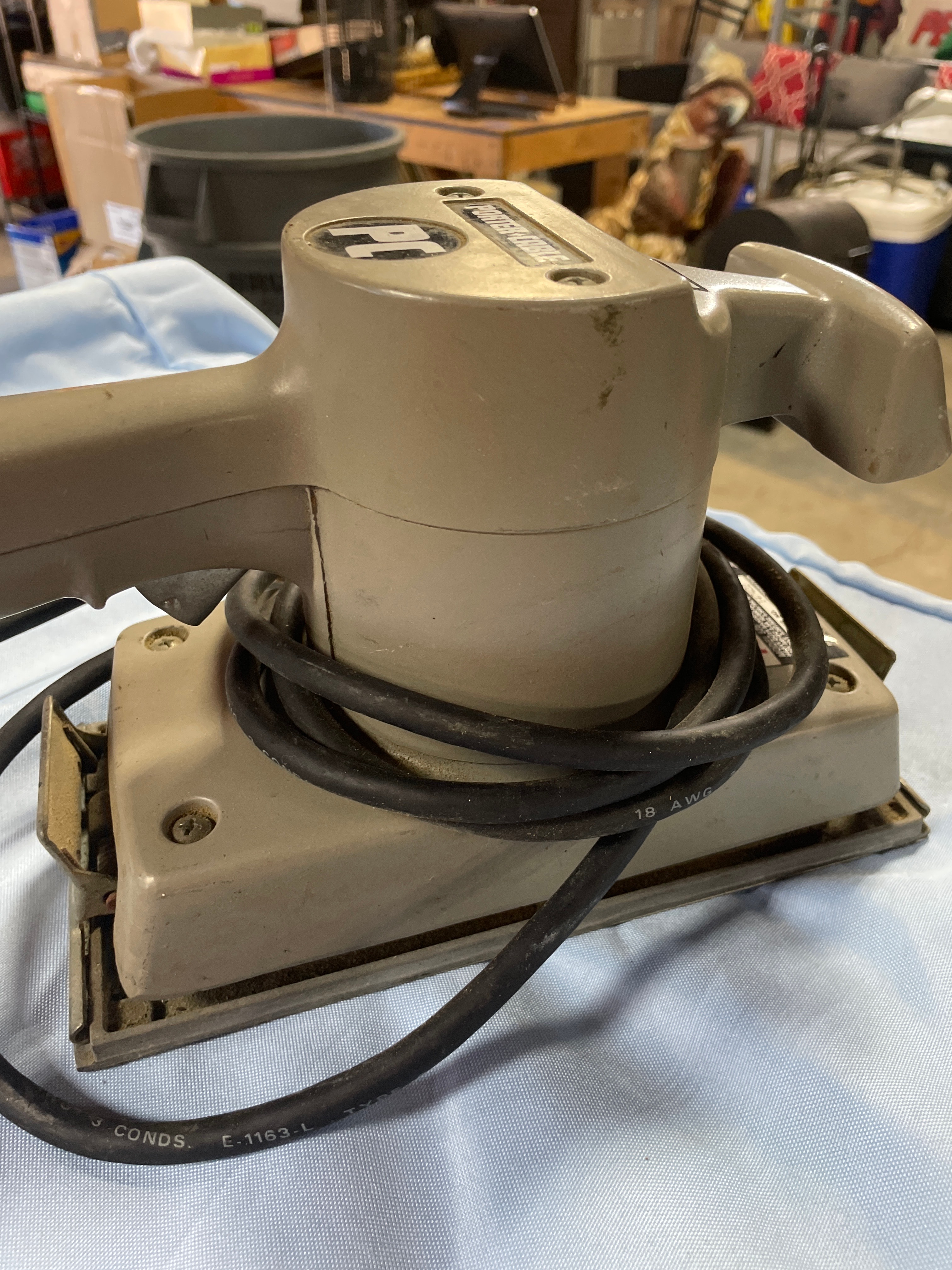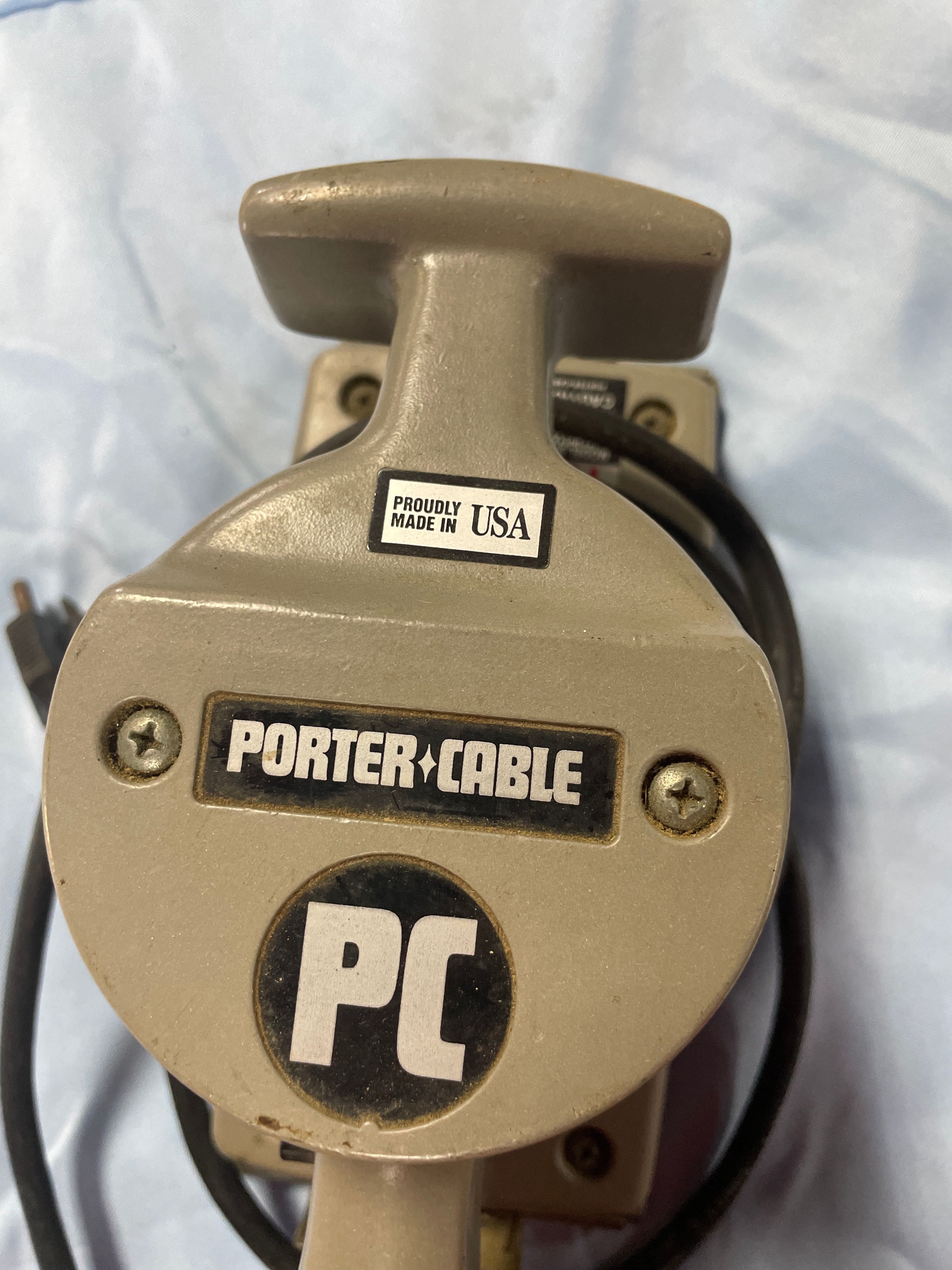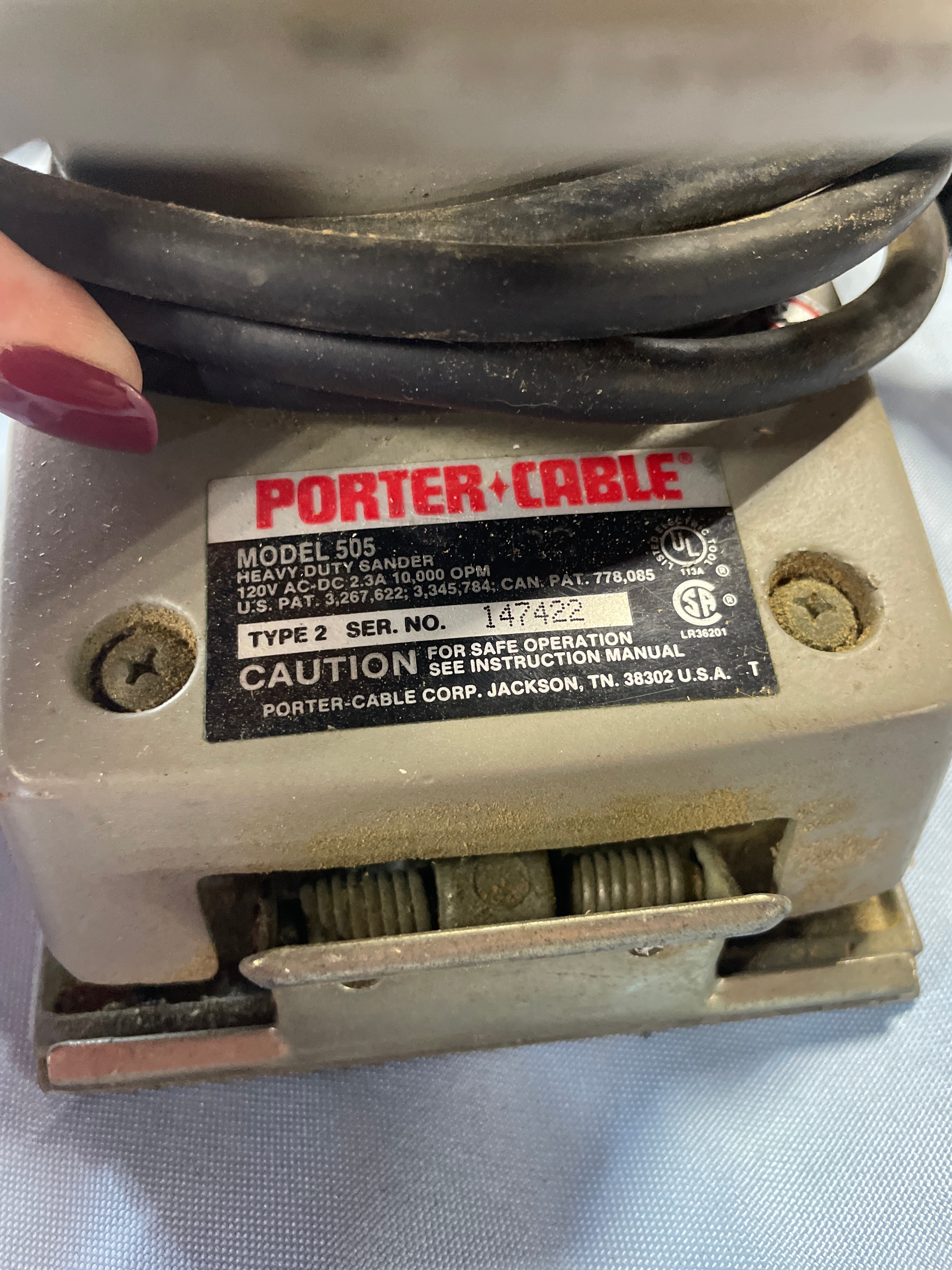 A light gray/tan Porter-Cable Model 505 Heavy Duty Sander, 120V 60Hz 3.3A 10,000 OPM, proudly made in USA.