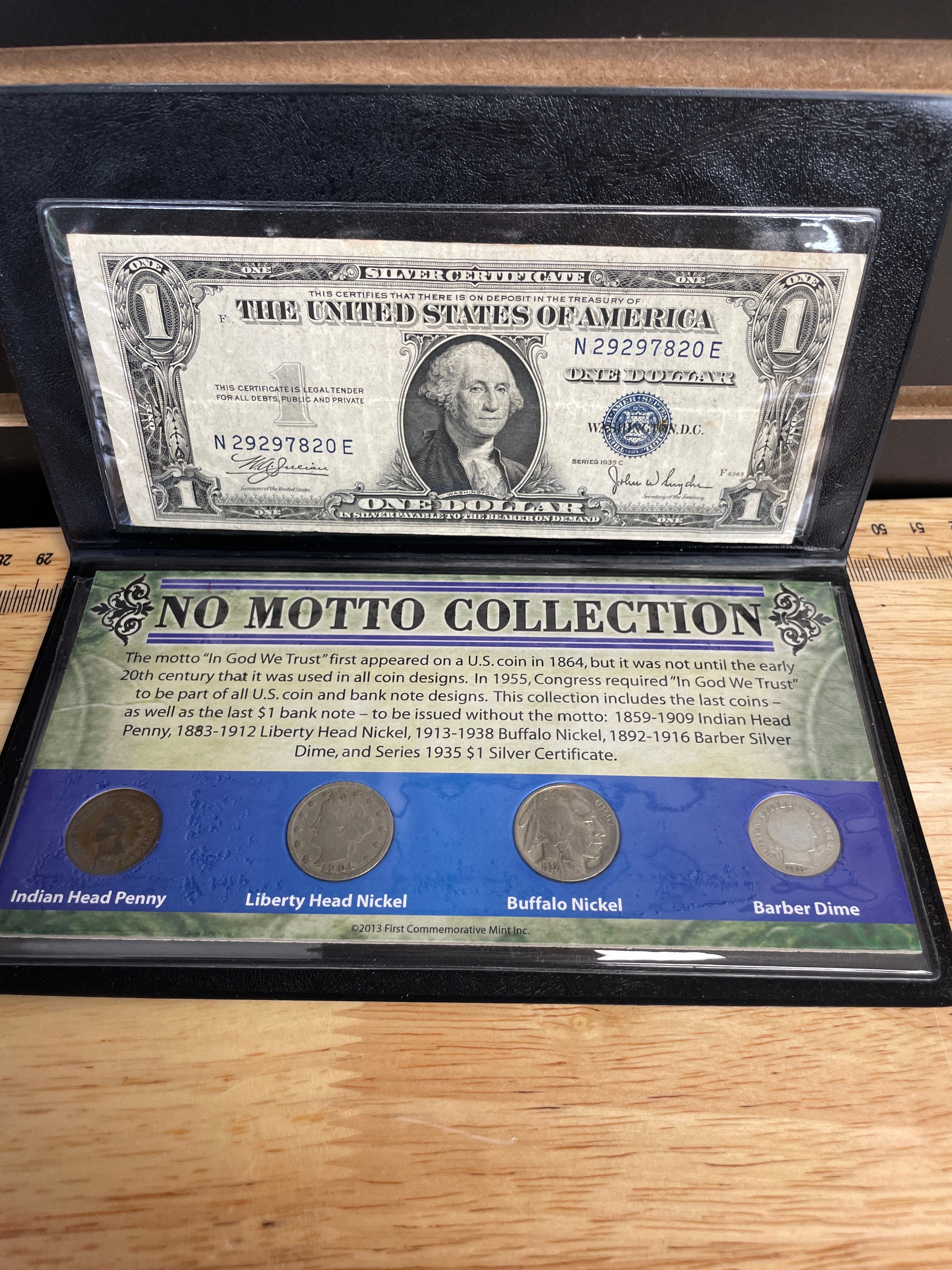 A blue and green ‘NO MOTTO COLLECTION’ display containing one Series 1935 C One Dollar Silver Certificate (N 29297820 E) and four US coins: an Indian Head Penny, a 1910 Liberty Head Nickel, a 1923 Buffalo Nickel, and a 1905 Barber Dime, all marked ©2013 First Commemorative Mint Inc.