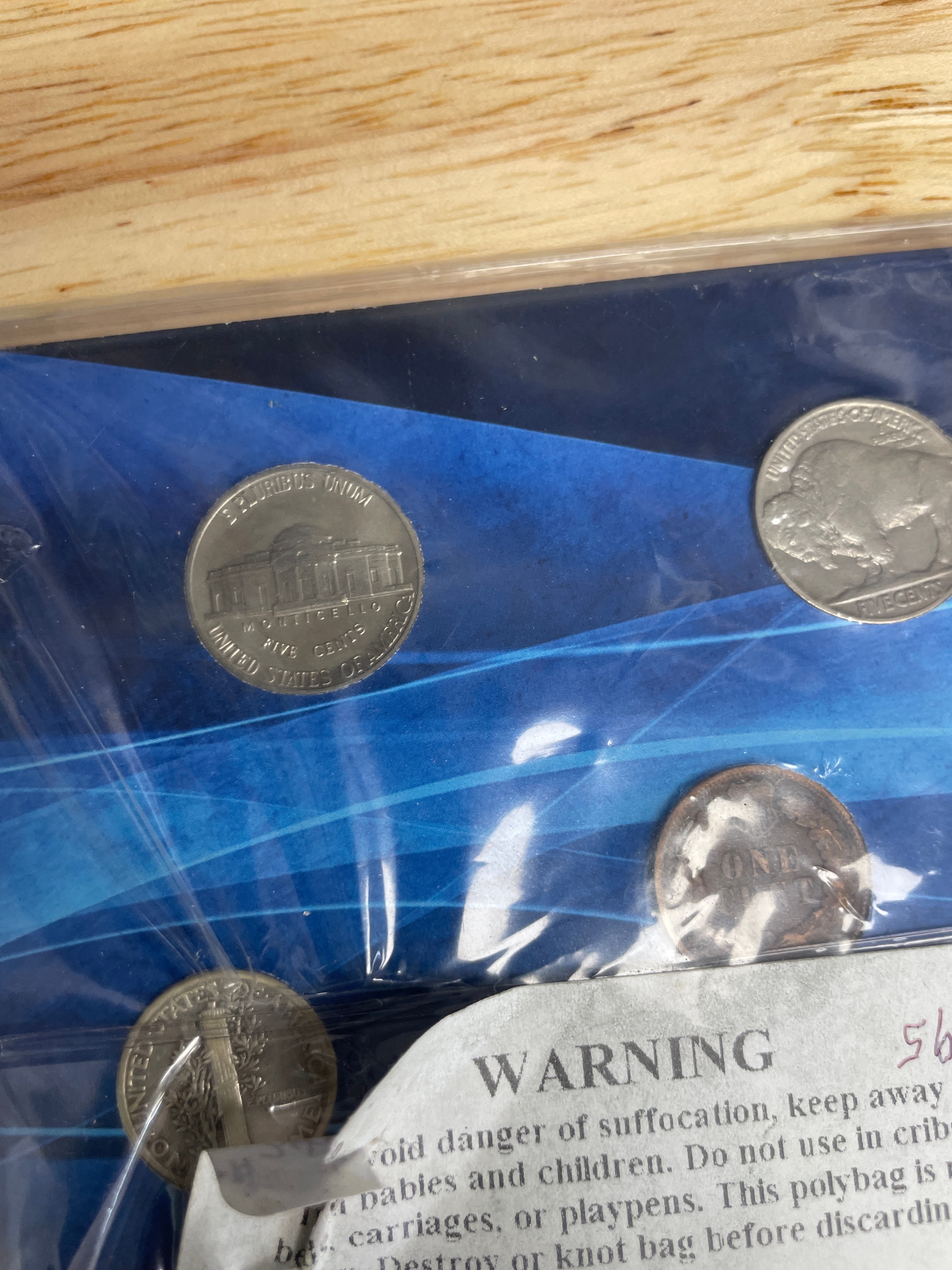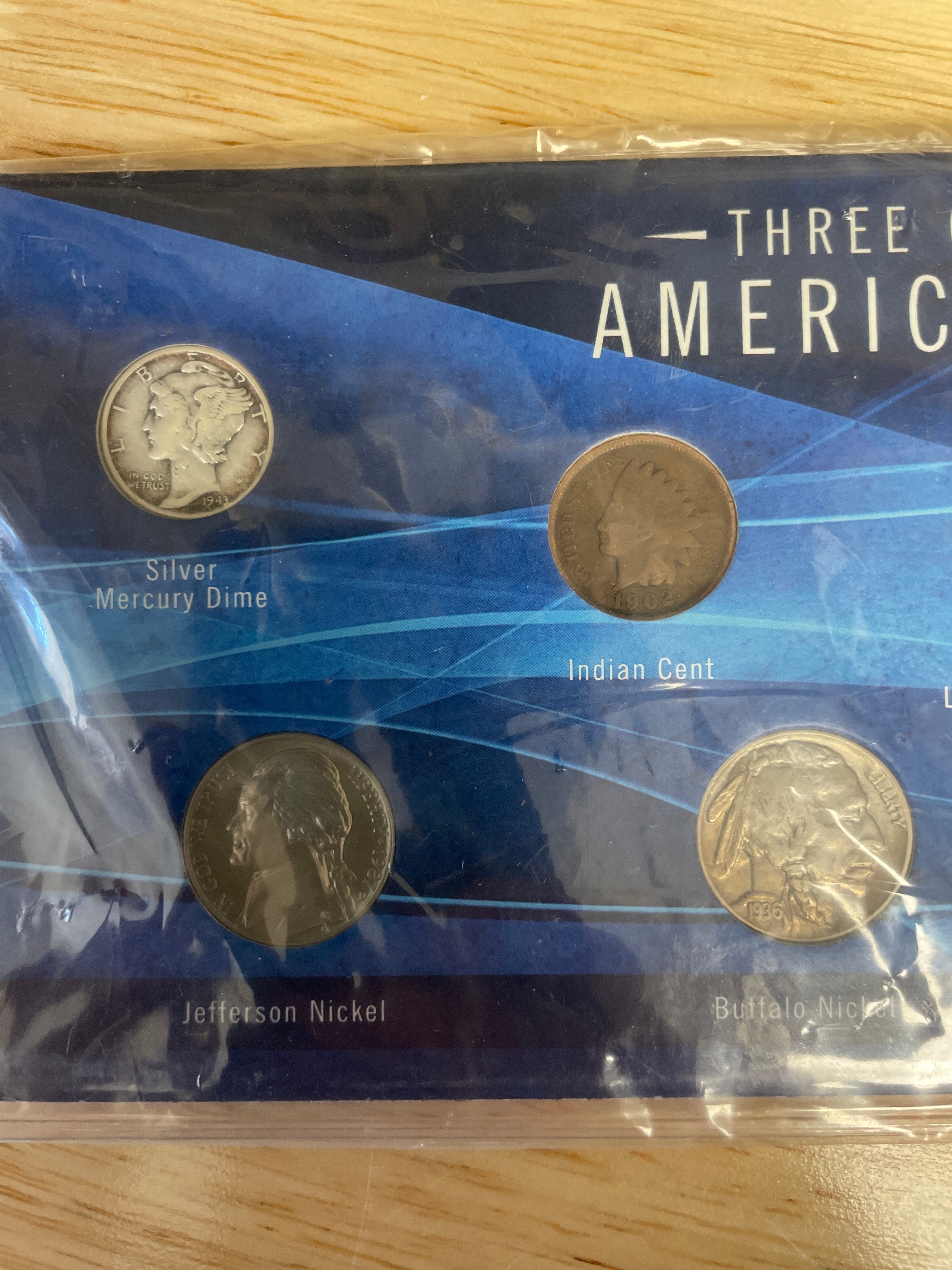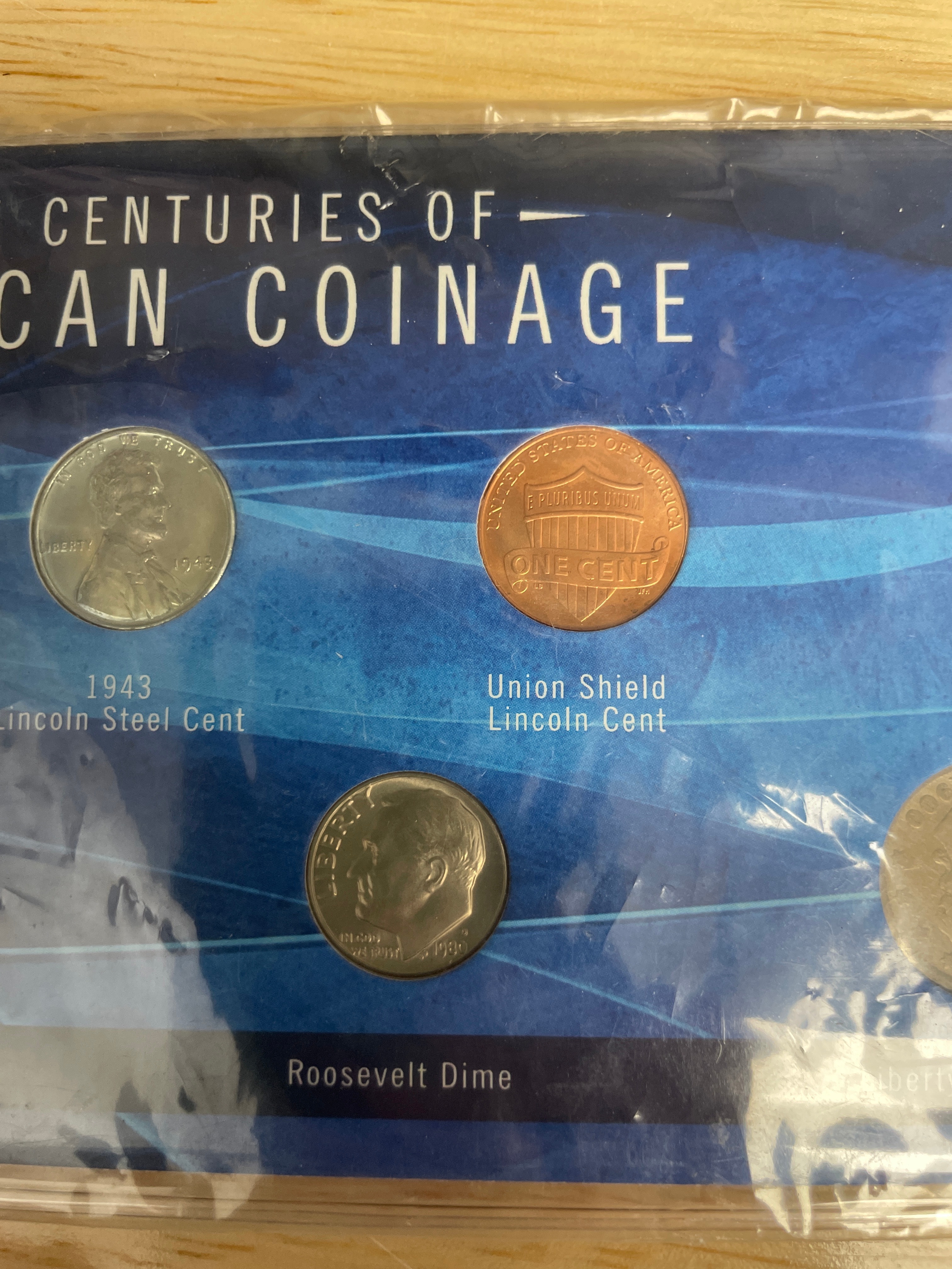 A “THREE CENTURIES OF AMERICAN COINAGE” set of nine coins, including a 1943 Silver Mercury Dime, 1903 Indian Cent, 1940 Jefferson Nickel, 1936 Buffalo Nickel, 1943 Lincoln Steel Cent, Union Shield Lincoln Cent, 1980 Roosevelt Dime, 1914 Silver Barber Dime, and 1900 Liberty Head Nickel.