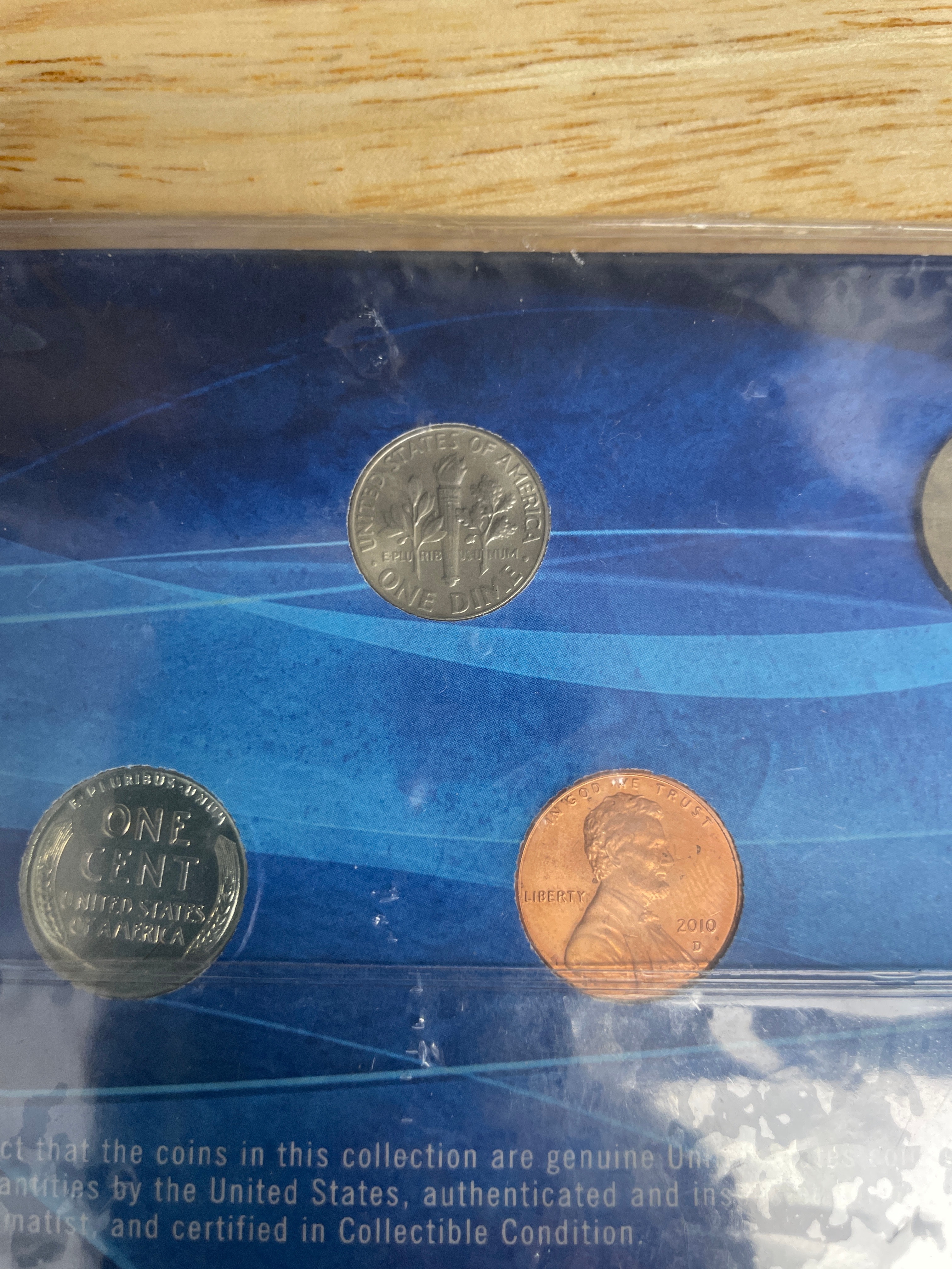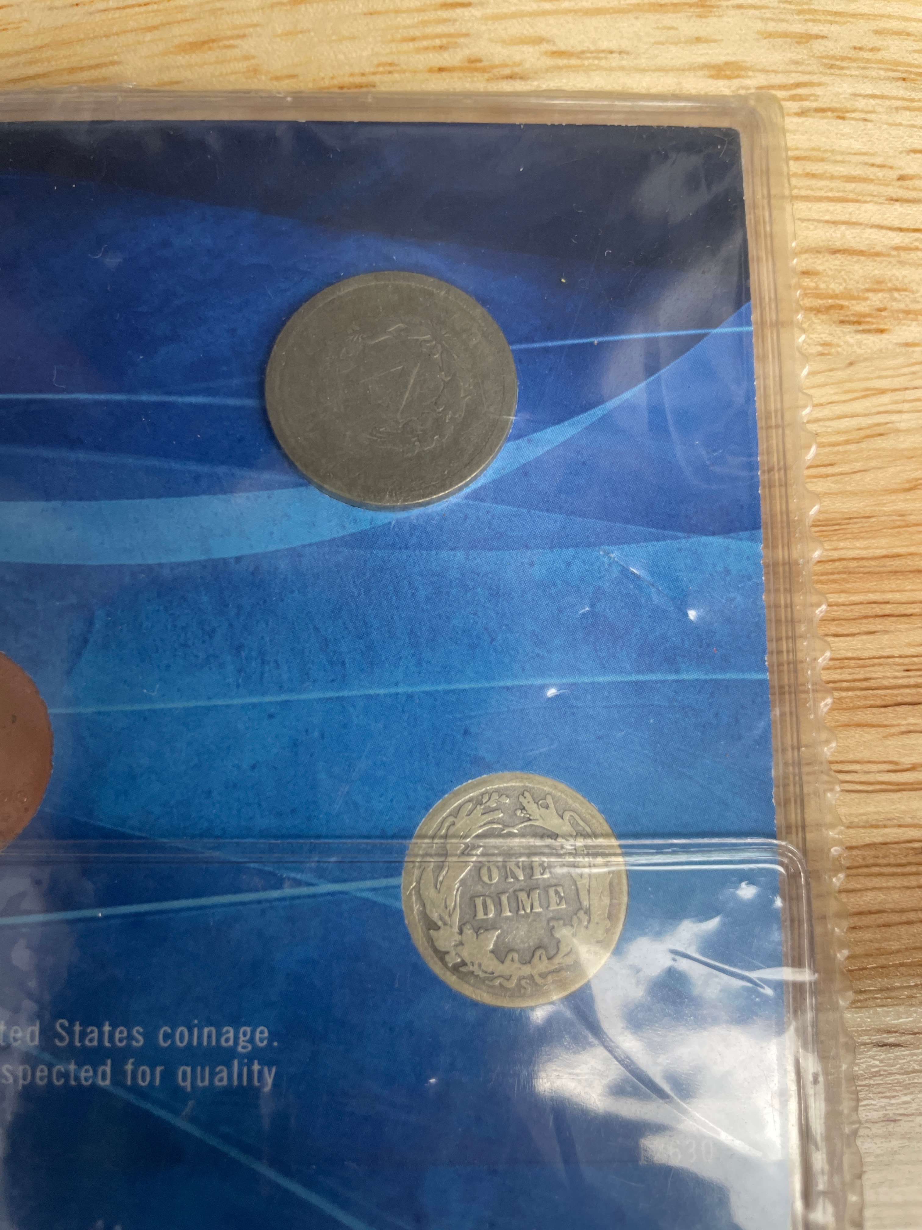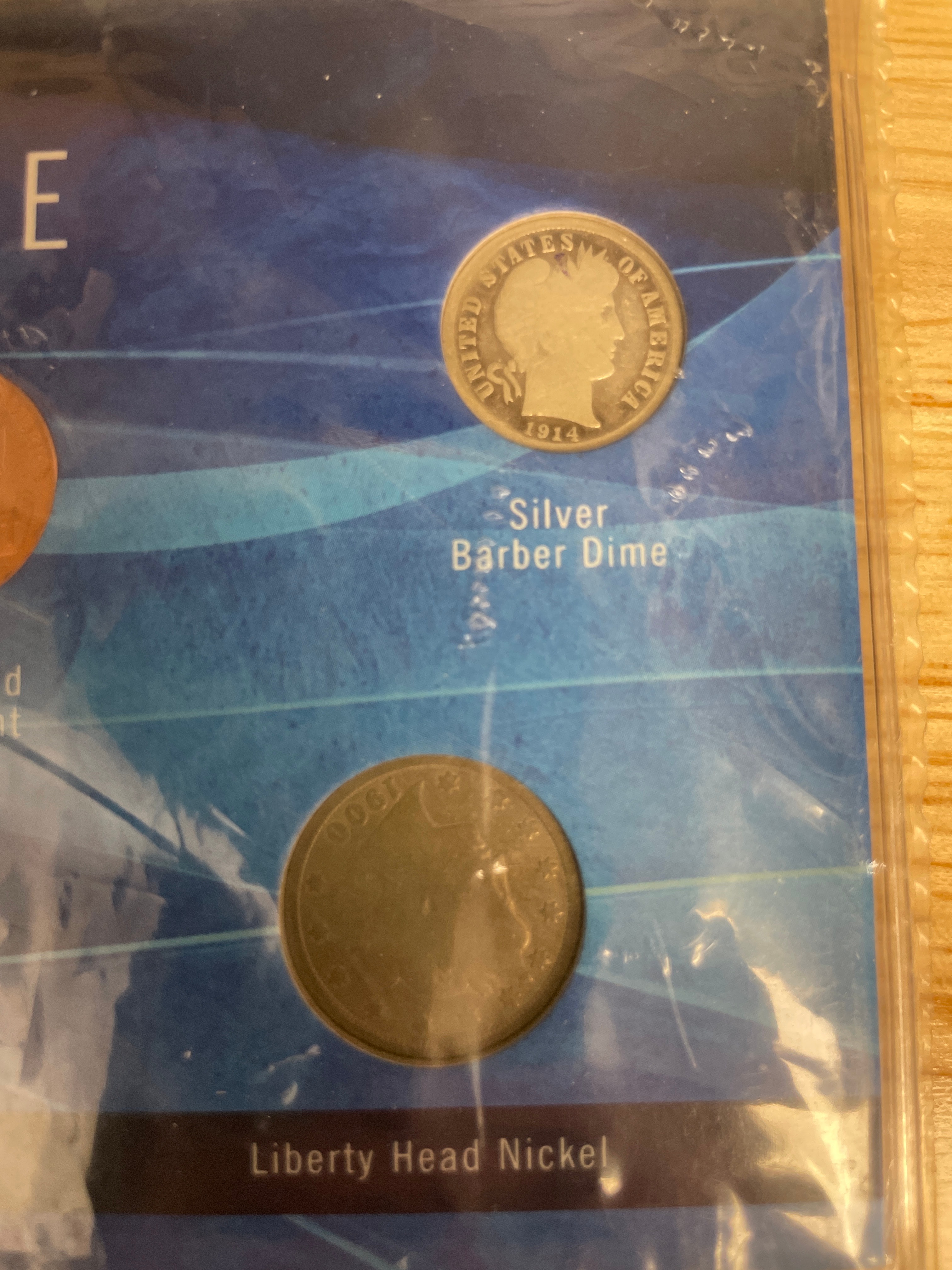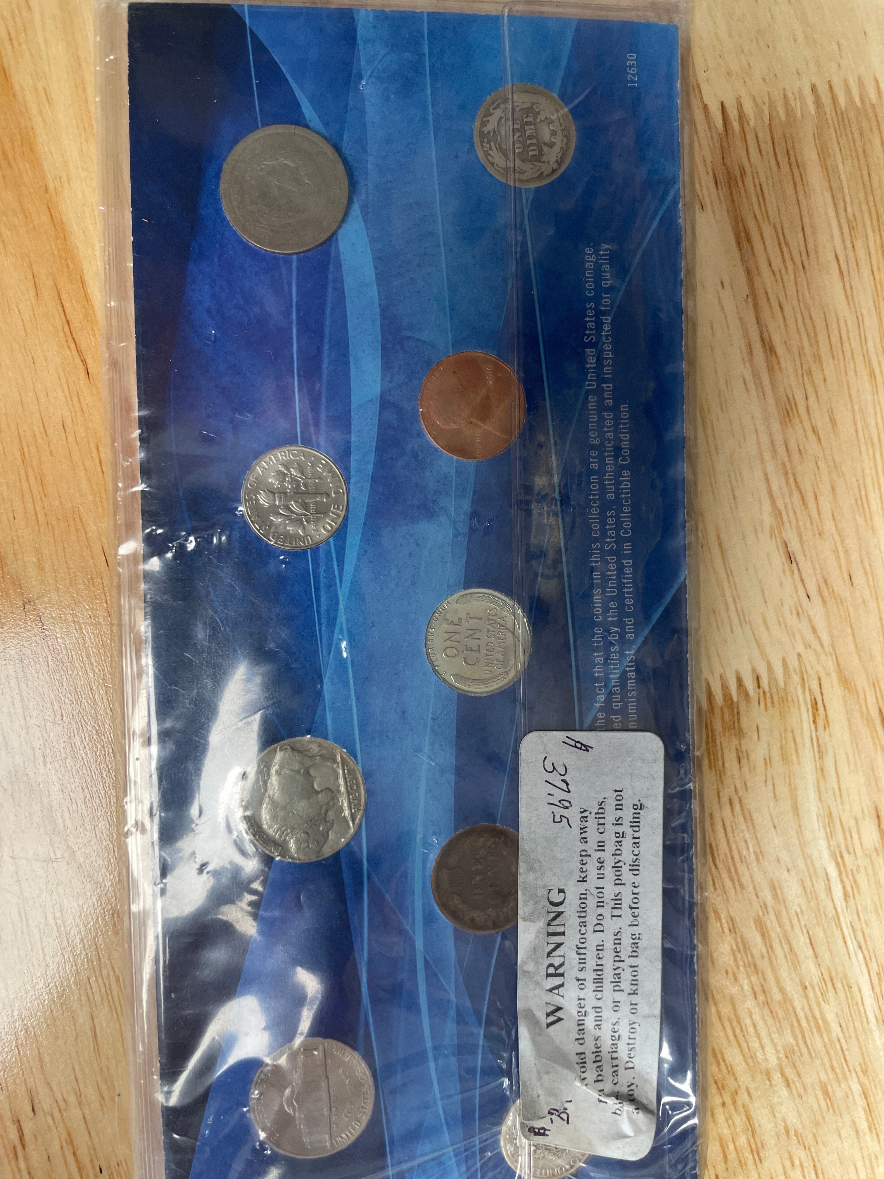 A “THREE CENTURIES OF AMERICAN COINAGE” set of nine coins, including a 1943 Silver Mercury Dime, 1903 Indian Cent, 1940 Jefferson Nickel, 1936 Buffalo Nickel, 1943 Lincoln Steel Cent, Union Shield Lincoln Cent, 1980 Roosevelt Dime, 1914 Silver Barber Dime, and 1900 Liberty Head Nickel.