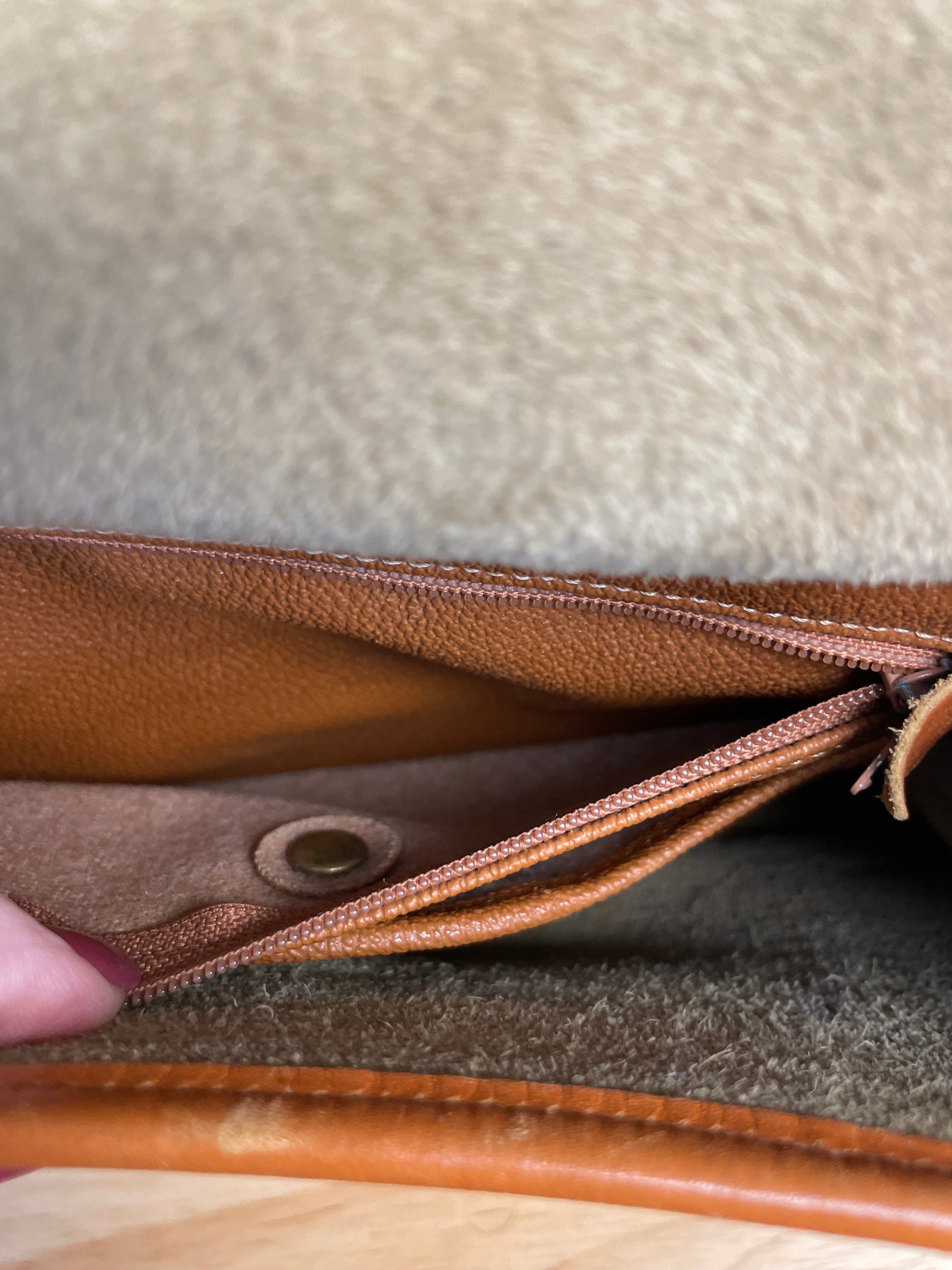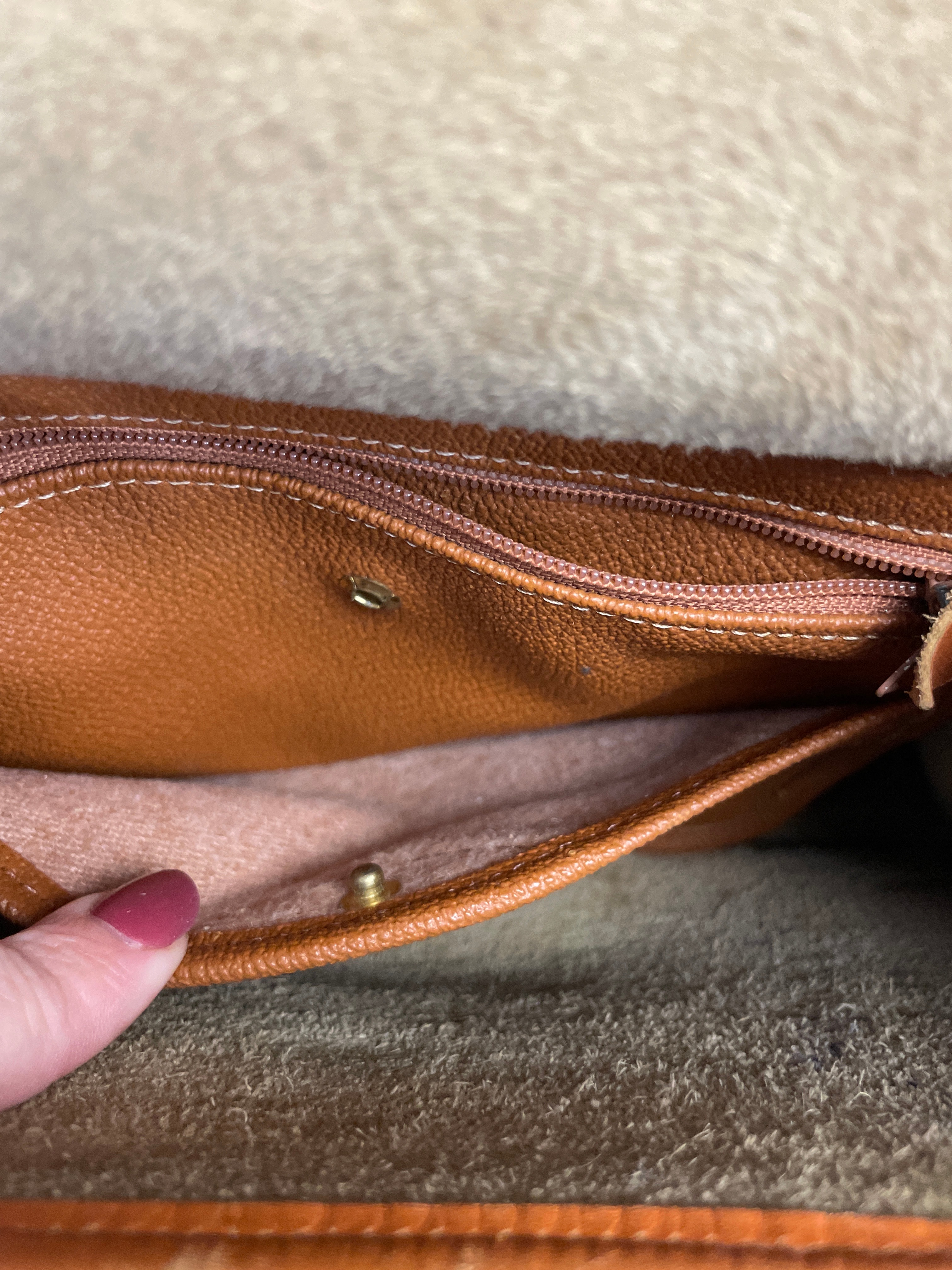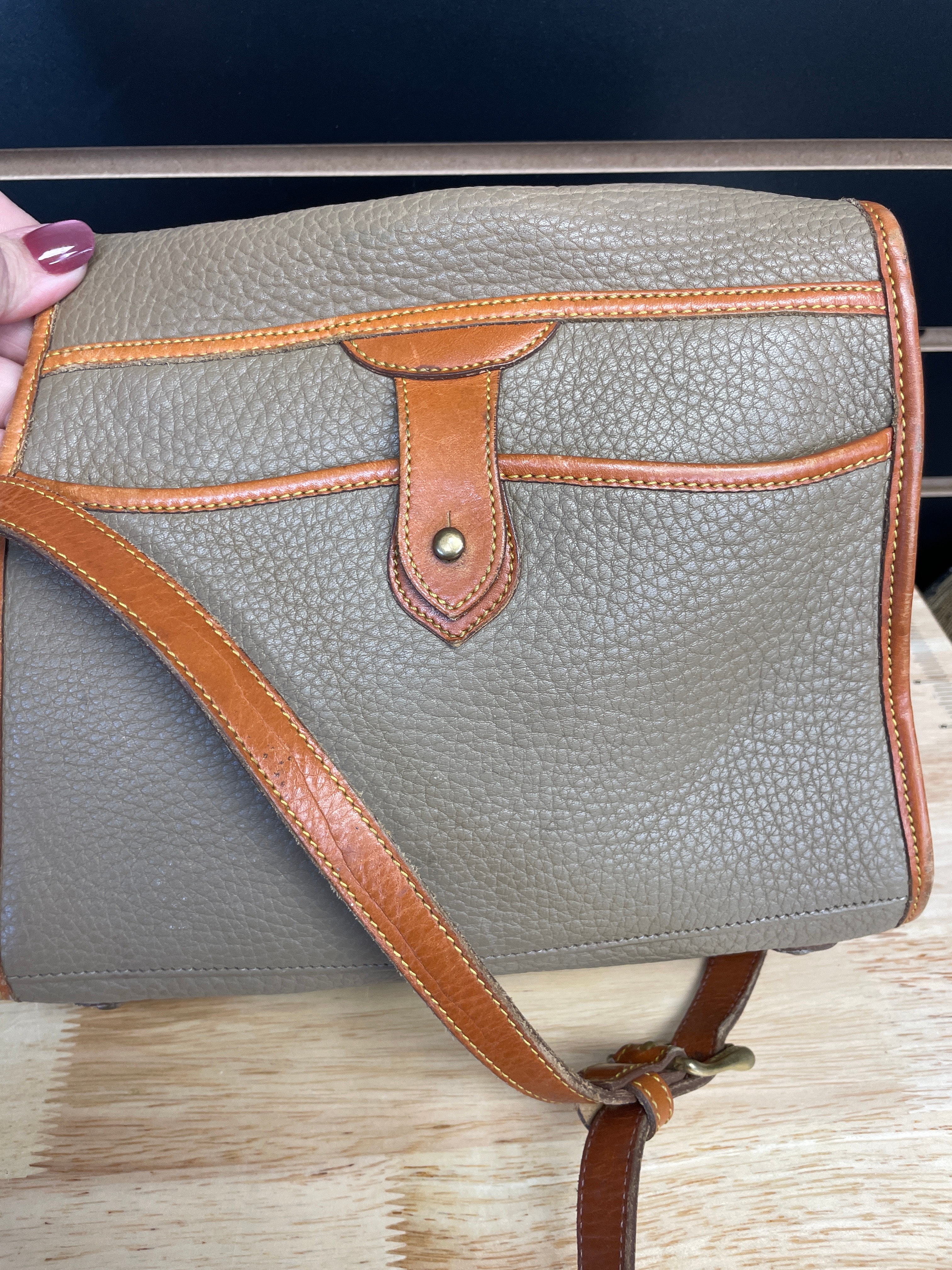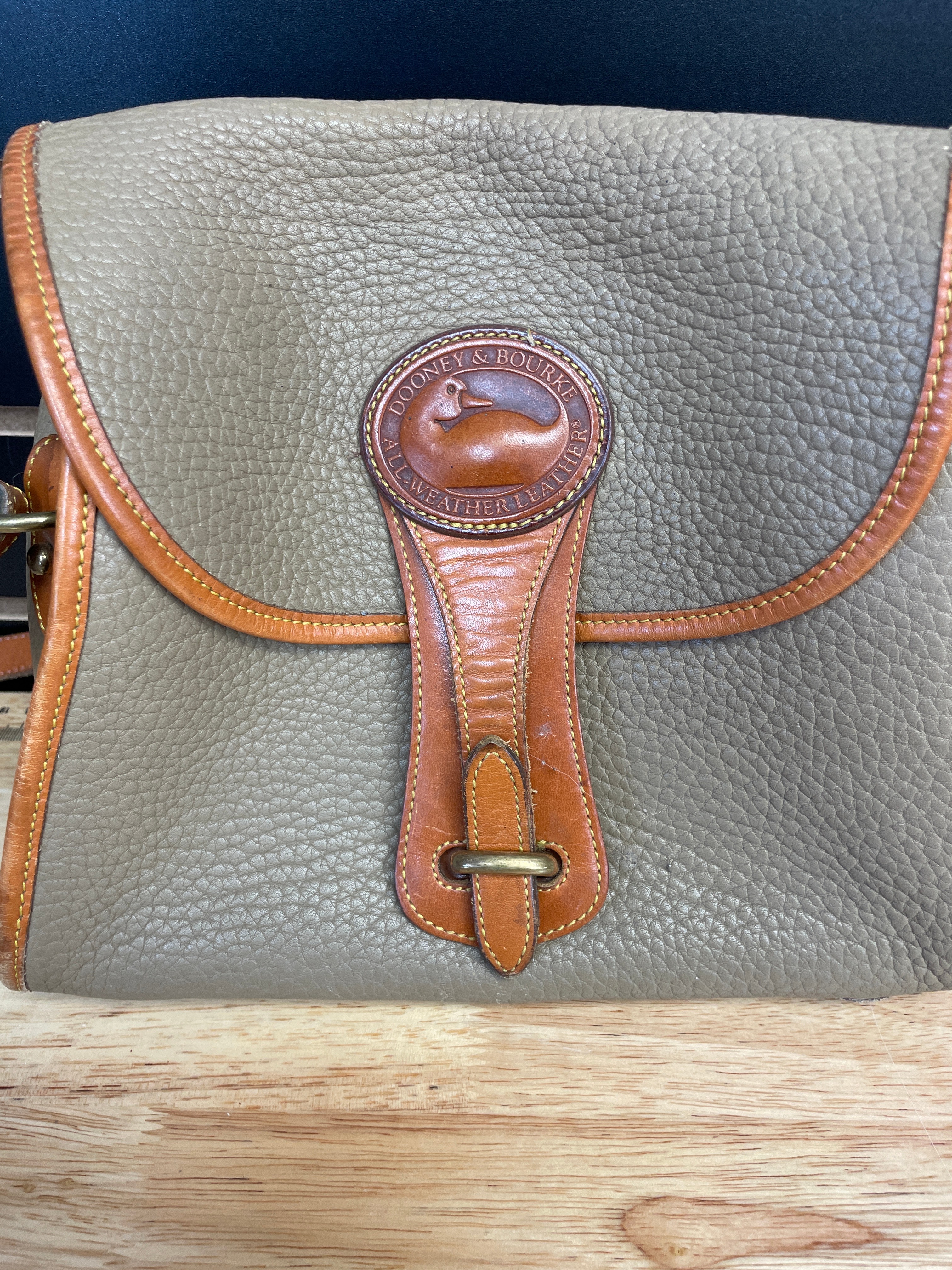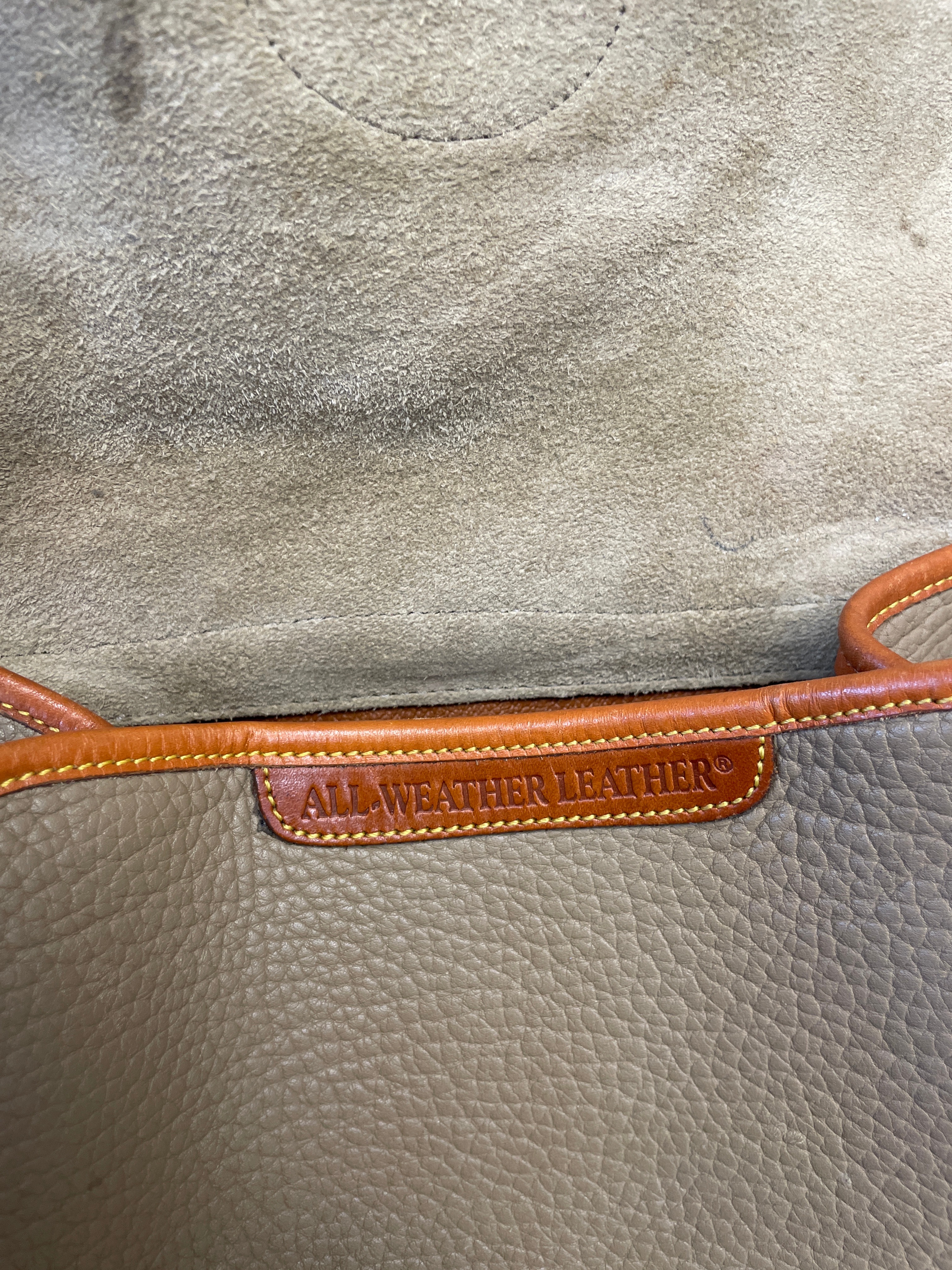 A grayish-tan and reddish-brown pebbled leather handbag by Dooney & Bourke, featuring a front emblem with duck logo and ‘ALL-WEATHER LEATHER®’ embossing.