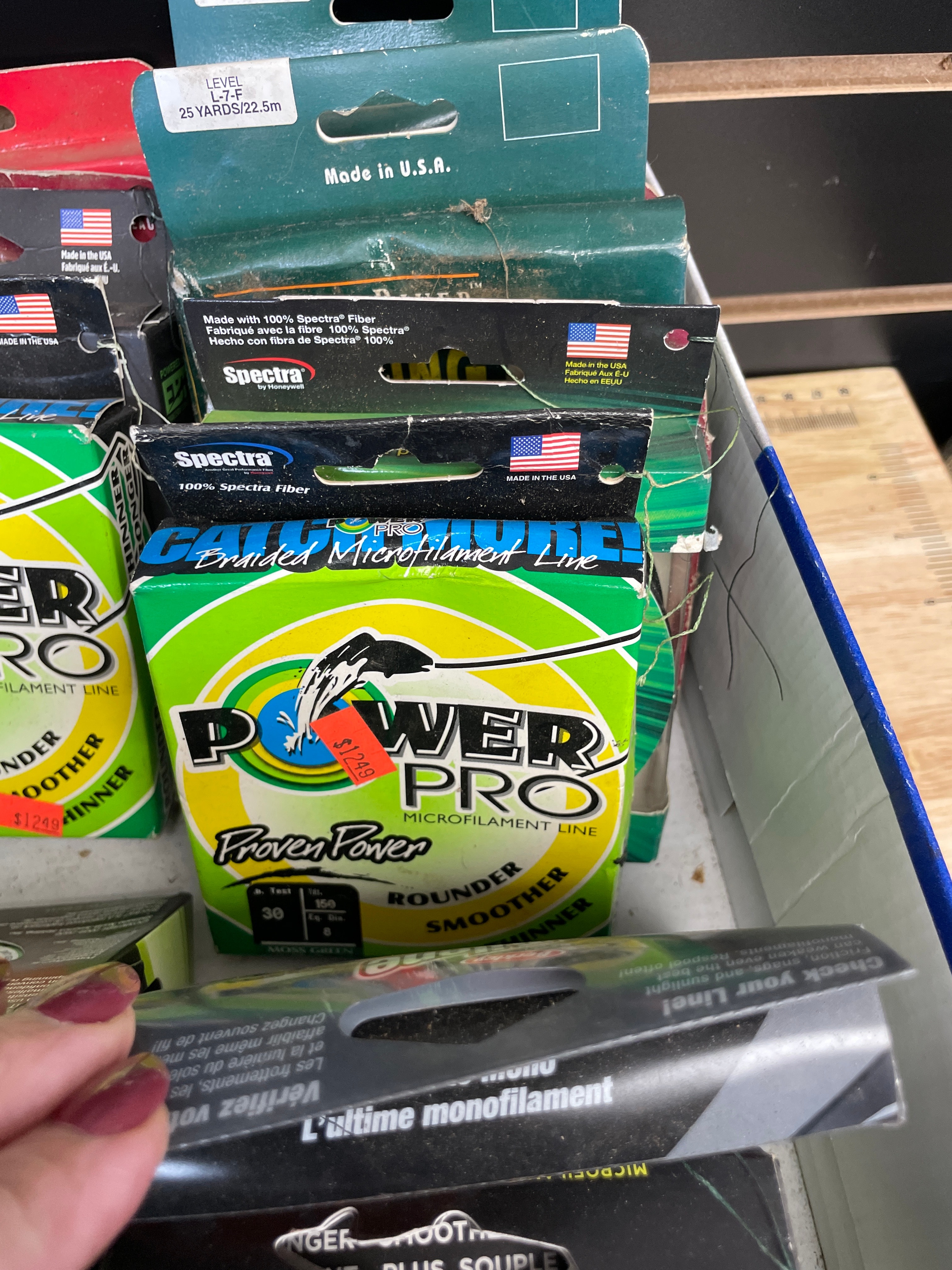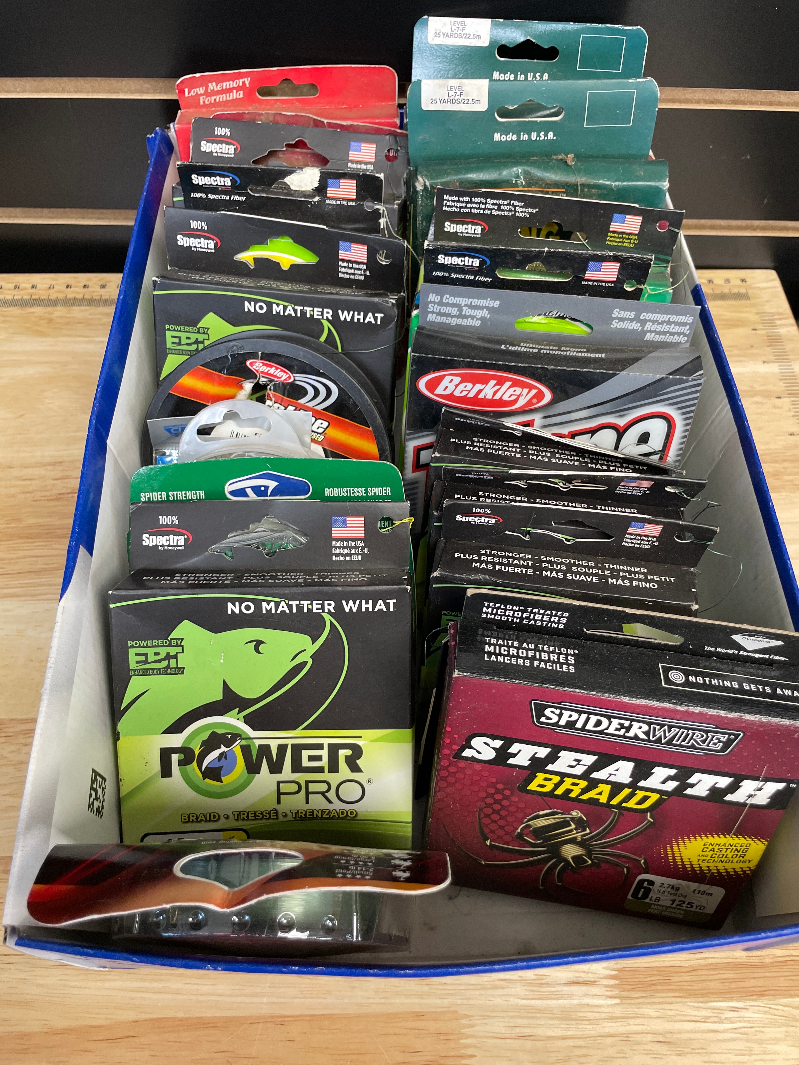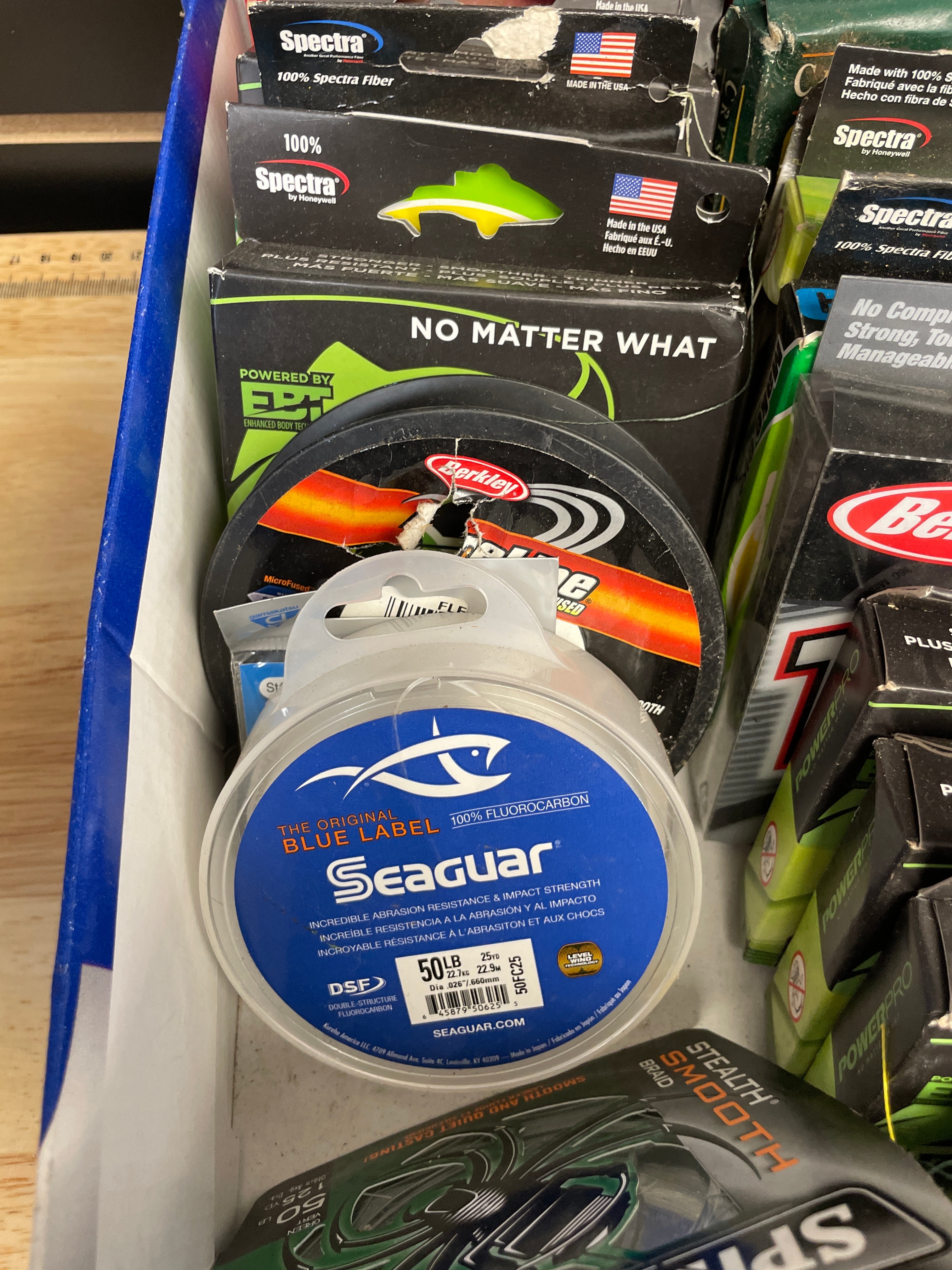 A collection of fishing line spools, featuring a Seaguar 100% Fluorocarbon 50 LB line spool marked ‘THE ORIGINAL BLUE LABEL’, ‘DSF’, ‘DIA .027in 22.9kg’, and ‘MADE IN JAPAN’, along with Power Pro, Spiderwire, Berkley, and Spectra lines.