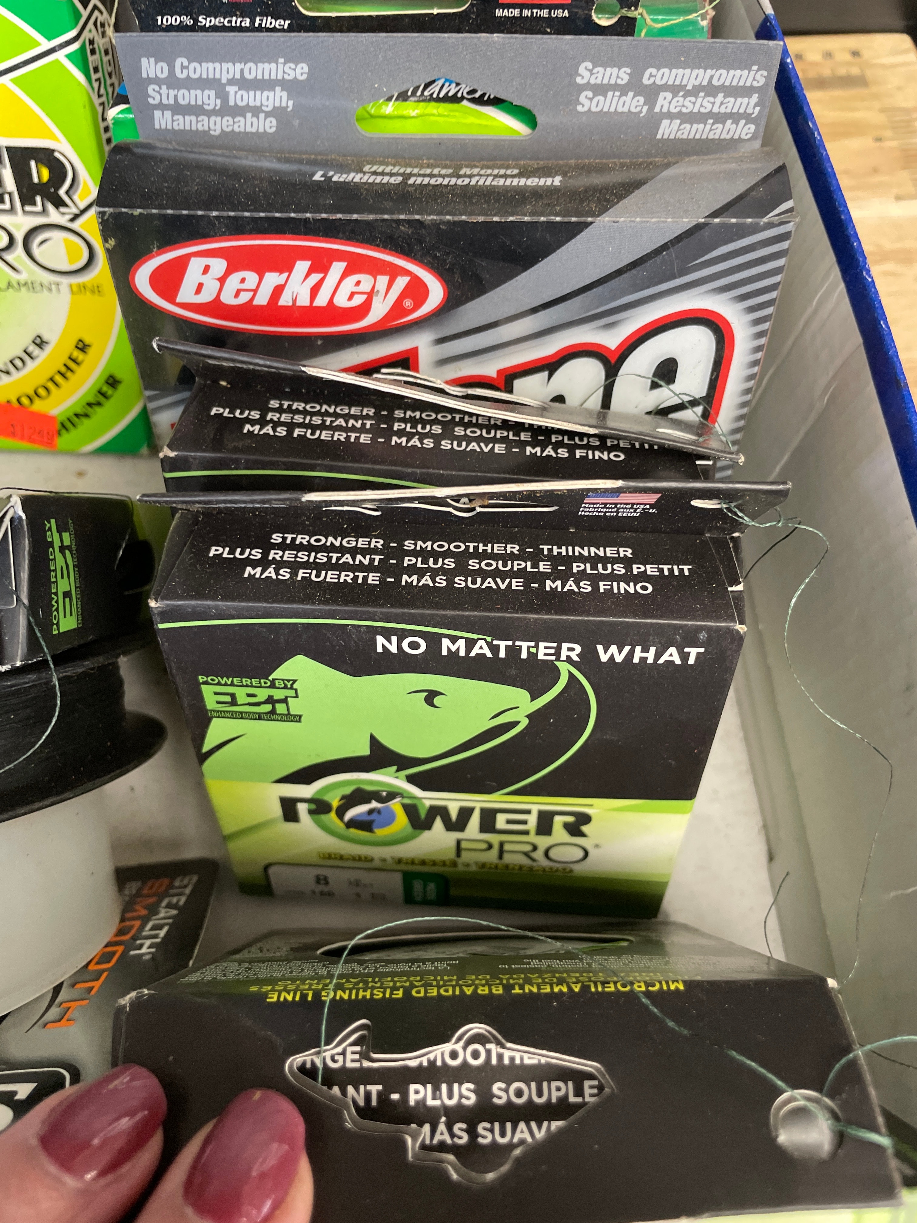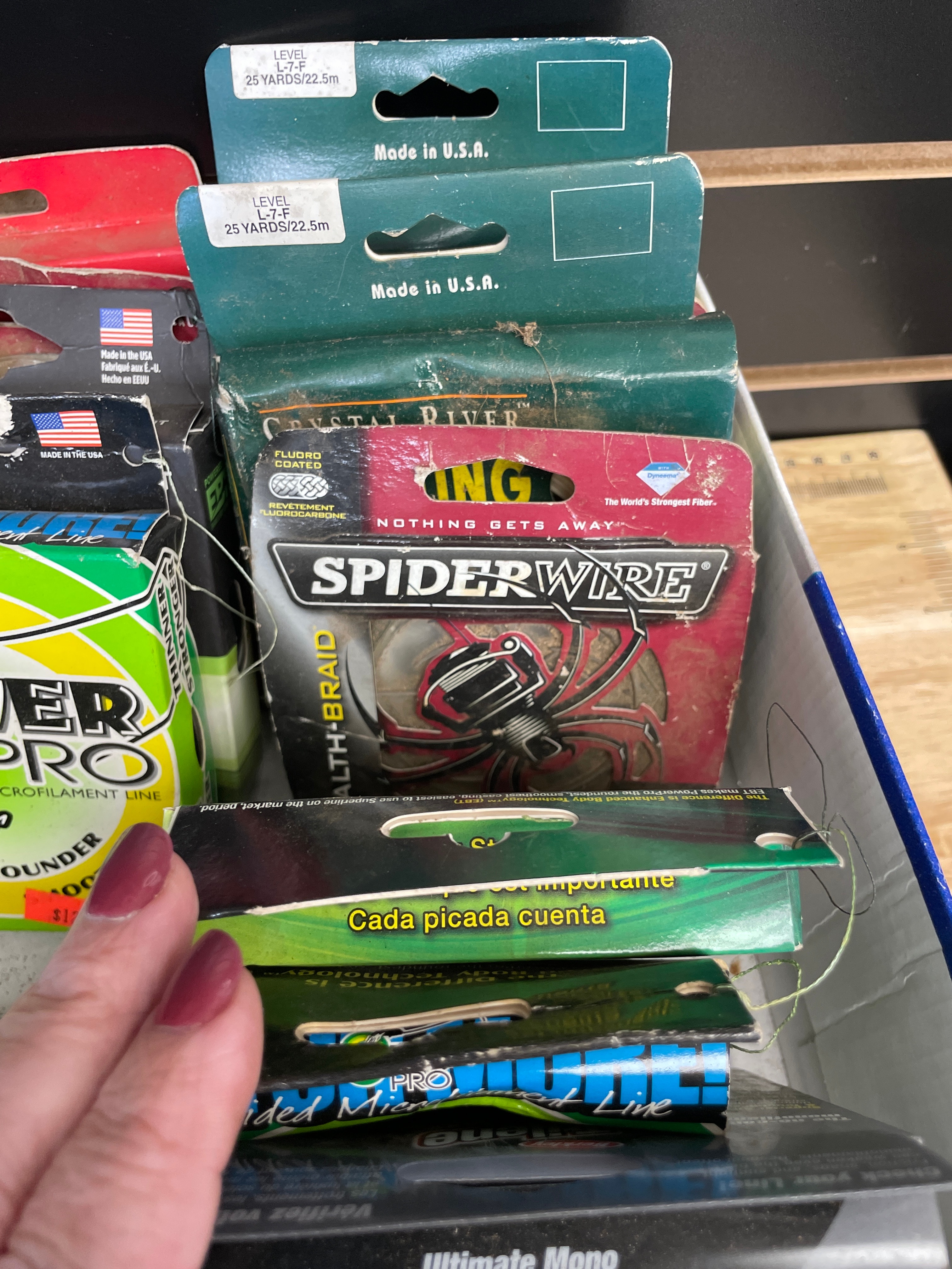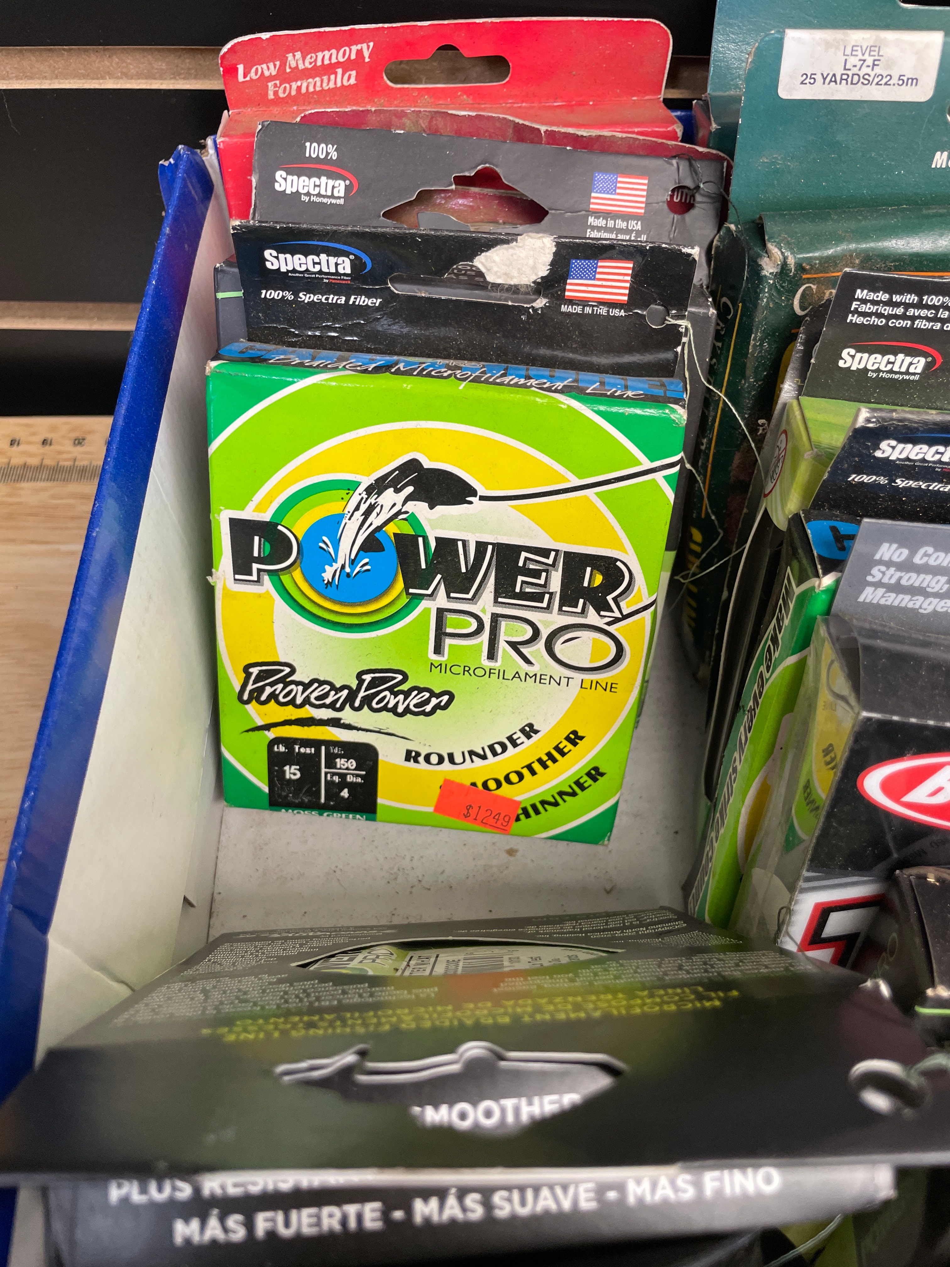 A collection of fishing line spools, featuring a Seaguar 100% Fluorocarbon 50 LB line spool marked ‘THE ORIGINAL BLUE LABEL’, ‘DSF’, ‘DIA .027in 22.9kg’, and ‘MADE IN JAPAN’, along with Power Pro, Spiderwire, Berkley, and Spectra lines.