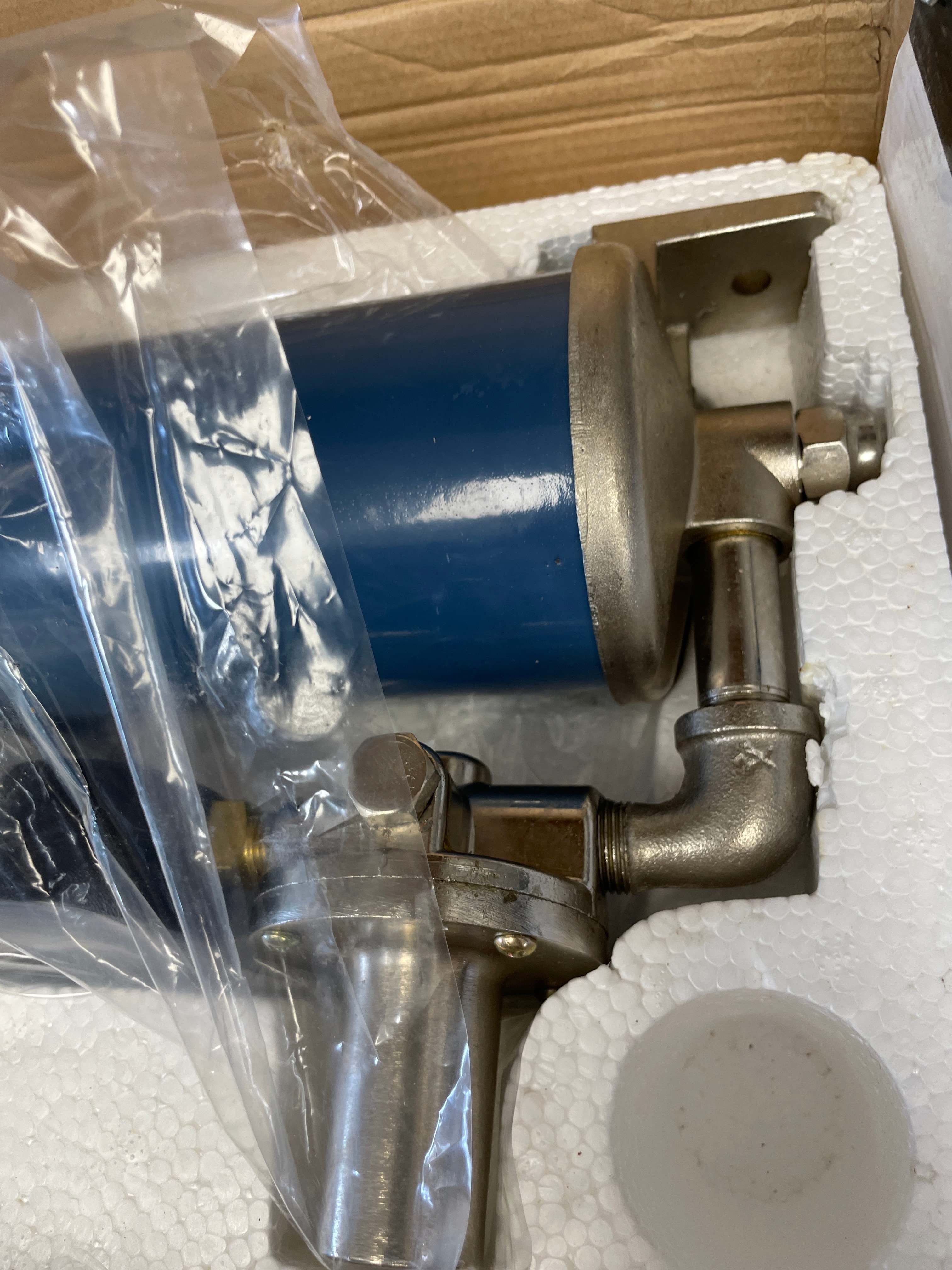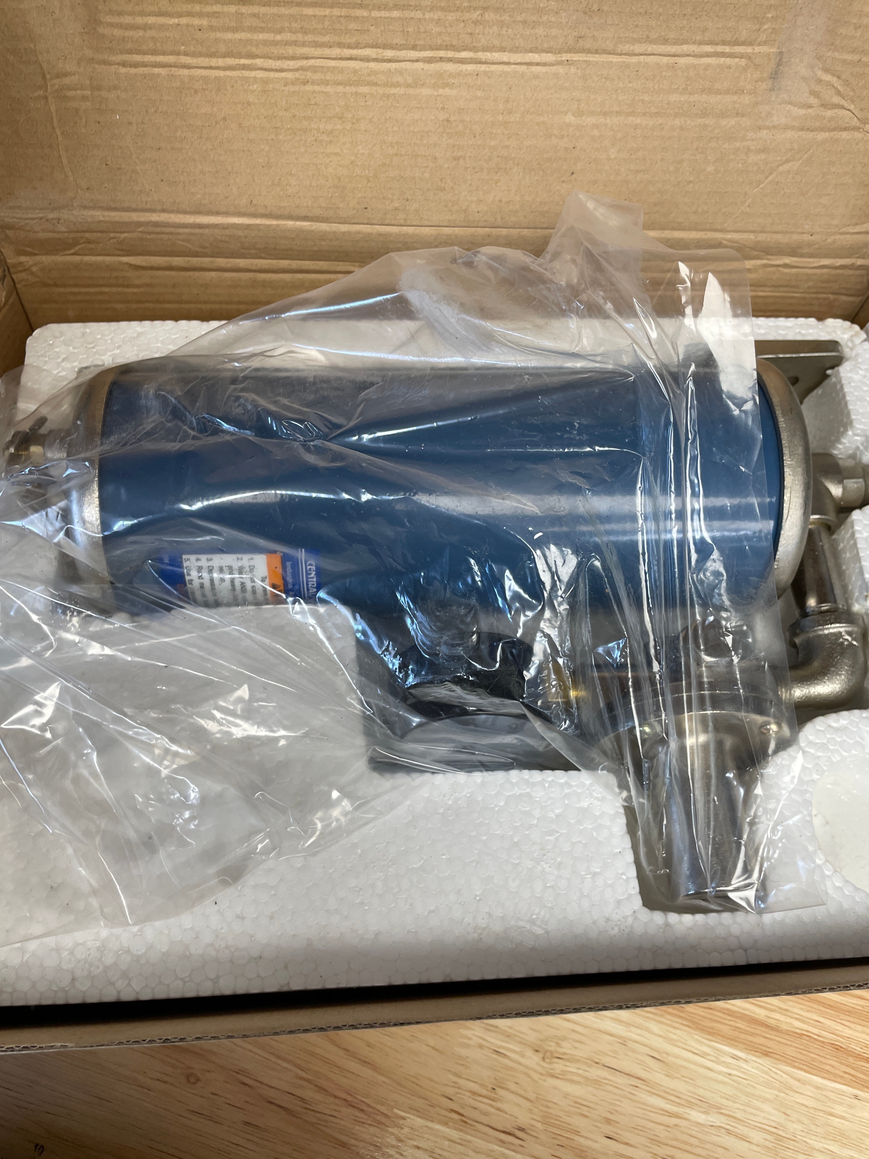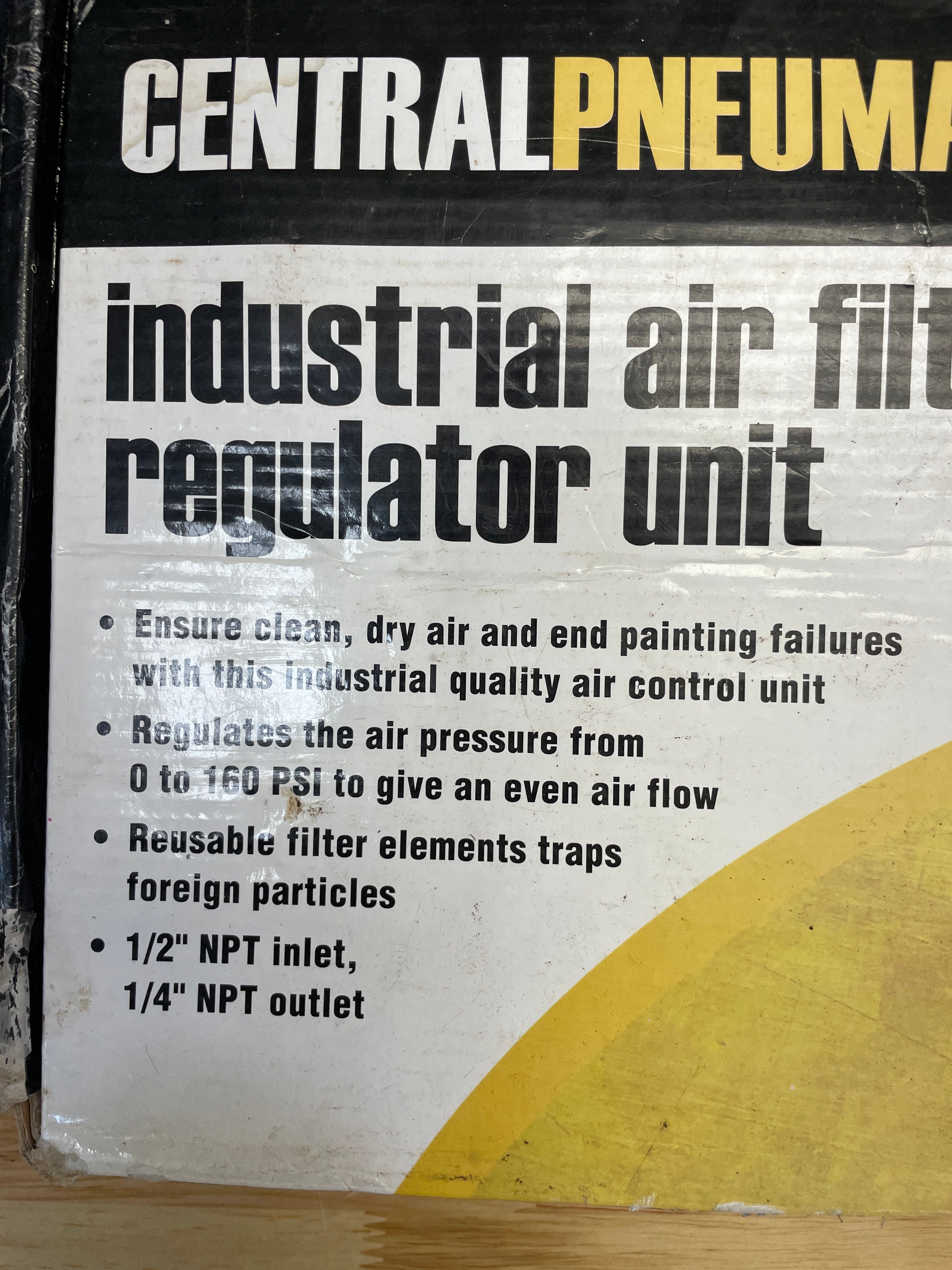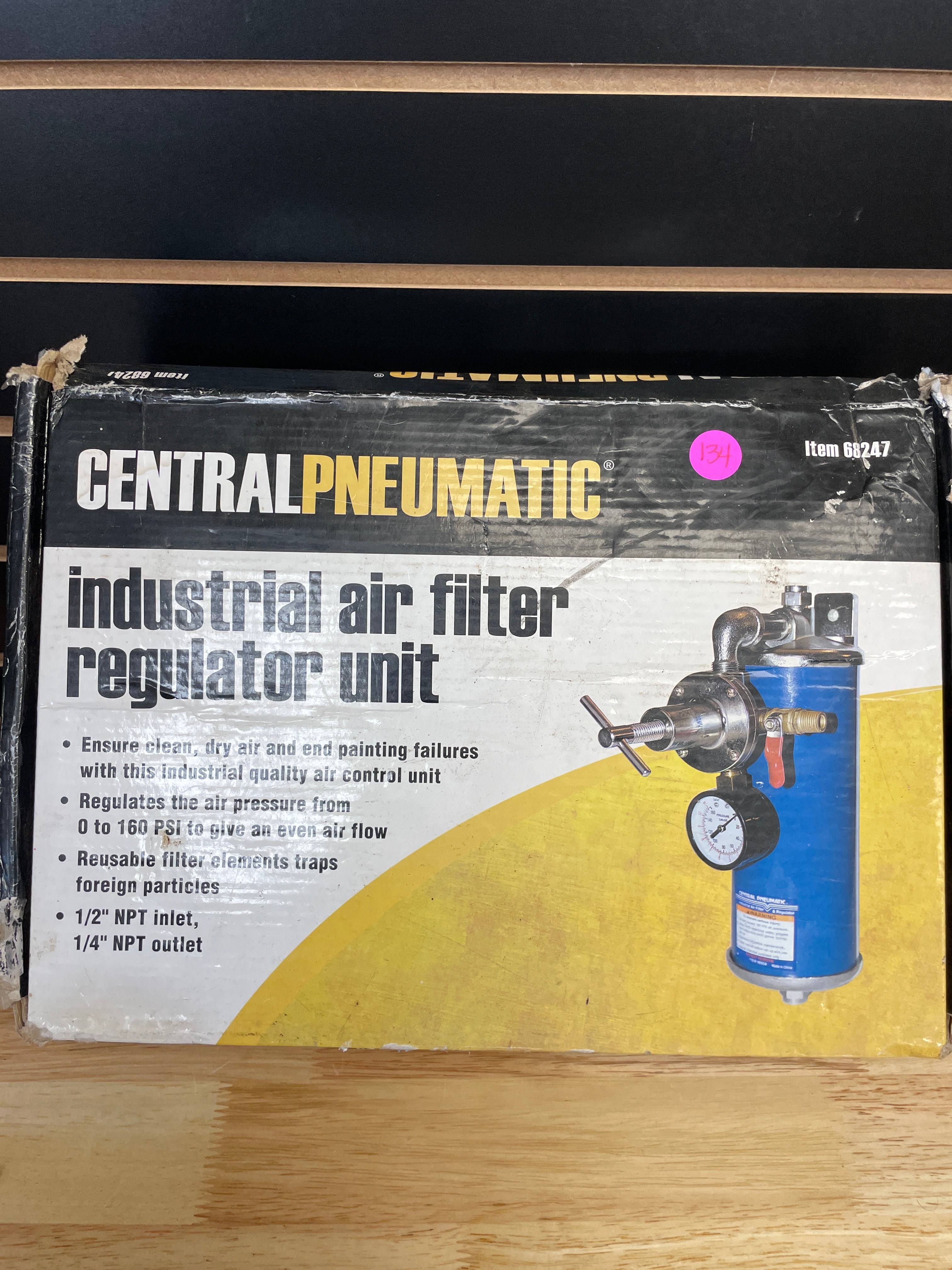 One blue and metallic Central Pneumatic industrial air filter regulator unit, Item 68247, in its original black and yellow box, regulating air pressure from 0 to 160 PSI with 1/2″ NPT inlet and 1/4″ NPT outlet.
