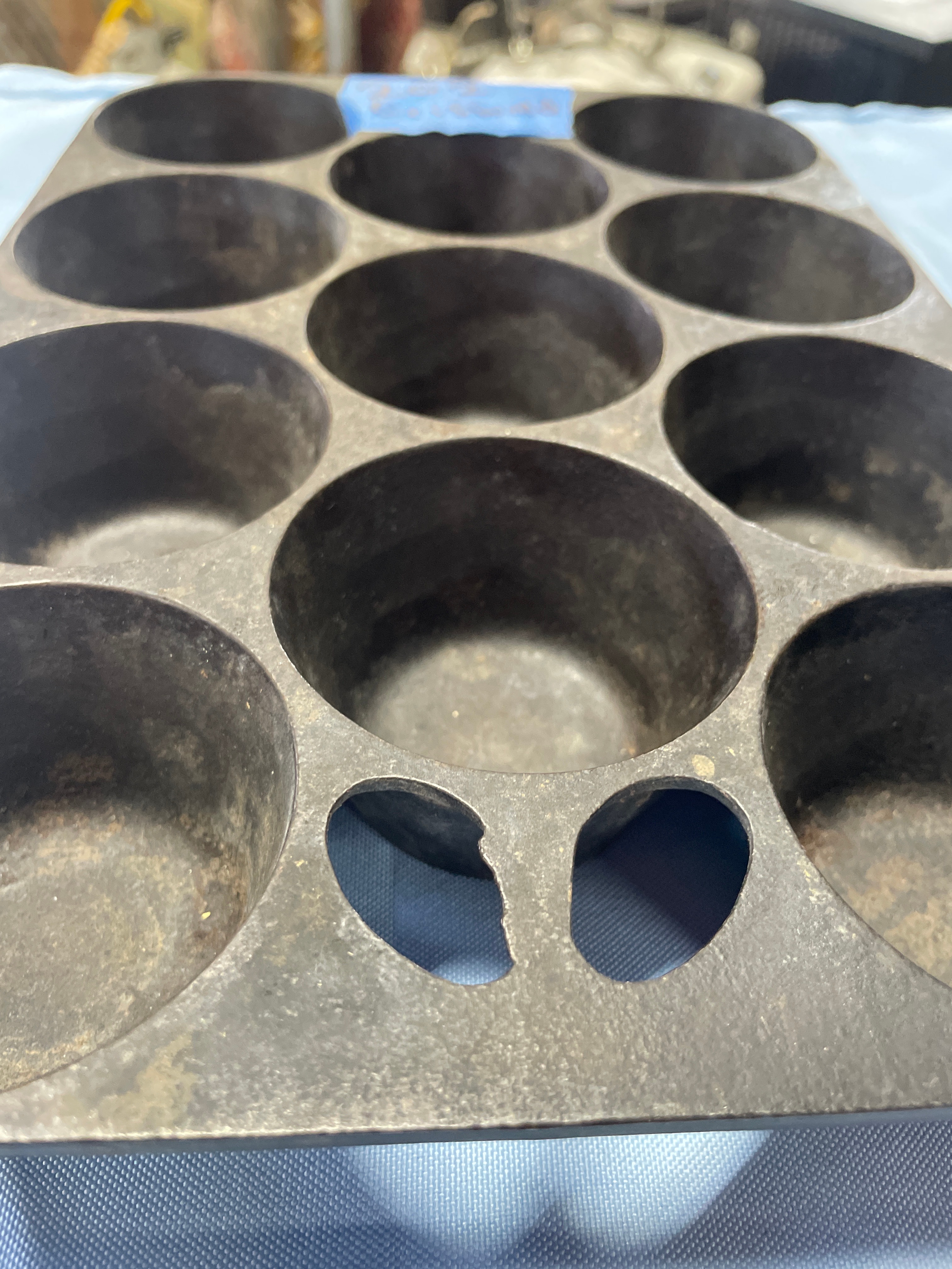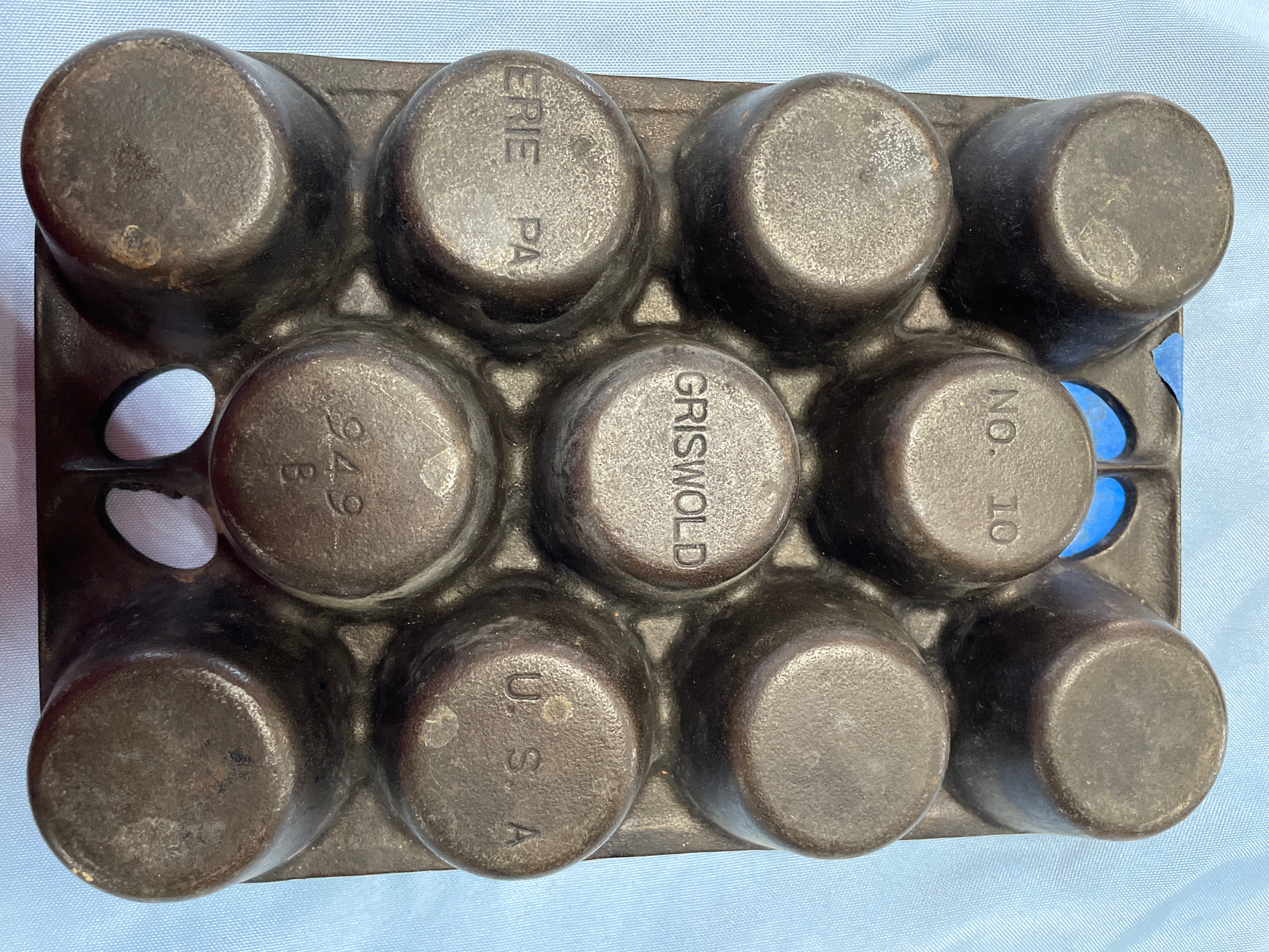 A dark grey/black cast iron muffin pan, marked “Griswold”, “ERIE PA”, “949 B”, “NO. 10”, and “U.S.A.” on its underside.