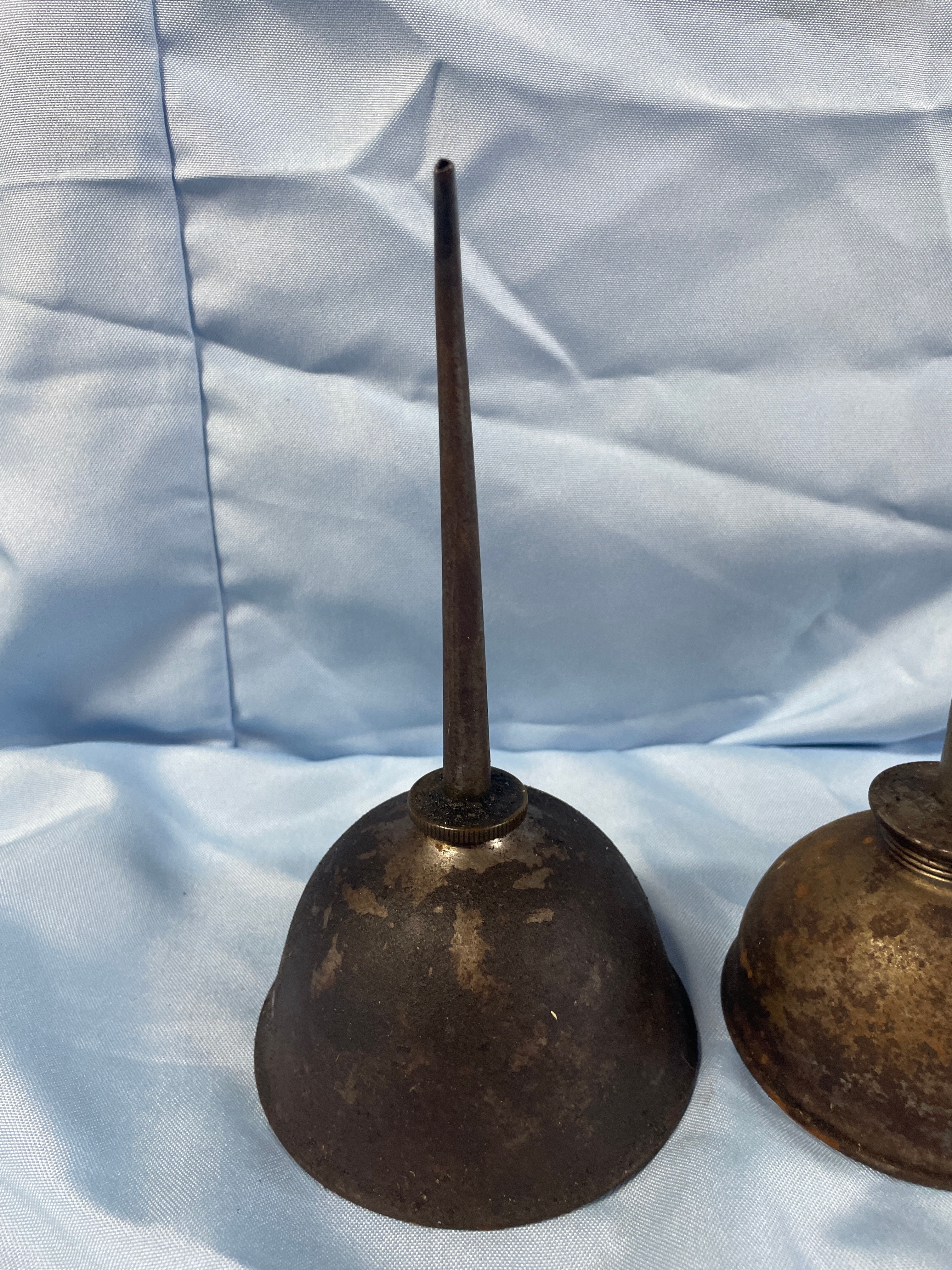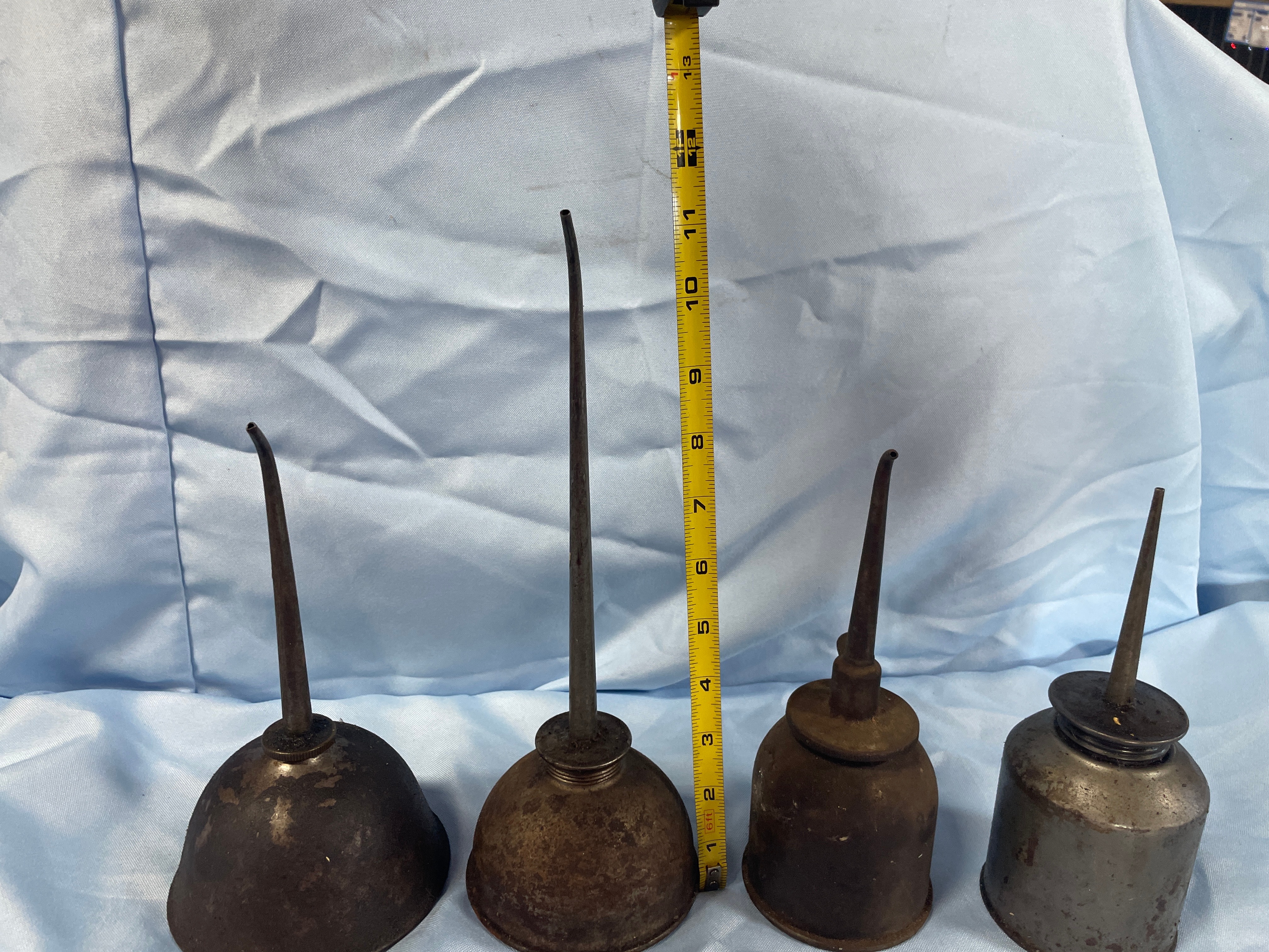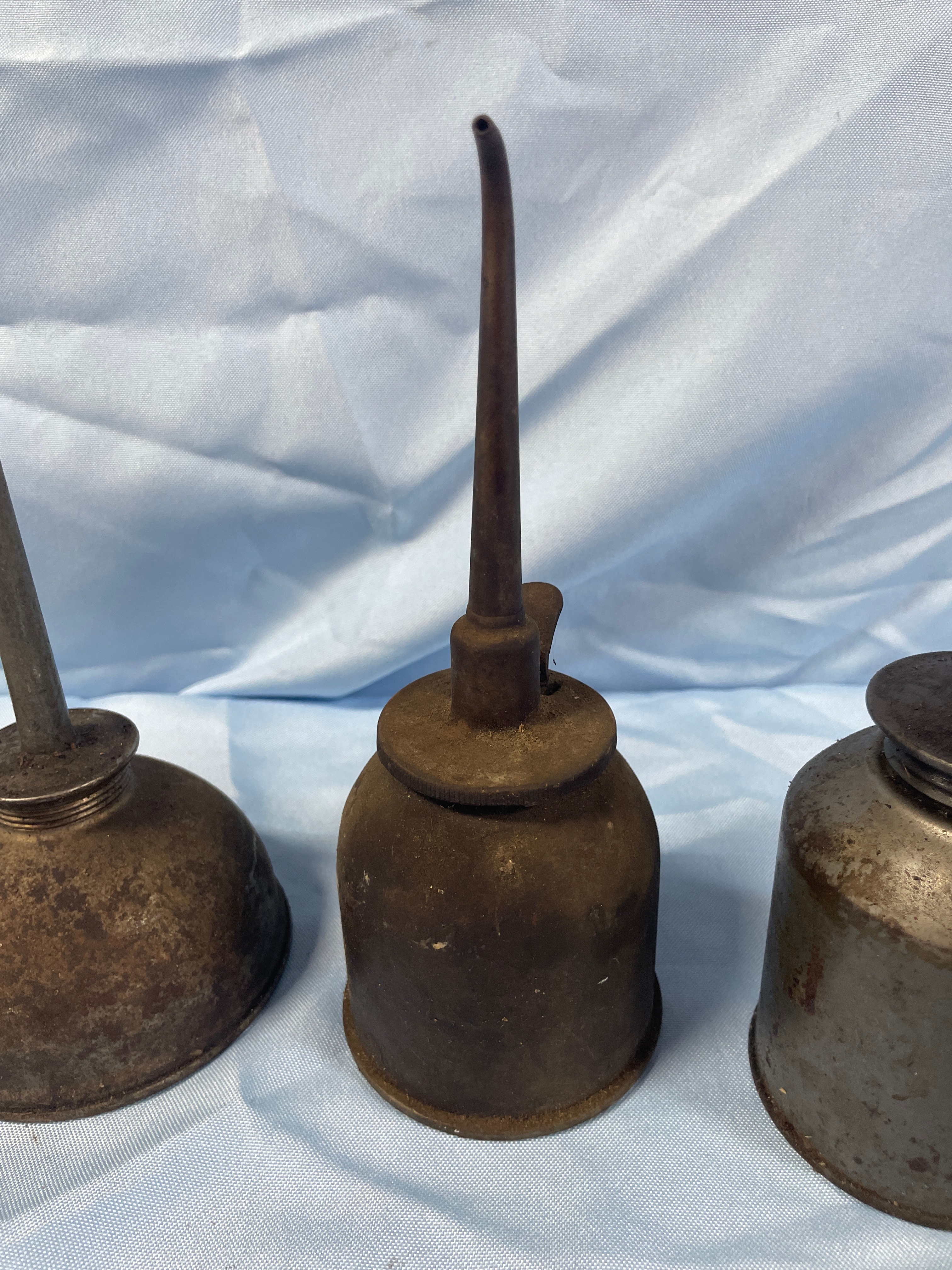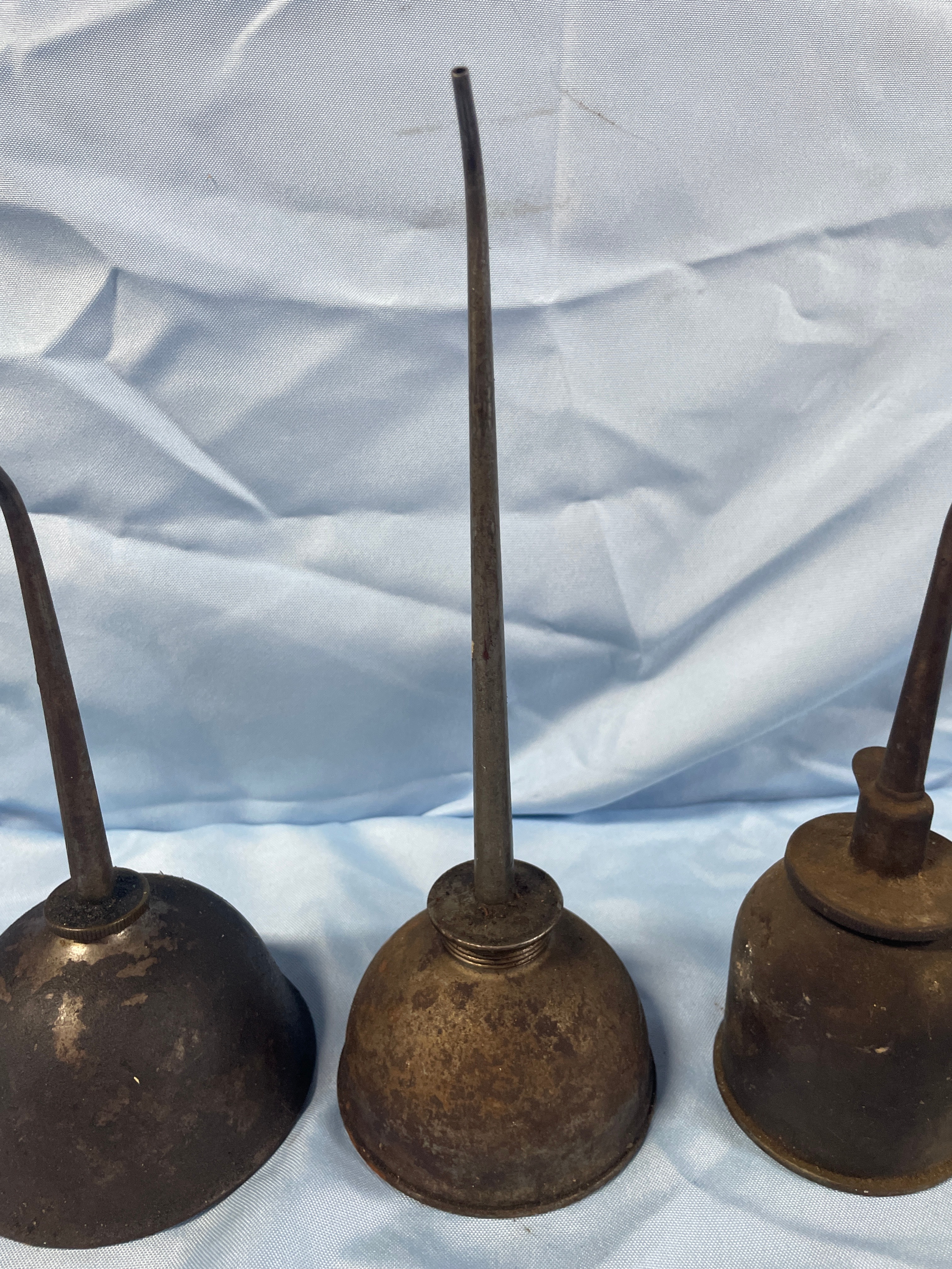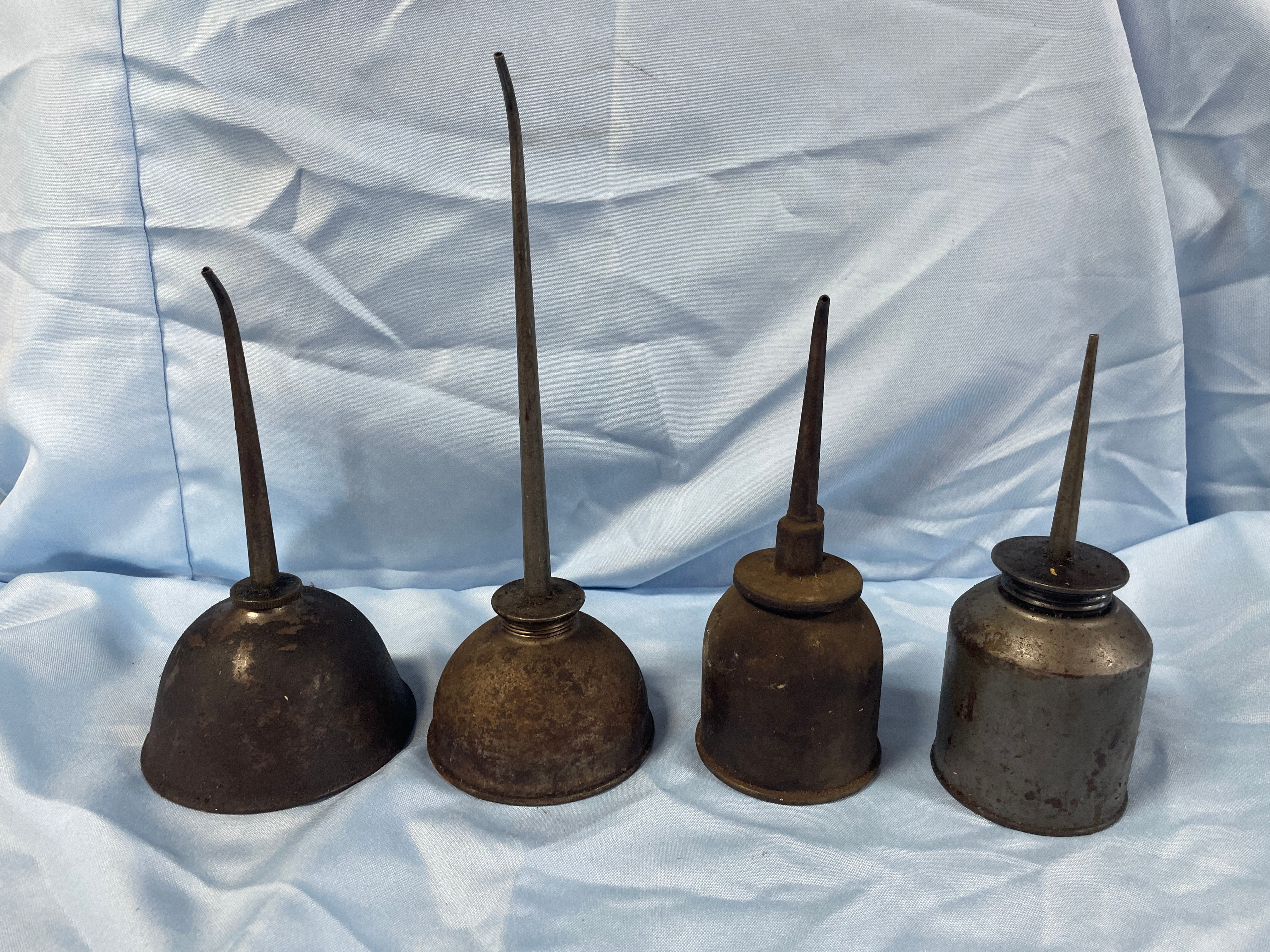 Four antique or vintage thumb pump oil cans, primarily dark brown, rusty brown, and dark grey, measuring approximately 6.5 to 9.5 inches tall.