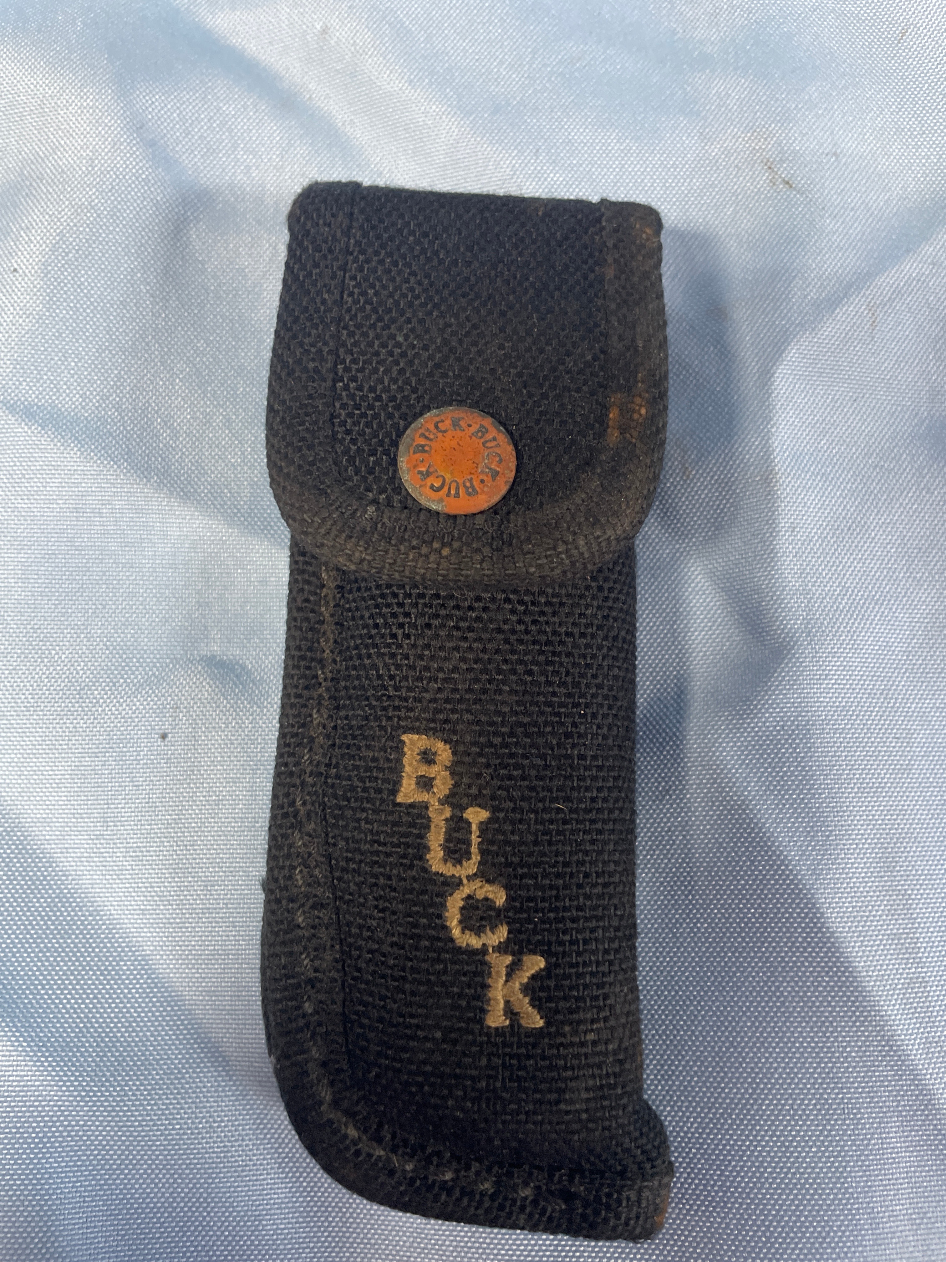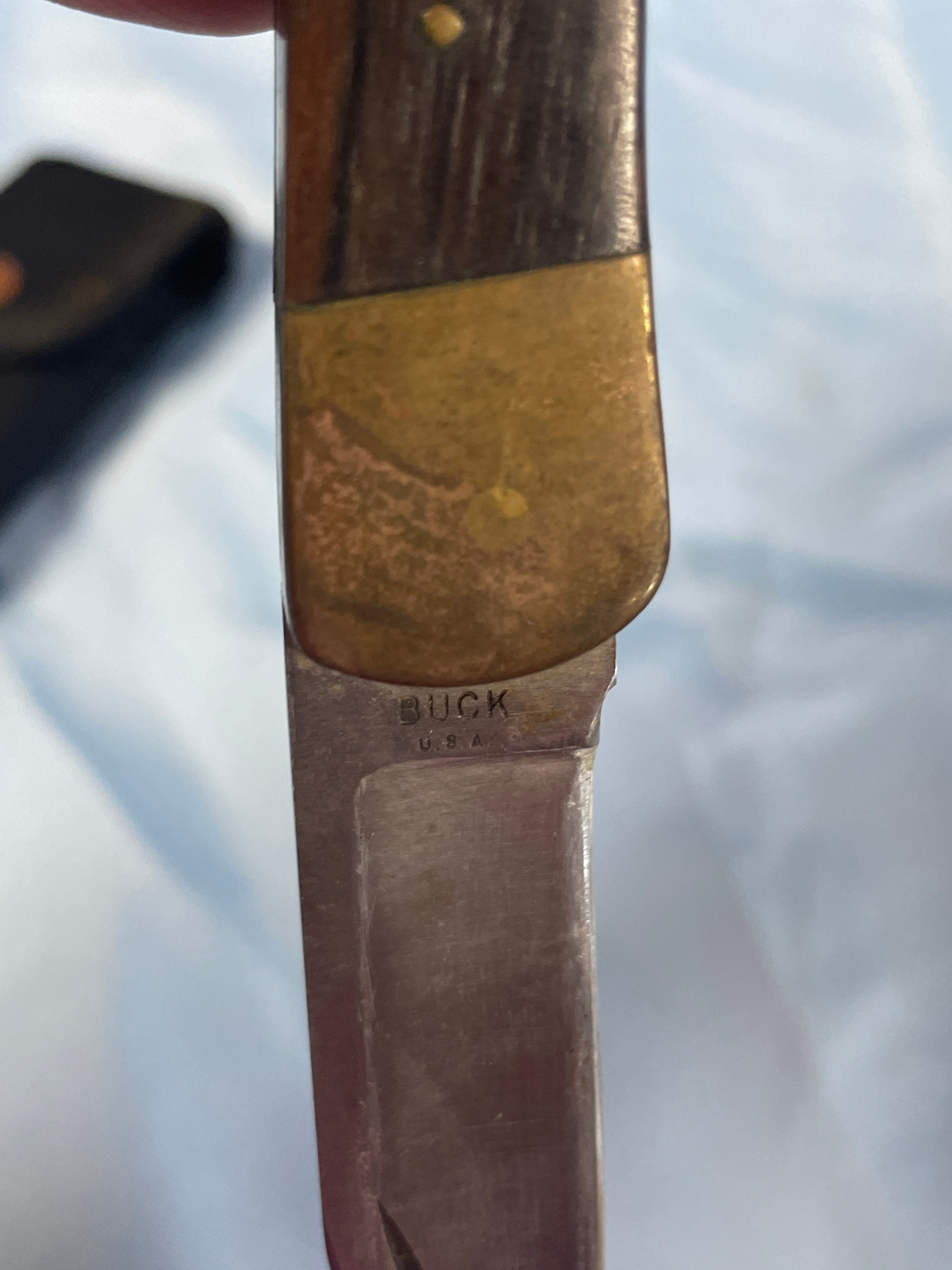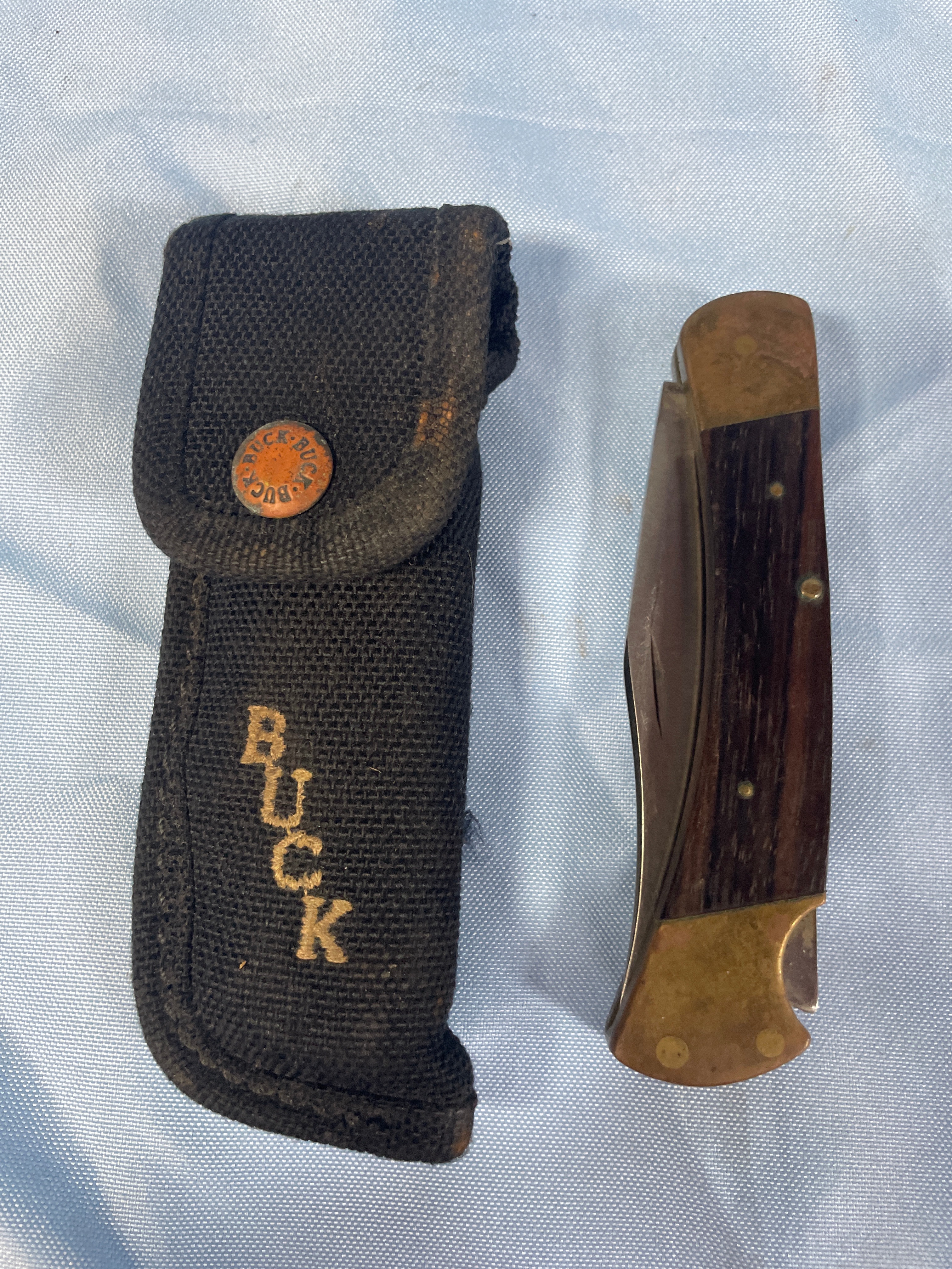 A folding knife with a silver blade, dark brown wood handle, and brass bolsters, bearing “BUCK U.S.A.” on the blade, accompanied by a black sheath embroidered with “BUCK” and a circular “BUCK” snap button, with the blade measuring approximately 3 inches.