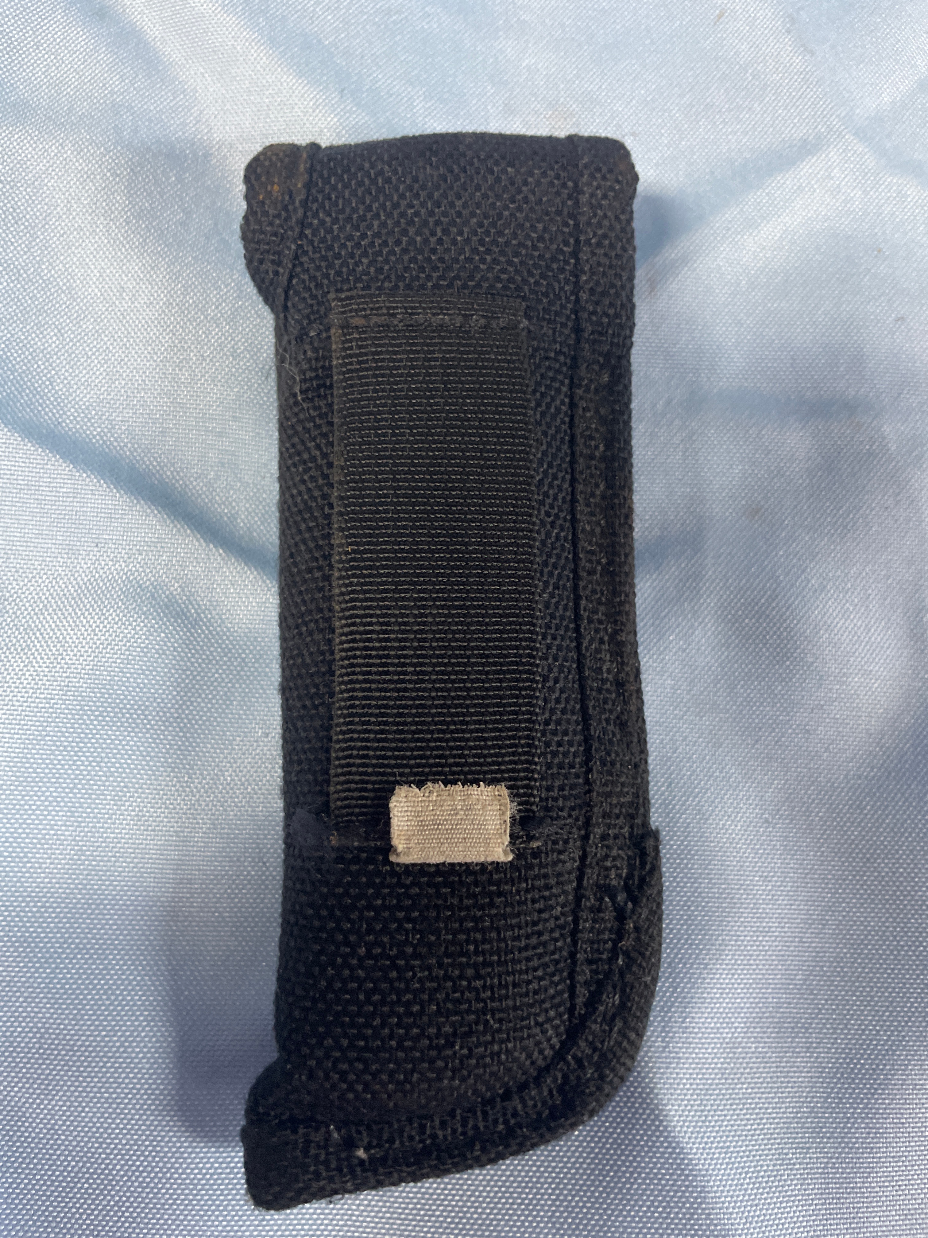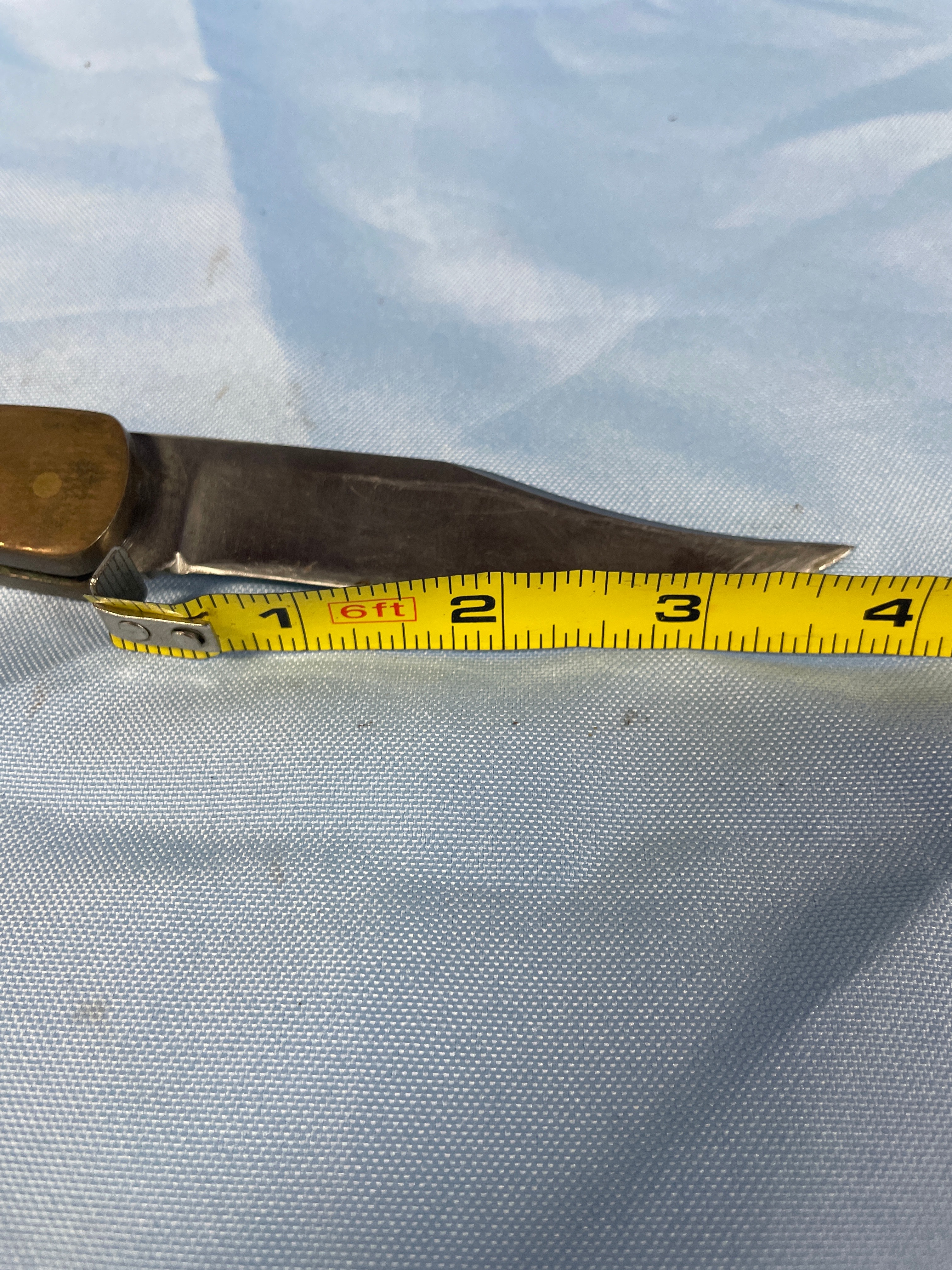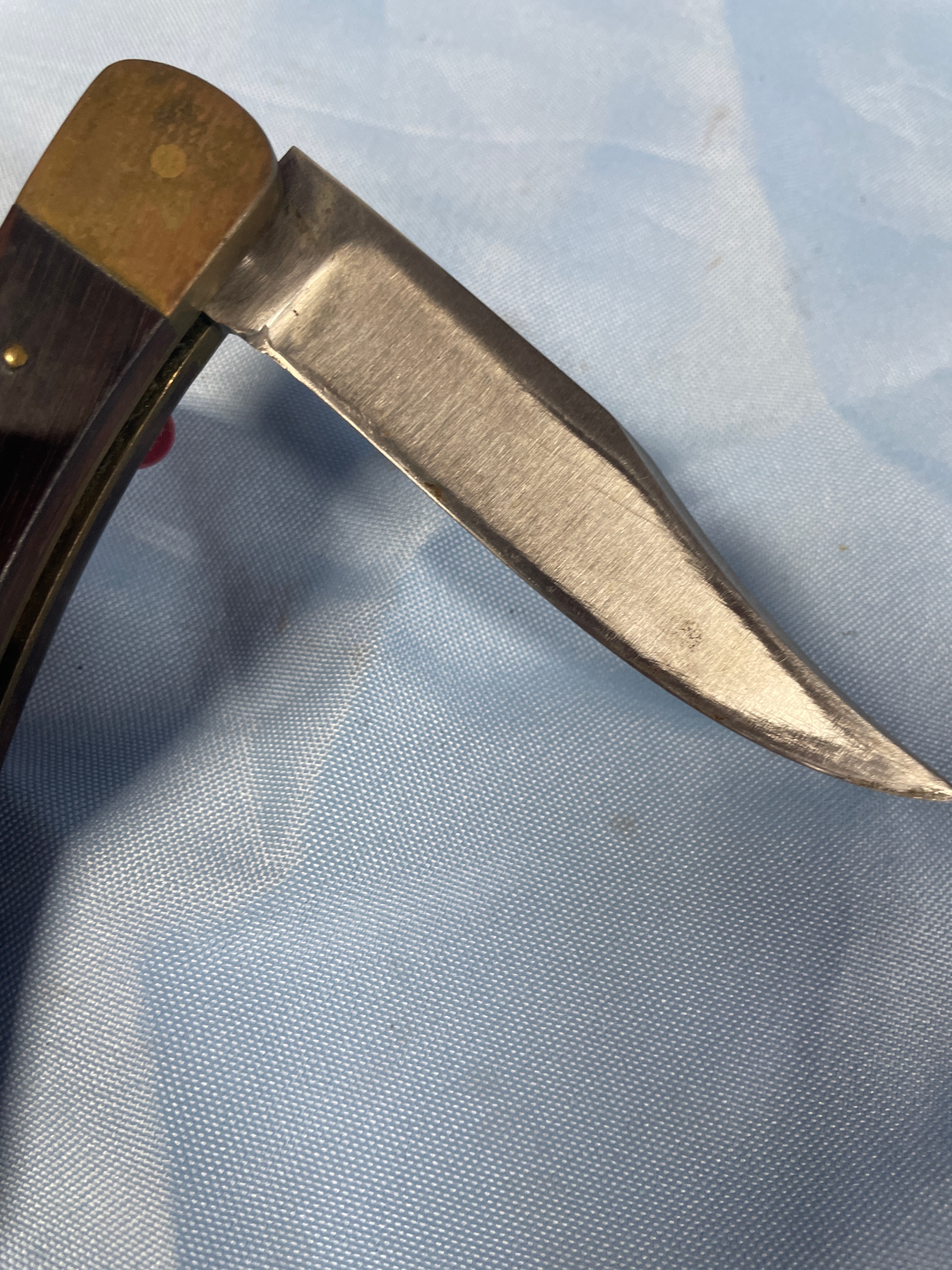 A folding knife with a silver blade, dark brown wood handle, and brass bolsters, bearing “BUCK U.S.A.” on the blade, accompanied by a black sheath embroidered with “BUCK” and a circular “BUCK” snap button, with the blade measuring approximately 3 inches.
