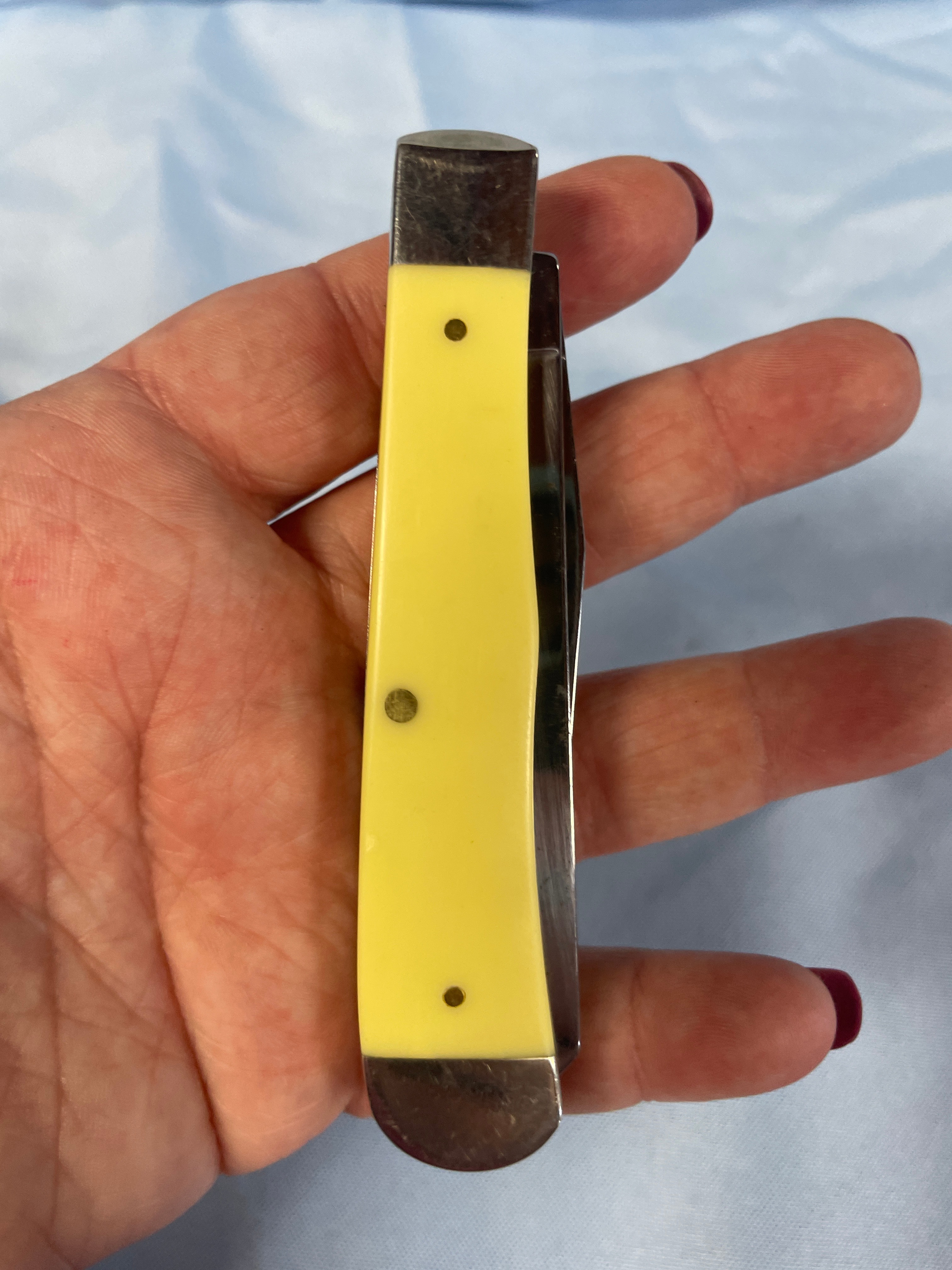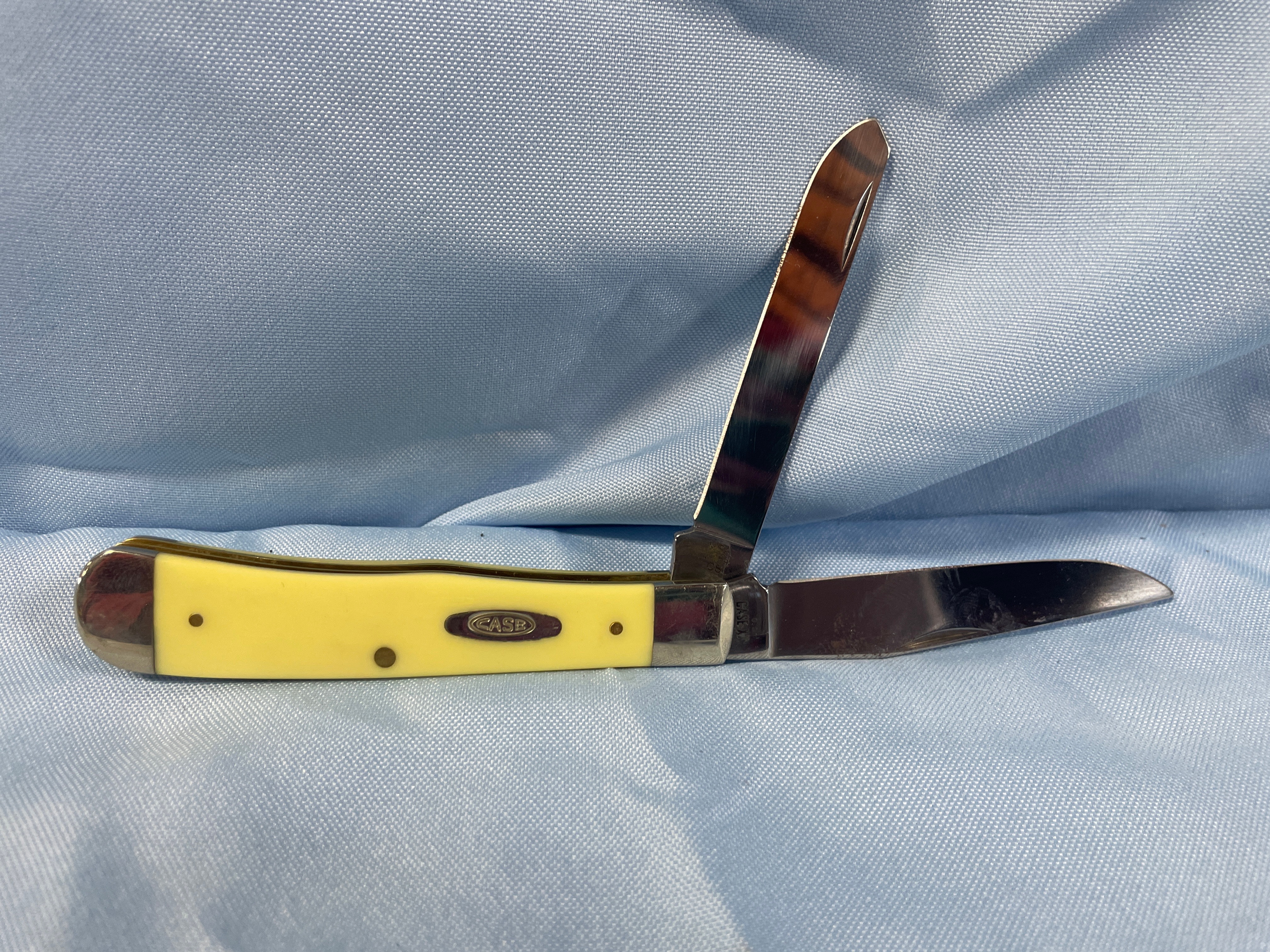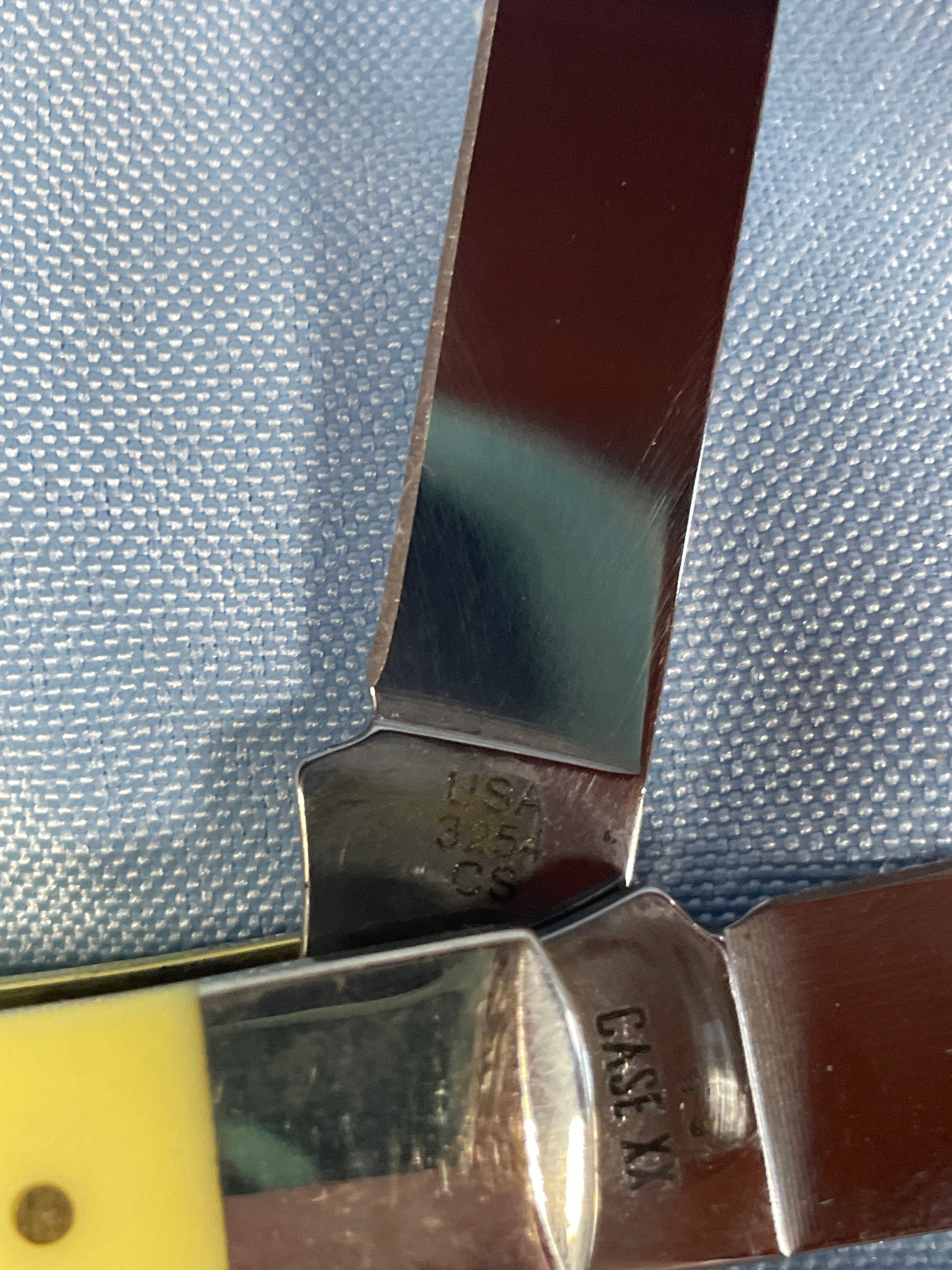 A yellow and silver Case Trapper measuring approximately 3.5 inches long when closed, with an oval “CASE” emblem on the handle, and “CASE XX” and “USA 3254 CS” inscribed on the blades.Never Sharpened, never carried. Carbon Steel Blade. No box.