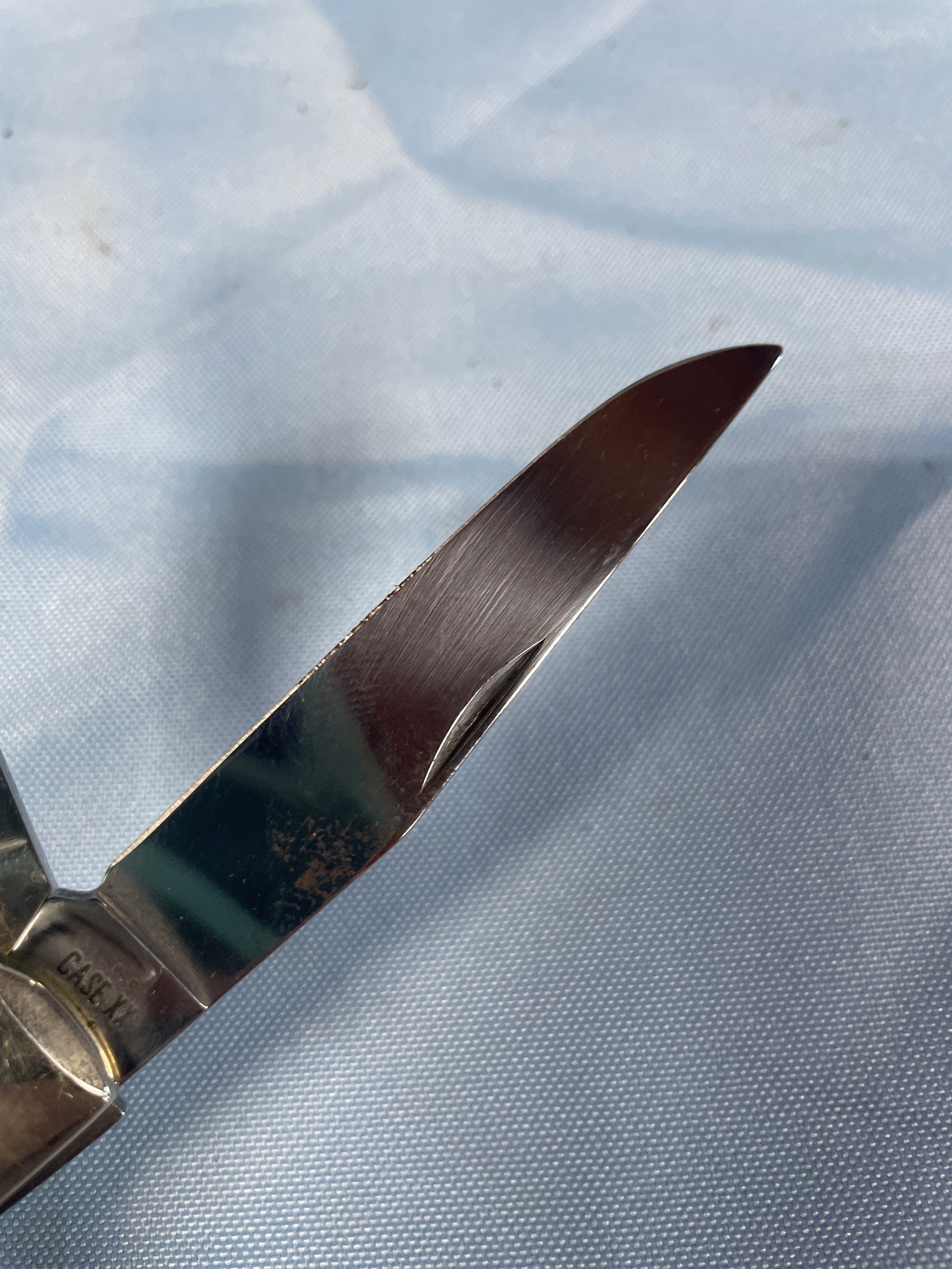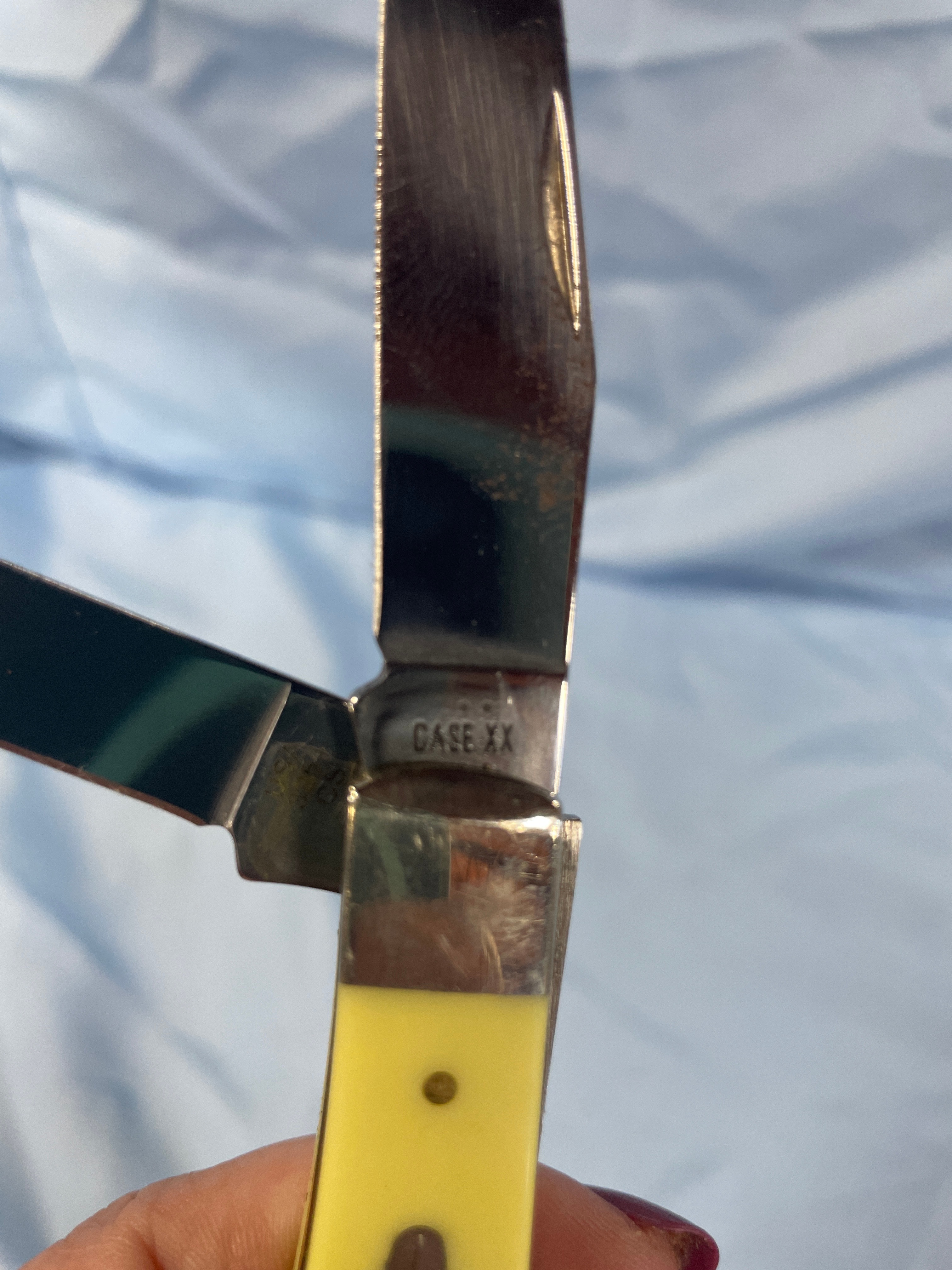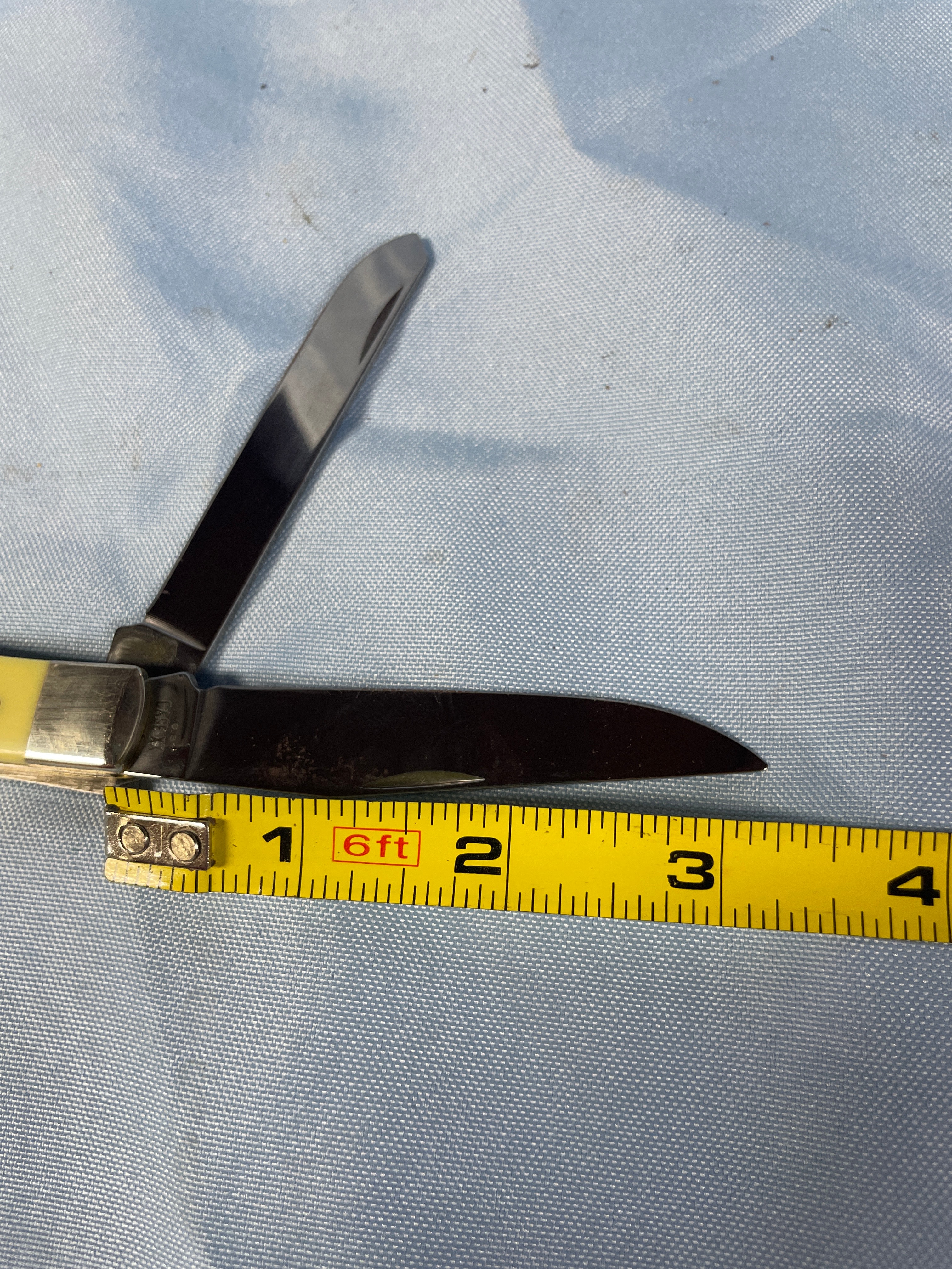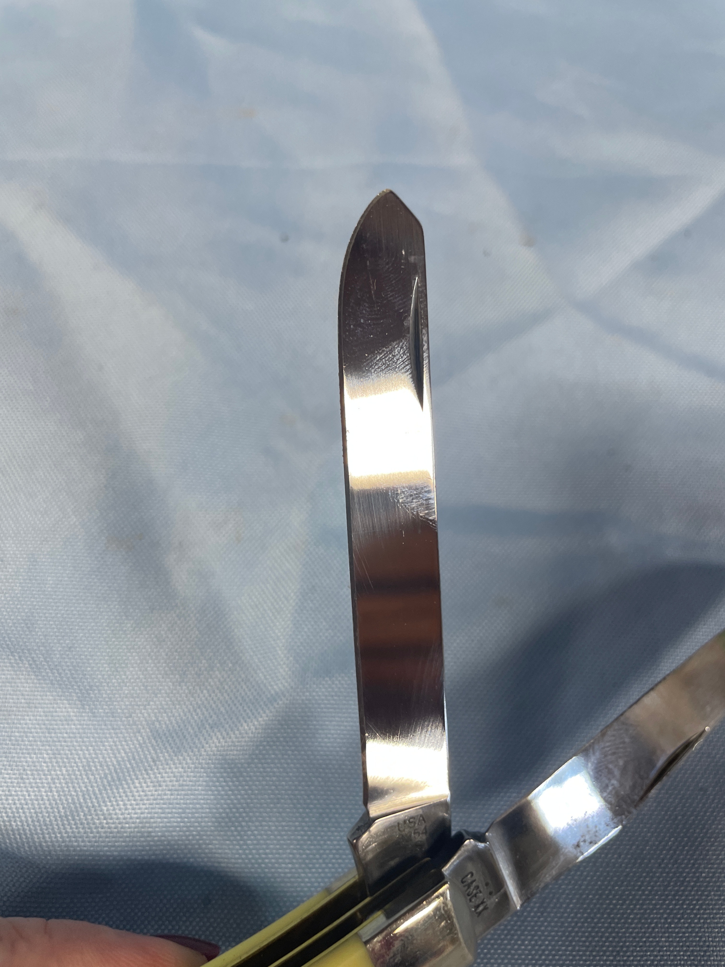 A yellow and silver Case Trapper measuring approximately 3.5 inches long when closed, with an oval “CASE” emblem on the handle, and “CASE XX” and “USA 3254 CS” inscribed on the blades.Never Sharpened, never carried. Carbon Steel Blade. No box.