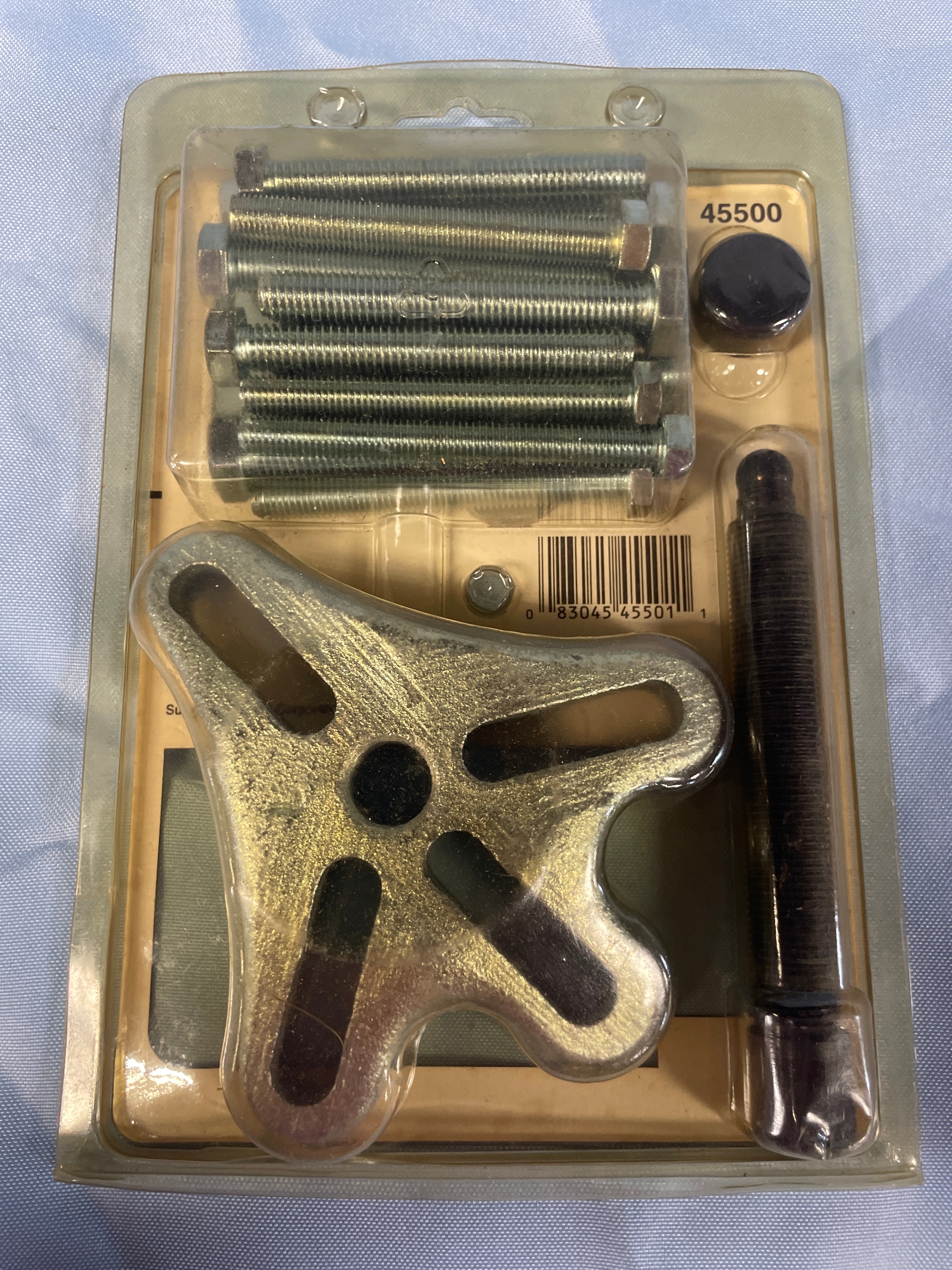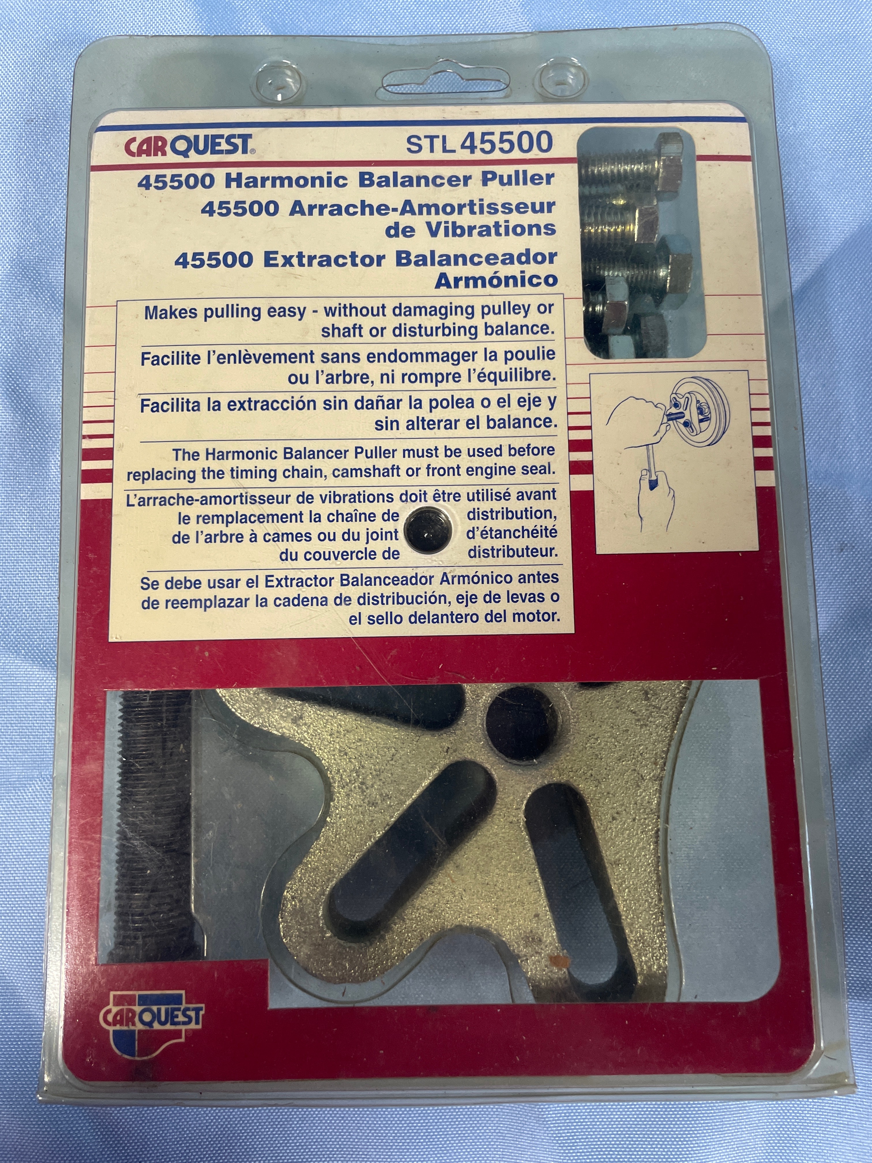 A CARQUEST 45500 Harmonic Balancer Puller kit, comprising a brass-colored main puller body, eight silver-colored bolts, a black threaded rod, and a black cap.