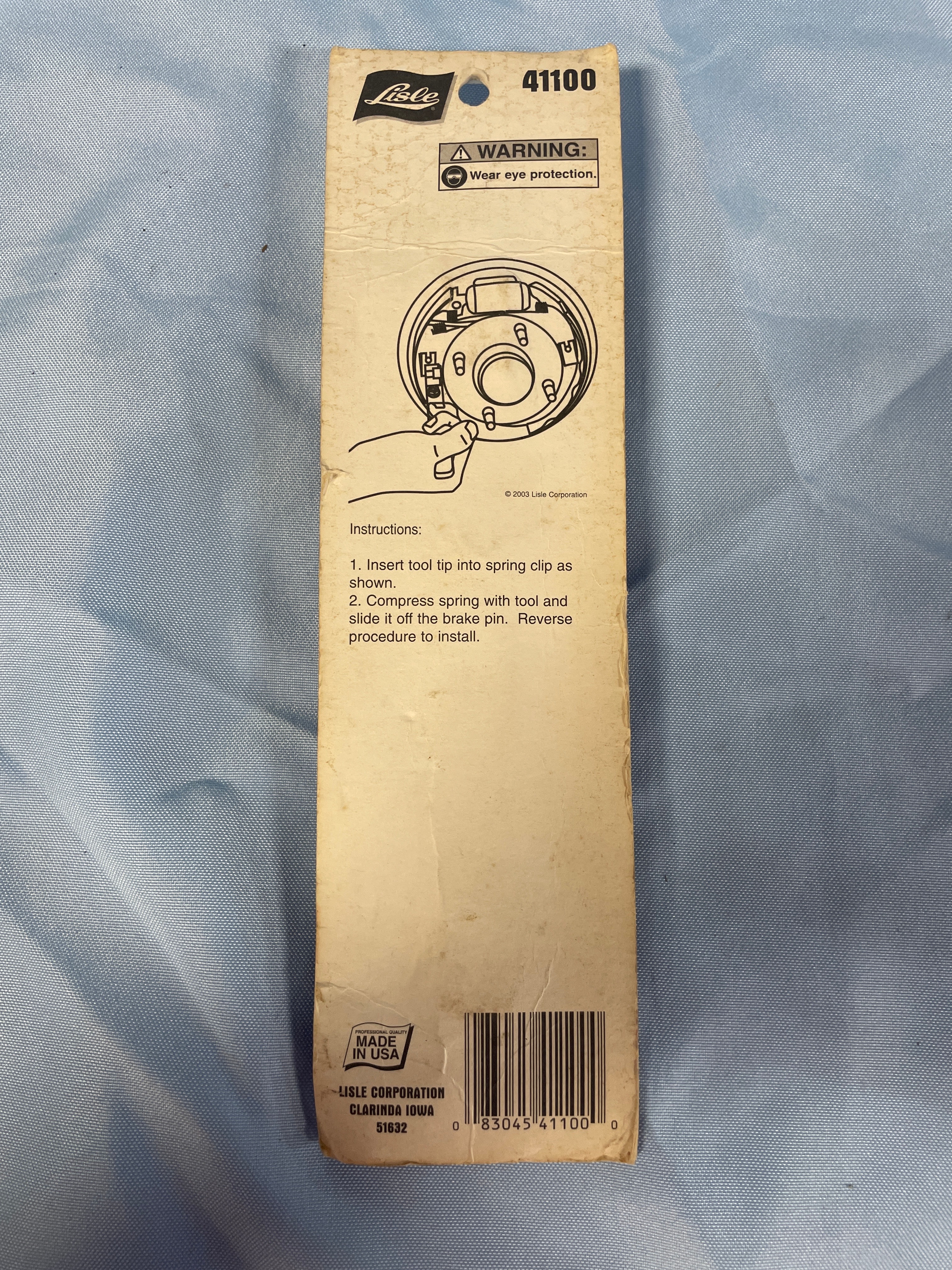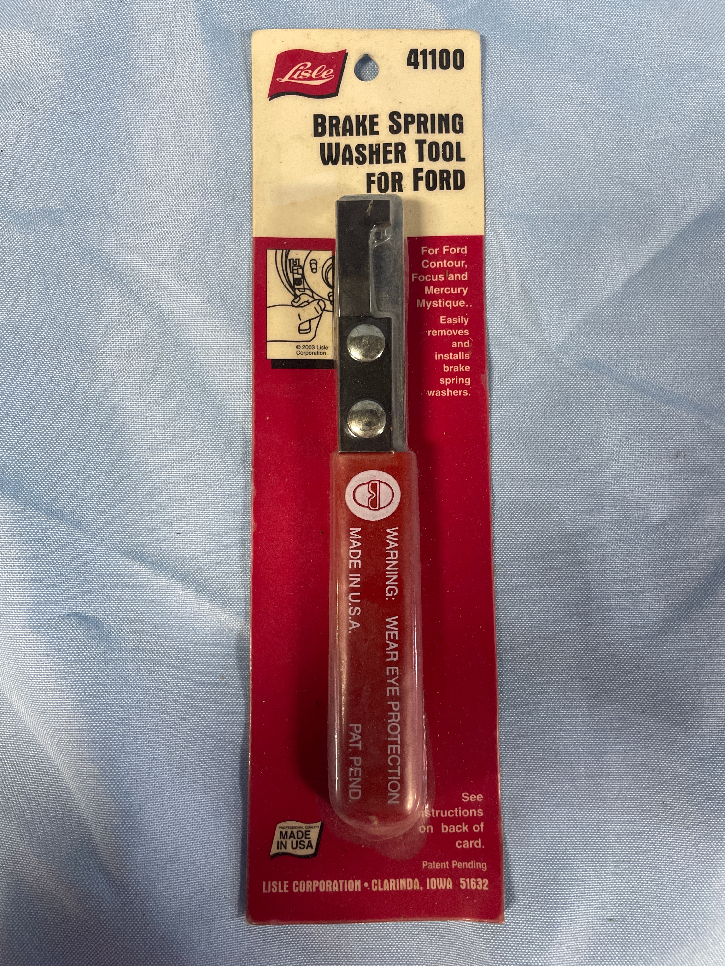 A red and silver/metallic Lisle 41100 Brake Spring Washer Tool for Ford, new in original packaging, made in U.S.A.