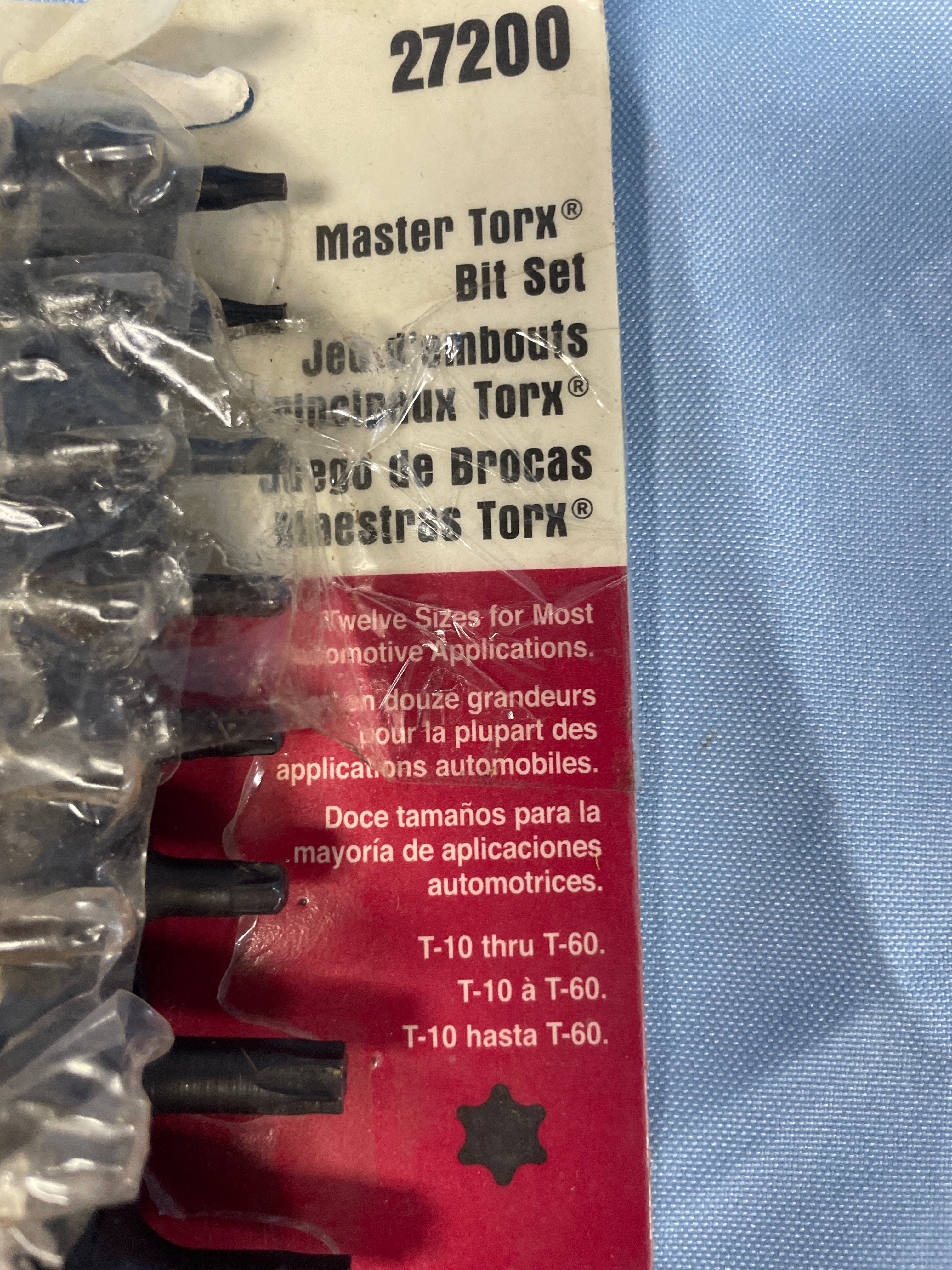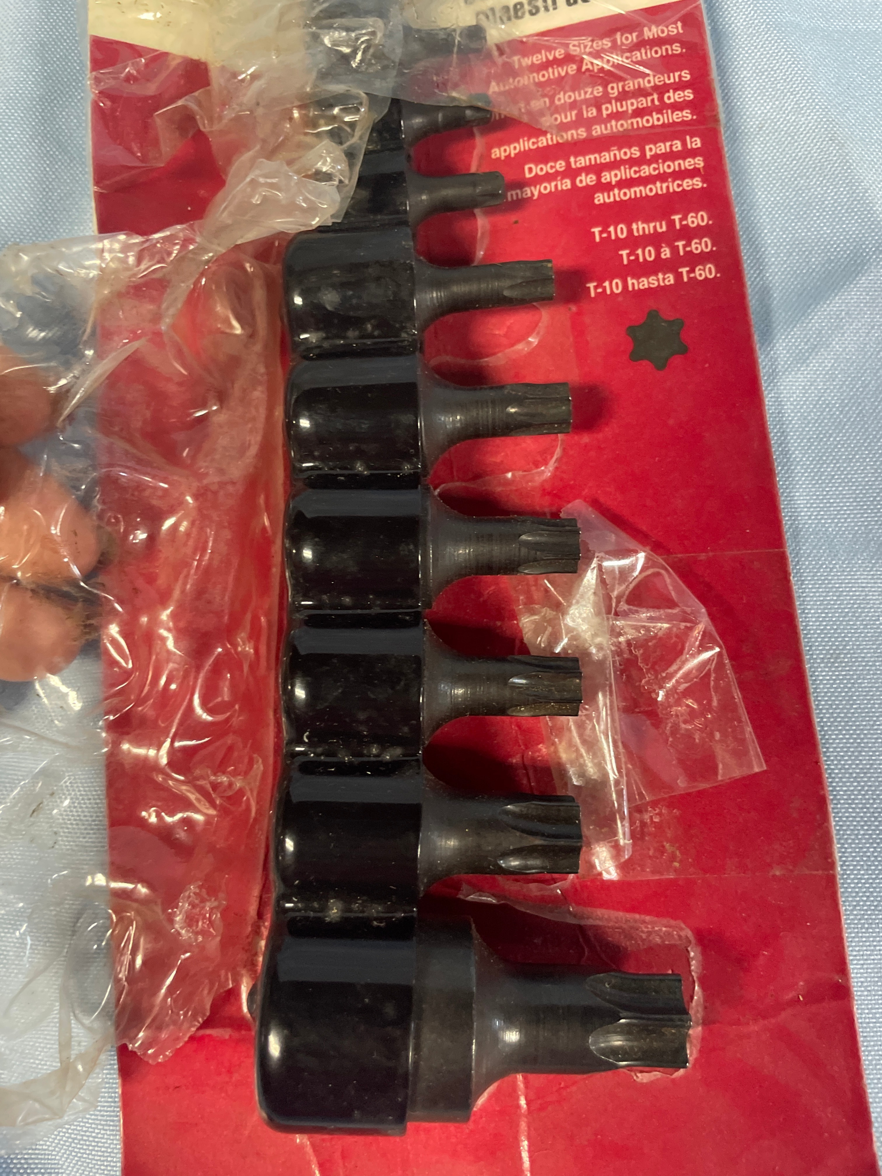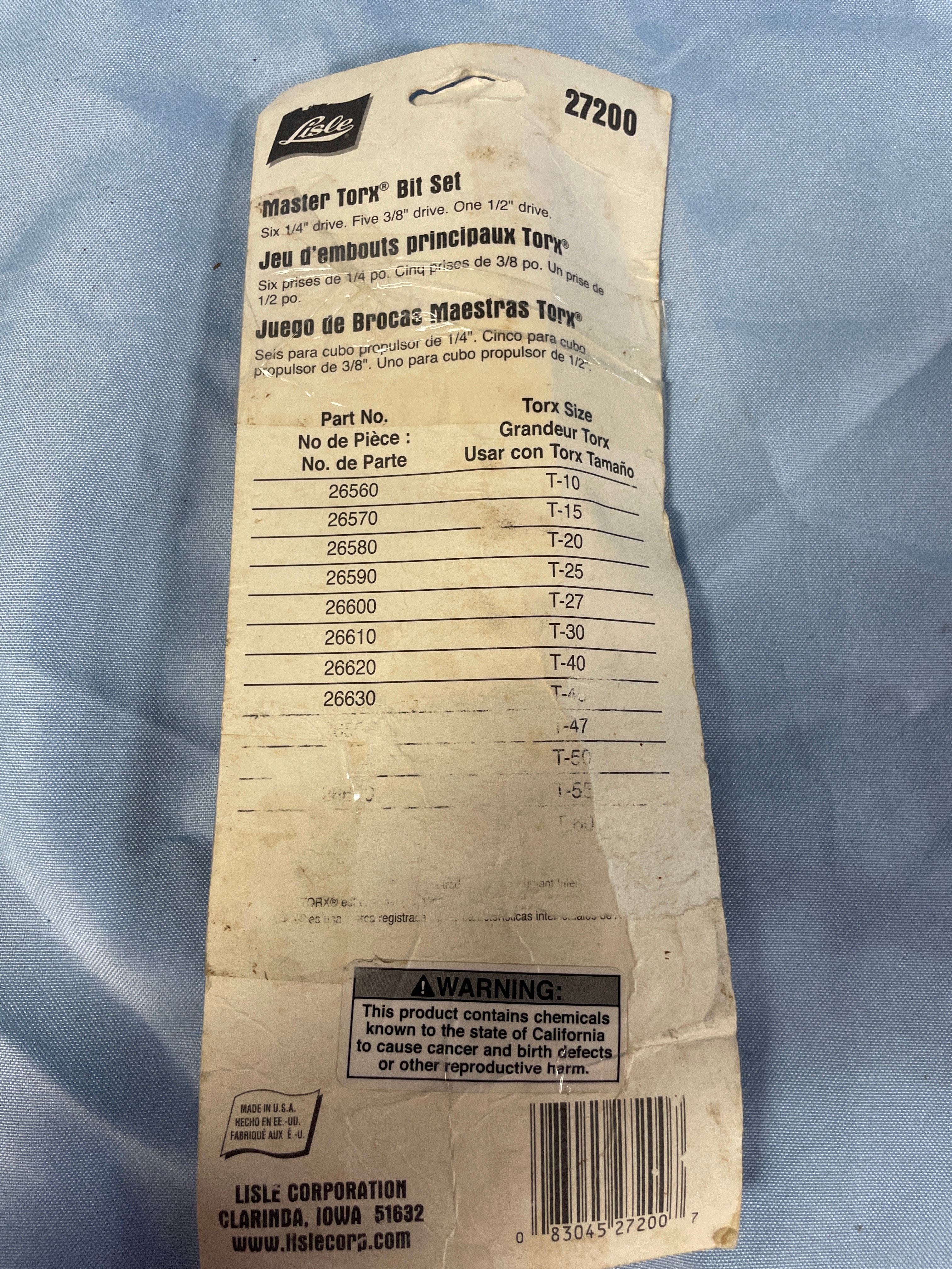 A new, packaged Lisle Master Torx® Bit Set of twelve black Torx bits, T-10 through T-60, with 1/4″, 3/8″, and 1/2″ drives, made in U.S.A.