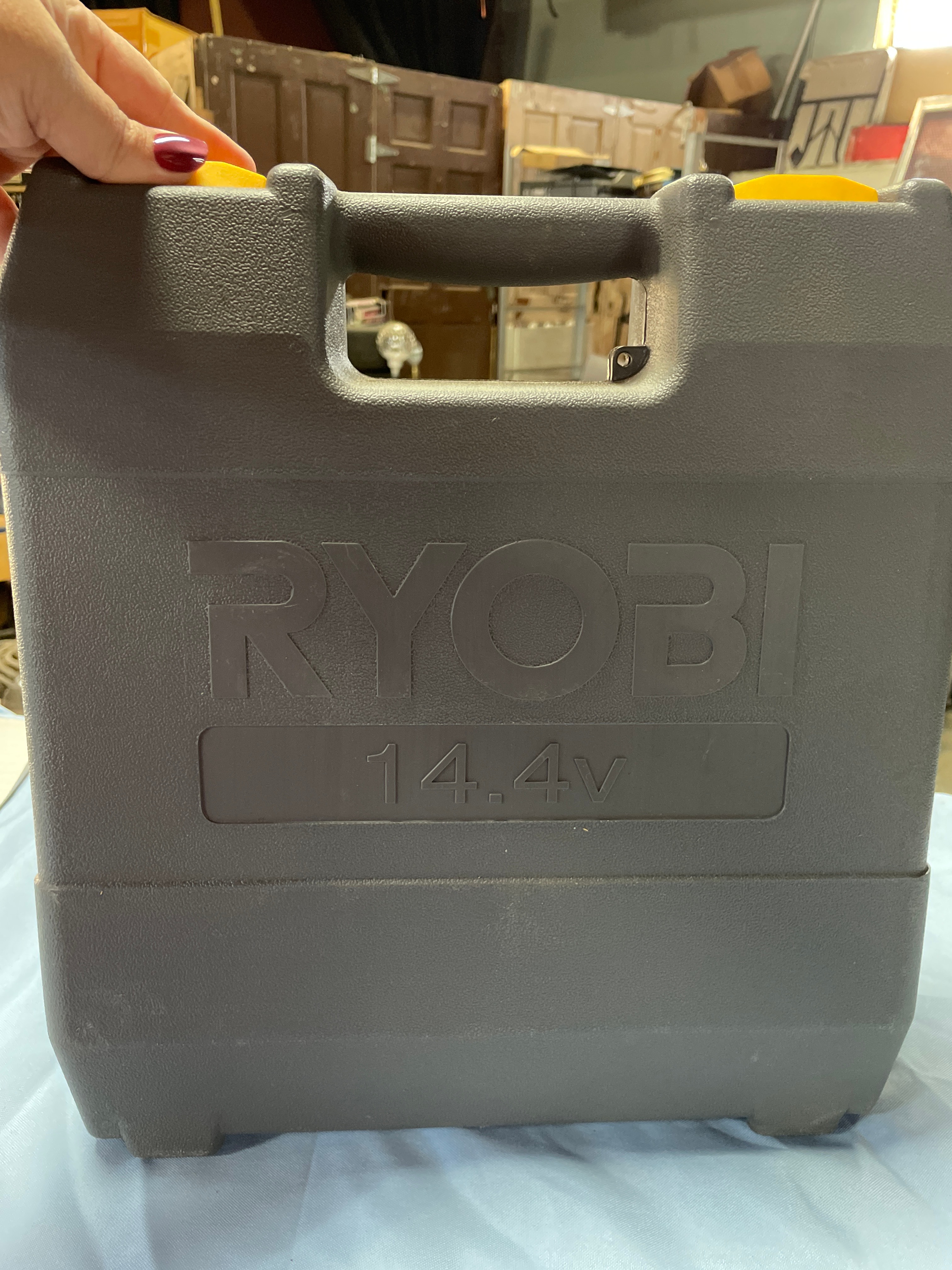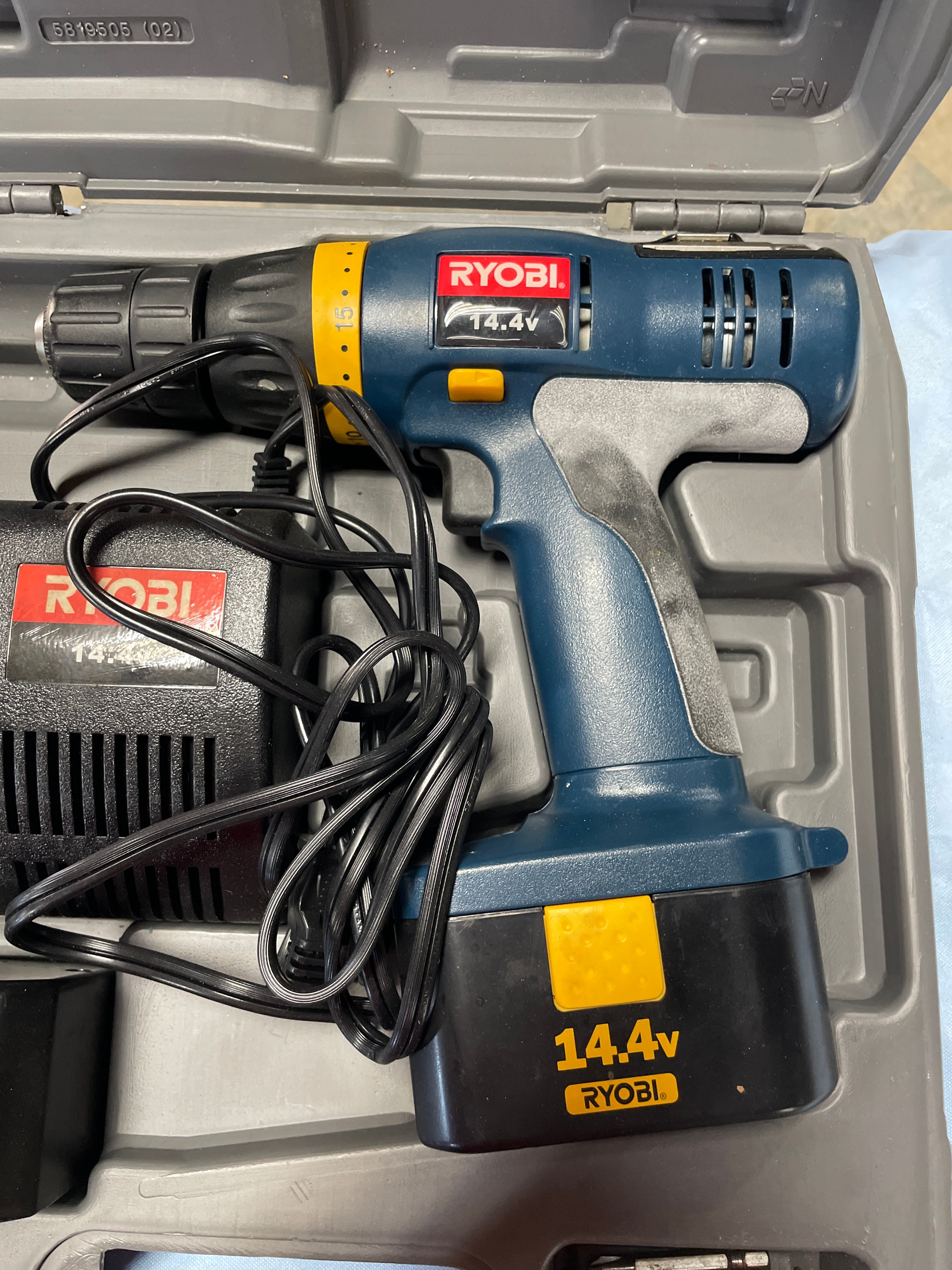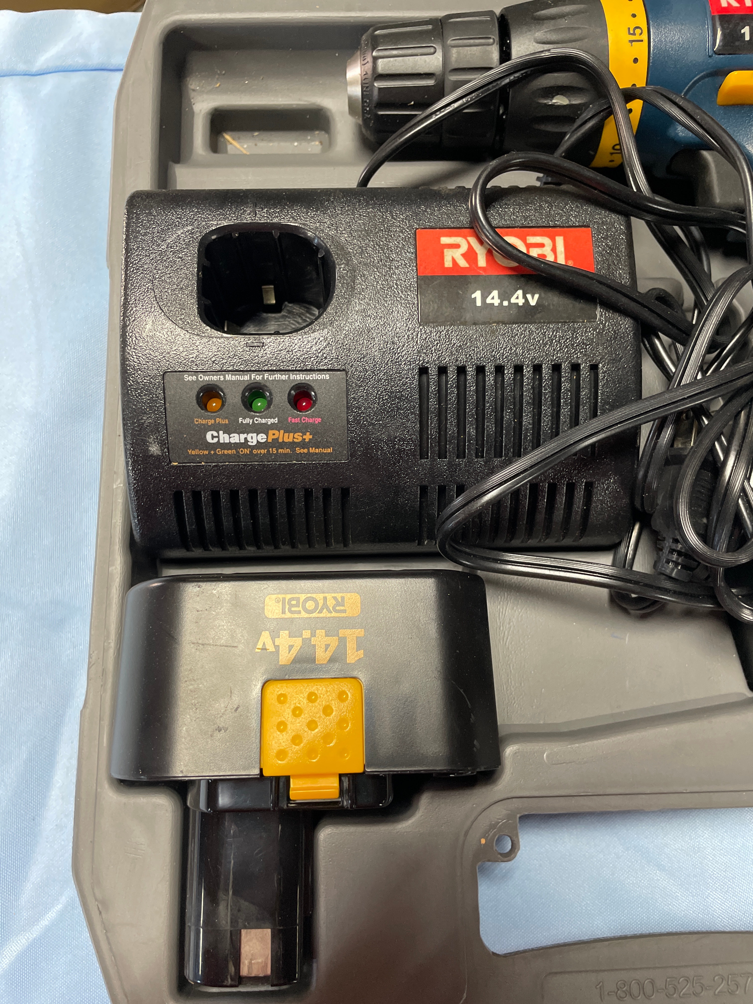 A blue, gray, and black Ryobi 14.4V cordless drill with yellow accents, a black Ryobi 14.4V battery charger labeled “Charge Plus+”, and two black 14.4V Ryobi batteries, all housed within a gray Ryobi 14.4V carrying case.