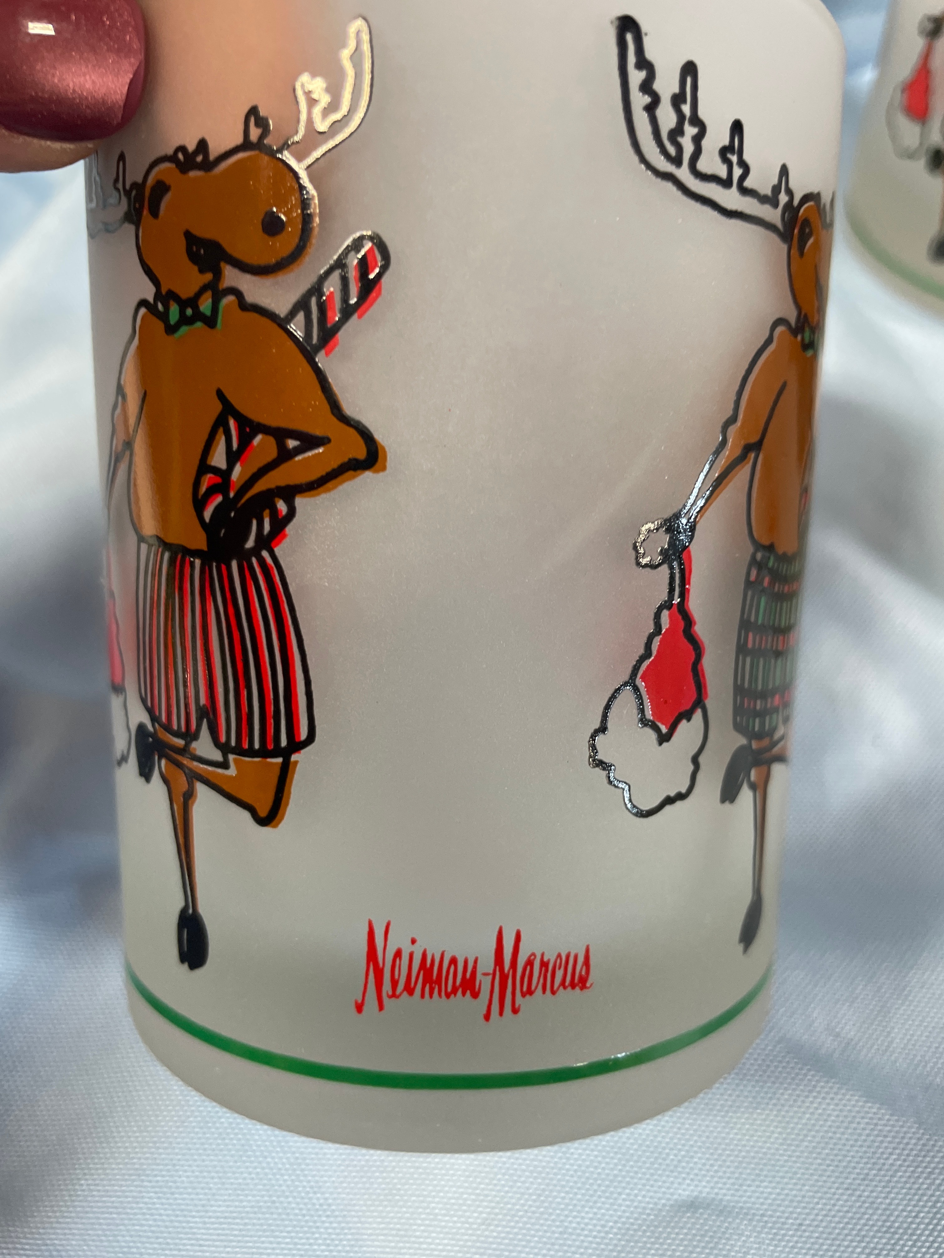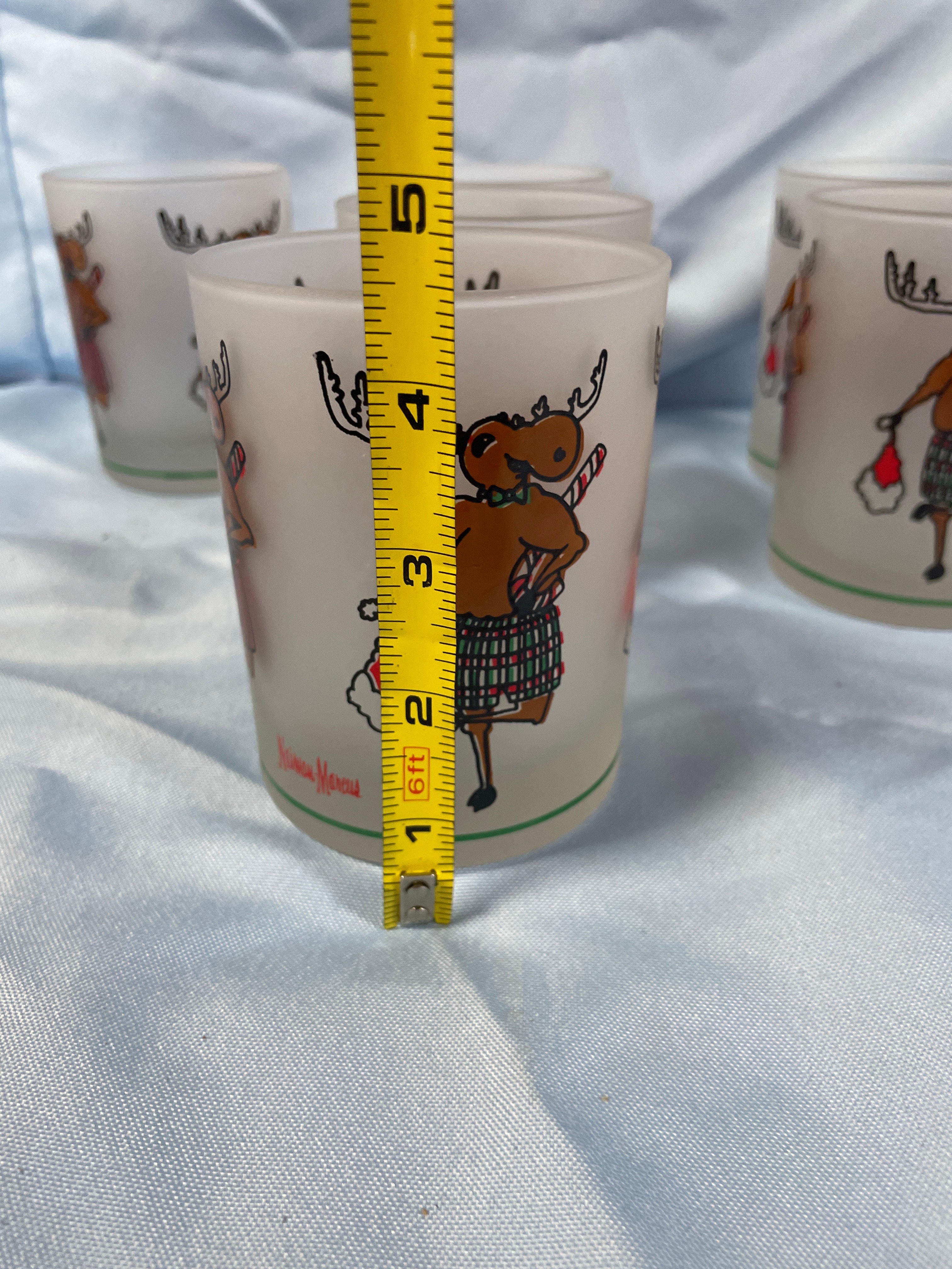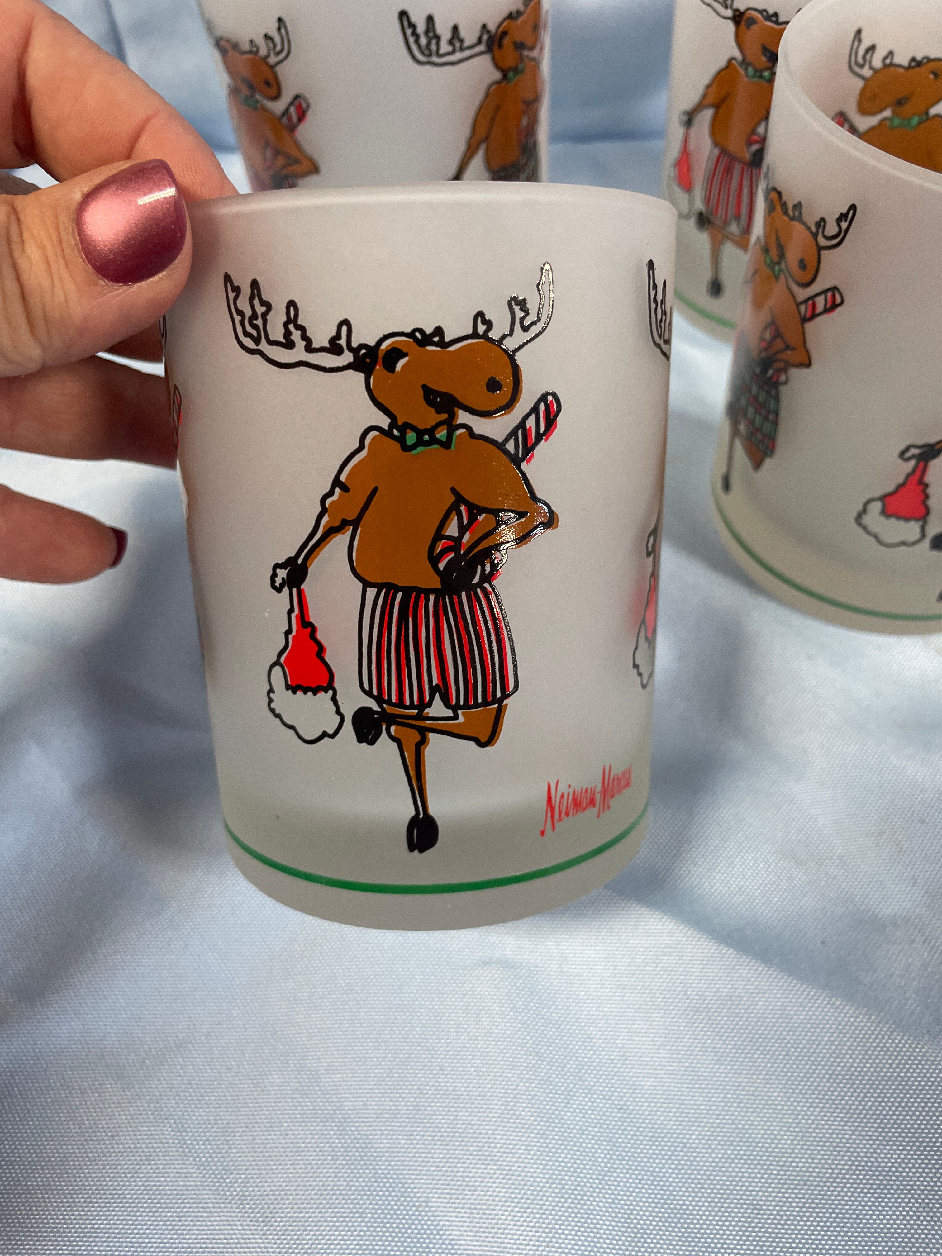 Six frosted white/clear glass tumblers, approximately 4 inches tall, each decorated with brown moose illustrations wearing red, green, and black holiday attire, and bearing the red script “Neiman Marcus” label near the bottom.