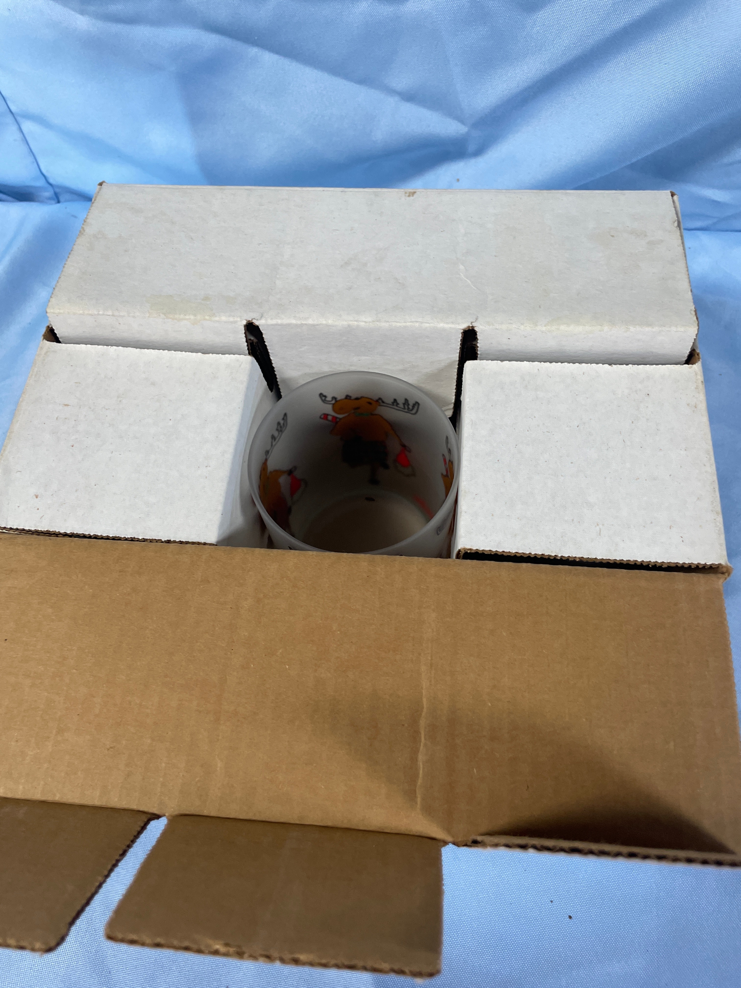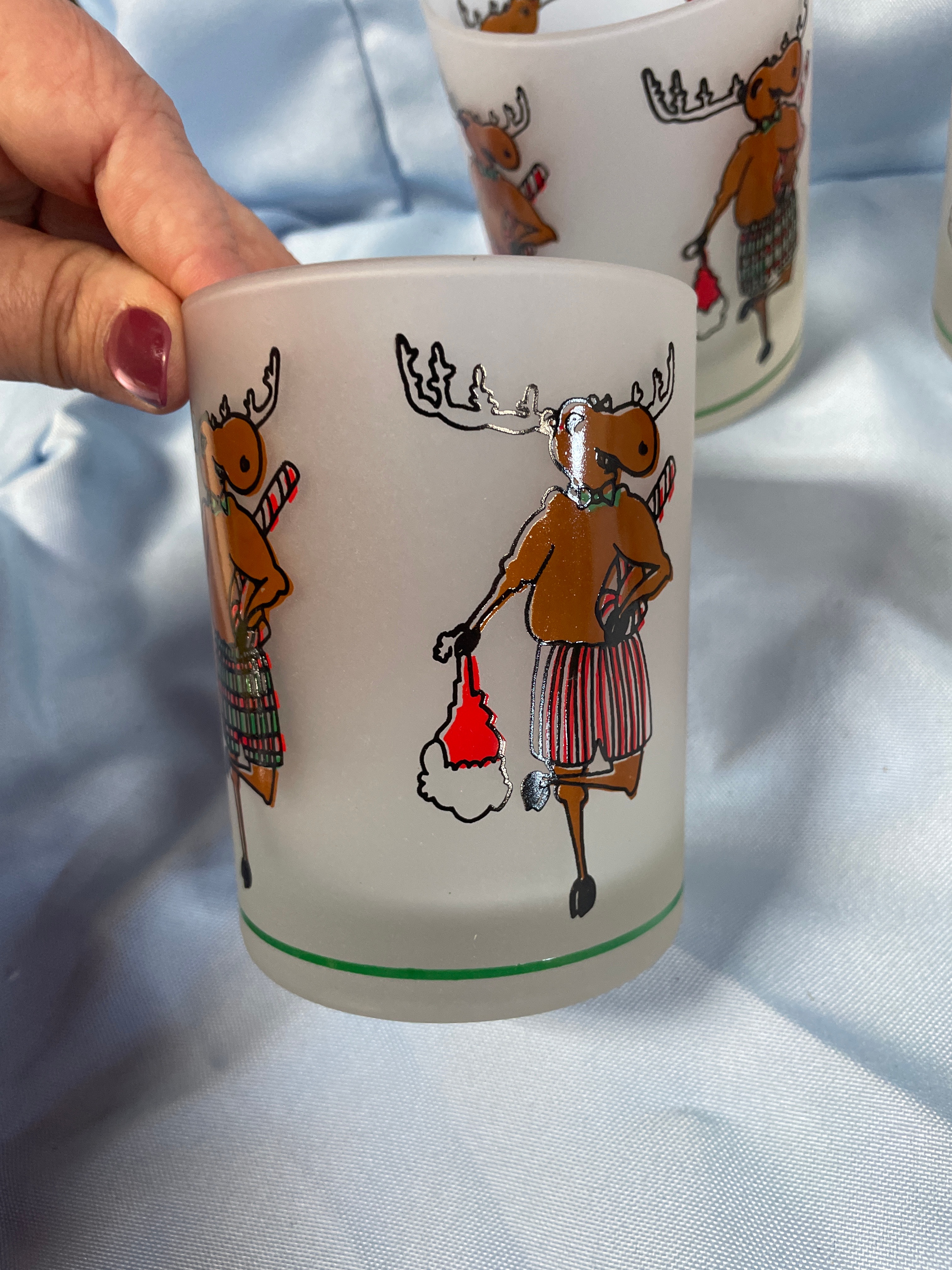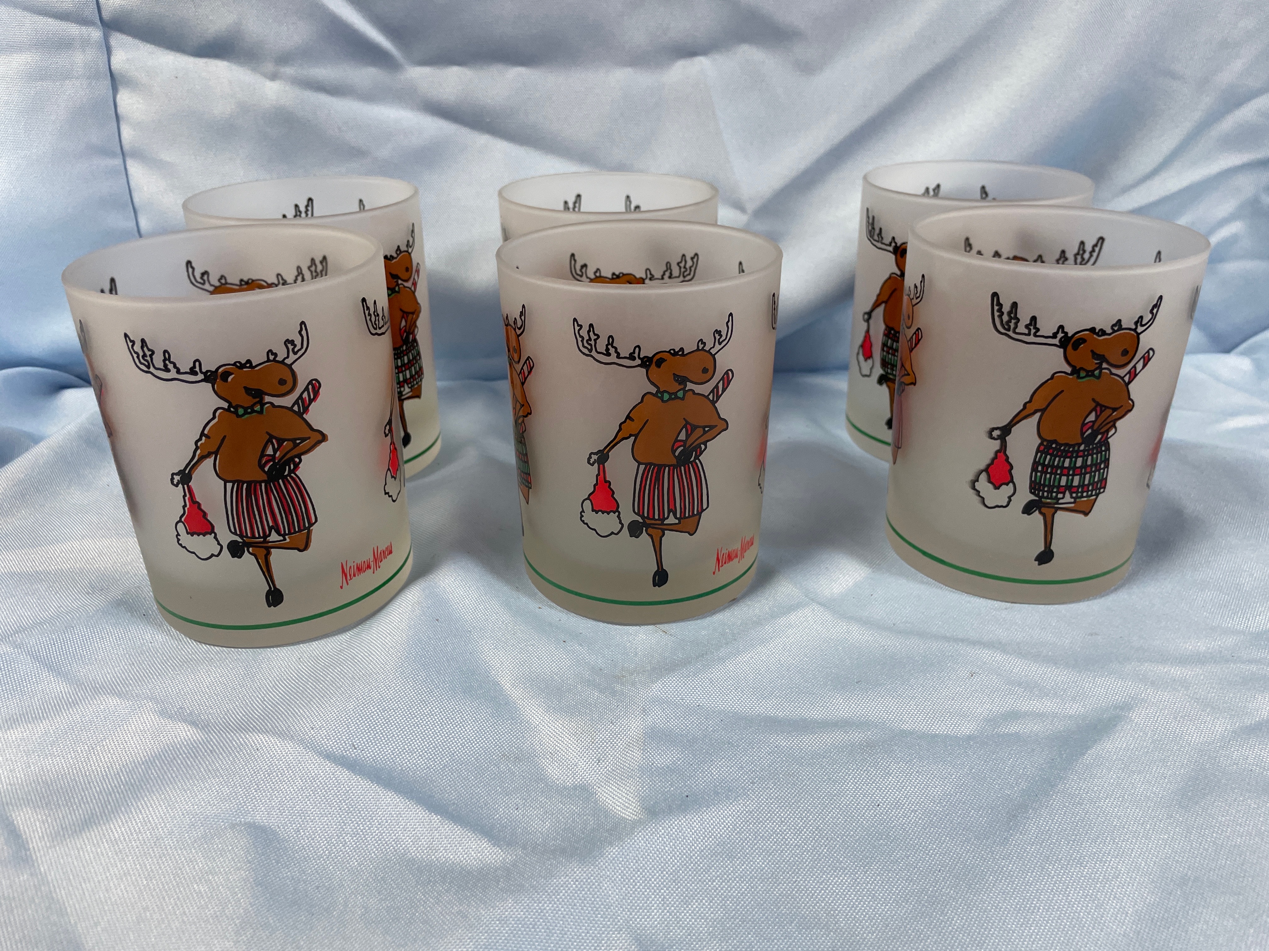 Six frosted white/clear glass tumblers, approximately 4 inches tall, each decorated with brown moose illustrations wearing red, green, and black holiday attire, and bearing the red script “Neiman Marcus” label near the bottom.