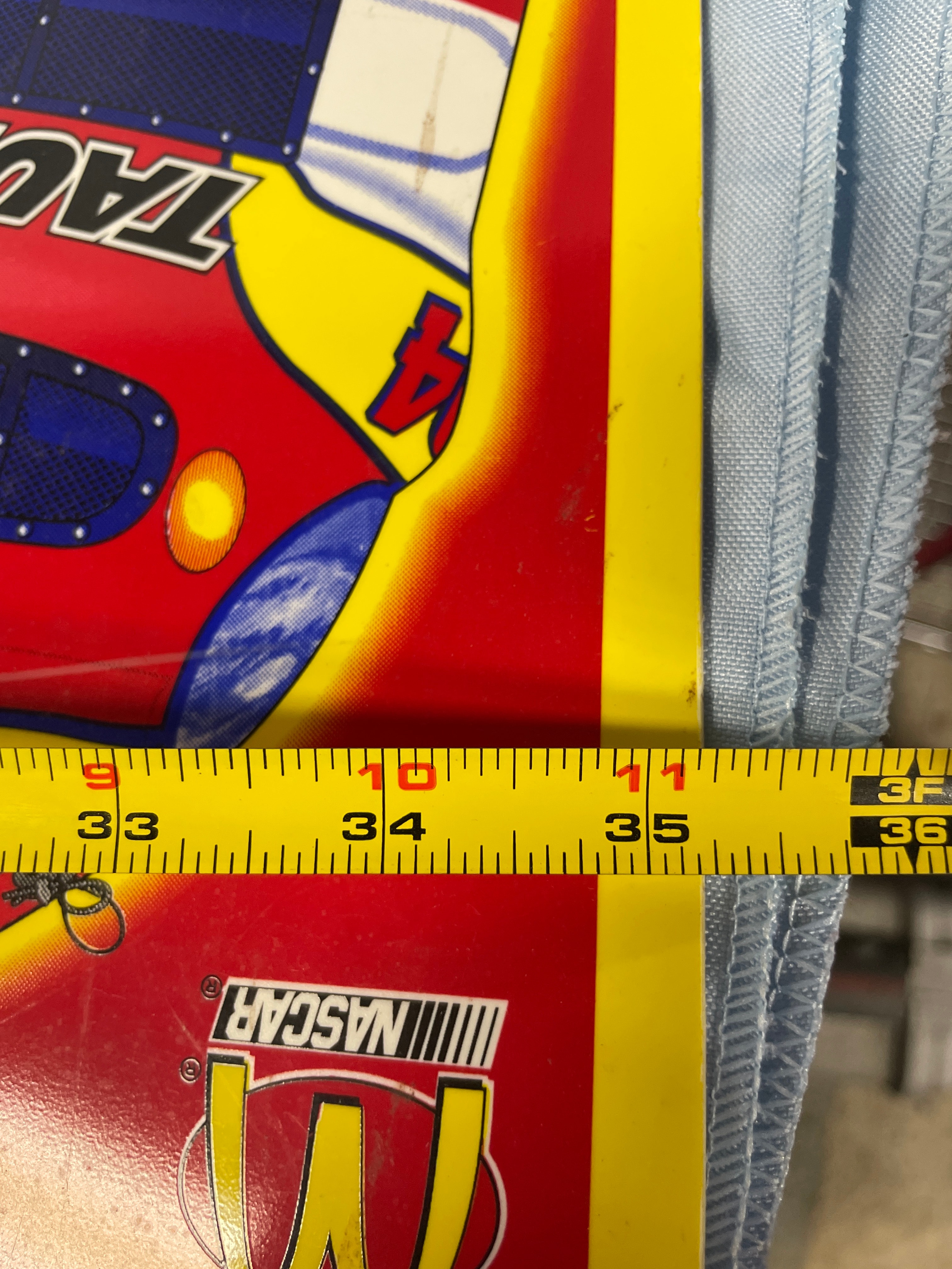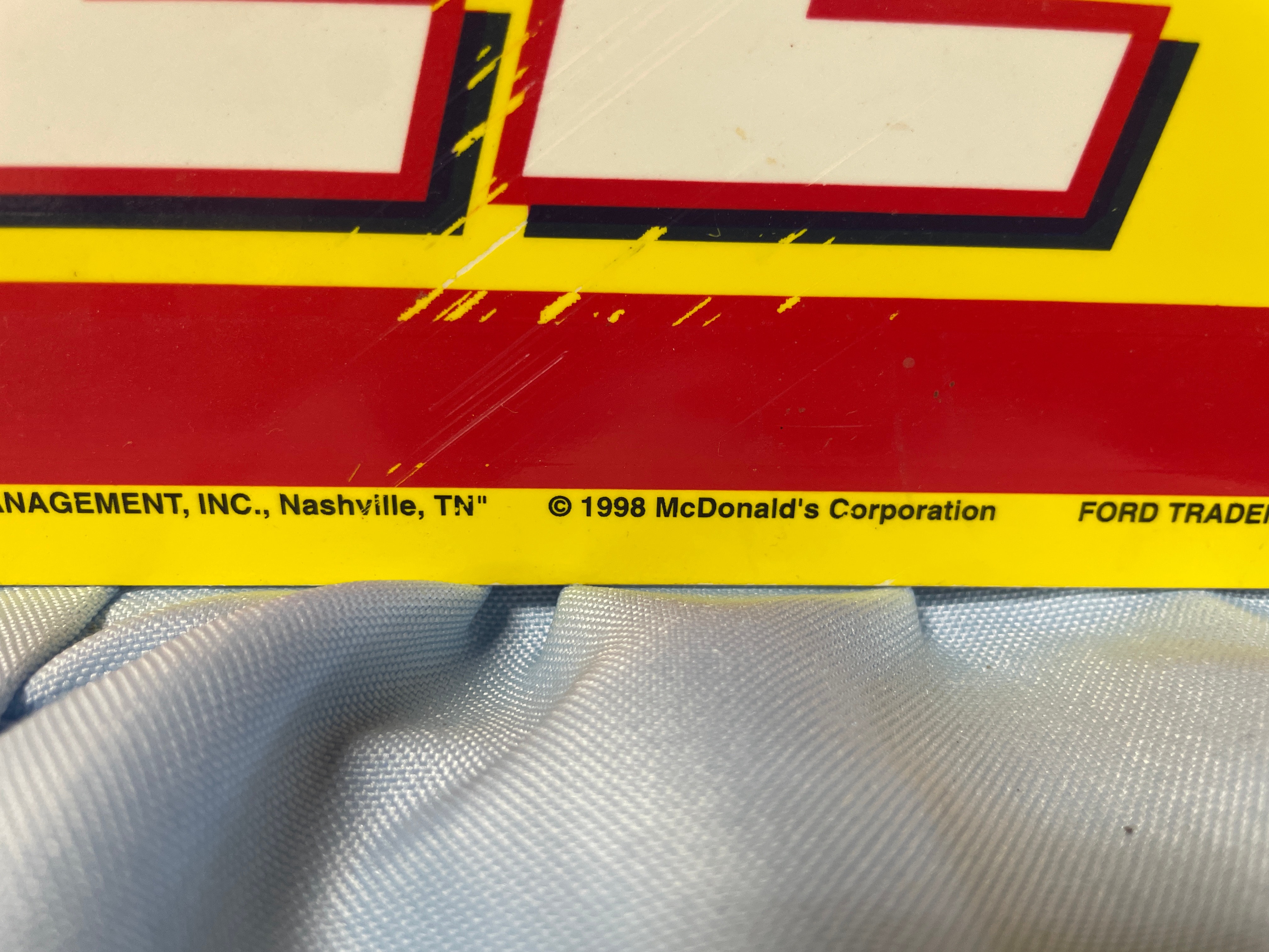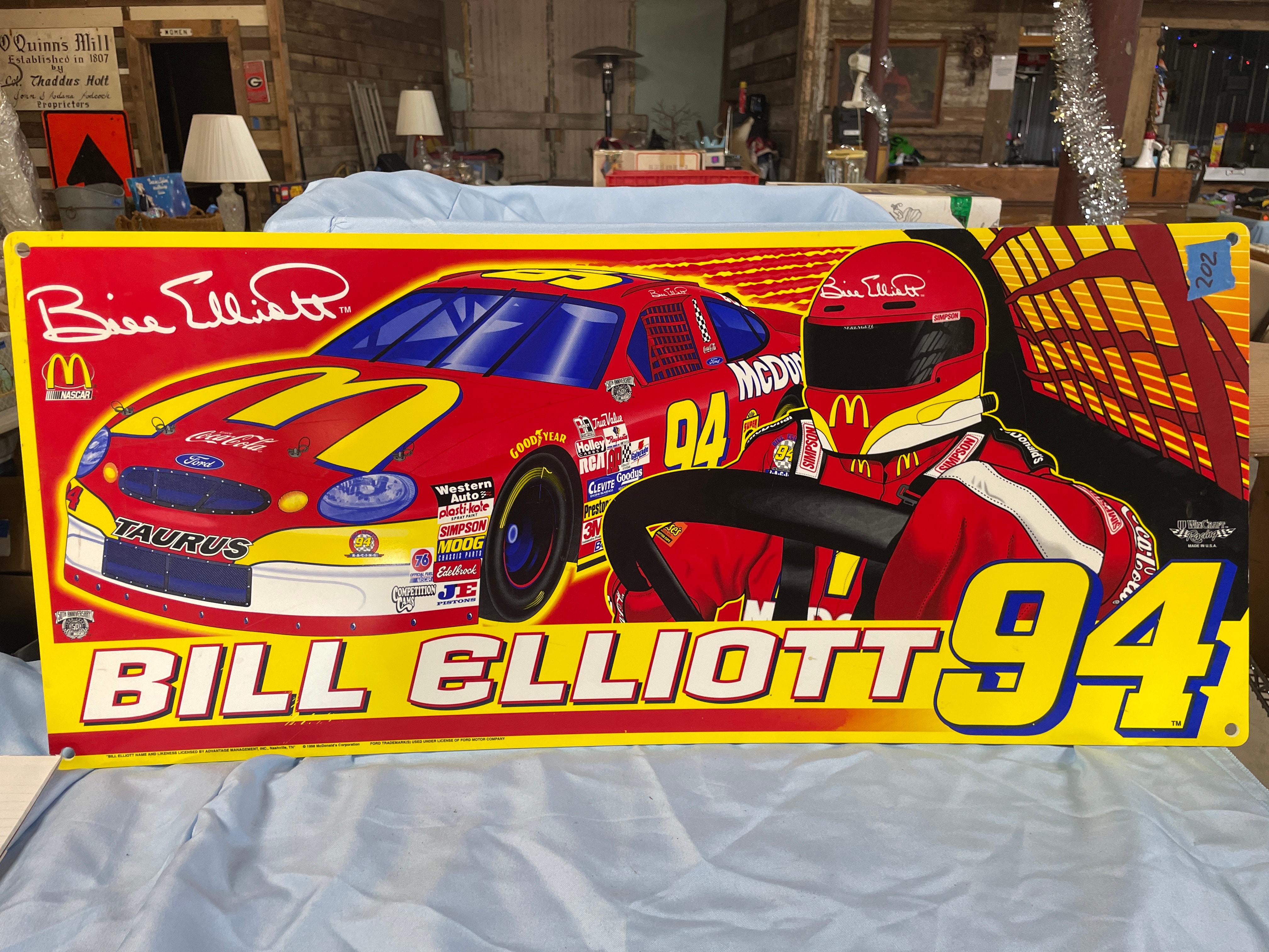 A large advertising sign, primarily red and yellow, depicts Bill Elliott’s #94 McDonald’s Ford Taurus NASCAR race car and driver, marked “© 1998 McDonald’s Corporation” and measuring approximately 35.5 inches wide by 15.5 inches high.