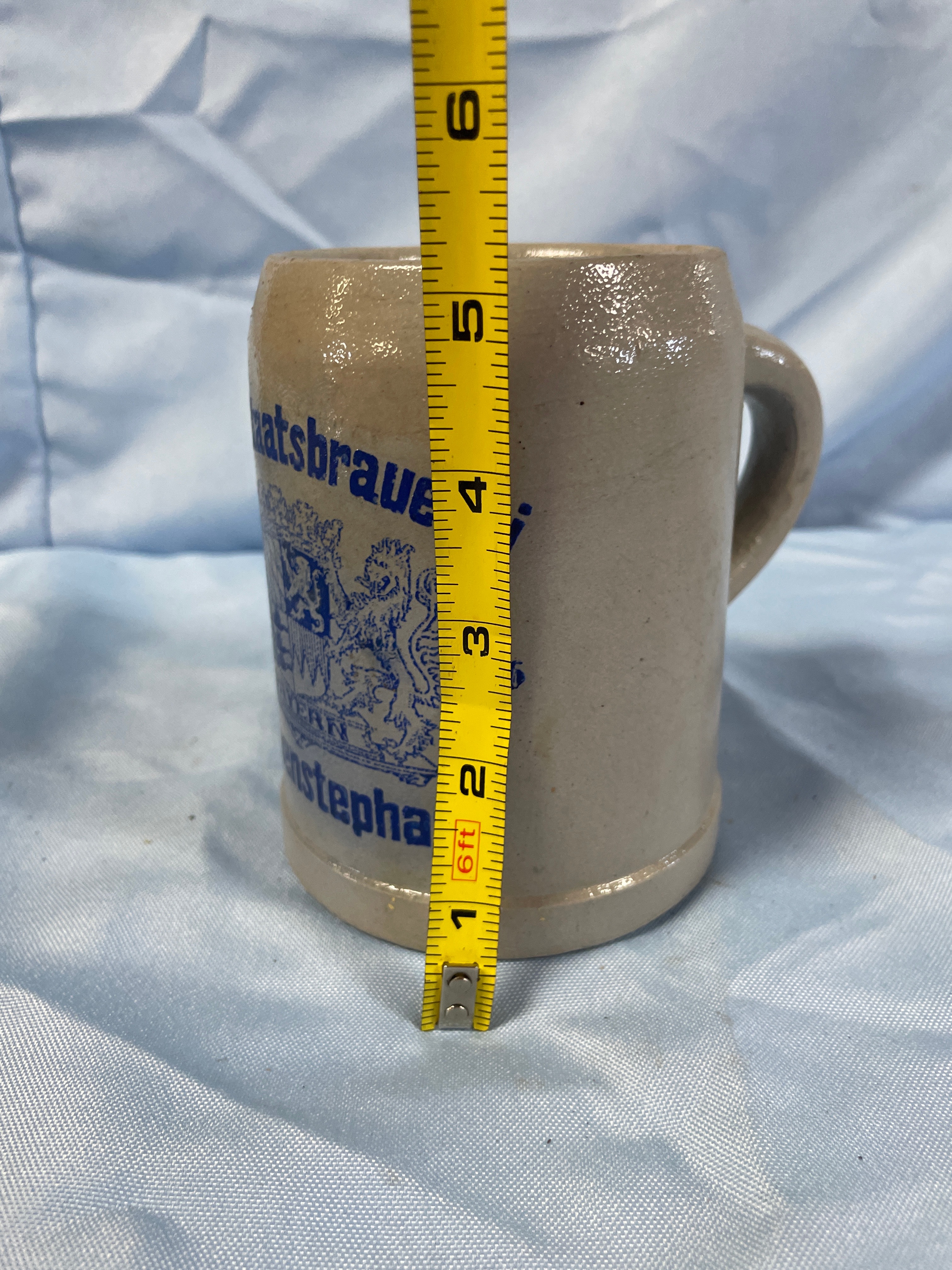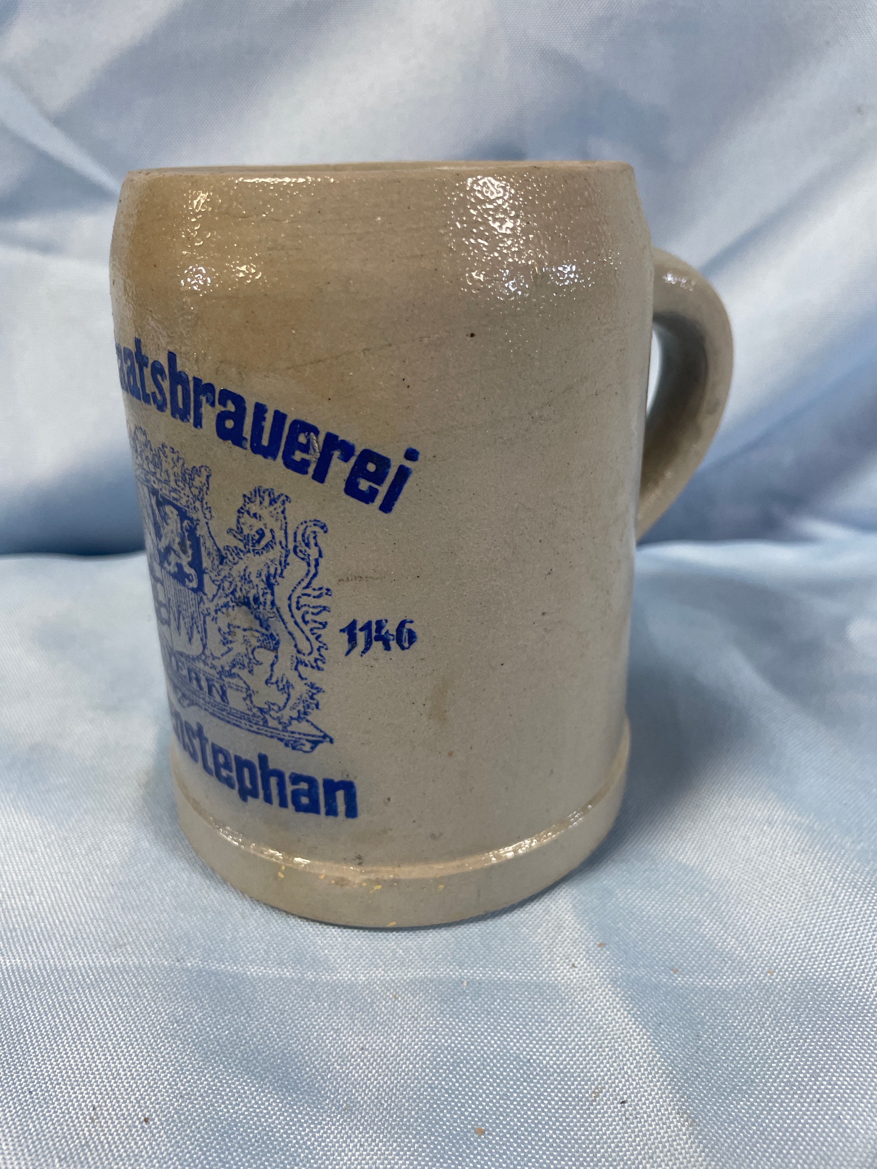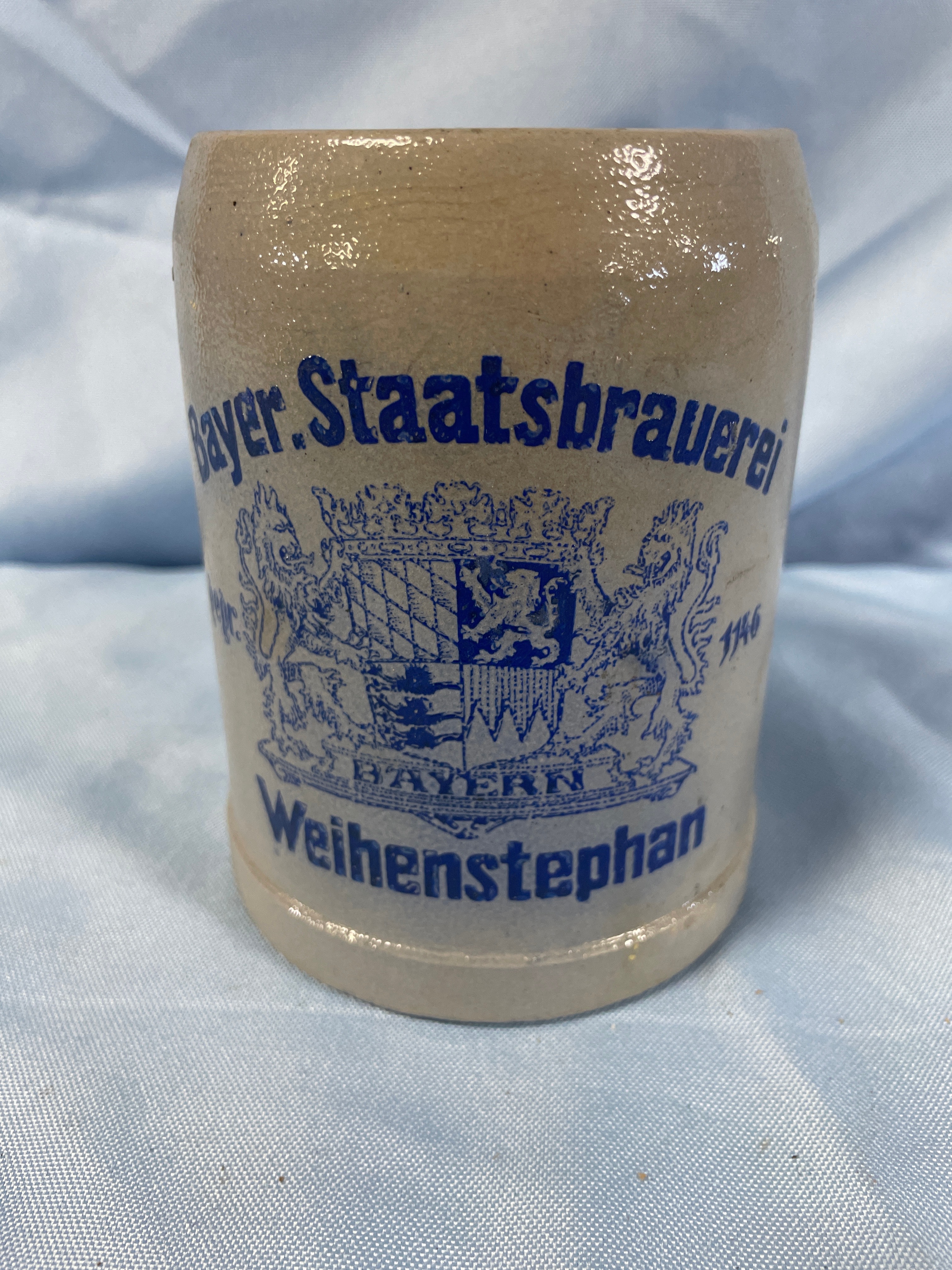 A grey/tan stoneware beer stein with blue lettering reading ‘Bayer. Staatsbrauerei’, ‘BAYERN’, ‘Weihenstephan’, ‘1146’, and ‘0,5L’, measuring approximately 5.5 inches tall.