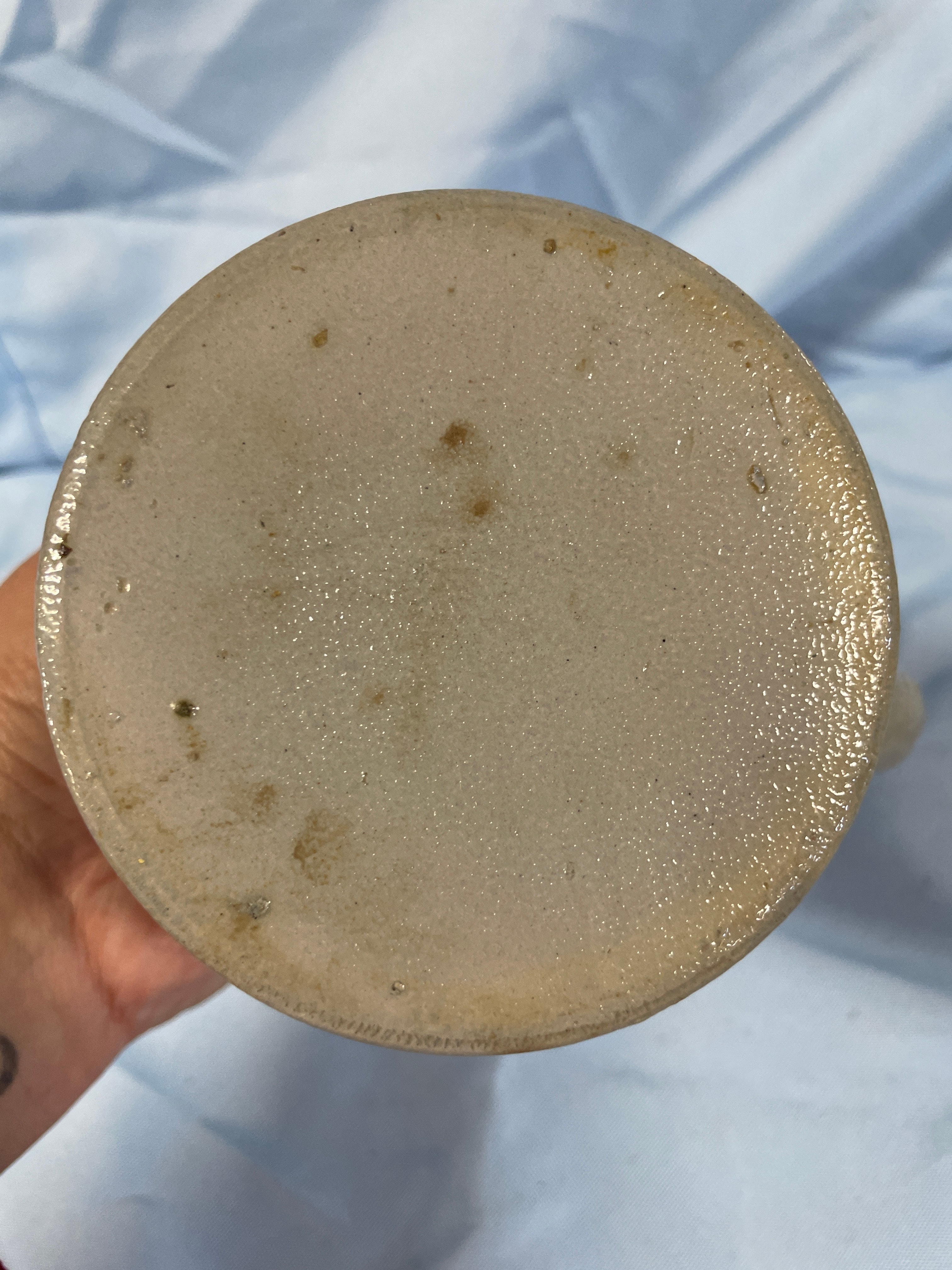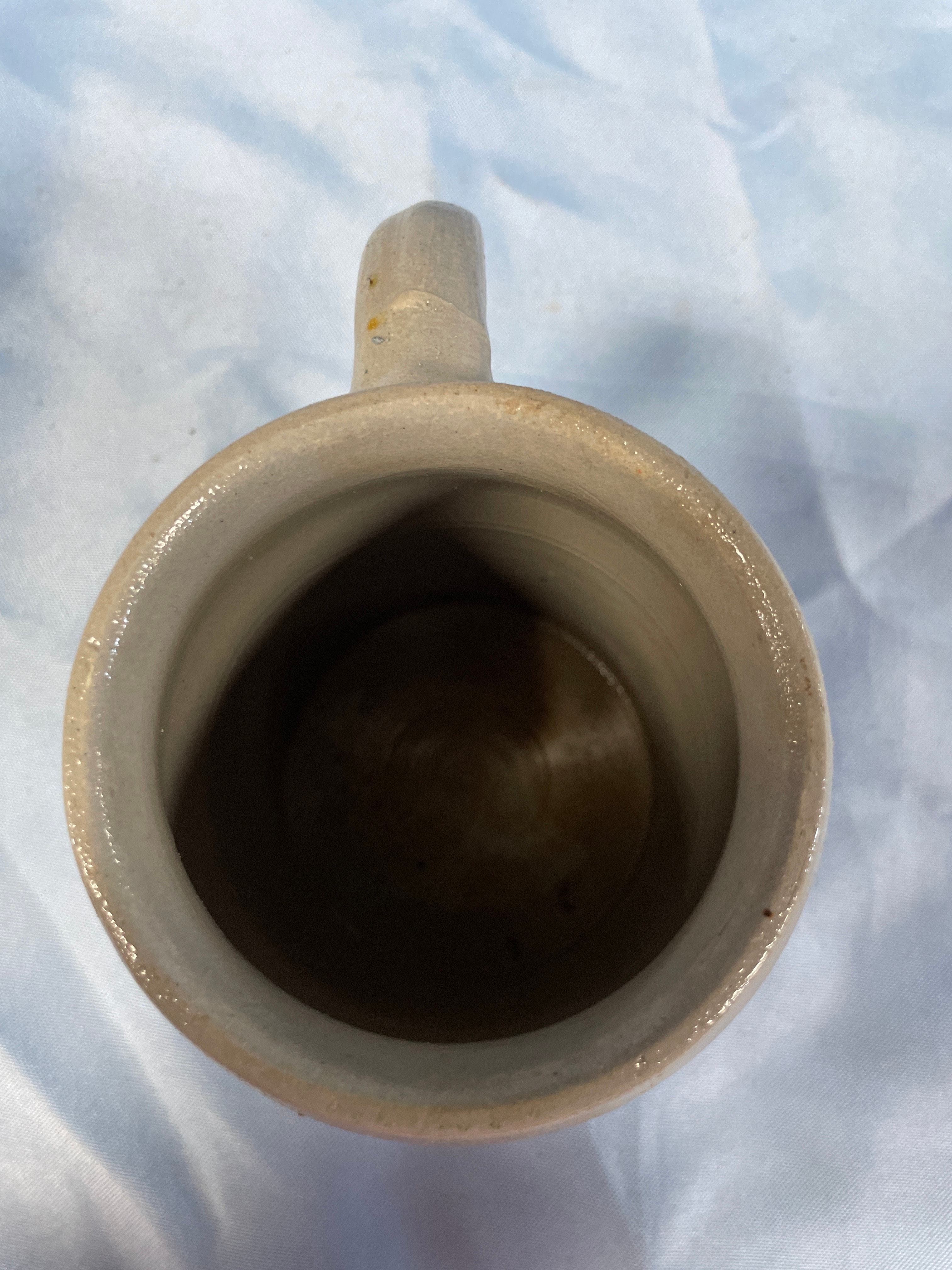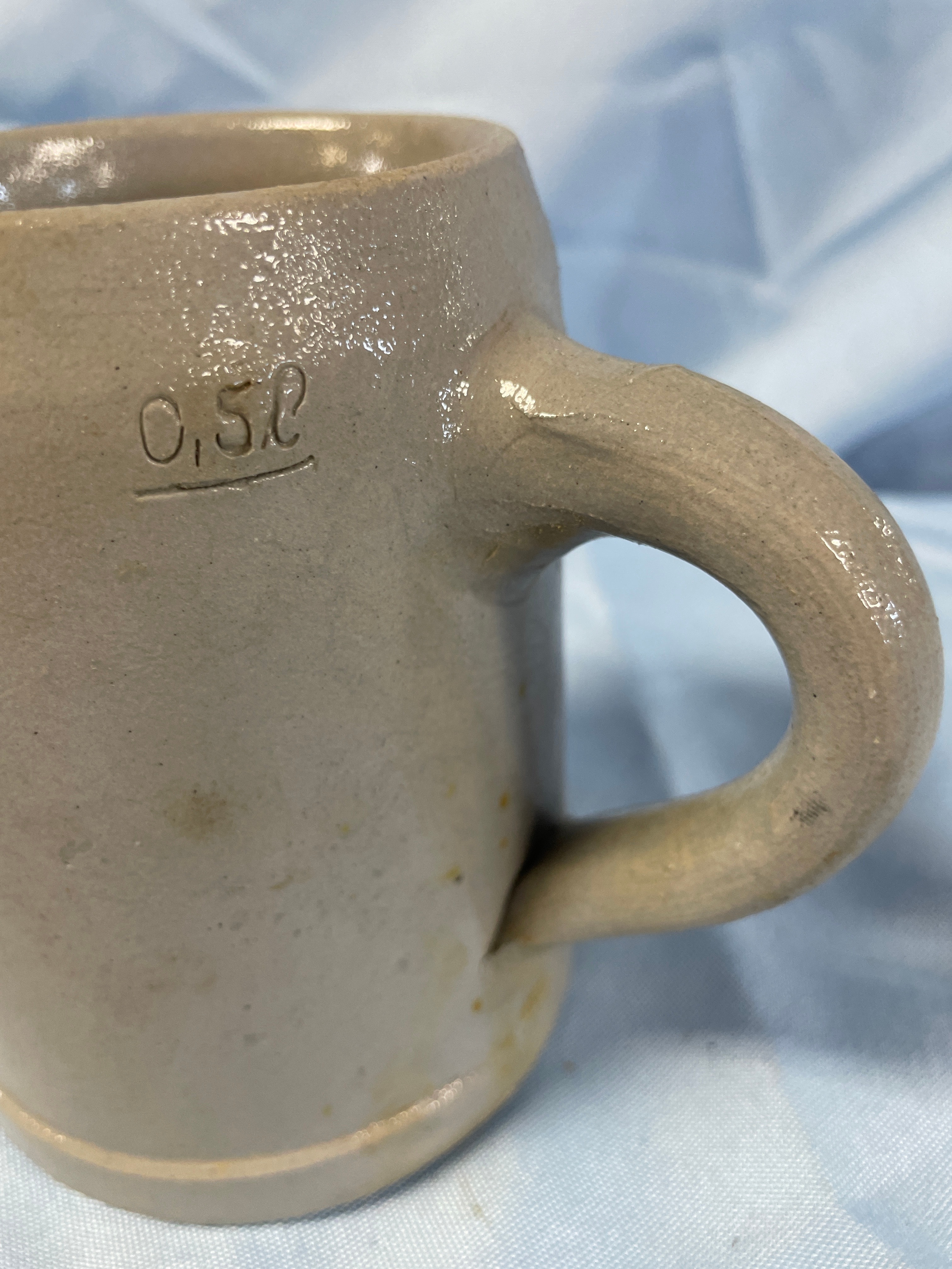 A grey/tan stoneware beer stein with blue lettering reading ‘Bayer. Staatsbrauerei’, ‘BAYERN’, ‘Weihenstephan’, ‘1146’, and ‘0,5L’, measuring approximately 5.5 inches tall.