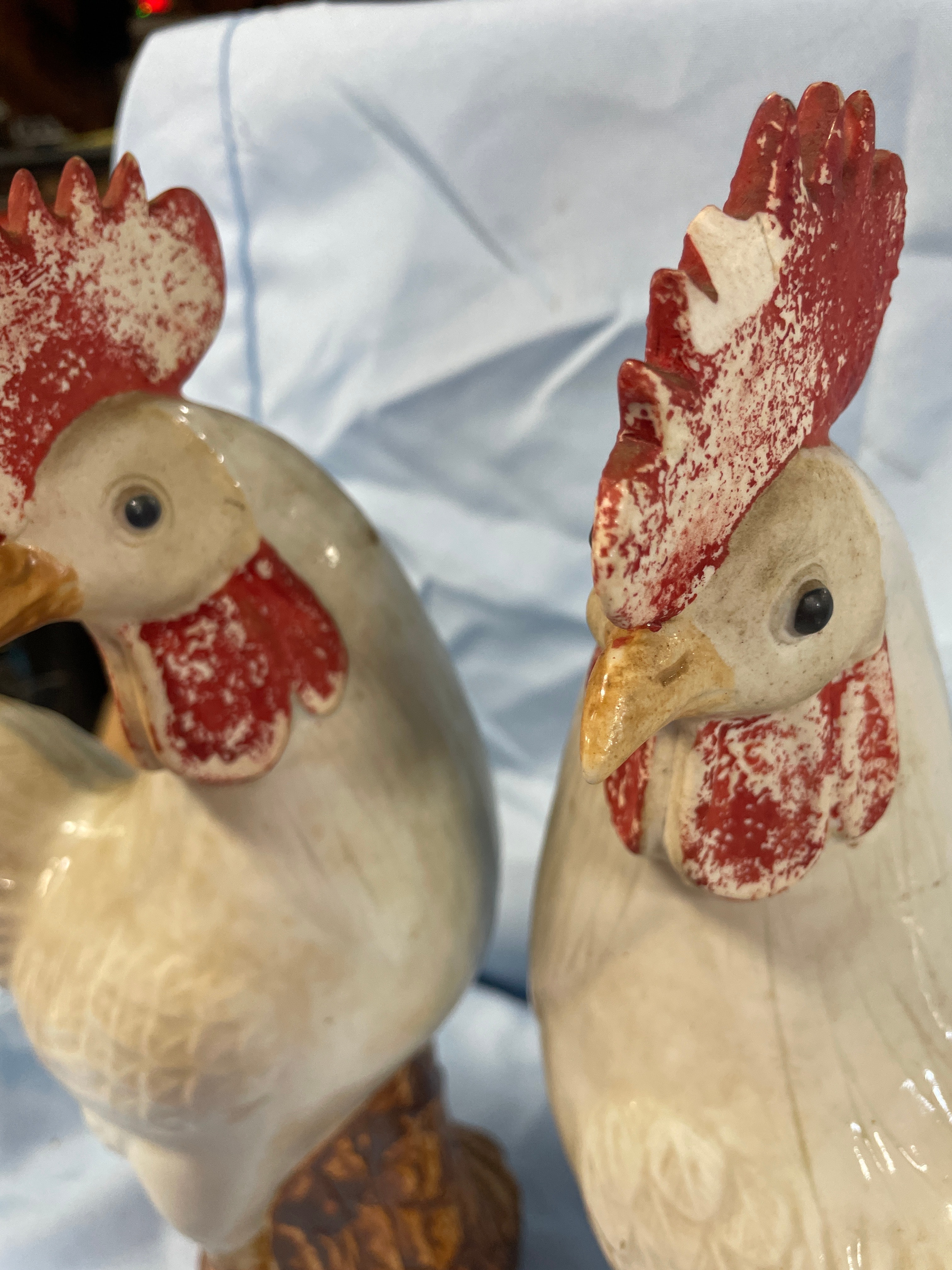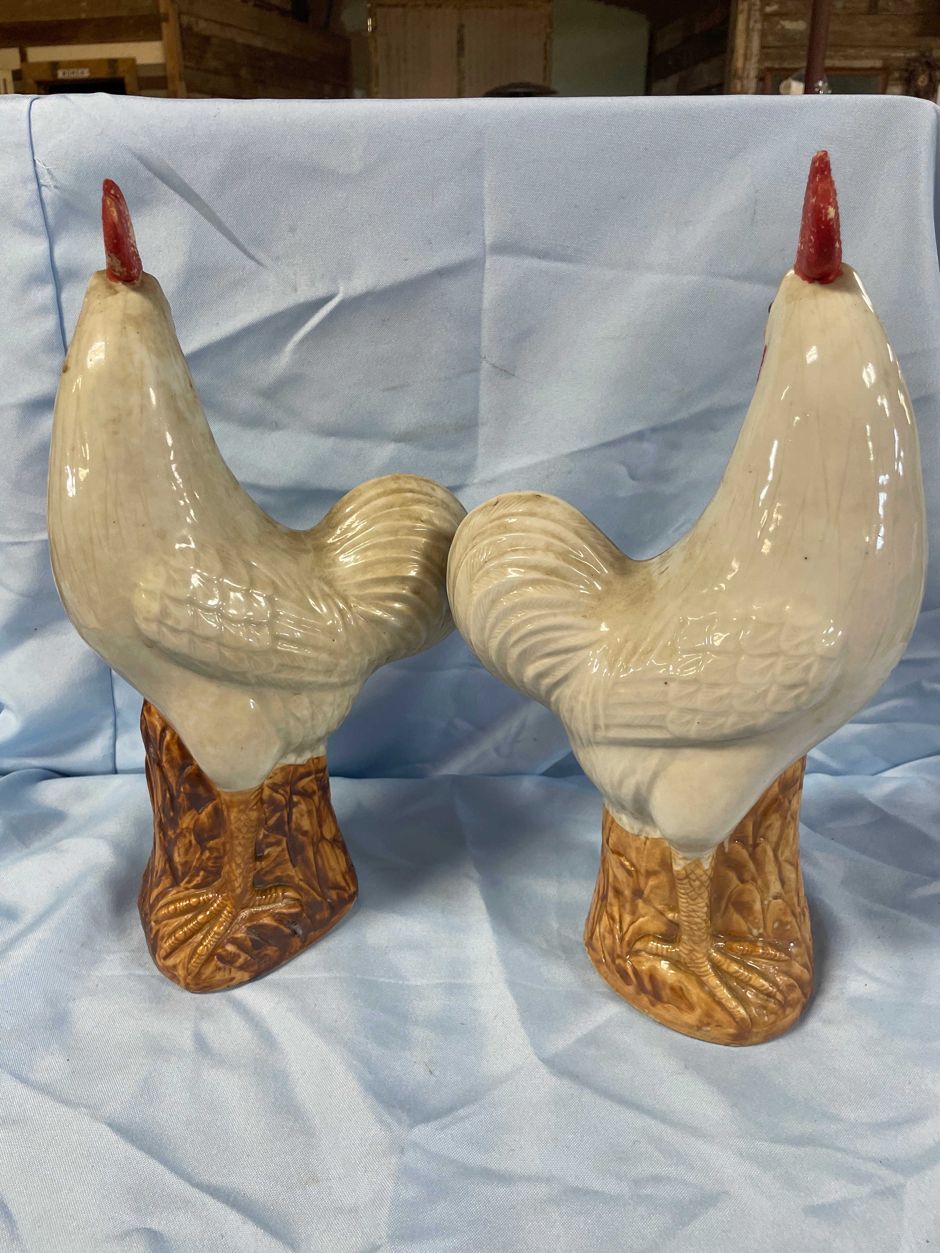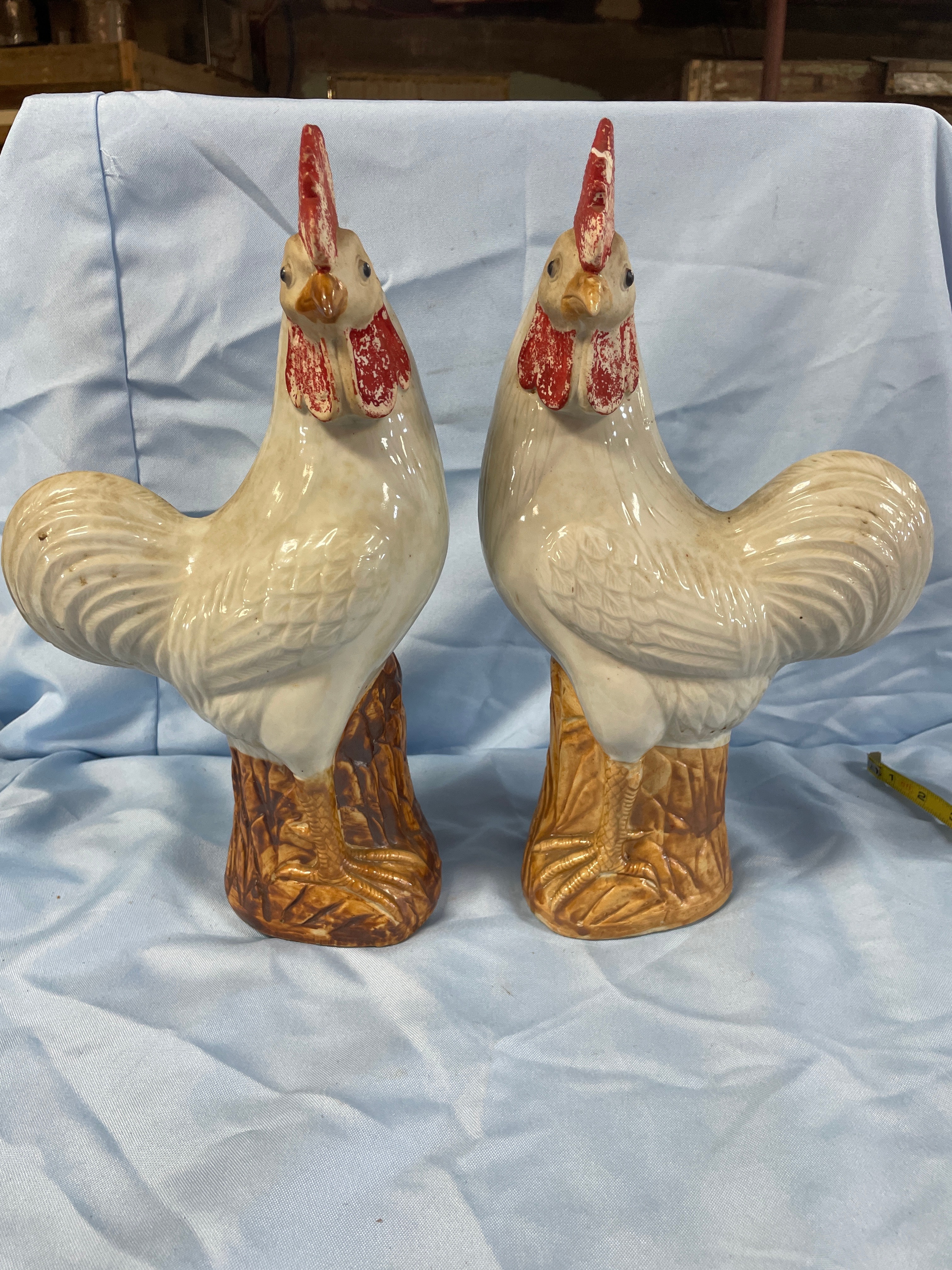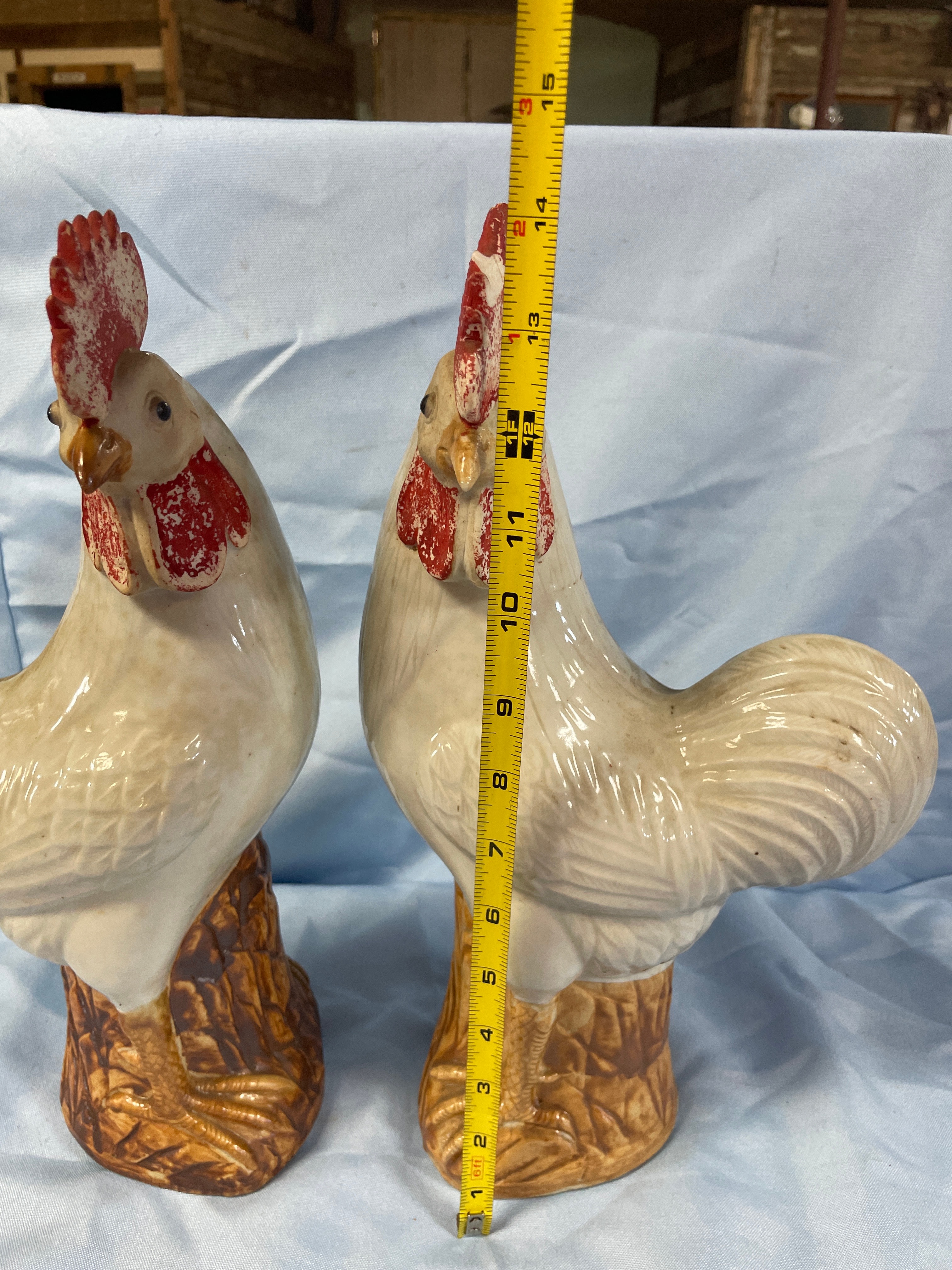 A pair of cream/off-white glazed porcelain rooster figurines with red combs and wattles and brown bases, each measuring approximately 13.5 inches tall and bearing a square-stamped maker’s mark “景德镇制” (Jingdezhen Zhi) on the bottom.