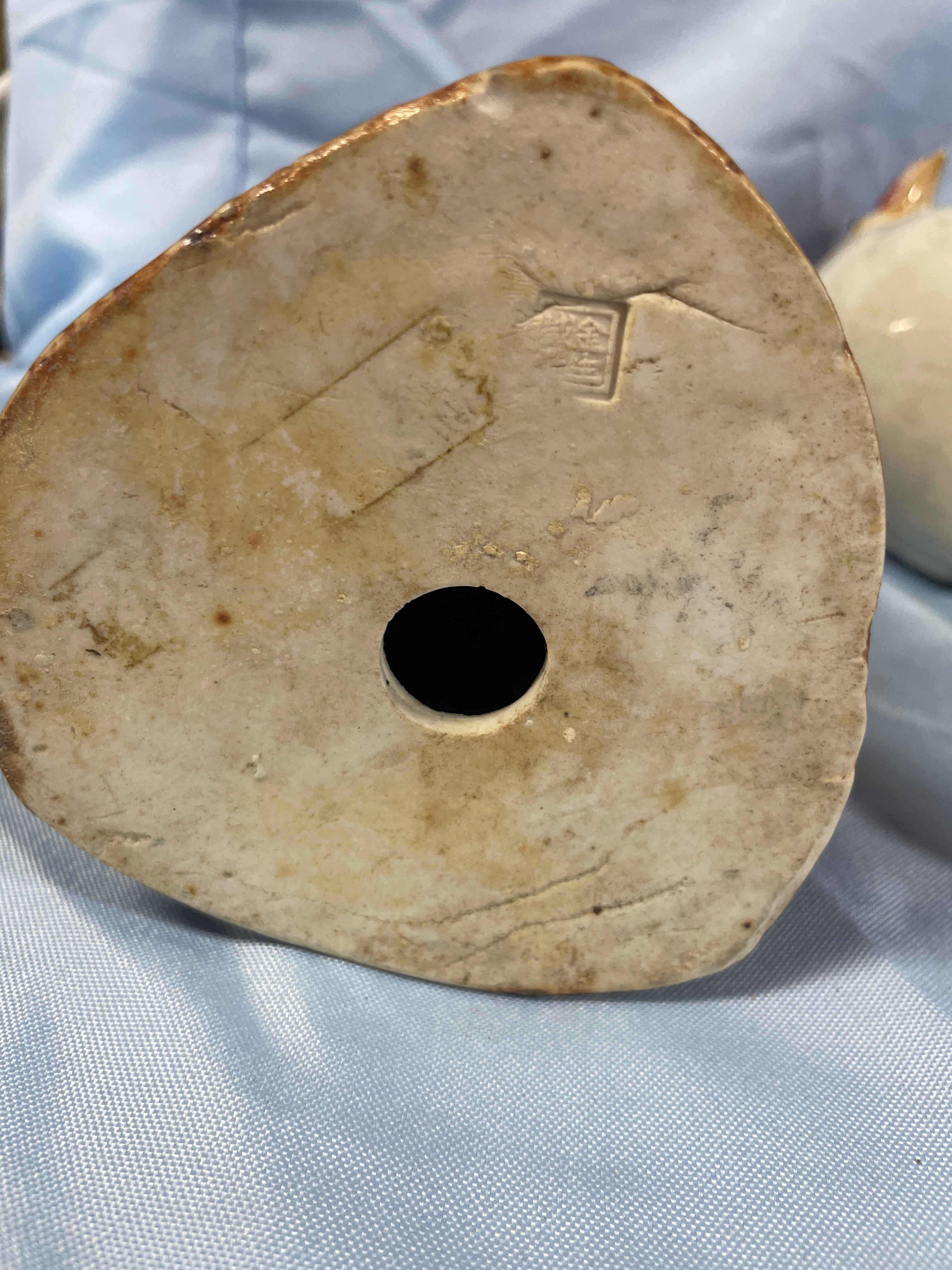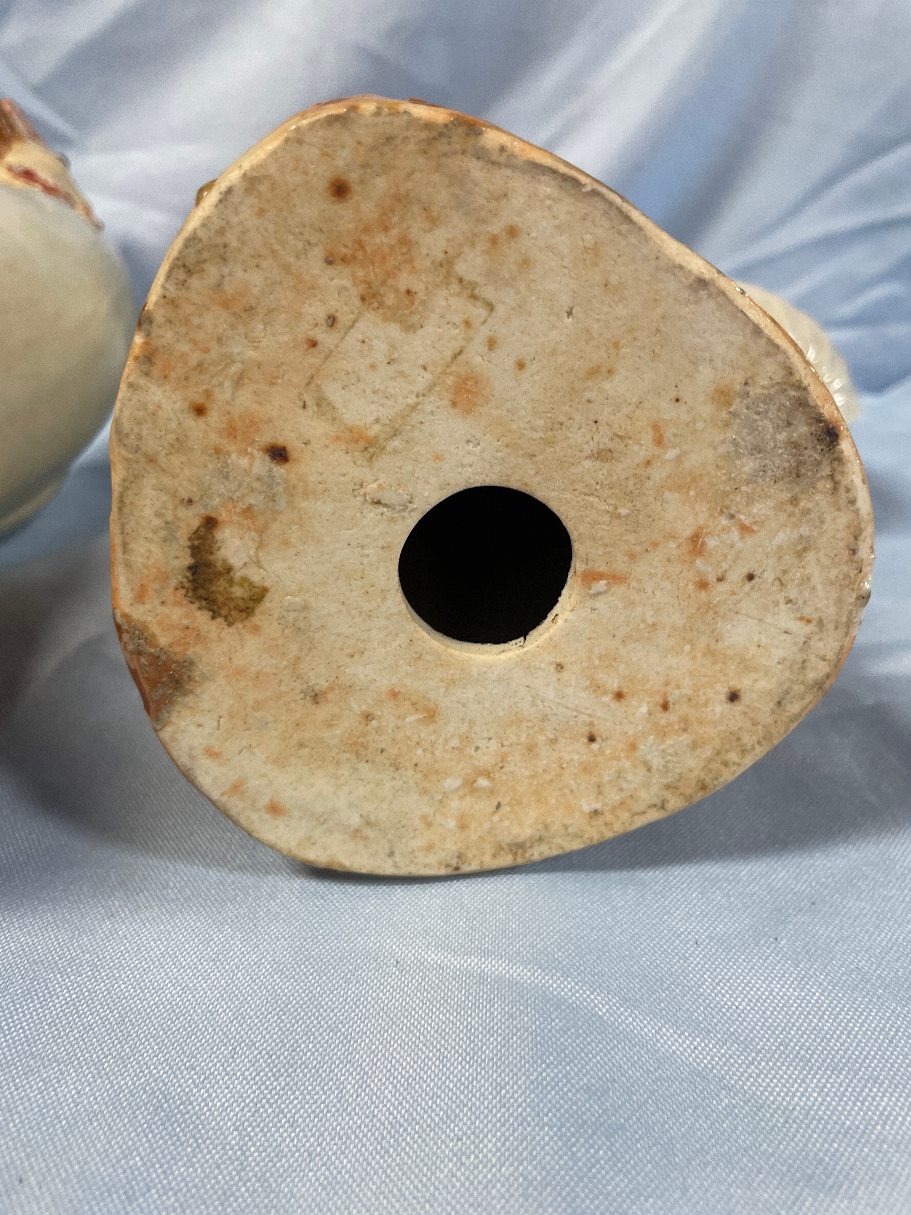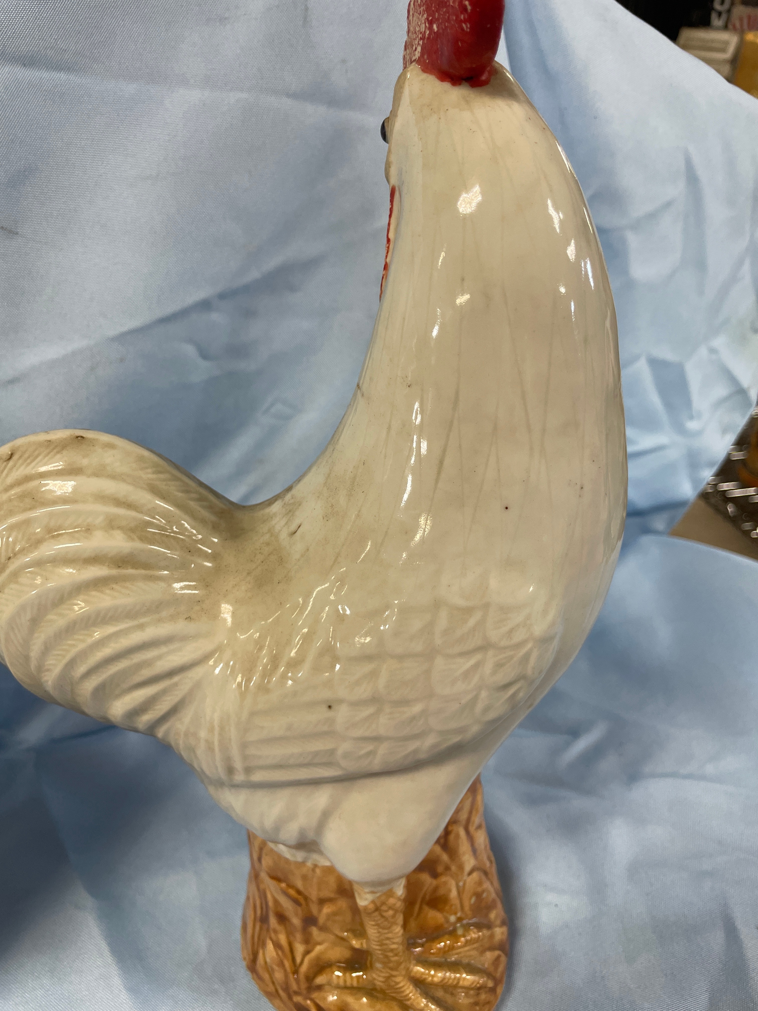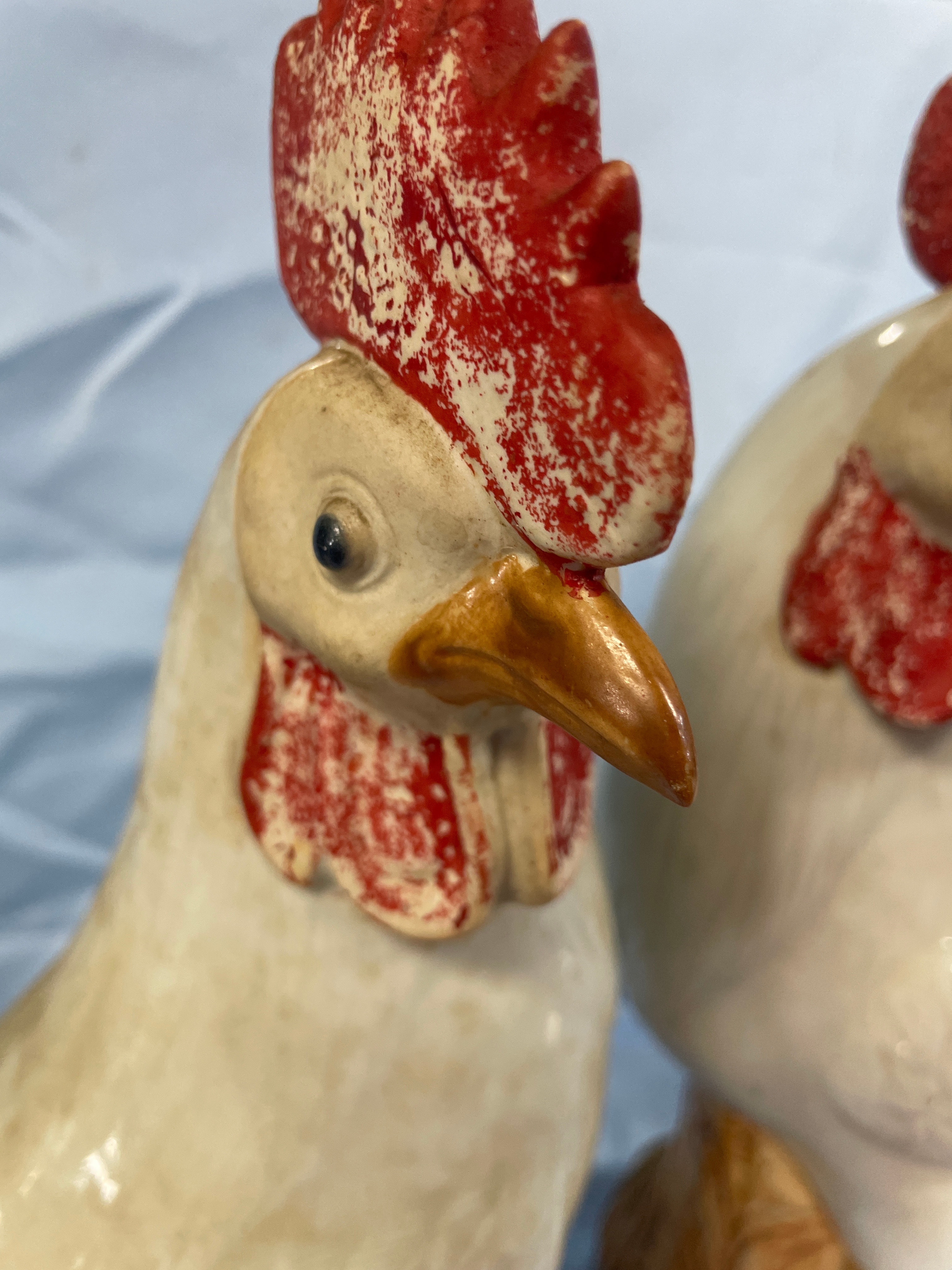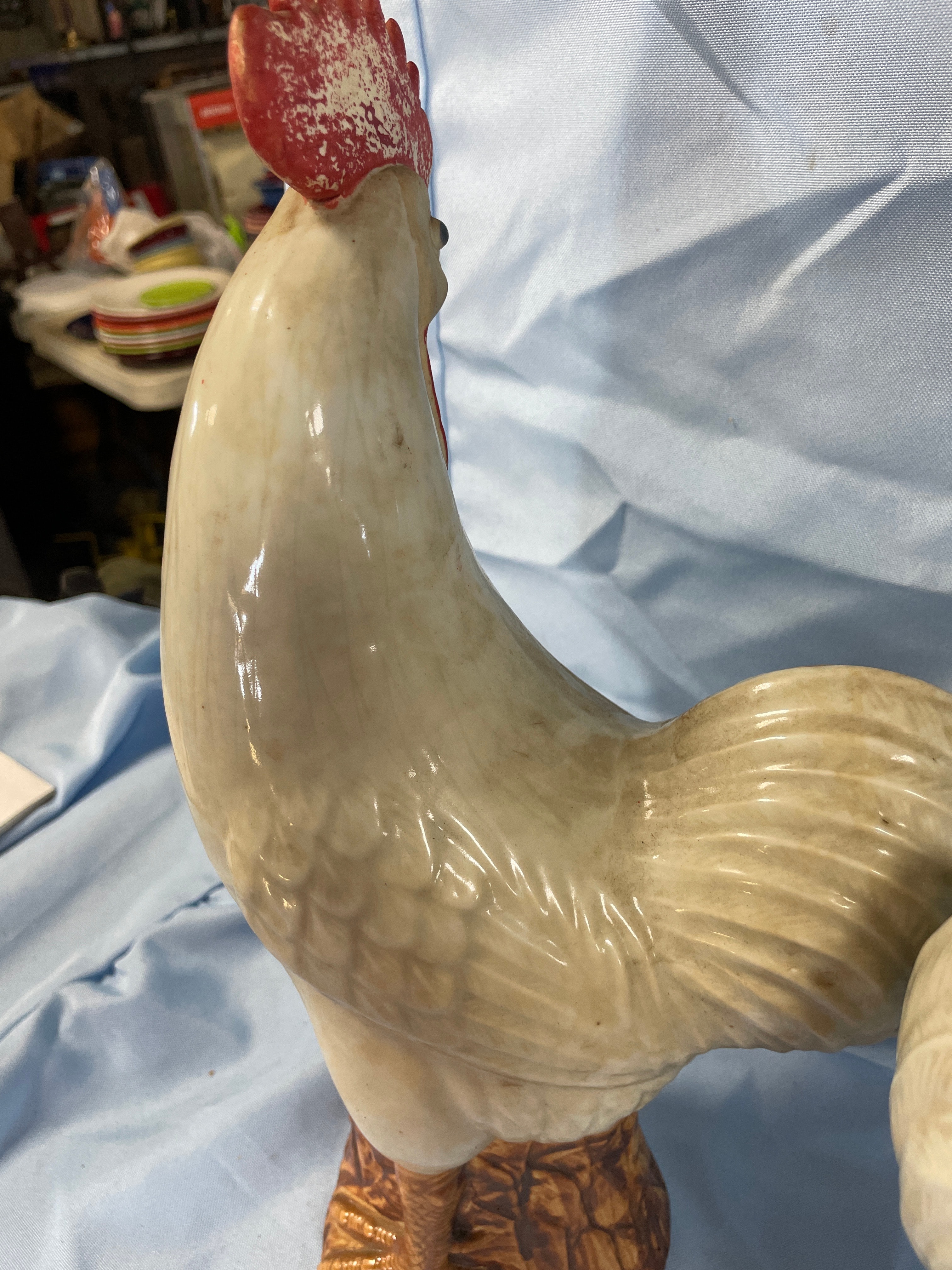 A pair of cream/off-white glazed porcelain rooster figurines with red combs and wattles and brown bases, each measuring approximately 13.5 inches tall and bearing a square-stamped maker’s mark “景德镇制” (Jingdezhen Zhi) on the bottom.