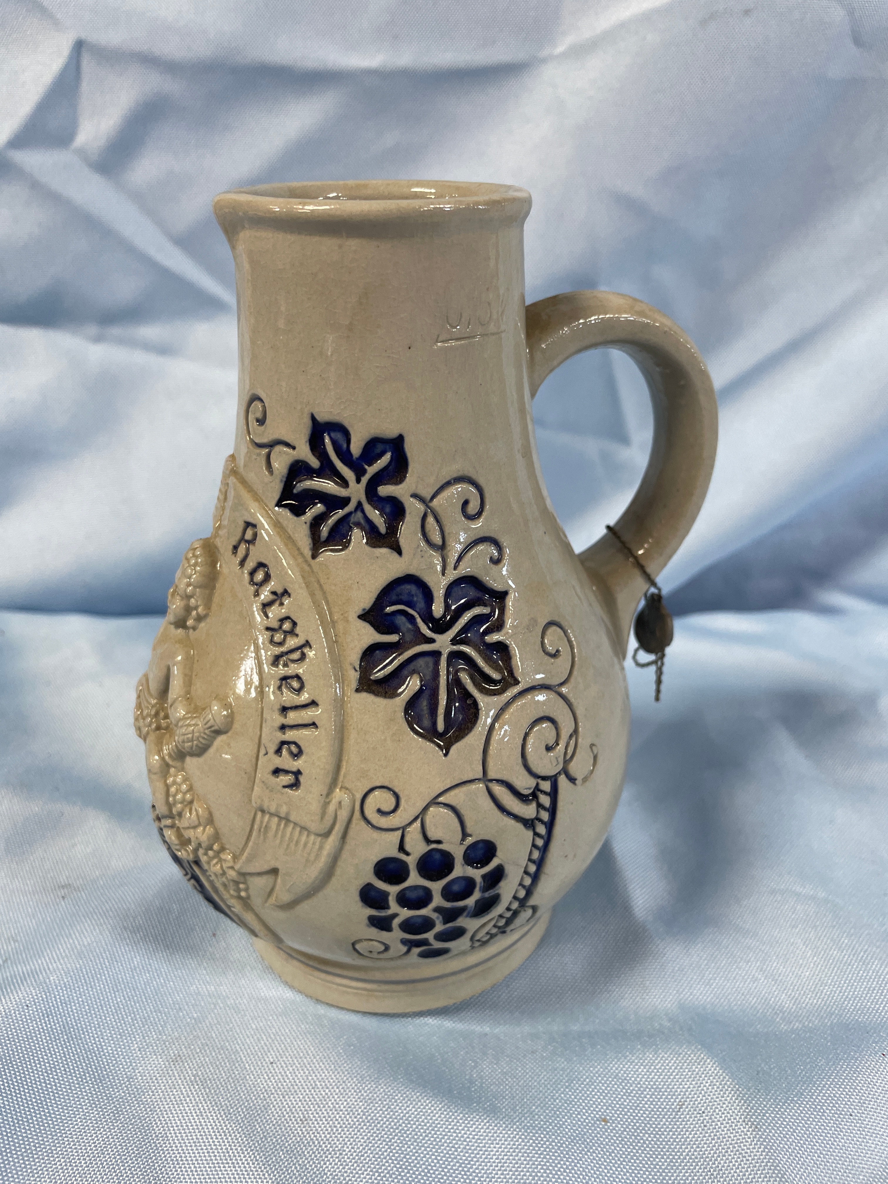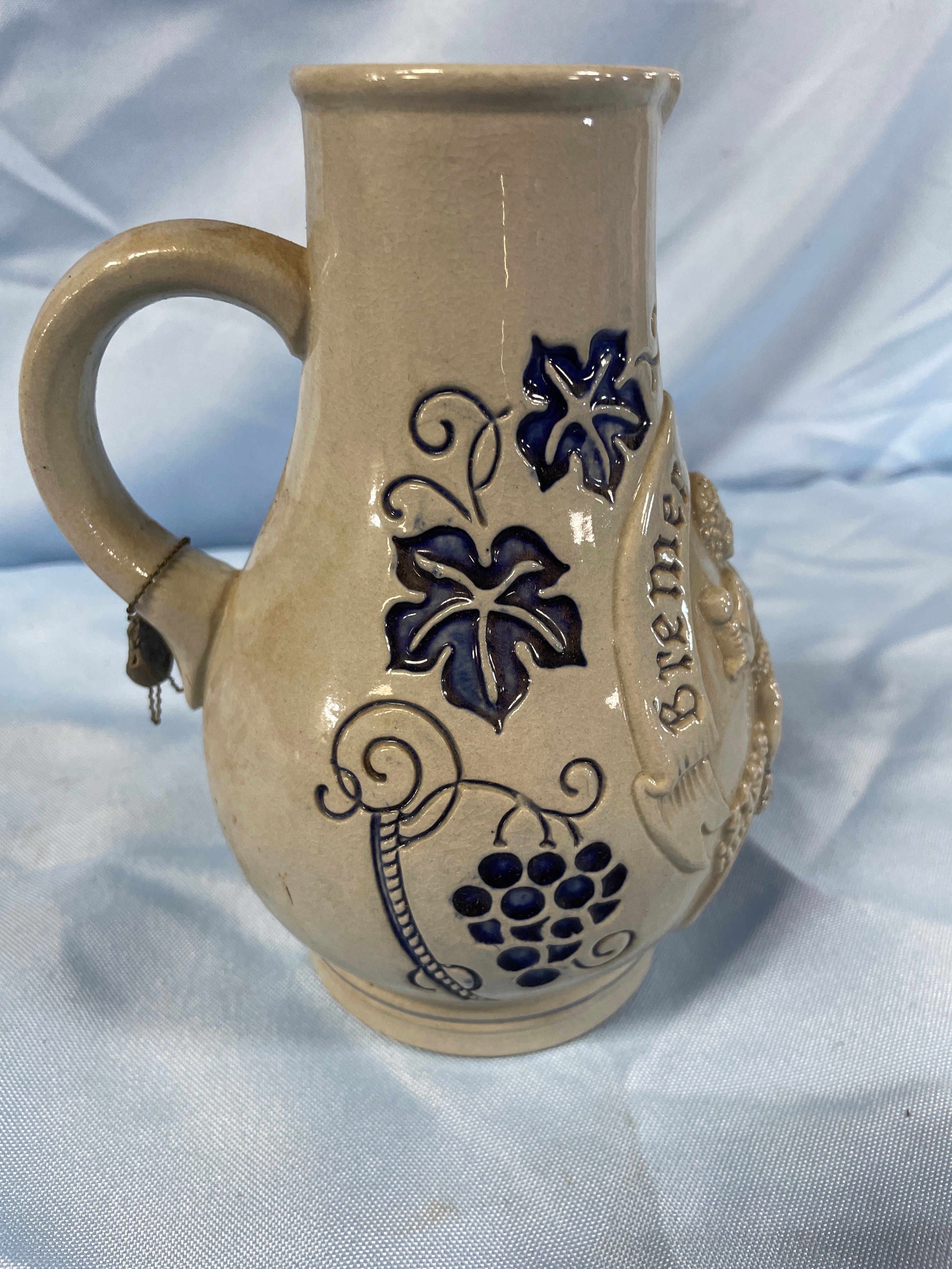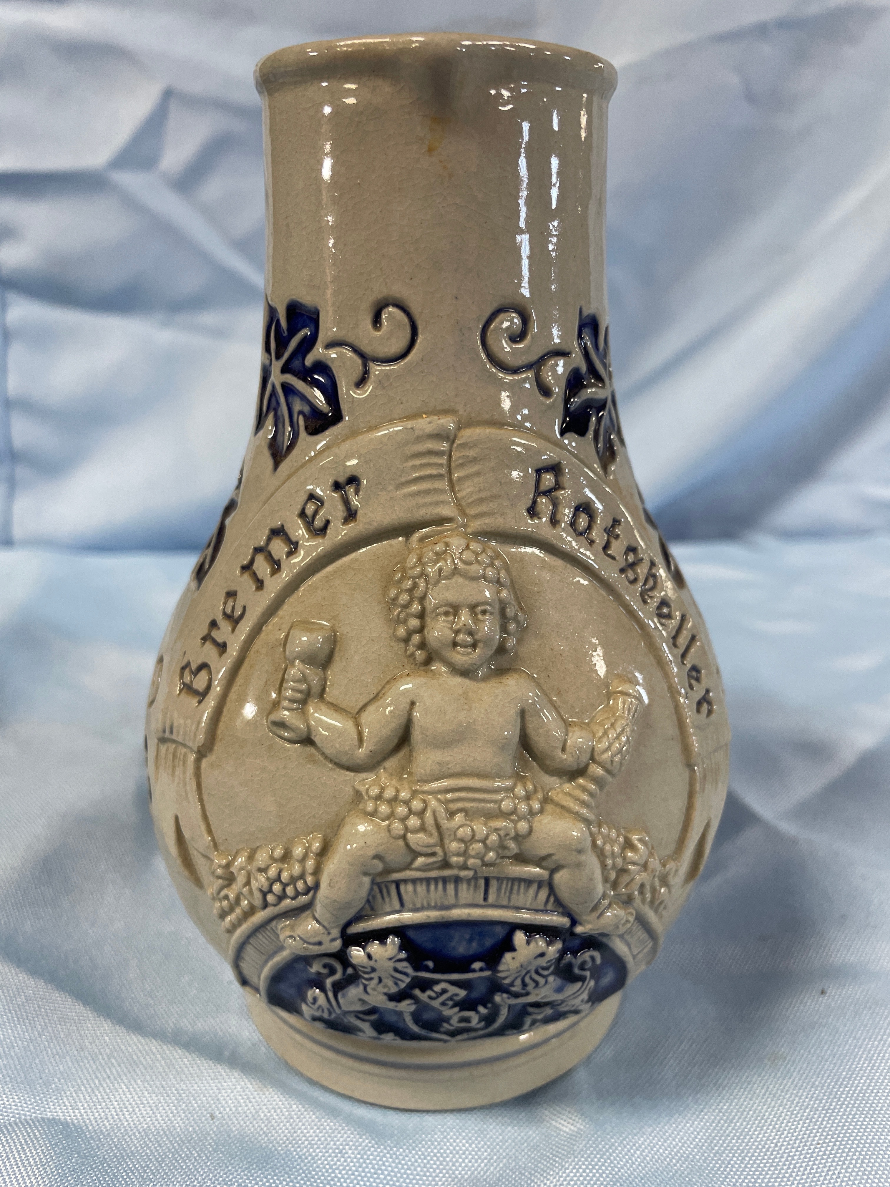 A beige ceramic jug with blue grape and leaf decorations, embossed ‘Bremer Ratskeller’ and a cherub figure, marked ‘0,5L’ and approximately 7 inches tall.
