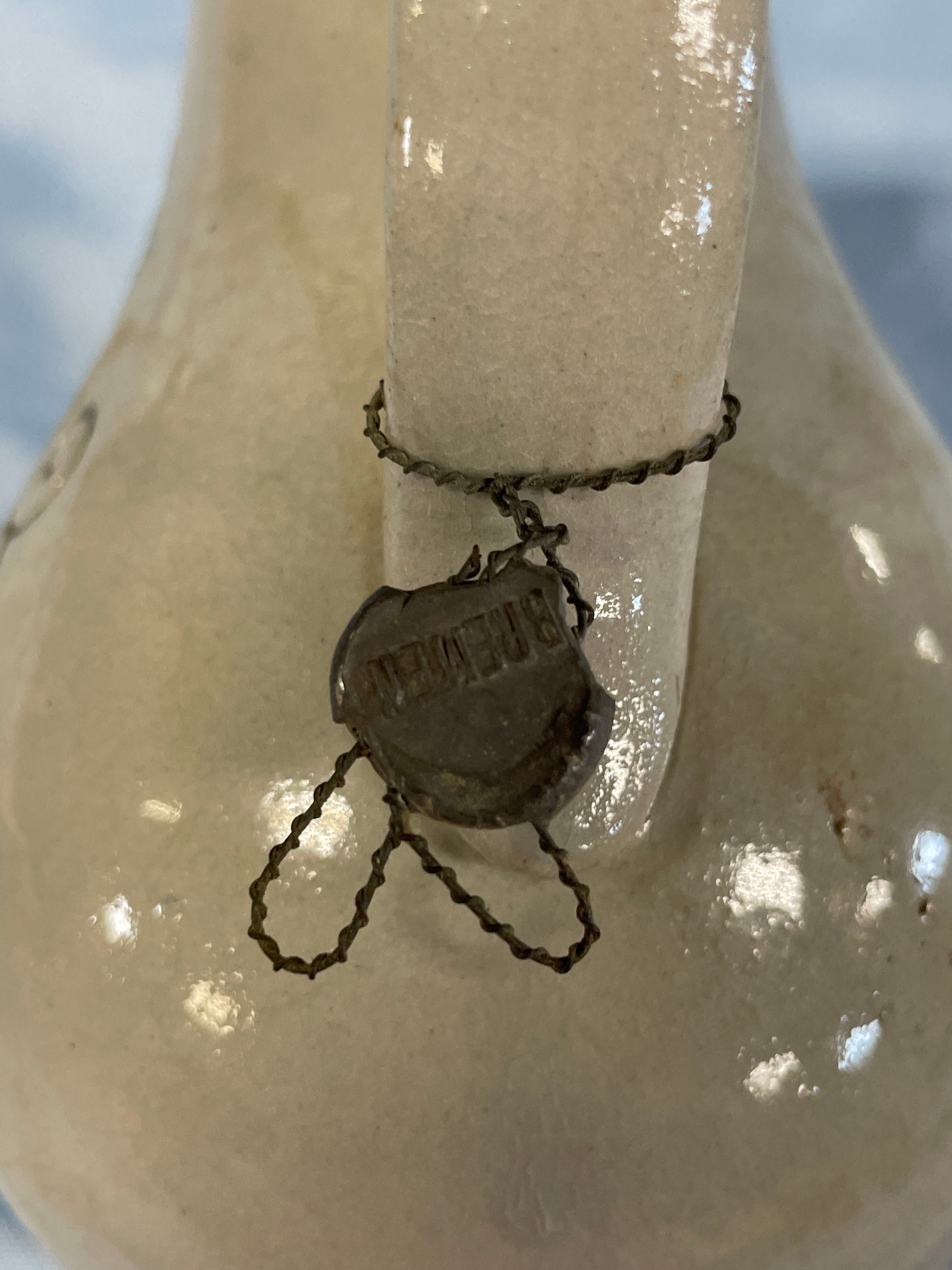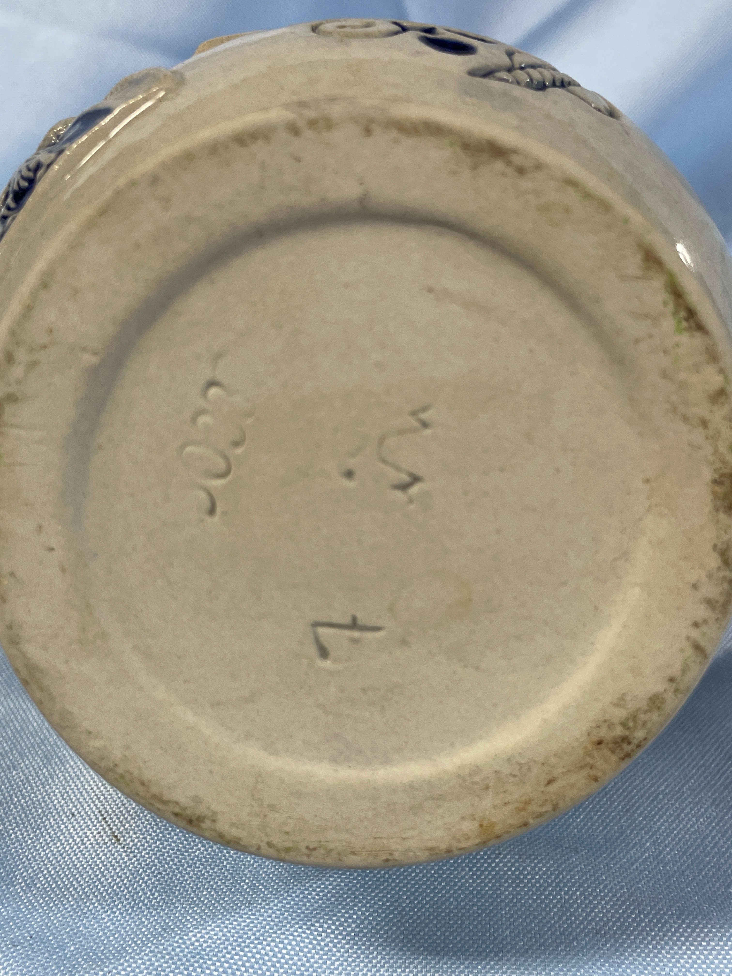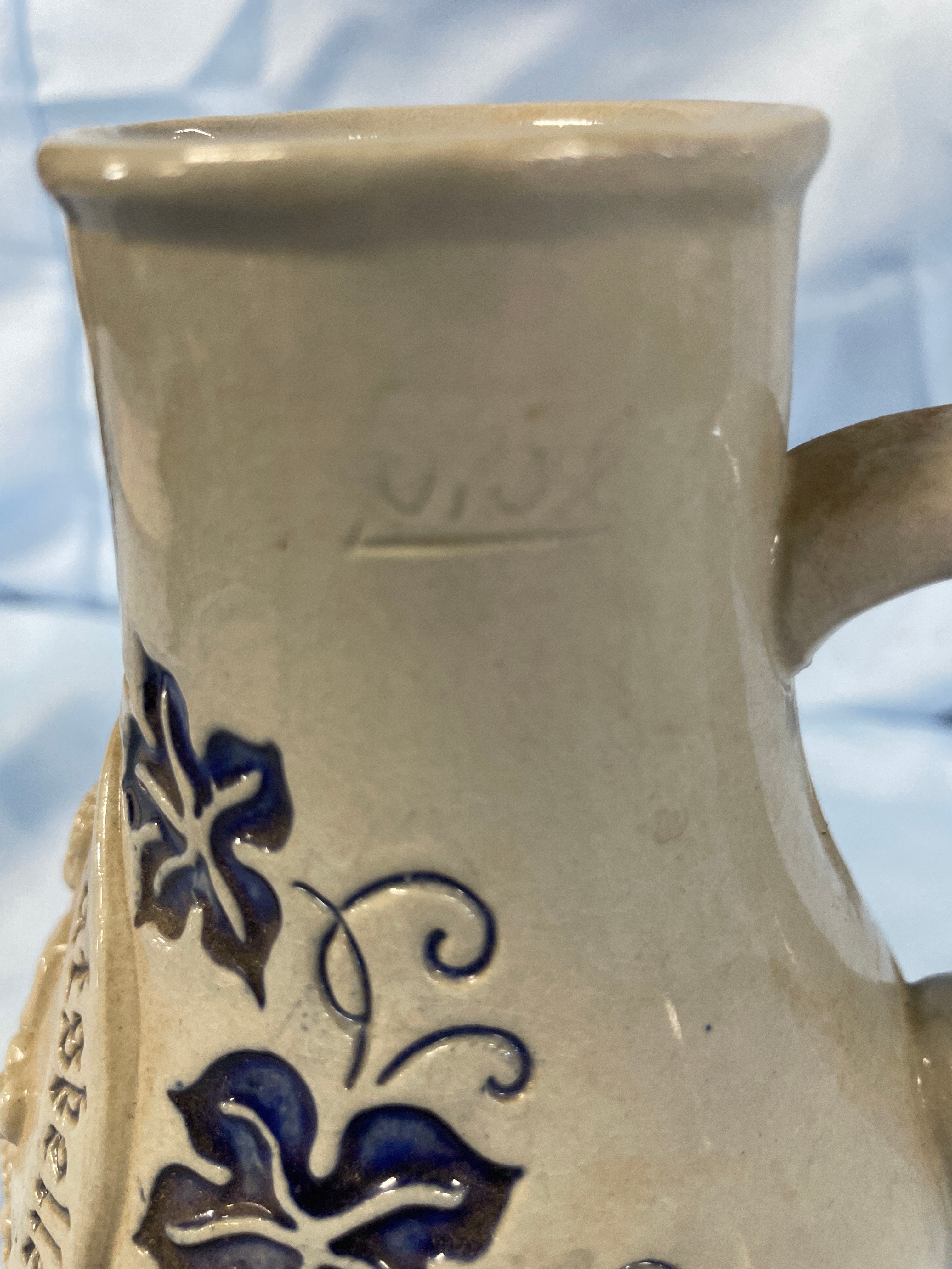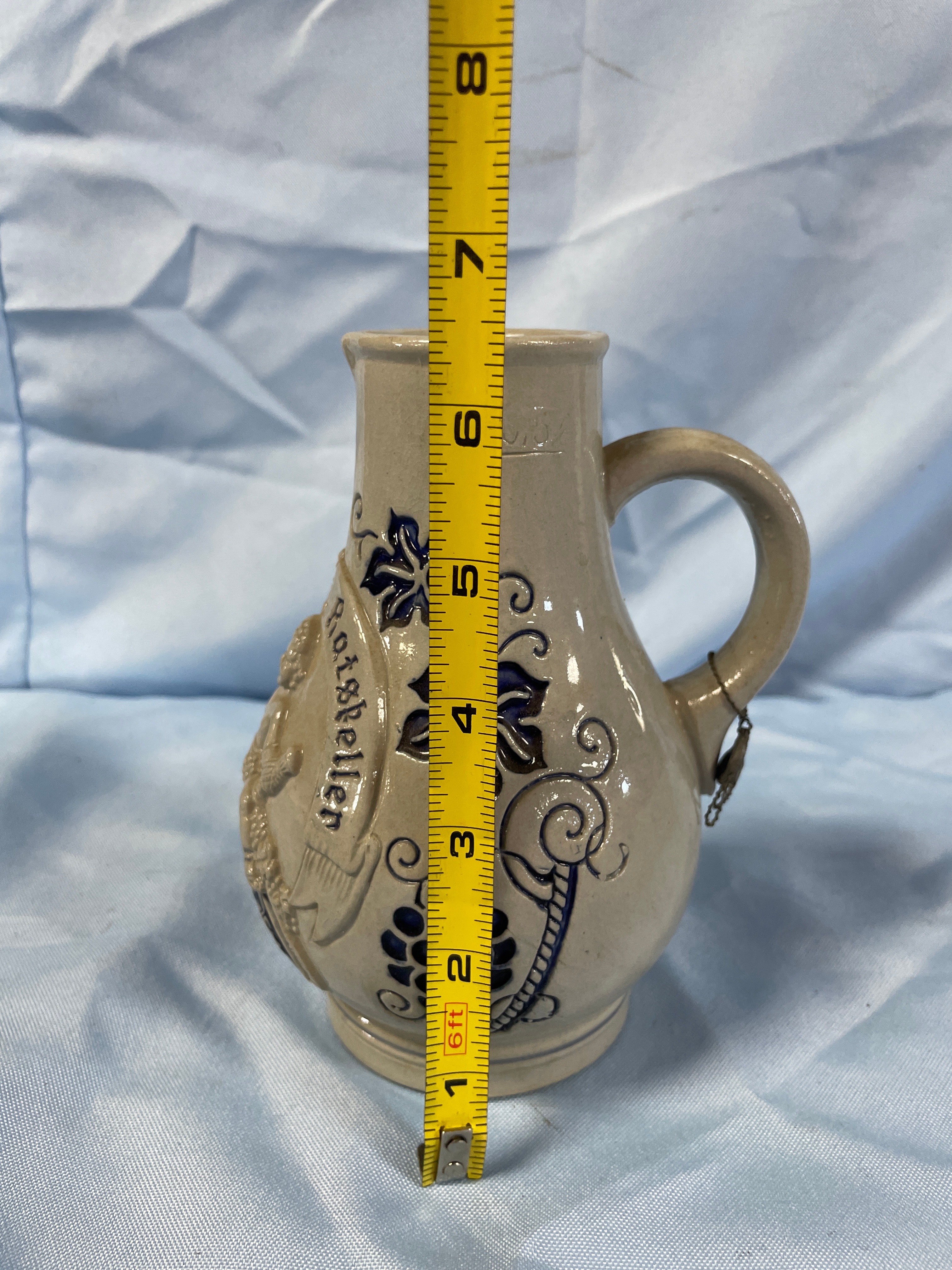 A beige ceramic jug with blue grape and leaf decorations, embossed ‘Bremer Ratskeller’ and a cherub figure, marked ‘0,5L’ and approximately 7 inches tall.