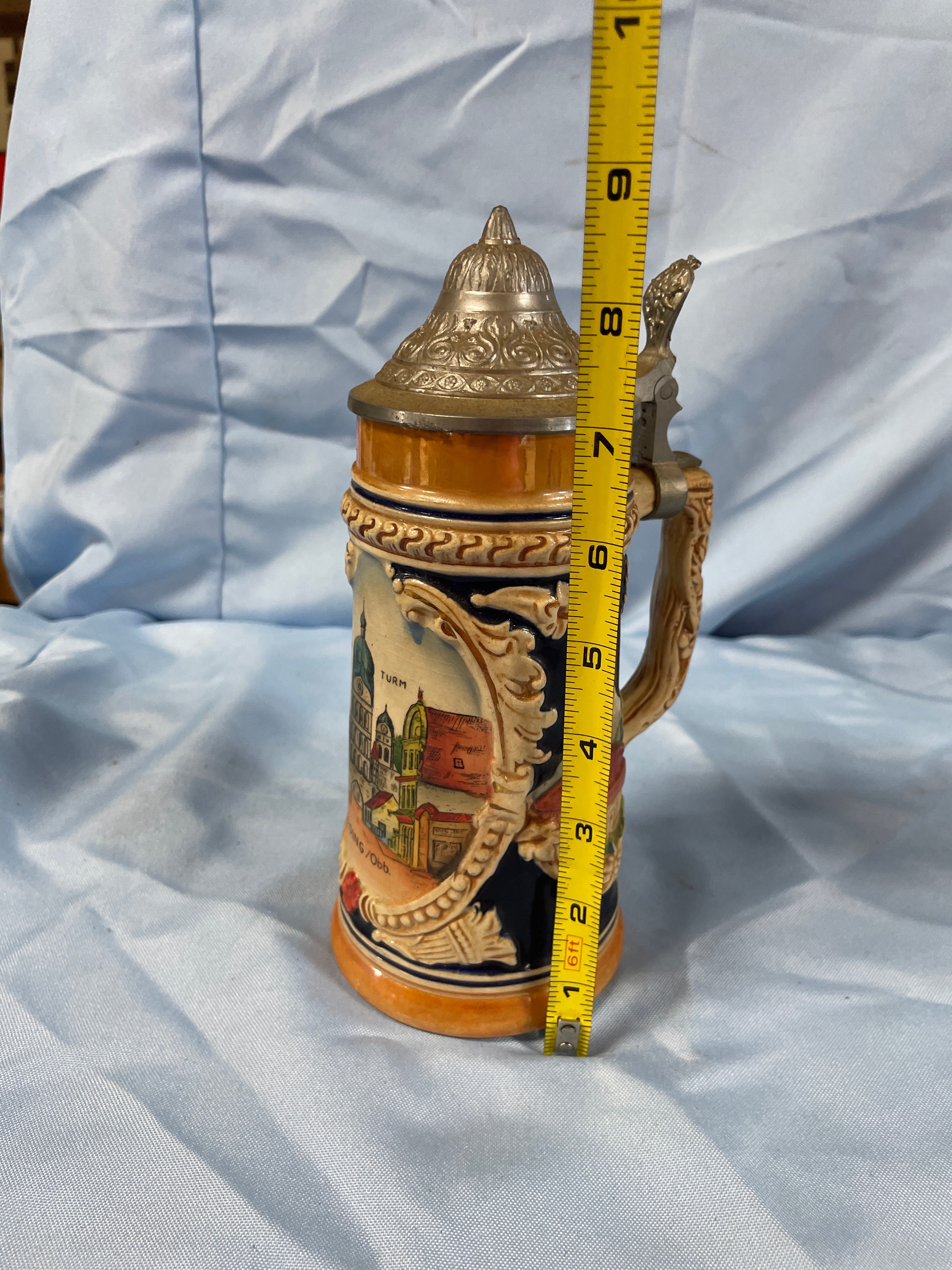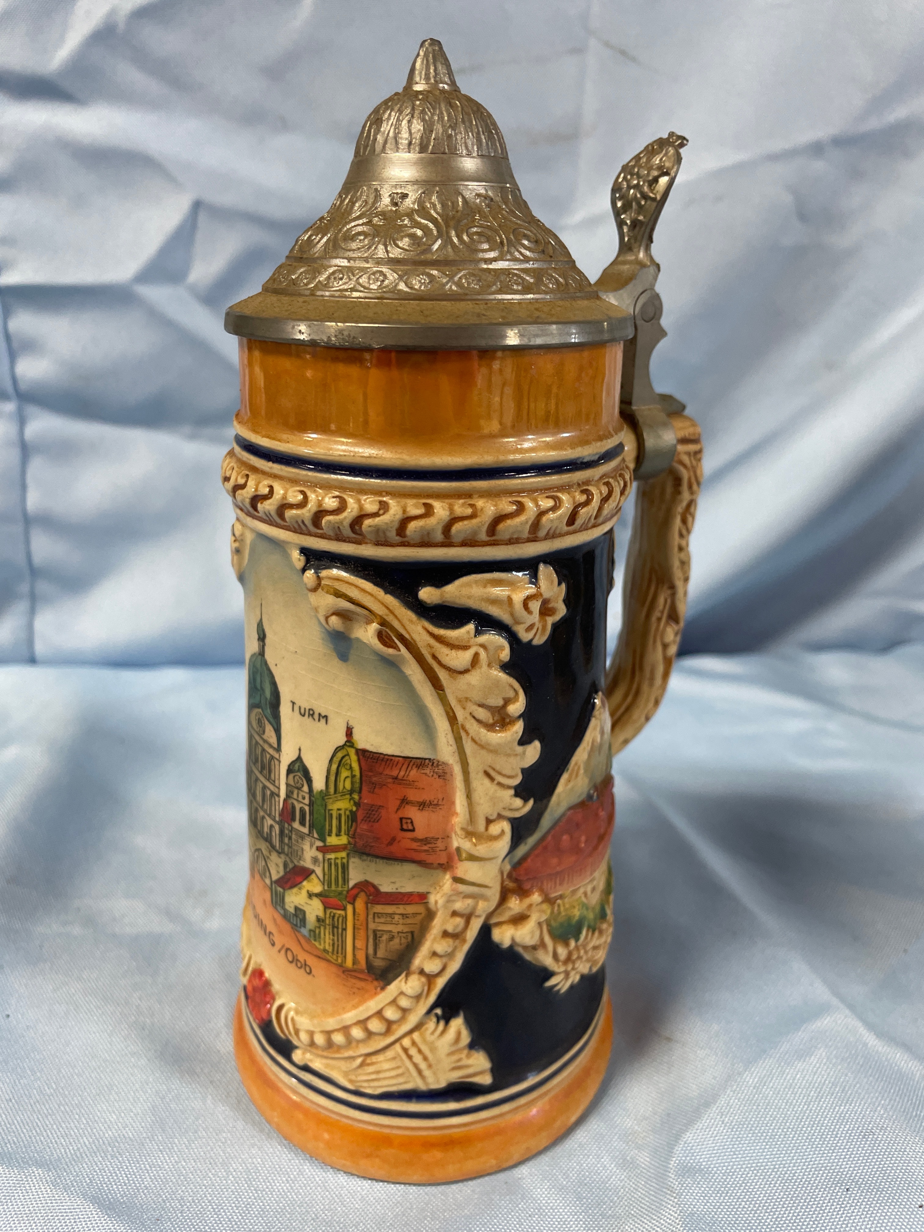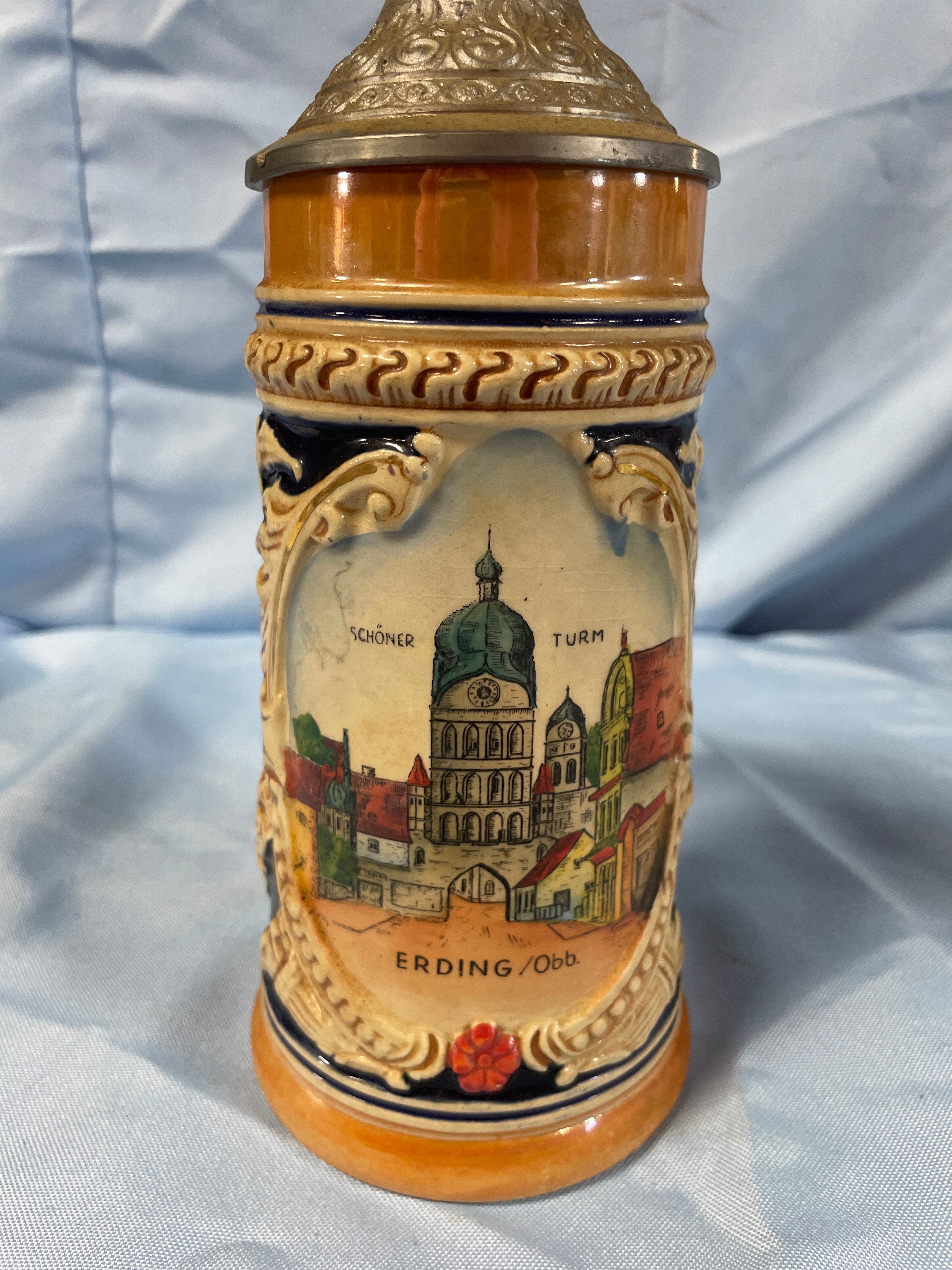 A ceramic beer stein with a hinged pewter lid, featuring multi-colored scenic depictions of buildings, inscribed “SCHÖNER TURM” and “ERDING/Obb.”, measuring approximately 7.5 inches high.