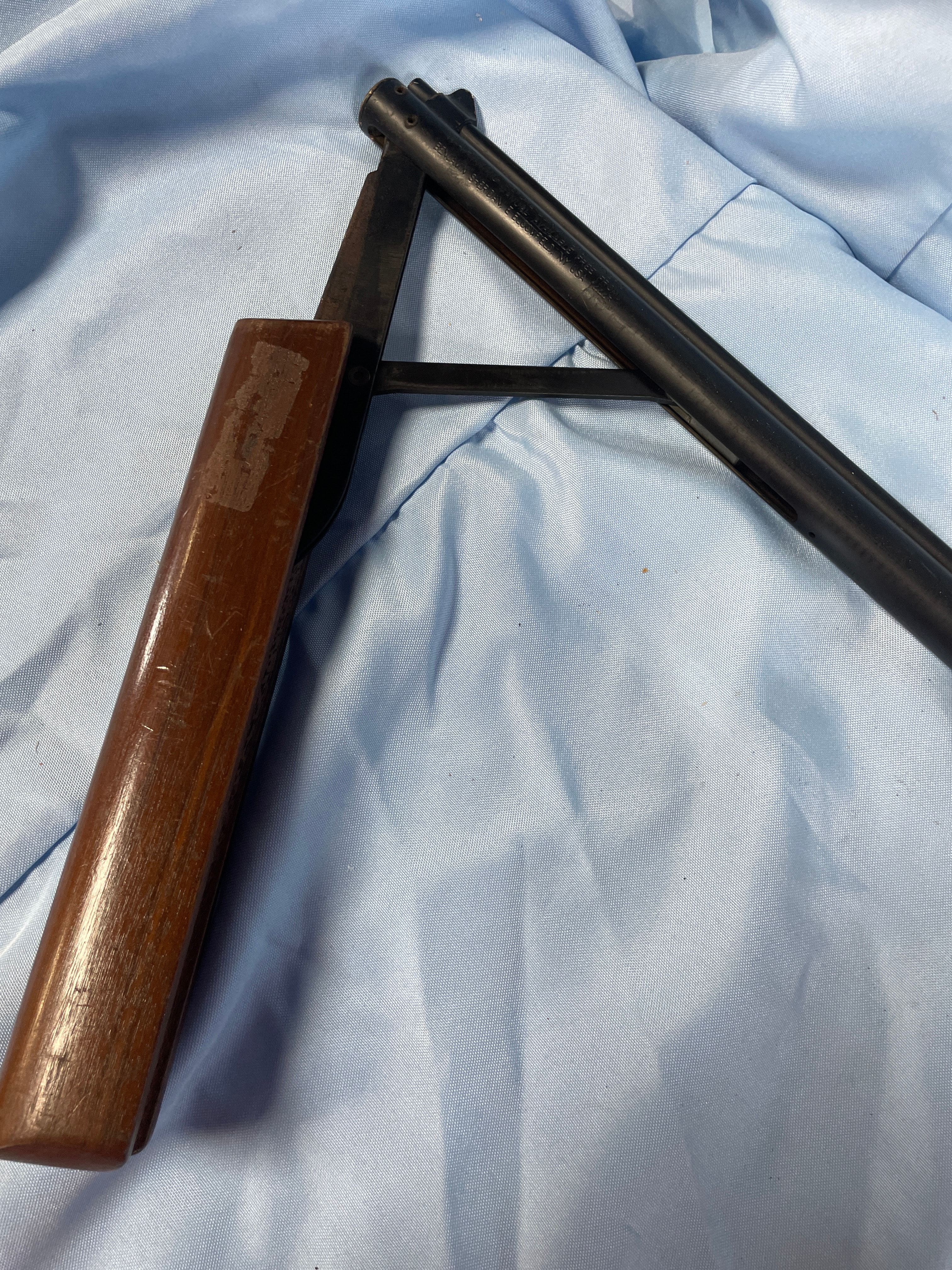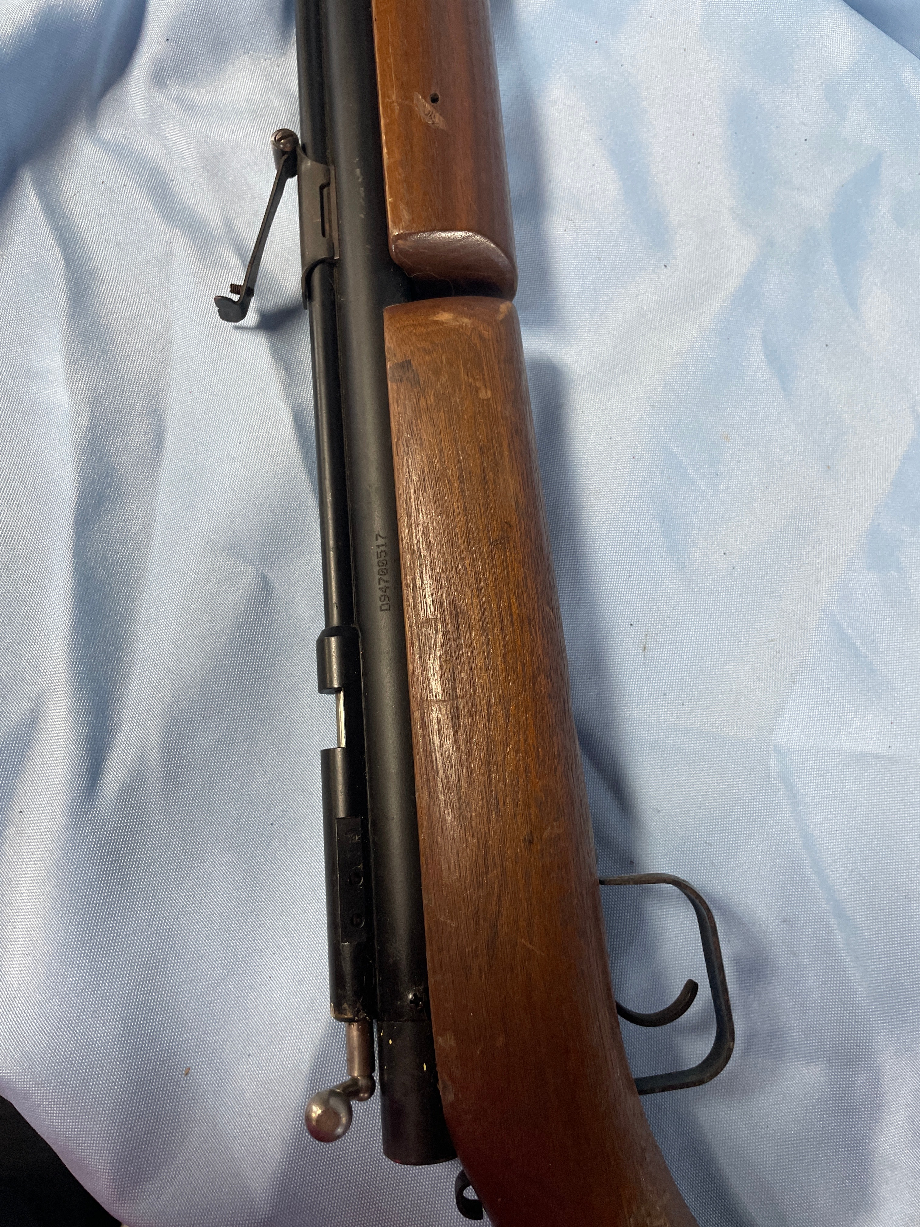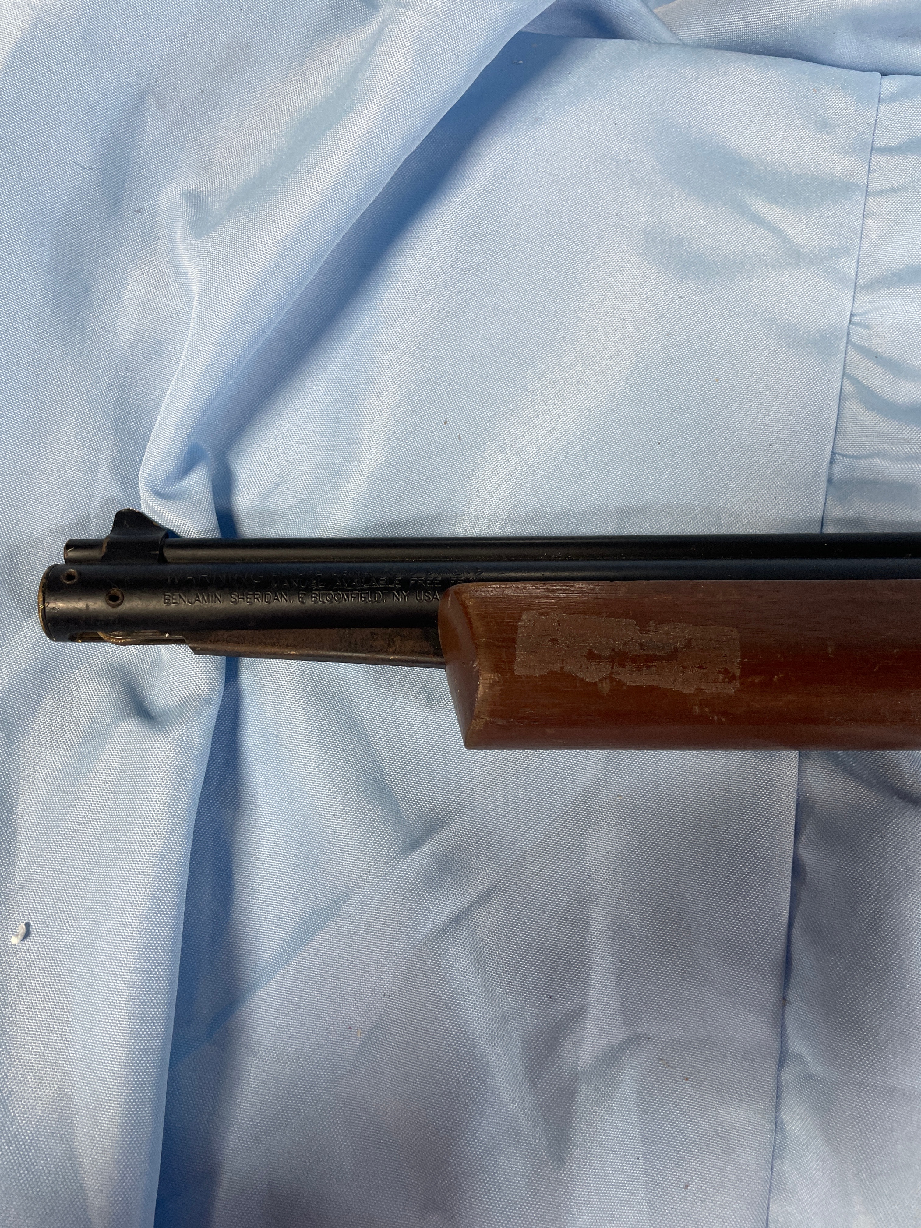A Benjamin Sheridan Blue Streak air rifle, chambered in .20 caliber (5mm). The rifle features a classic utilitarian style, consistent with mid-to-late 20th-century production. It is constructed with a wooden stock and fore-end, paired with blued metal for the barrel, action, and trigger guard. Markings on the barrel include ‘BENJAMIN SHERIDAN E BLOOMFIELD, NY USA’. A serial number ‘099780517’ is stamped on the receiver.