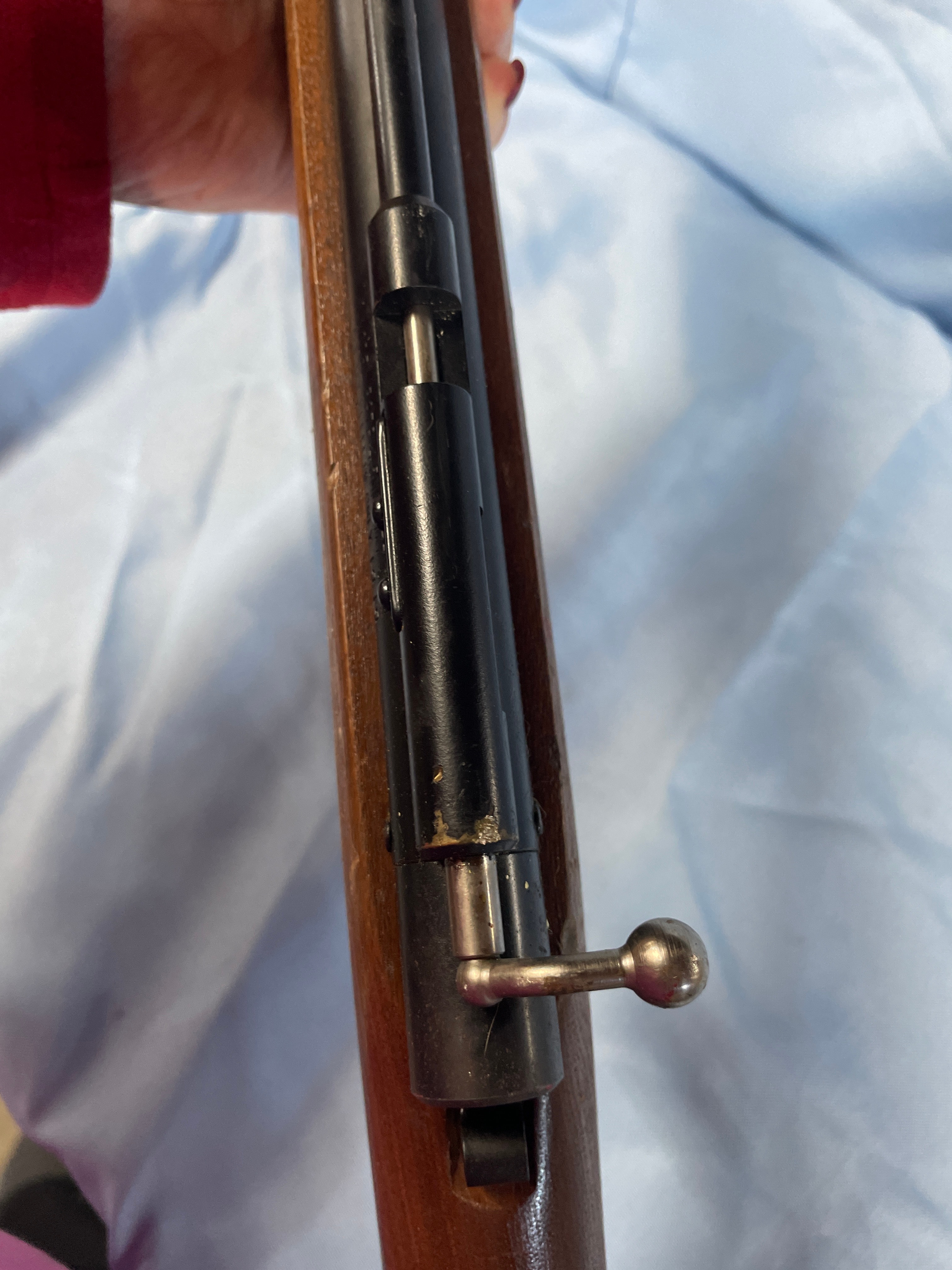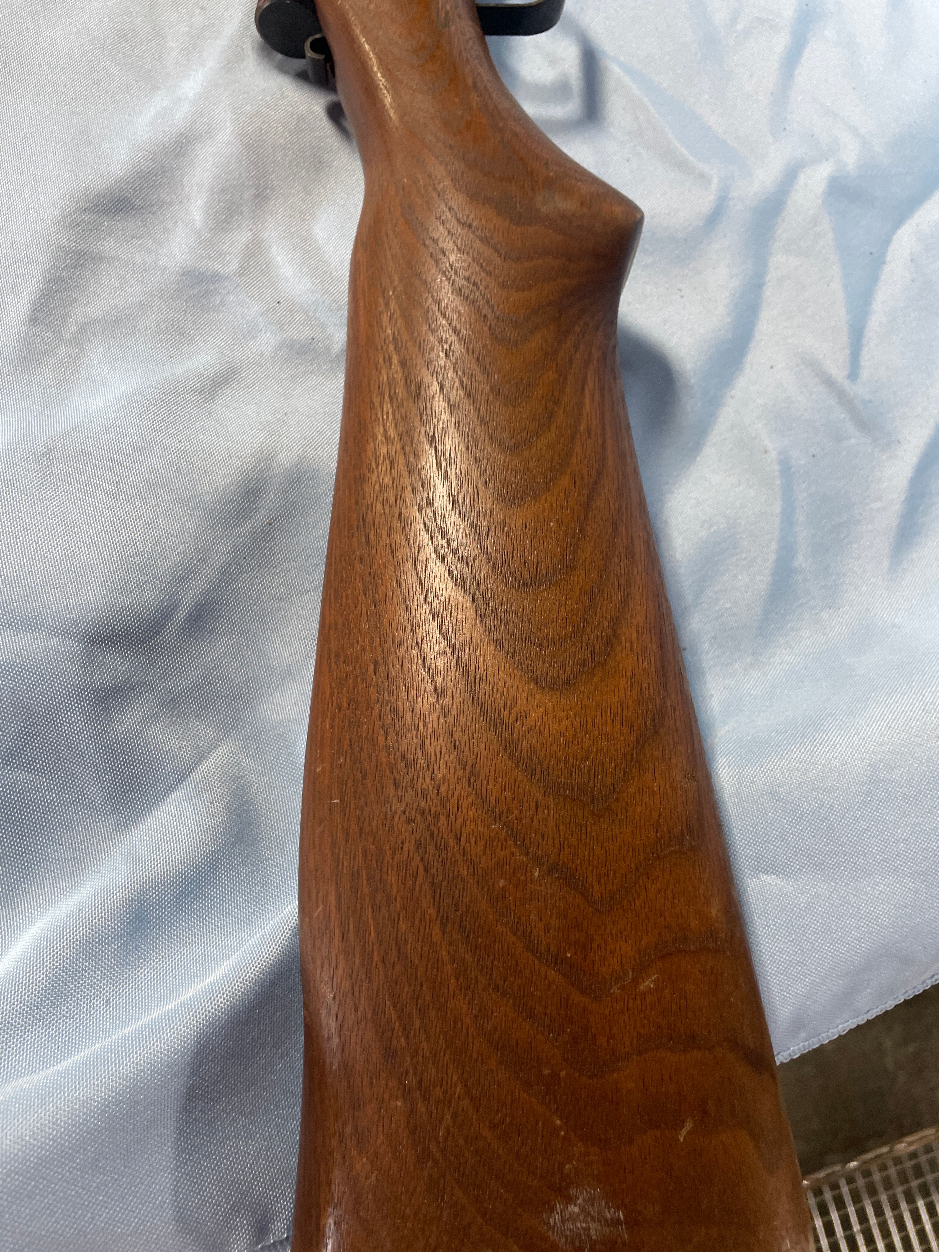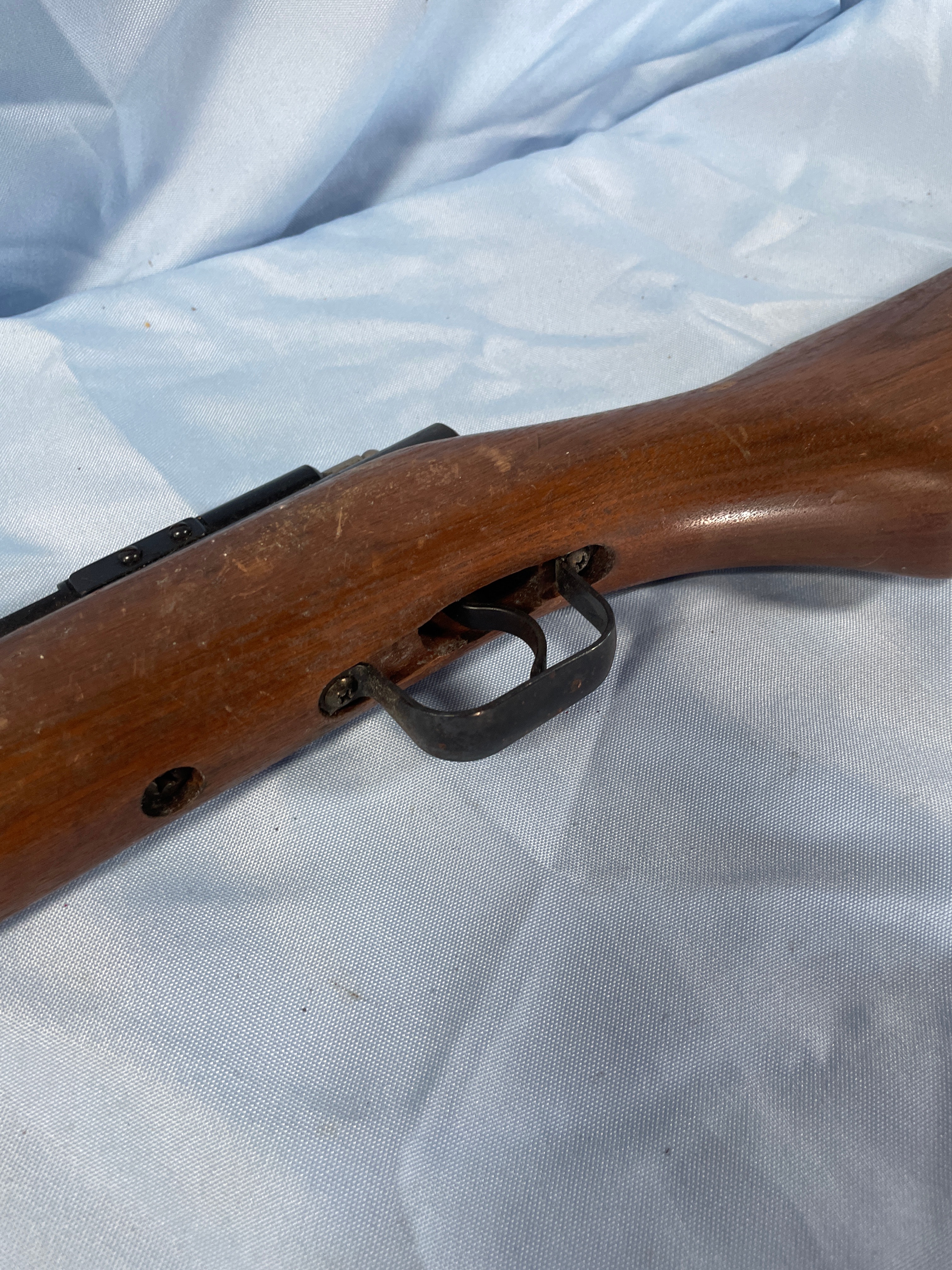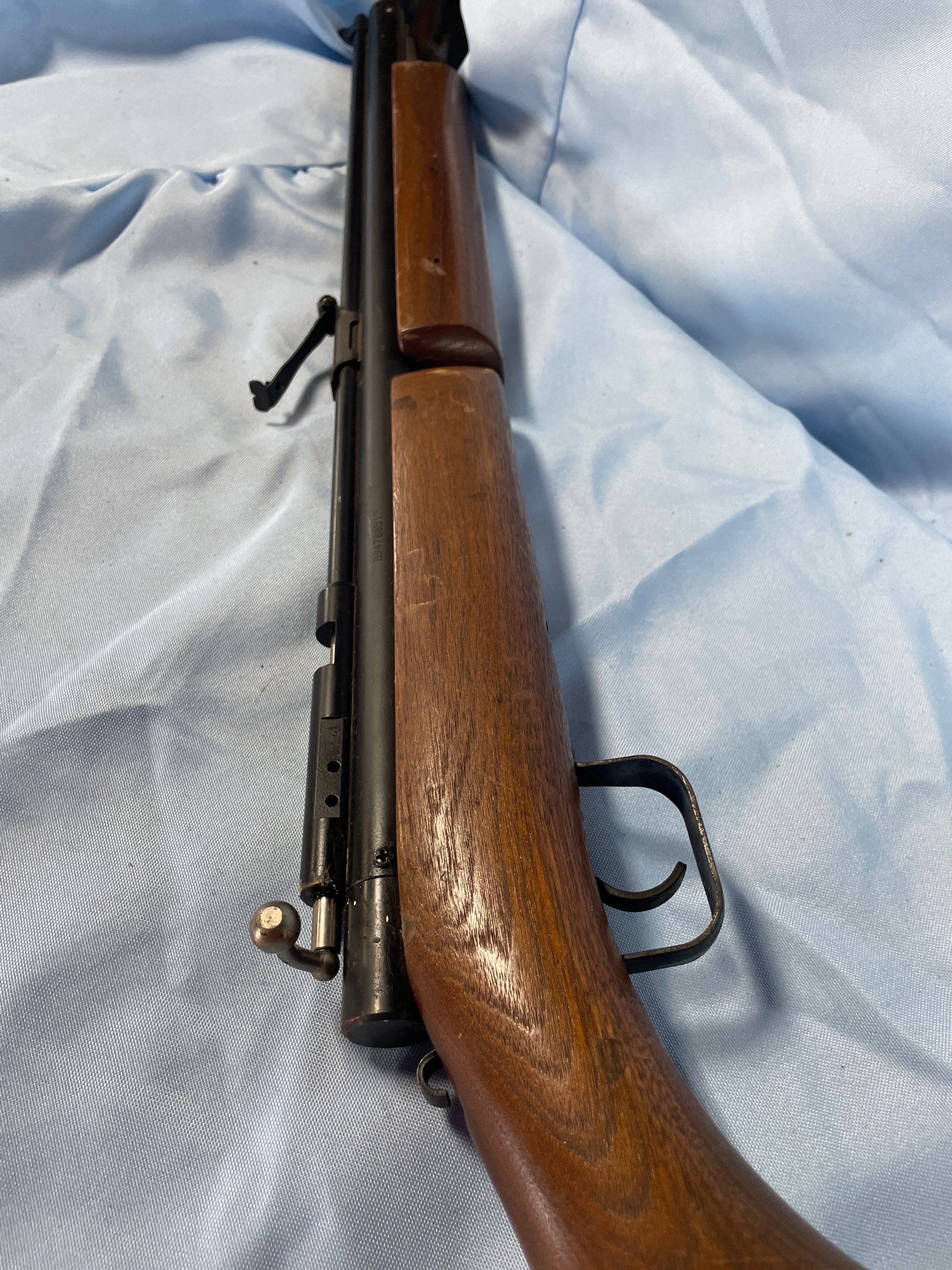 A Benjamin Sheridan Blue Streak air rifle, chambered in .20 caliber (5mm). The rifle features a classic utilitarian style, consistent with mid-to-late 20th-century production. It is constructed with a wooden stock and fore-end, paired with blued metal for the barrel, action, and trigger guard. Markings on the barrel include ‘BENJAMIN SHERIDAN E BLOOMFIELD, NY USA’. A serial number ‘099780517’ is stamped on the receiver.
