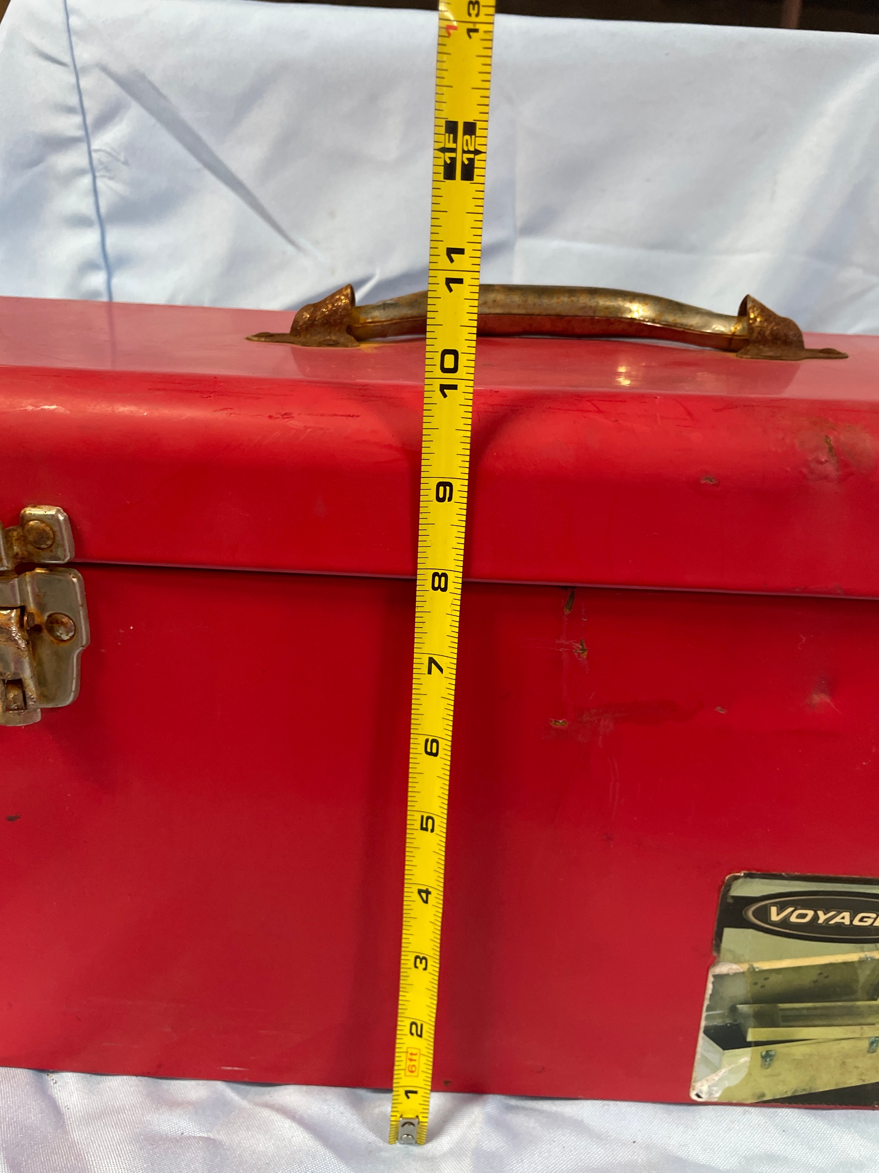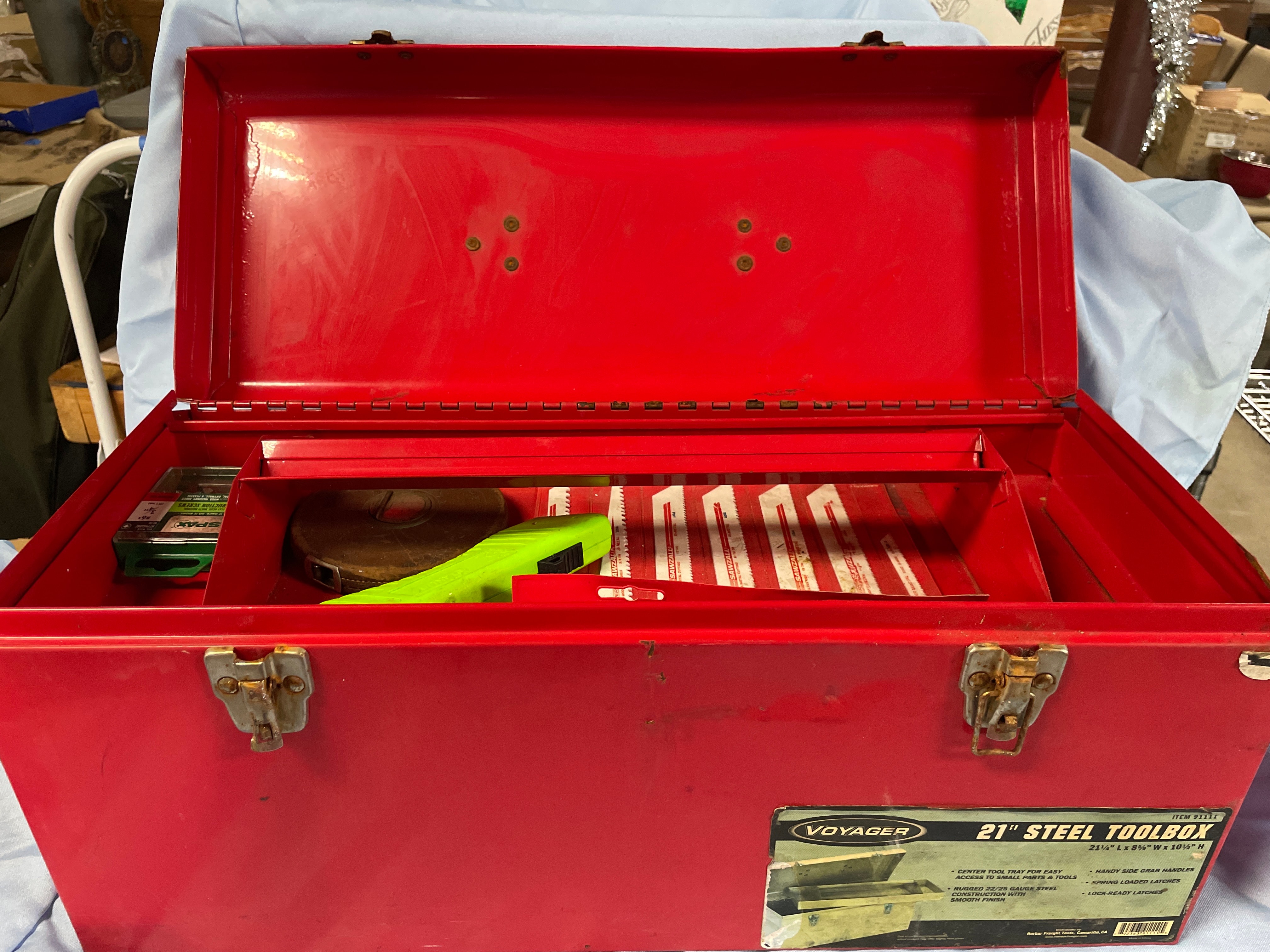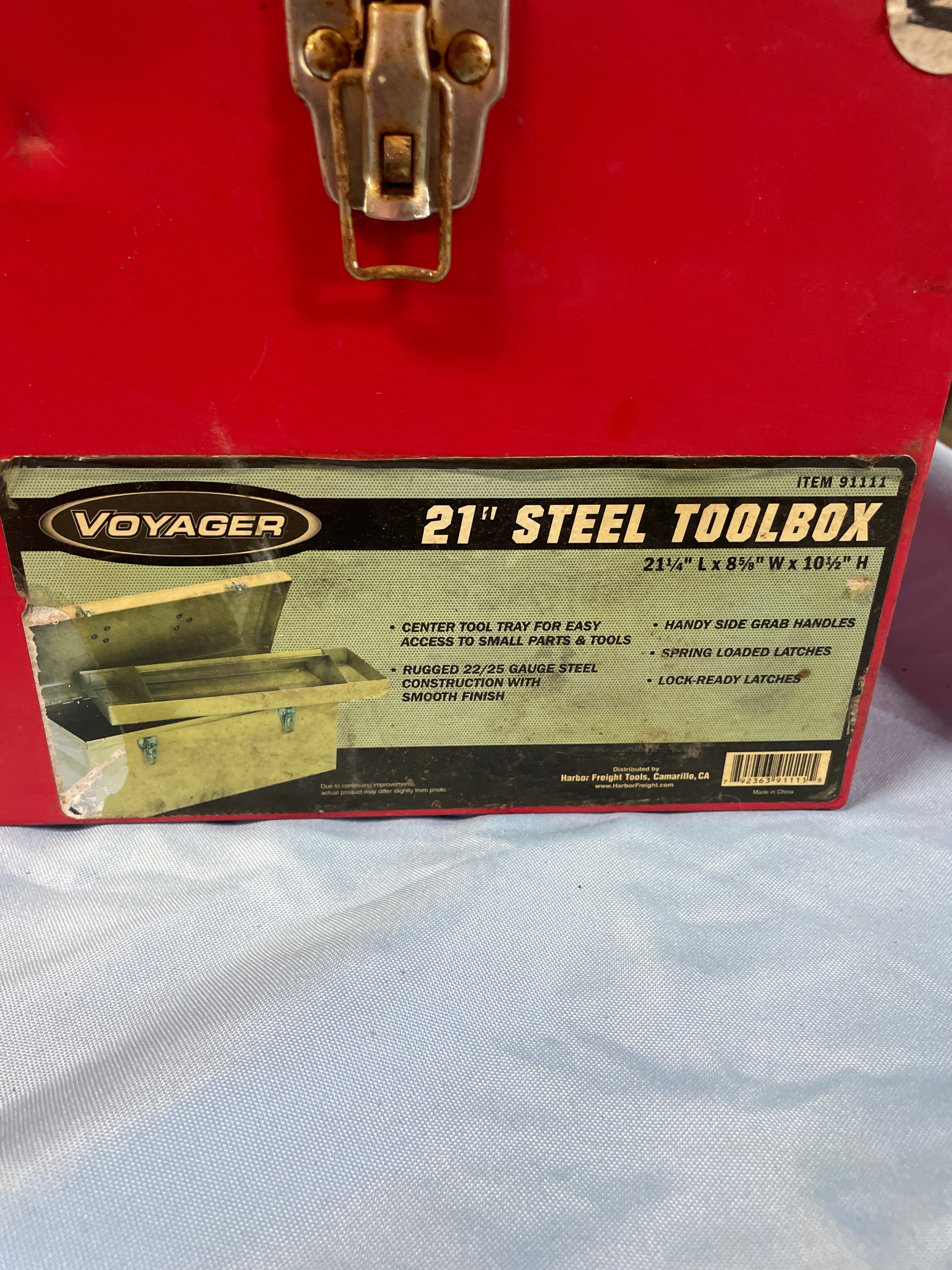 A Voyager 21" Steel Toolbox, distributed by Harbor Freight Tools. Constructed from red enamel-finished steel with brass-toned, spring-loaded, and lock-ready latches. The product sticker indicates "RUGGED 22/25 GAUGE STEEL" construction and includes a "CENTER TOOL TRAY" for easy access to small parts and tools. The interior contains a group of associated hardware, including SPAX screws, various reciprocating saw blades, a lime green utility knife, a black spring clamp, a box of GRIP-RITE FASTENERS (Electro Galvanized Neo Roofing), and a COOPER Wiring Devices Generator Plug.