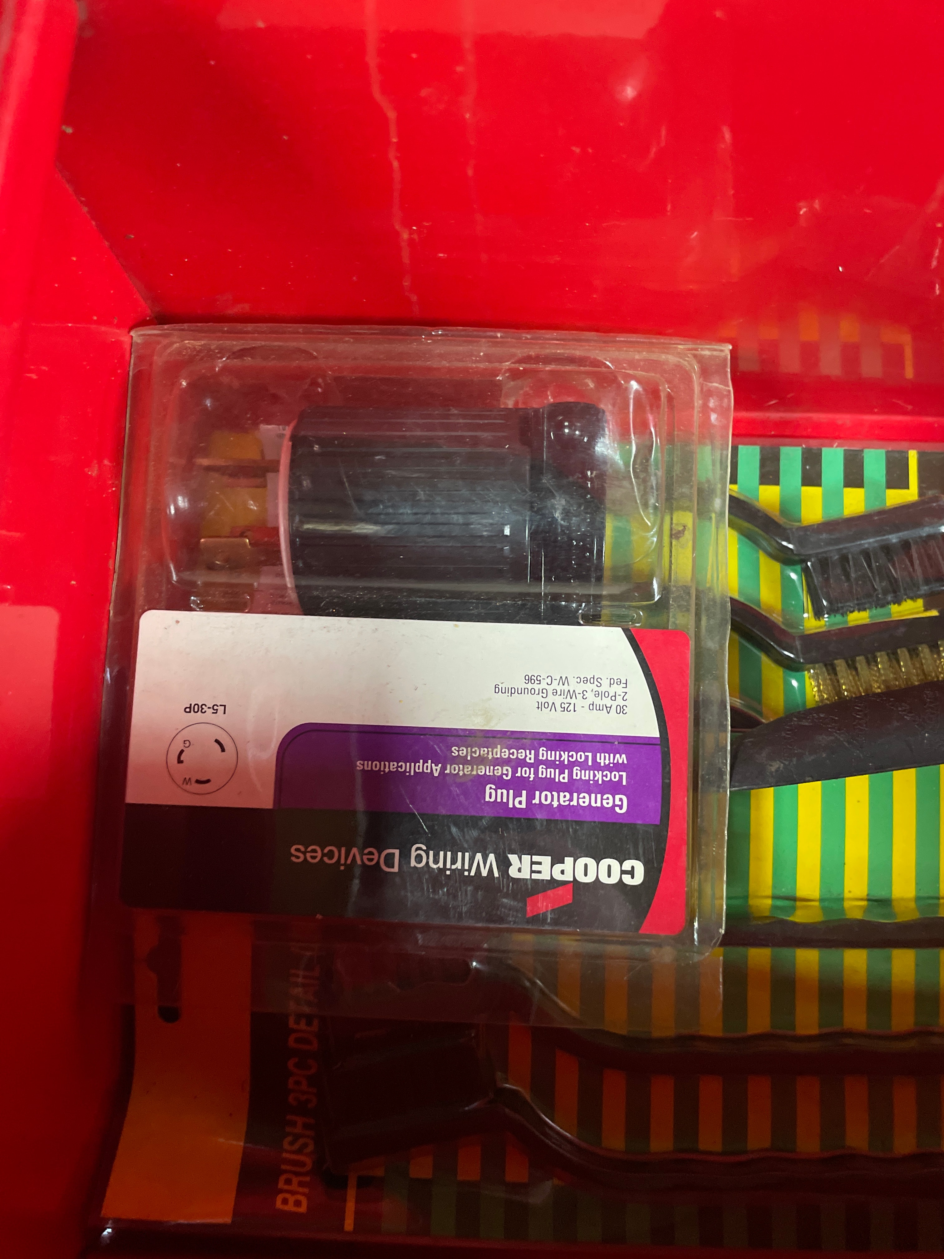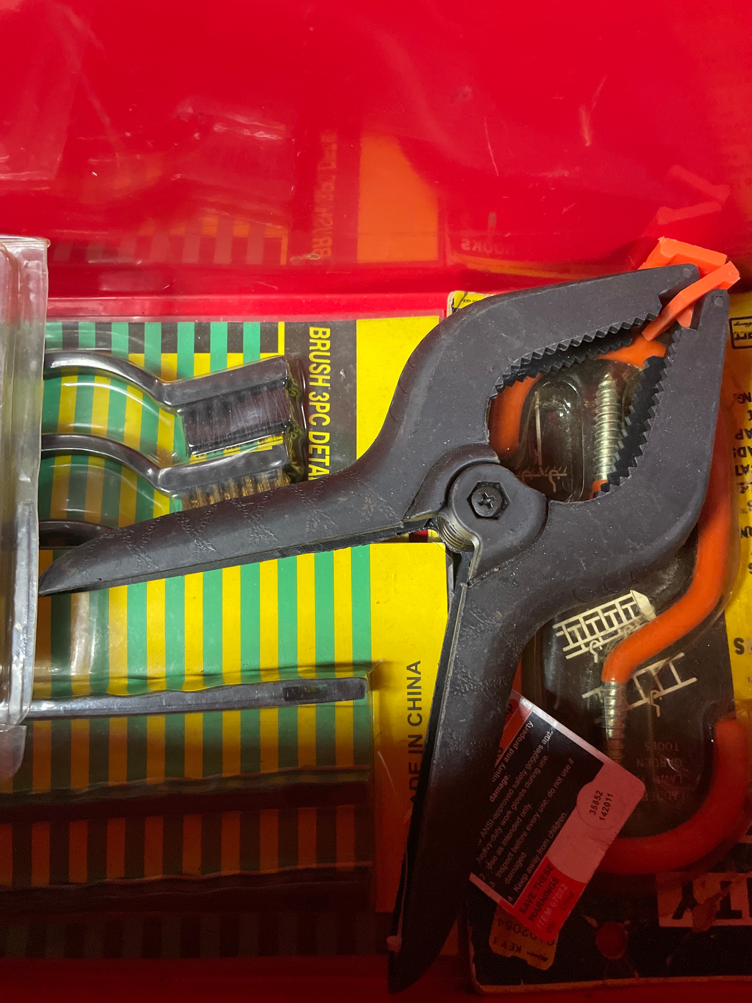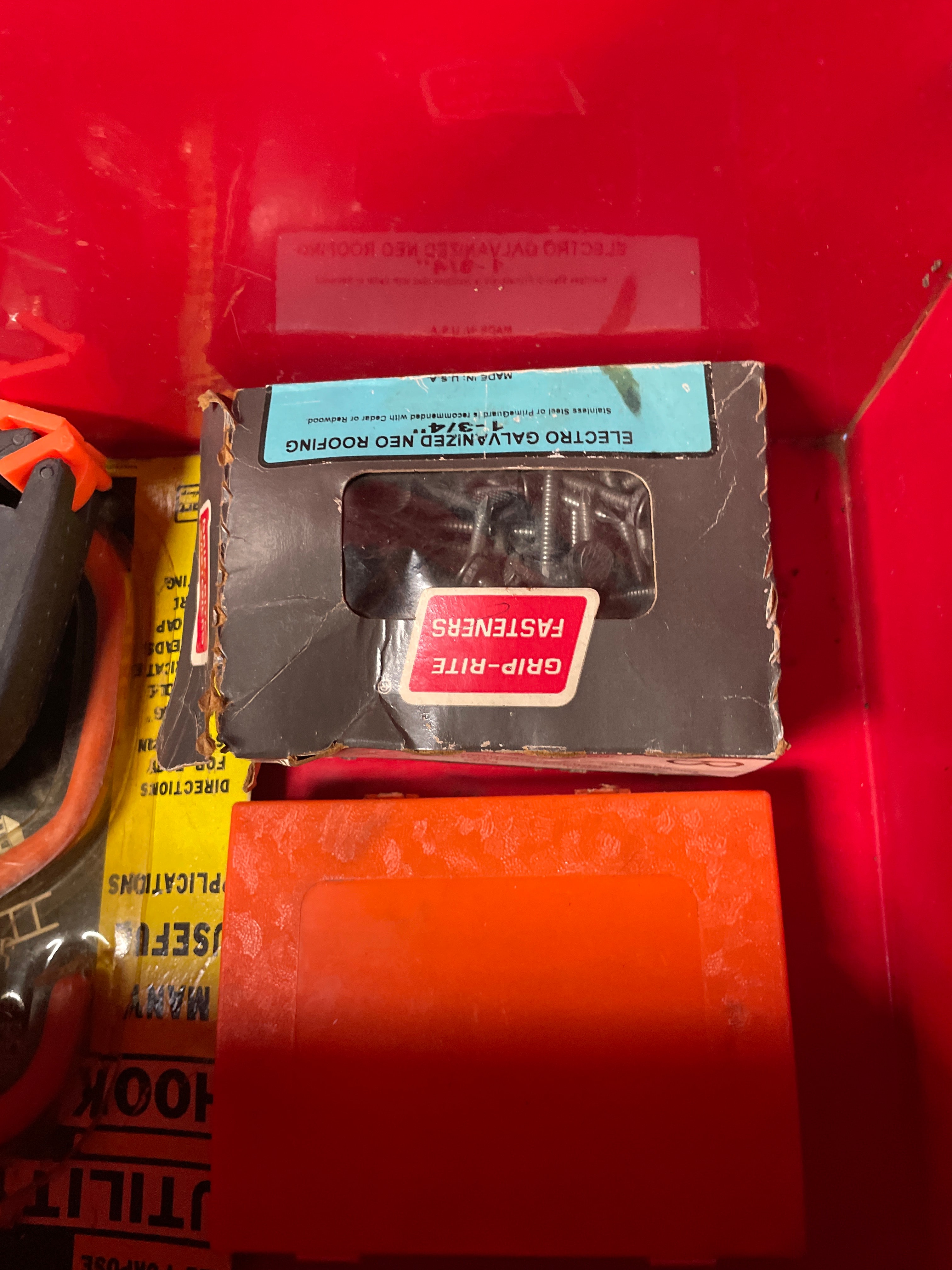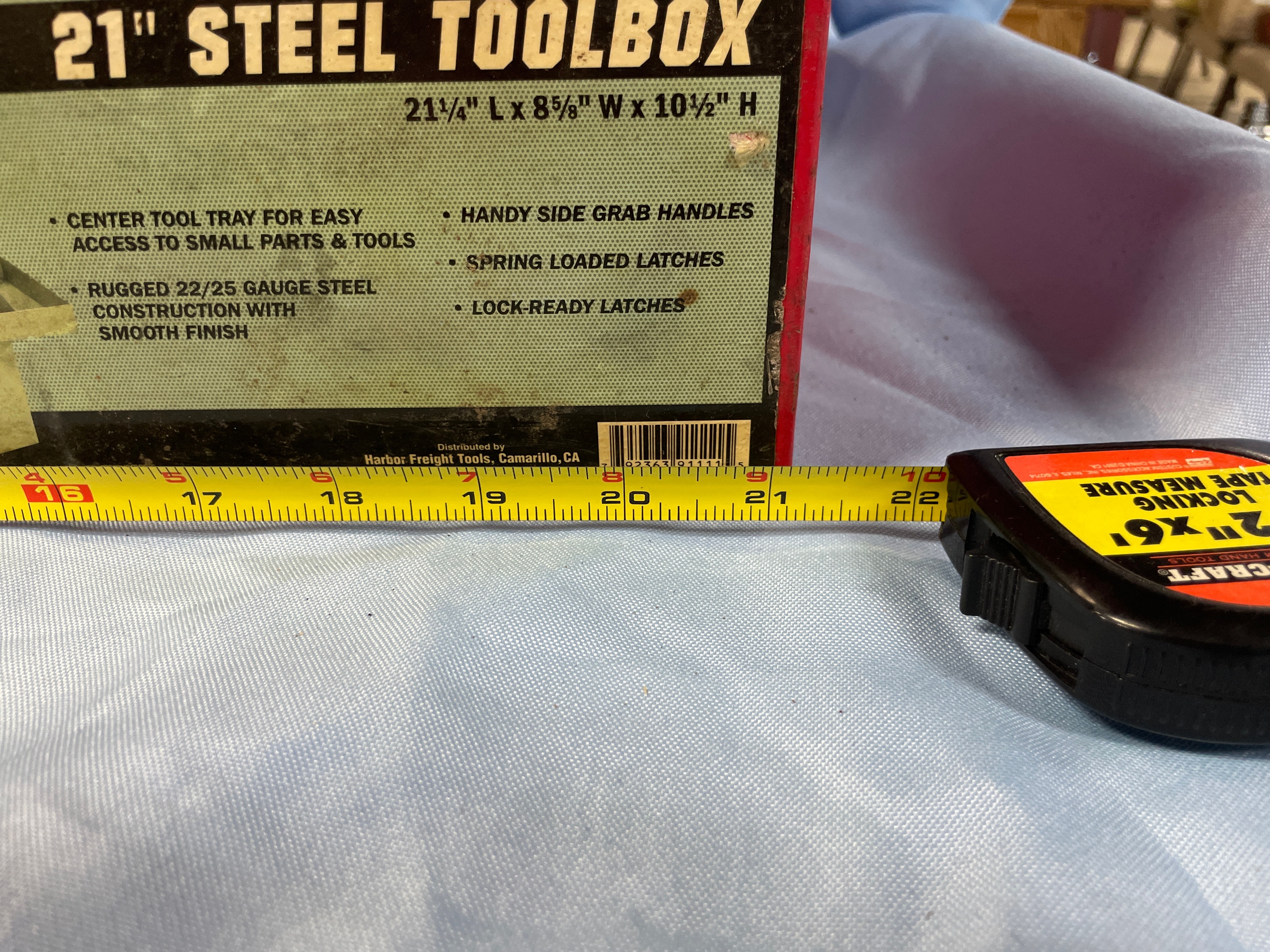 A Voyager 21" Steel Toolbox, distributed by Harbor Freight Tools. Constructed from red enamel-finished steel with brass-toned, spring-loaded, and lock-ready latches. The product sticker indicates "RUGGED 22/25 GAUGE STEEL" construction and includes a "CENTER TOOL TRAY" for easy access to small parts and tools. The interior contains a group of associated hardware, including SPAX screws, various reciprocating saw blades, a lime green utility knife, a black spring clamp, a box of GRIP-RITE FASTENERS (Electro Galvanized Neo Roofing), and a COOPER Wiring Devices Generator Plug.