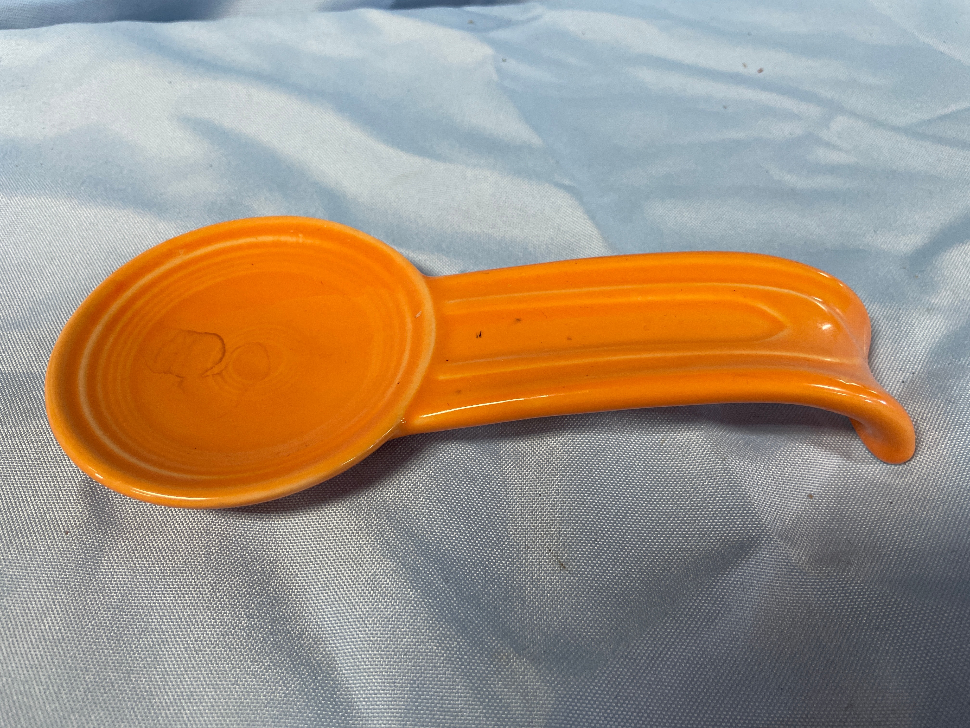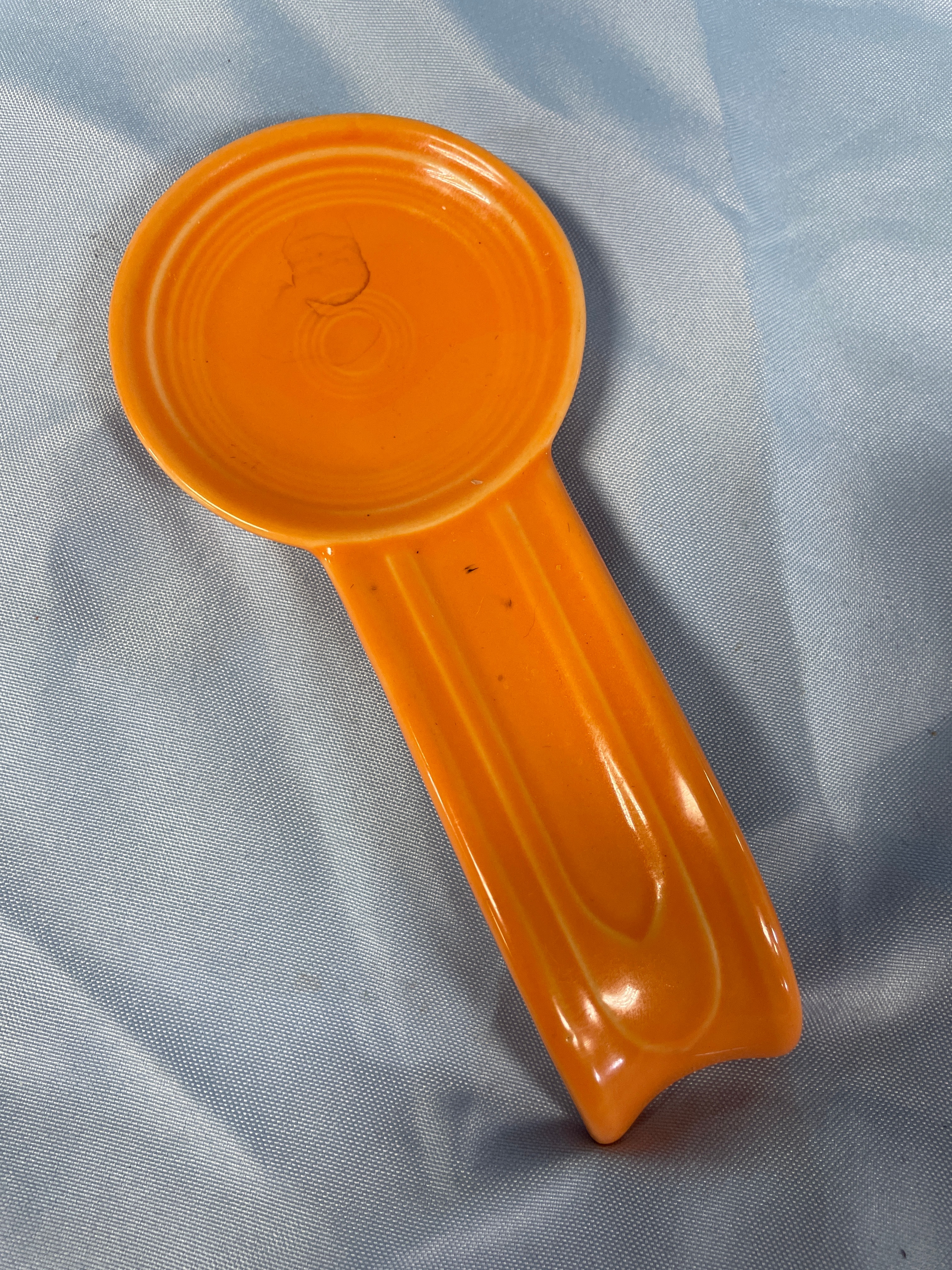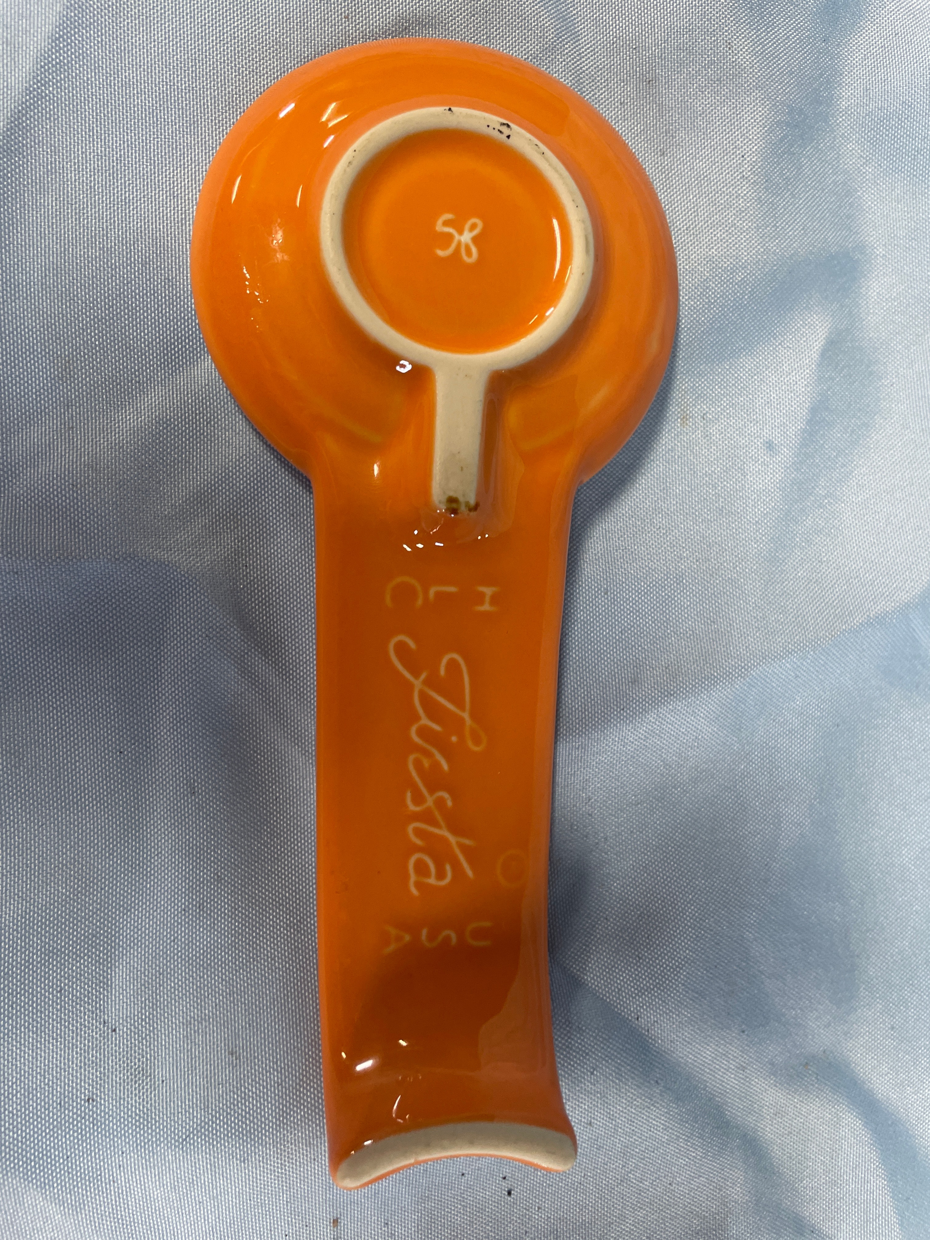 A Homer Laughlin Fiesta Butterscotch spoon rest. This ceramic spoon rest features a glossy orange glaze, a rounded bowl with concentric rings, and an elongated, slightly curved handle. The underside of the item is marked with molded text “HL C Co Fiesta USA” along the length of the handle. A handwritten number “58” is present within the unglazed ring on the underside of the bowl.