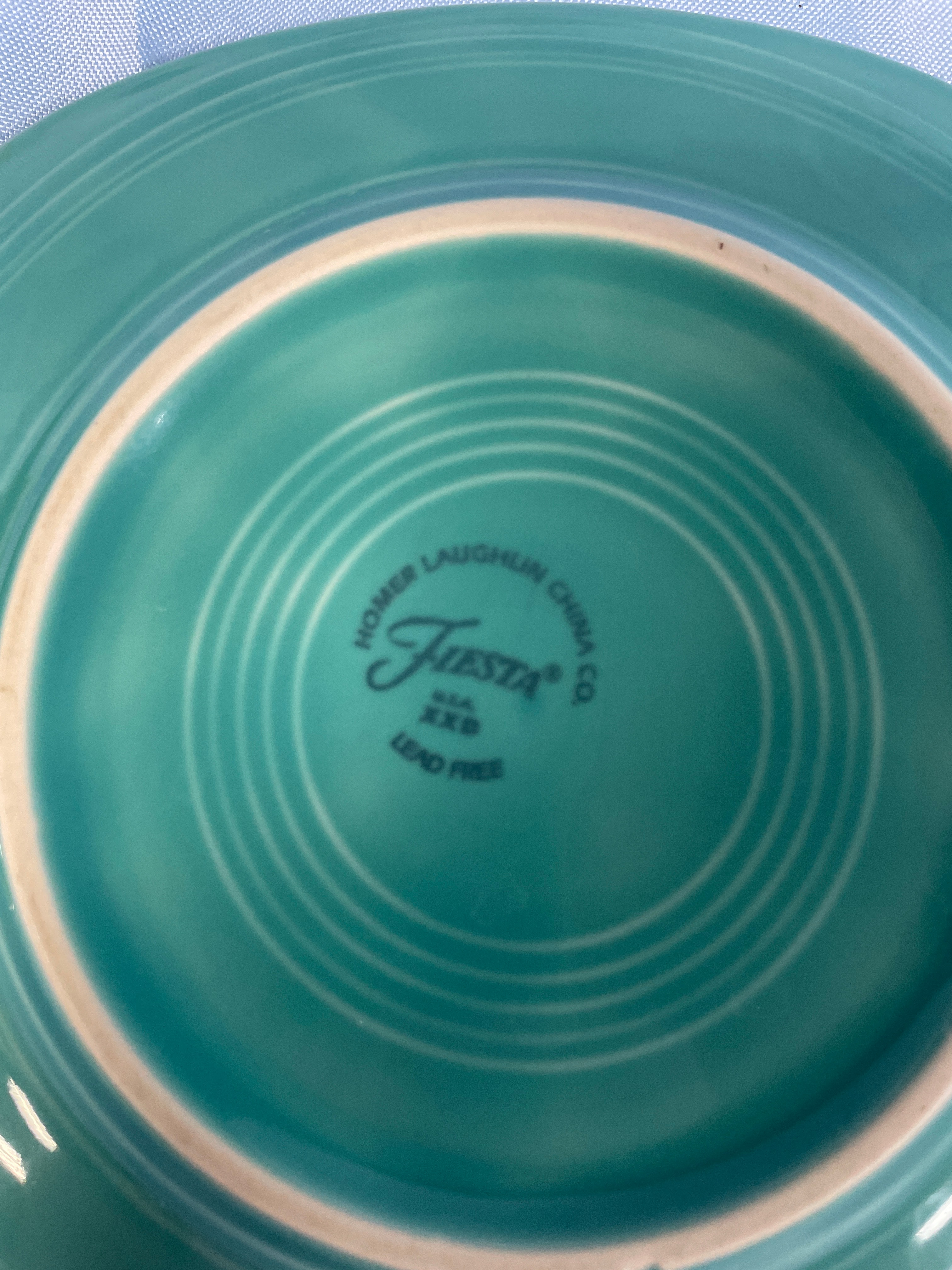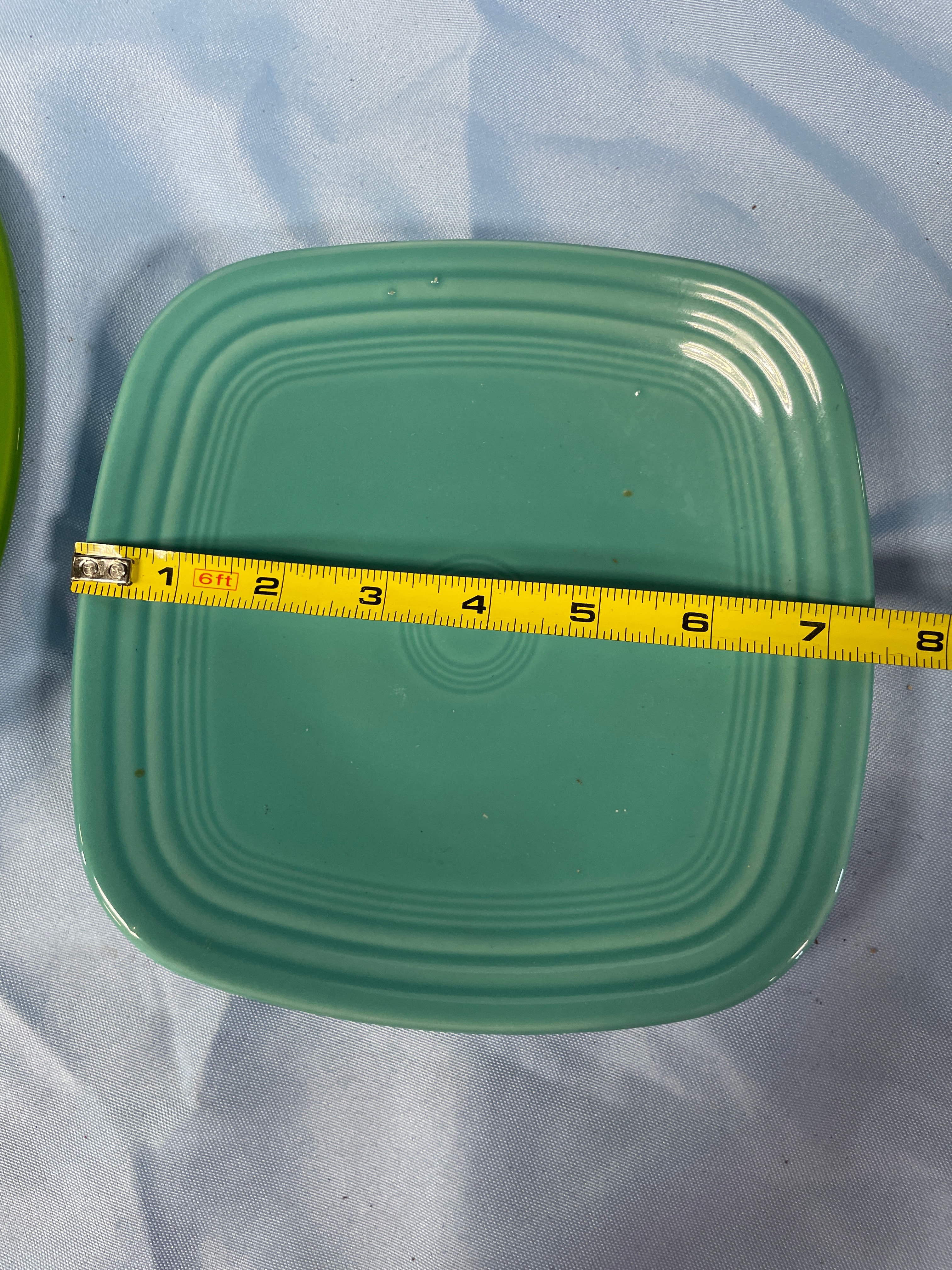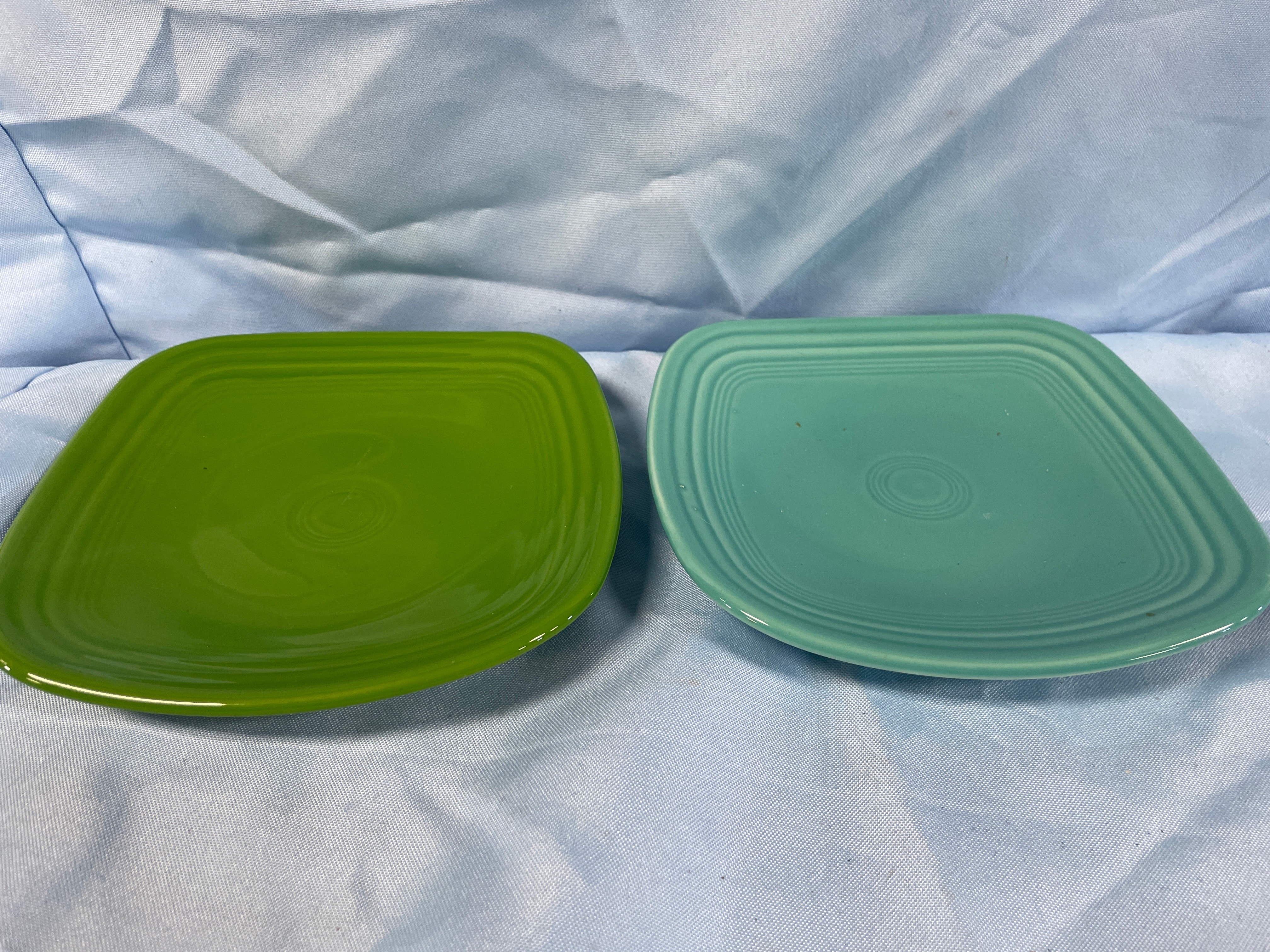 A pair of Homer Laughlin China Co. Fiesta square salad plates. One plate in Shamrock Green, the other in a teal hue. Each features rounded corners and a design with concentric rings in the center well. The reverse of both plates is clearly marked "HOMER LAUGHLIN CHINA CO.", "FIESTA", "U.S.A.", "XXB", and "LEAD FREE", indicating modern production.