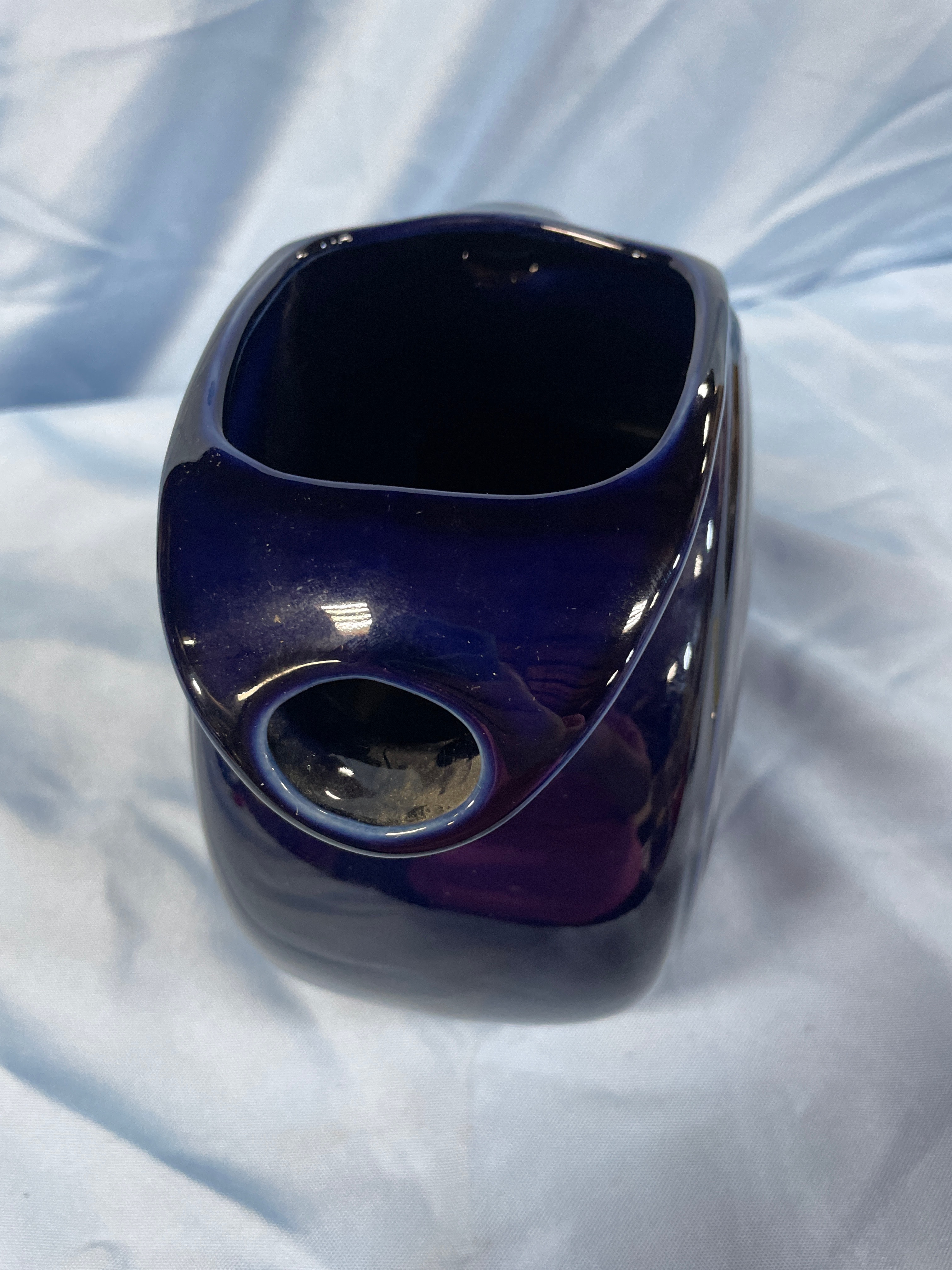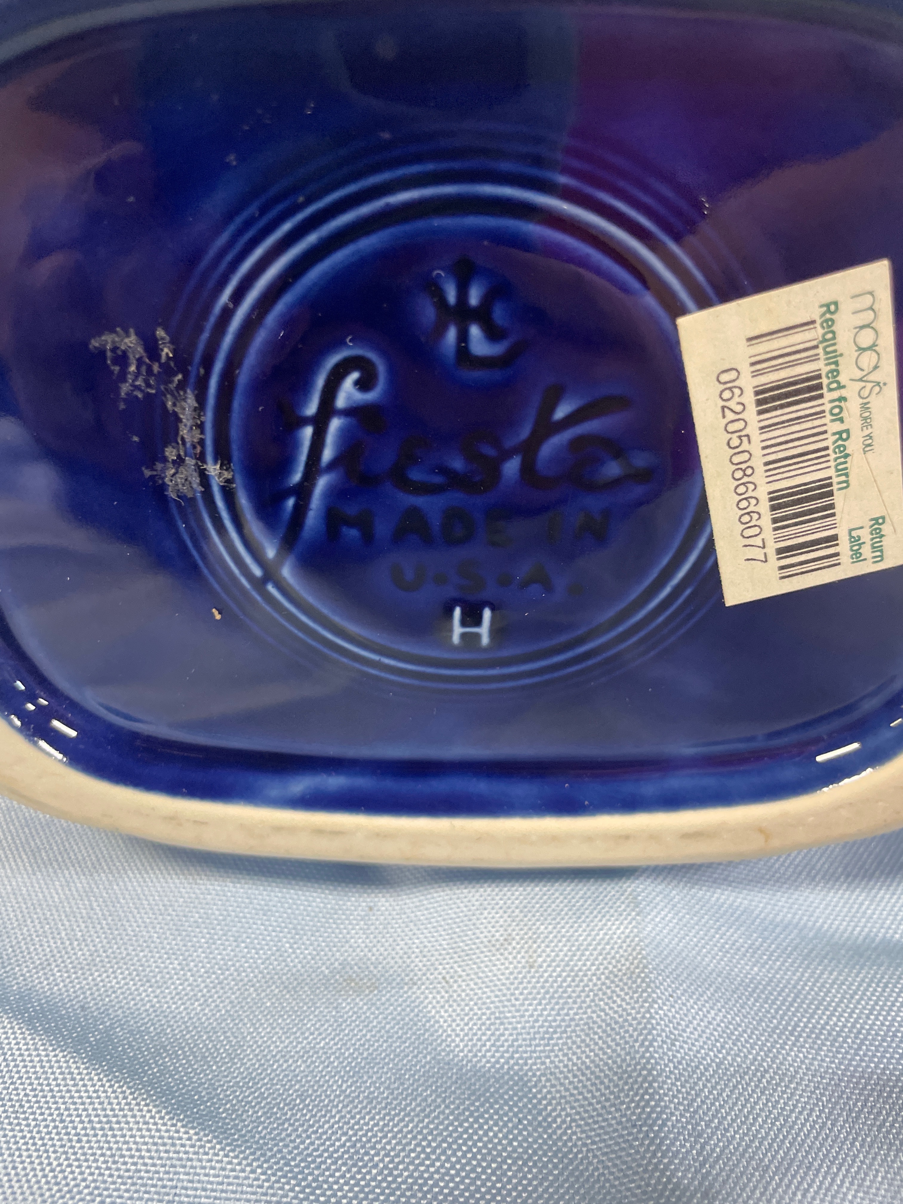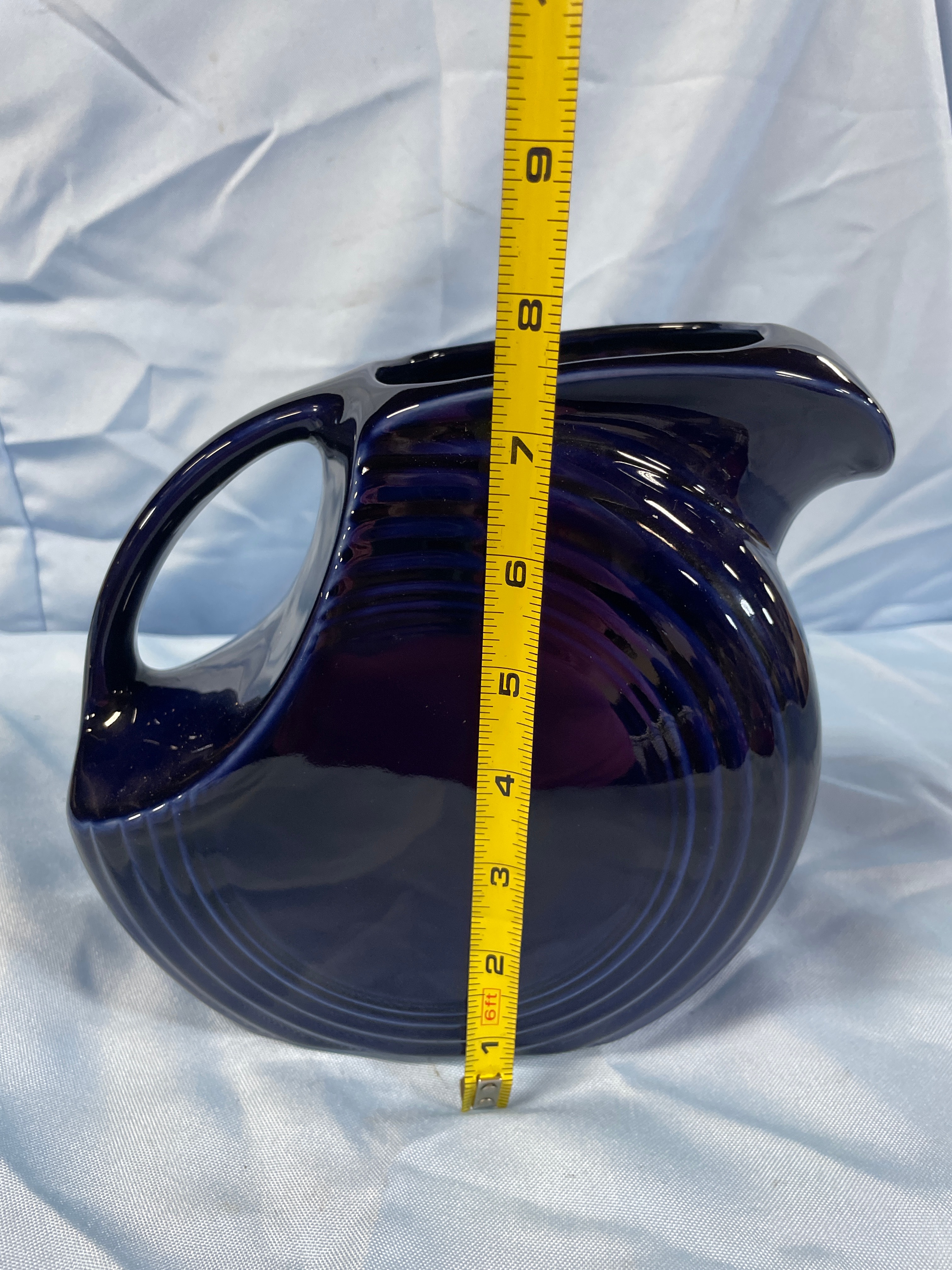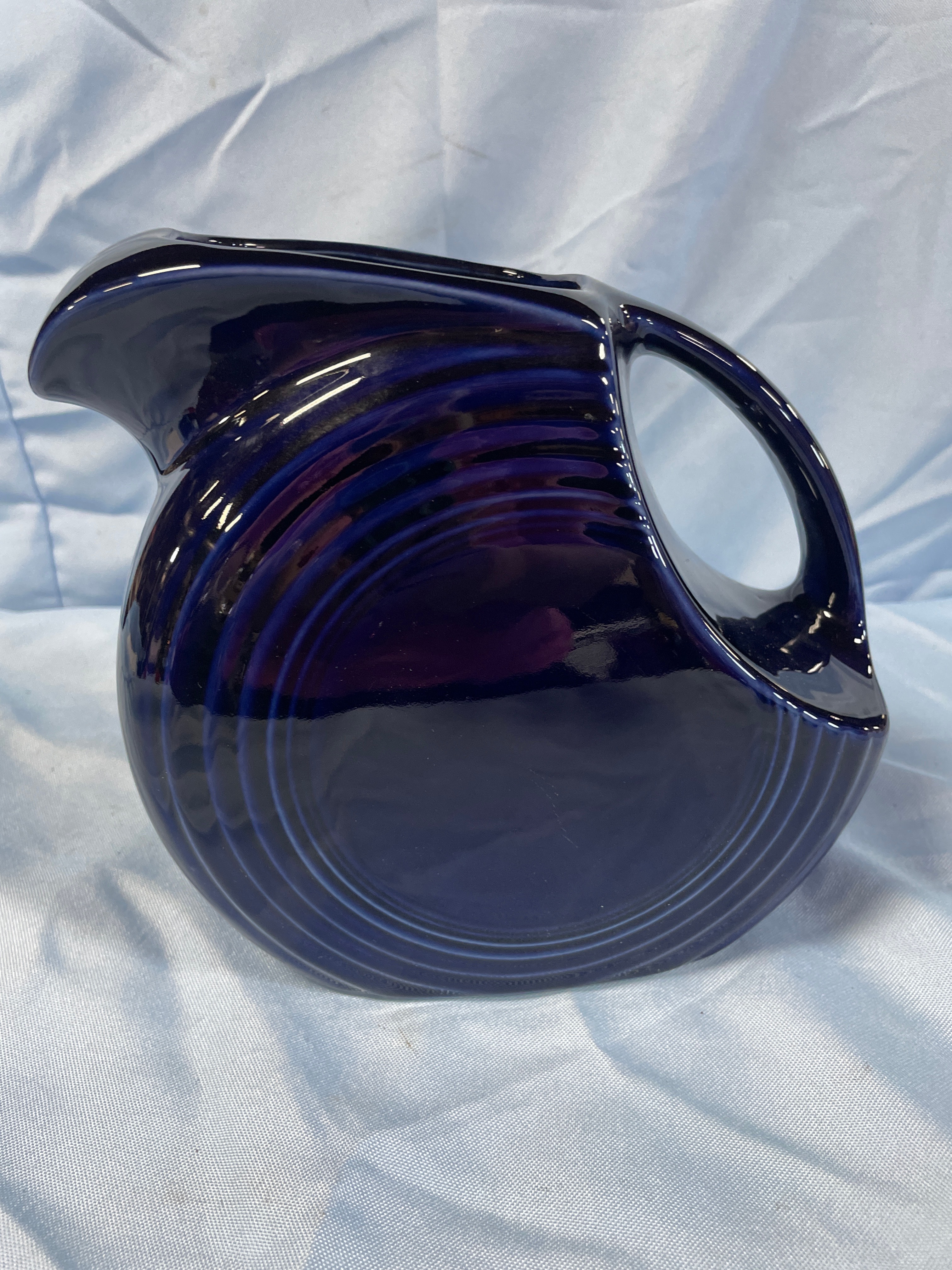 A Fiesta Cobalt Blue Disk Pitcher by Homer Laughlin. This ceramic pitcher features a glossy deep navy blue glaze, a rounded body, an integrated handle, and a pronounced spout with distinctive concentric ring decoration on its exterior. The base is clearly marked "Fiesta" in script, "MADE IN U.S.A., " and includes a stylized manufacturer’s mark for Homer Laughlin China Co. A retail sticker from Macy’s Home is present on the base.