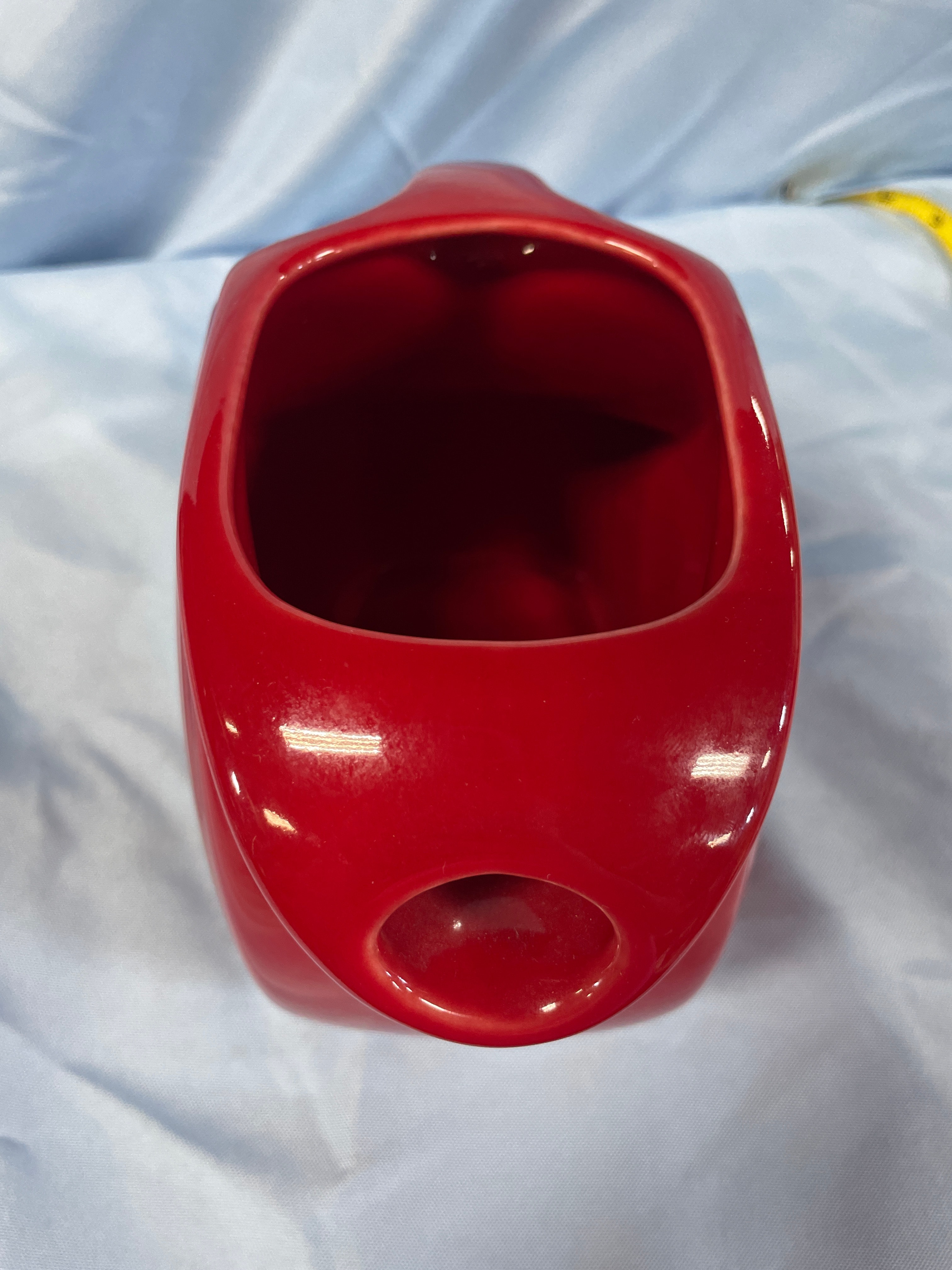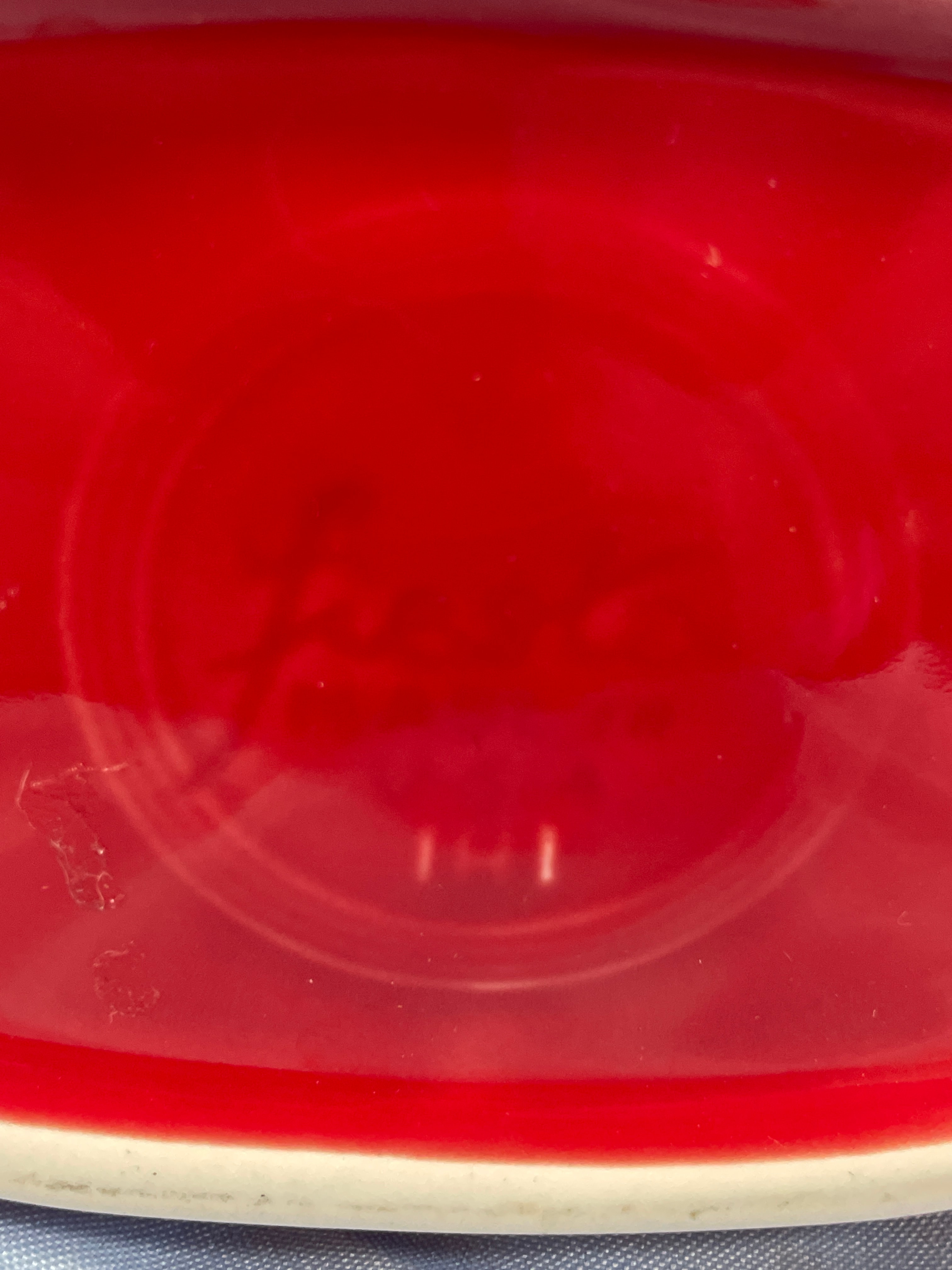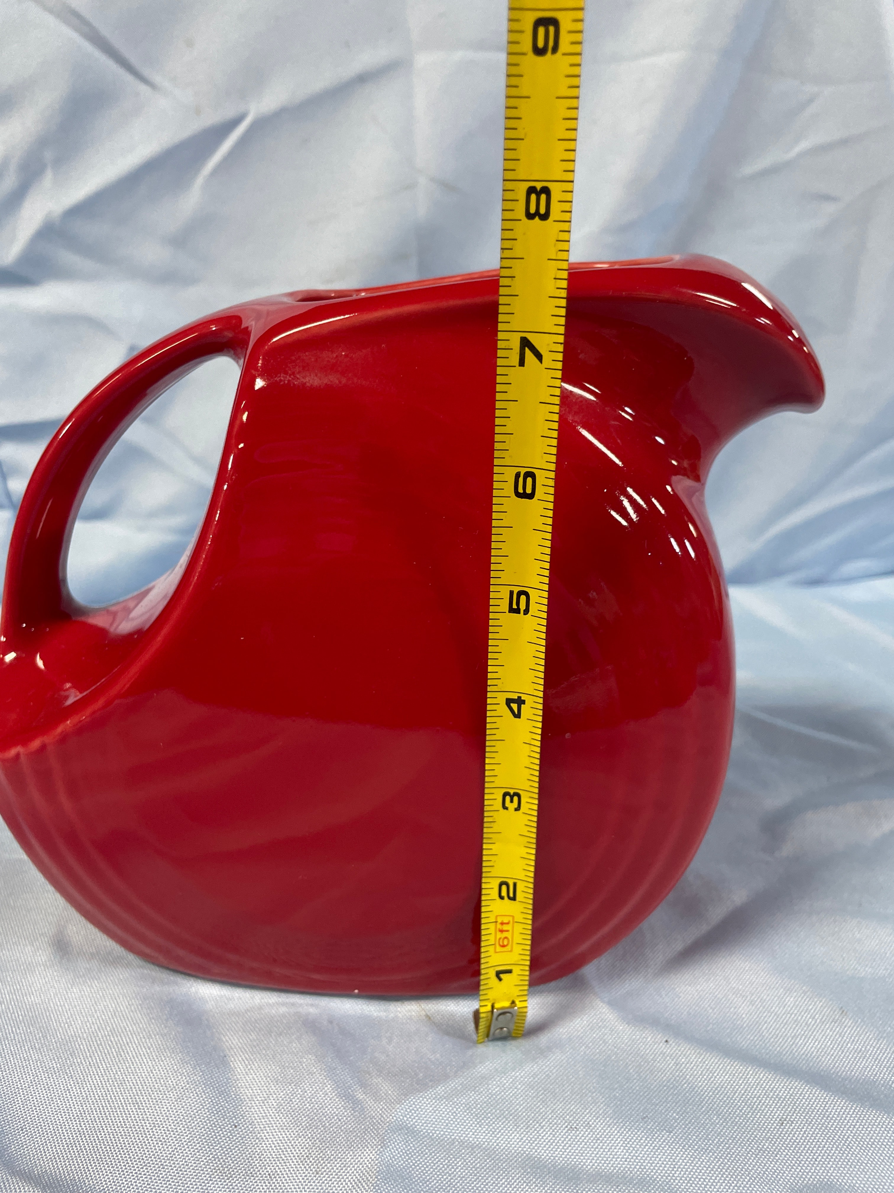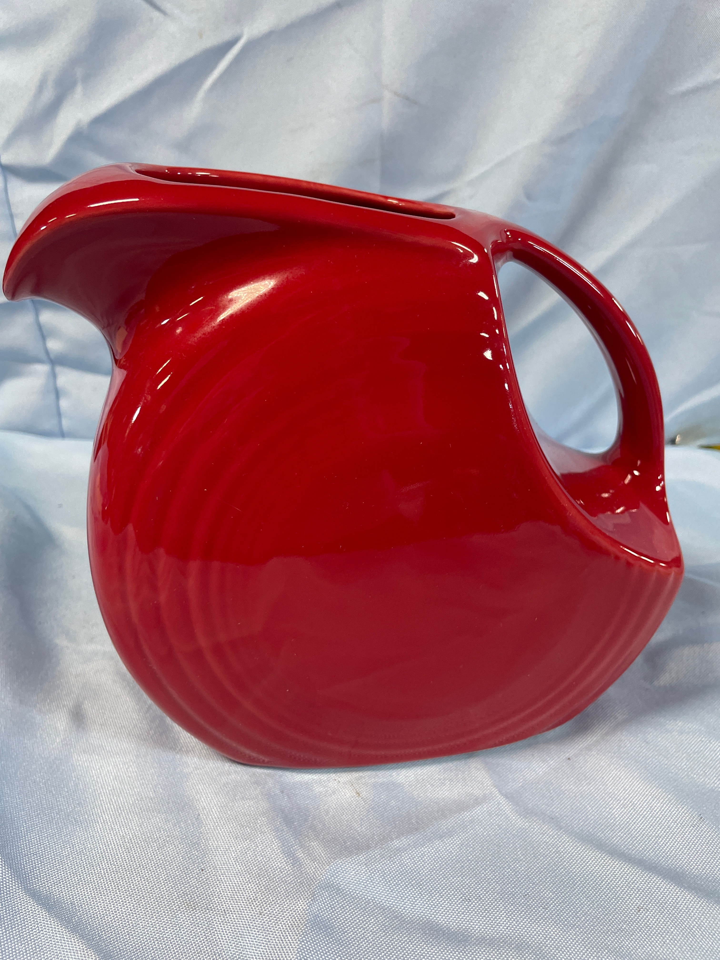A Fiesta Scarlet Red Large Disc Pitcher, crafted from glazed ceramic. This piece features a broad, integrated spout and a D-shaped handle, with the lower half of its body adorned by a series of concentric, horizontal ridges. Both the exterior and interior are coated in a glossy, solid red glaze. Faint, raised numbers or symbols, possibly "141," are discernible on the interior base, likely indicating a mold or factory mark.
