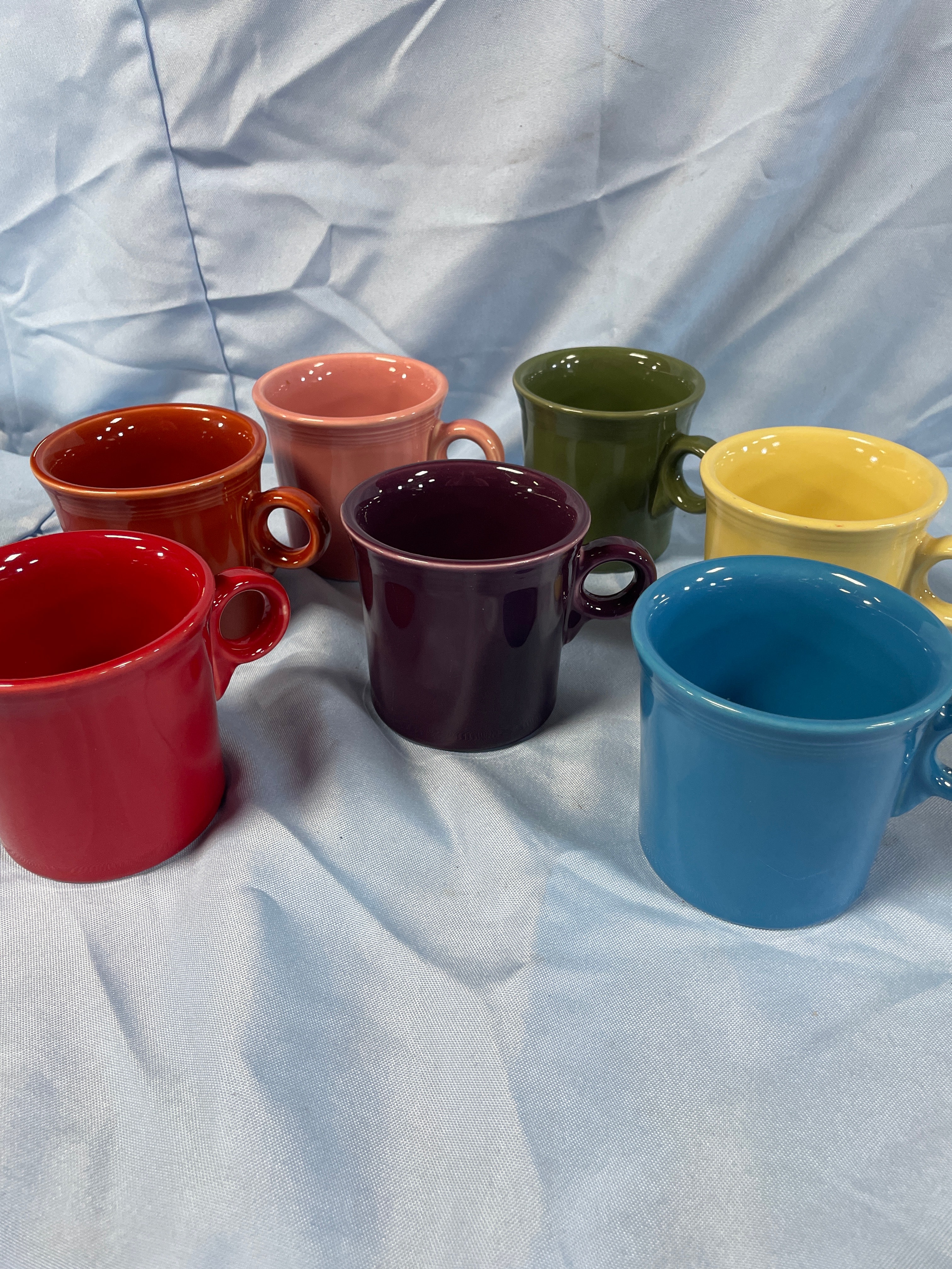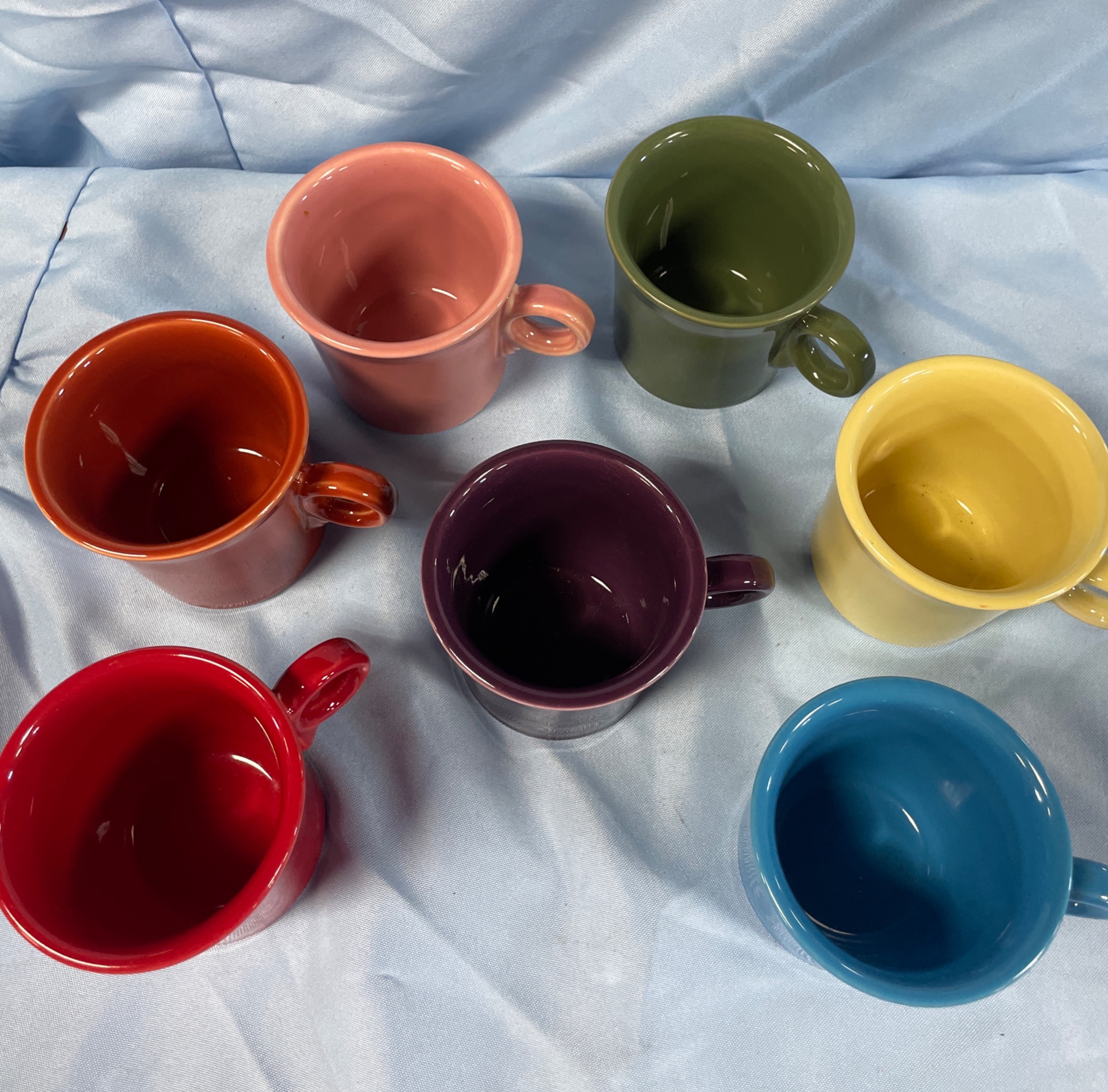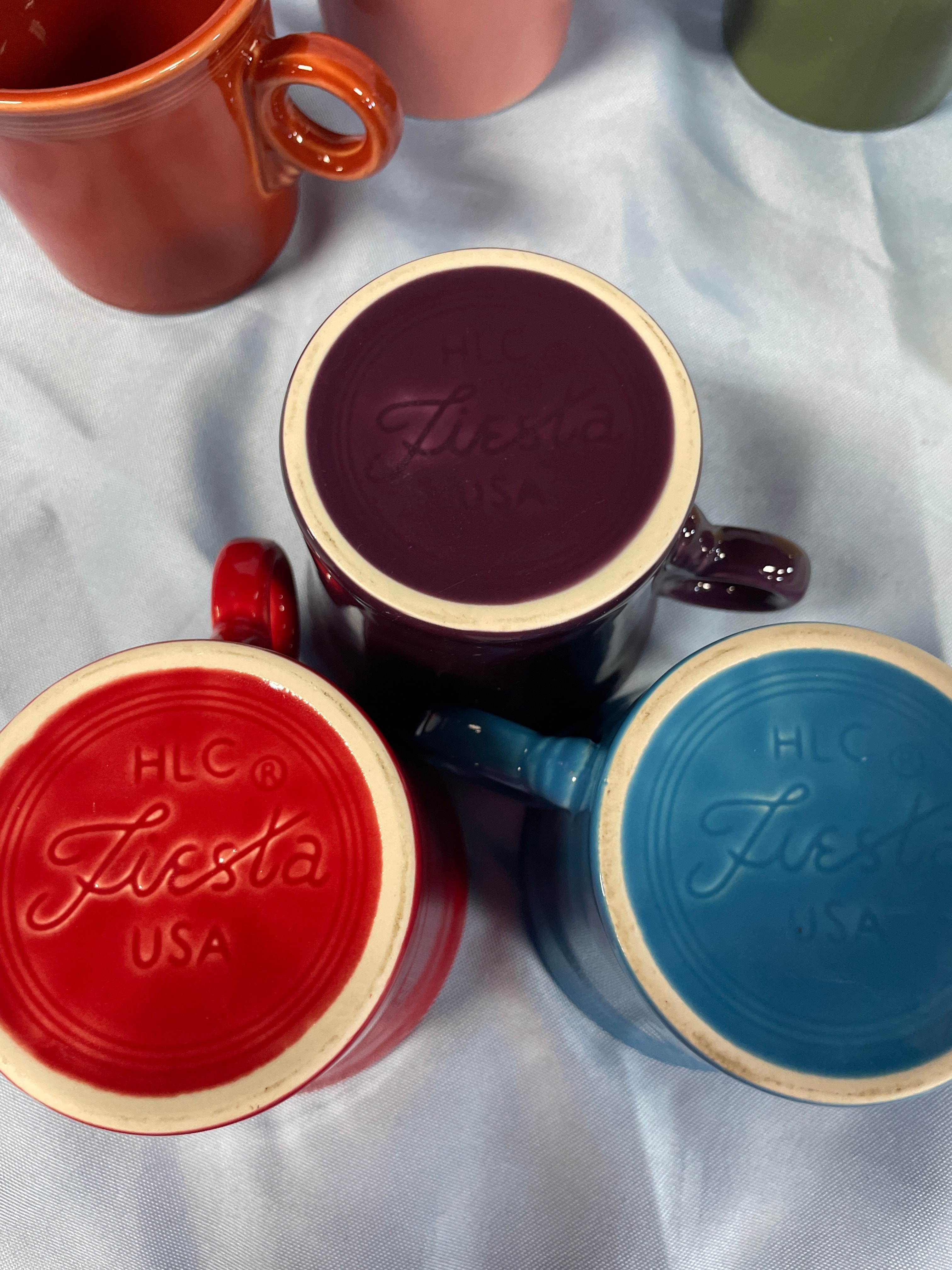 A set of seven Fiesta Homer Laughlin China (HLC) ceramic coffee mugs. Each mug features a classic, sturdy cylindrical form with a prominent C-handle and is finished with a glossy glaze. The collection includes a vibrant assortment of solid colors: red, orange, pink, purple, olive green, yellow, and blue. The undersides of several mugs bear a clear, embossed mark reading ‘HLC ® Fiesta USA’ in a cursive script, indicating manufacture in the United States of America.