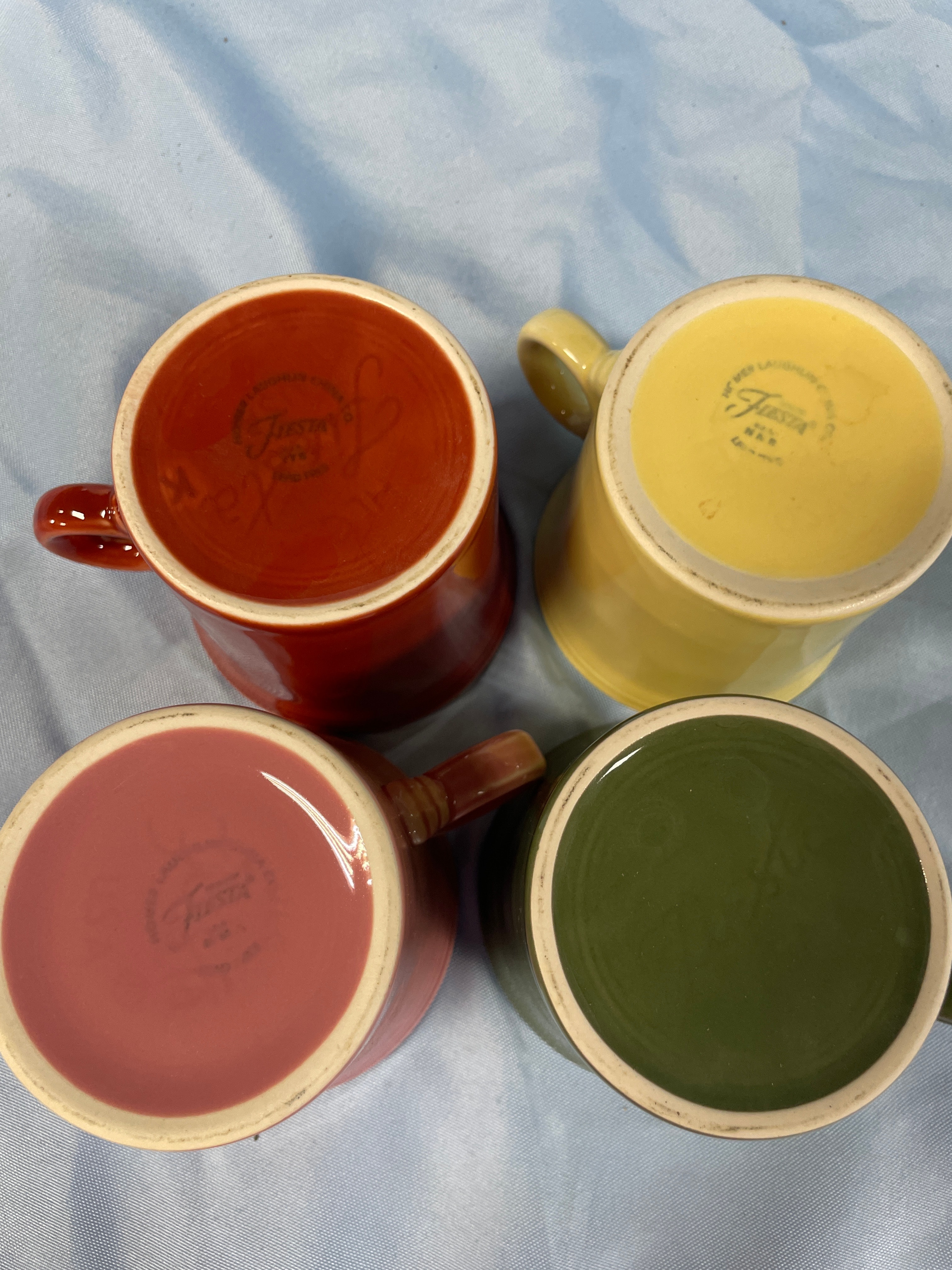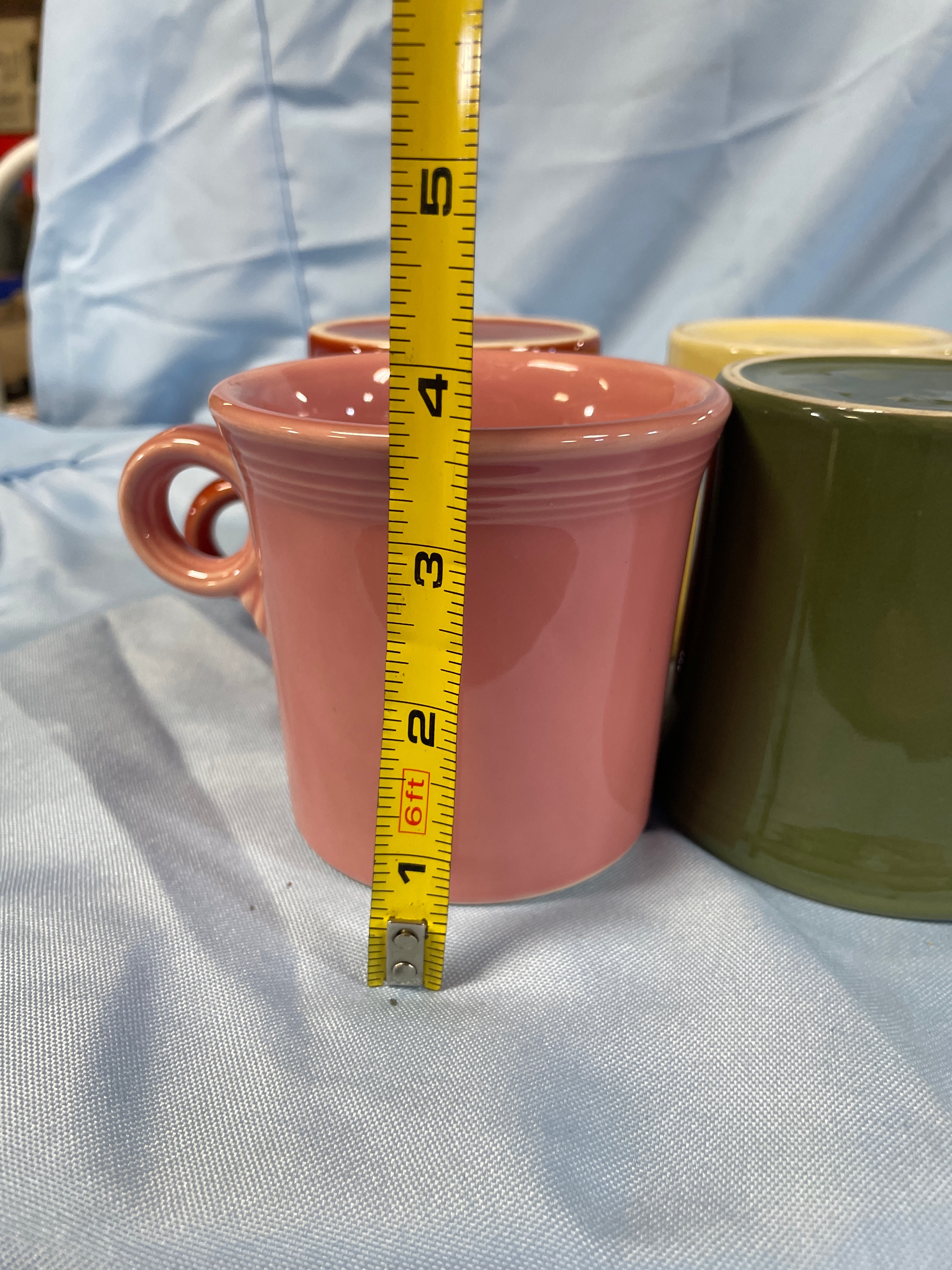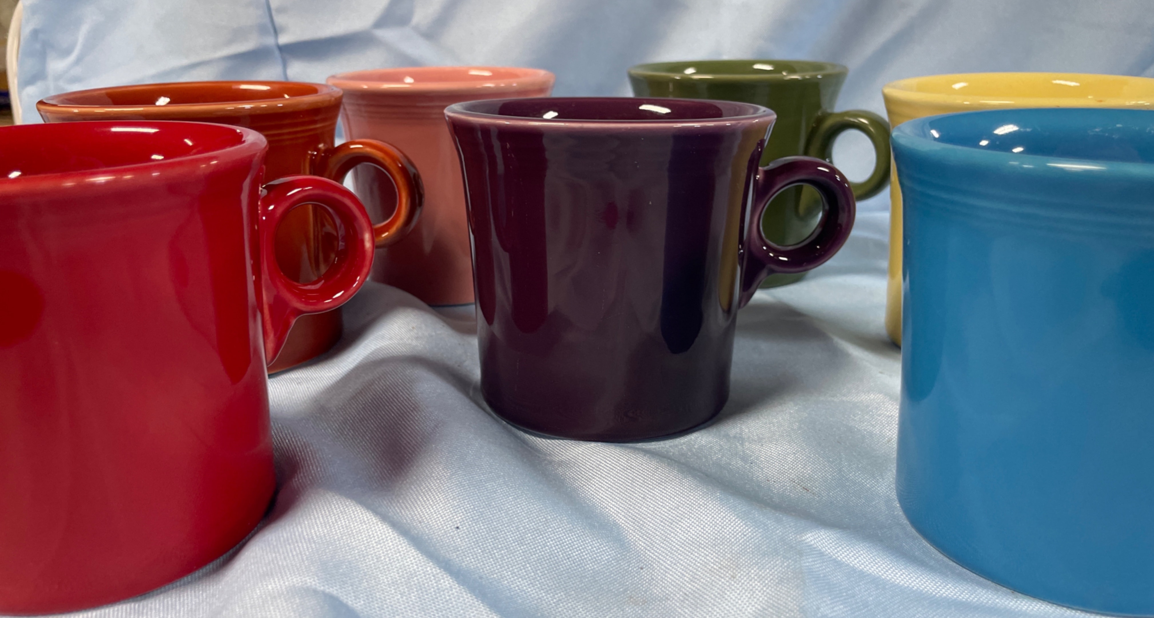 A set of seven Fiesta Homer Laughlin China (HLC) ceramic coffee mugs. Each mug features a classic, sturdy cylindrical form with a prominent C-handle and is finished with a glossy glaze. The collection includes a vibrant assortment of solid colors: red, orange, pink, purple, olive green, yellow, and blue. The undersides of several mugs bear a clear, embossed mark reading ‘HLC ® Fiesta USA’ in a cursive script, indicating manufacture in the United States of America.