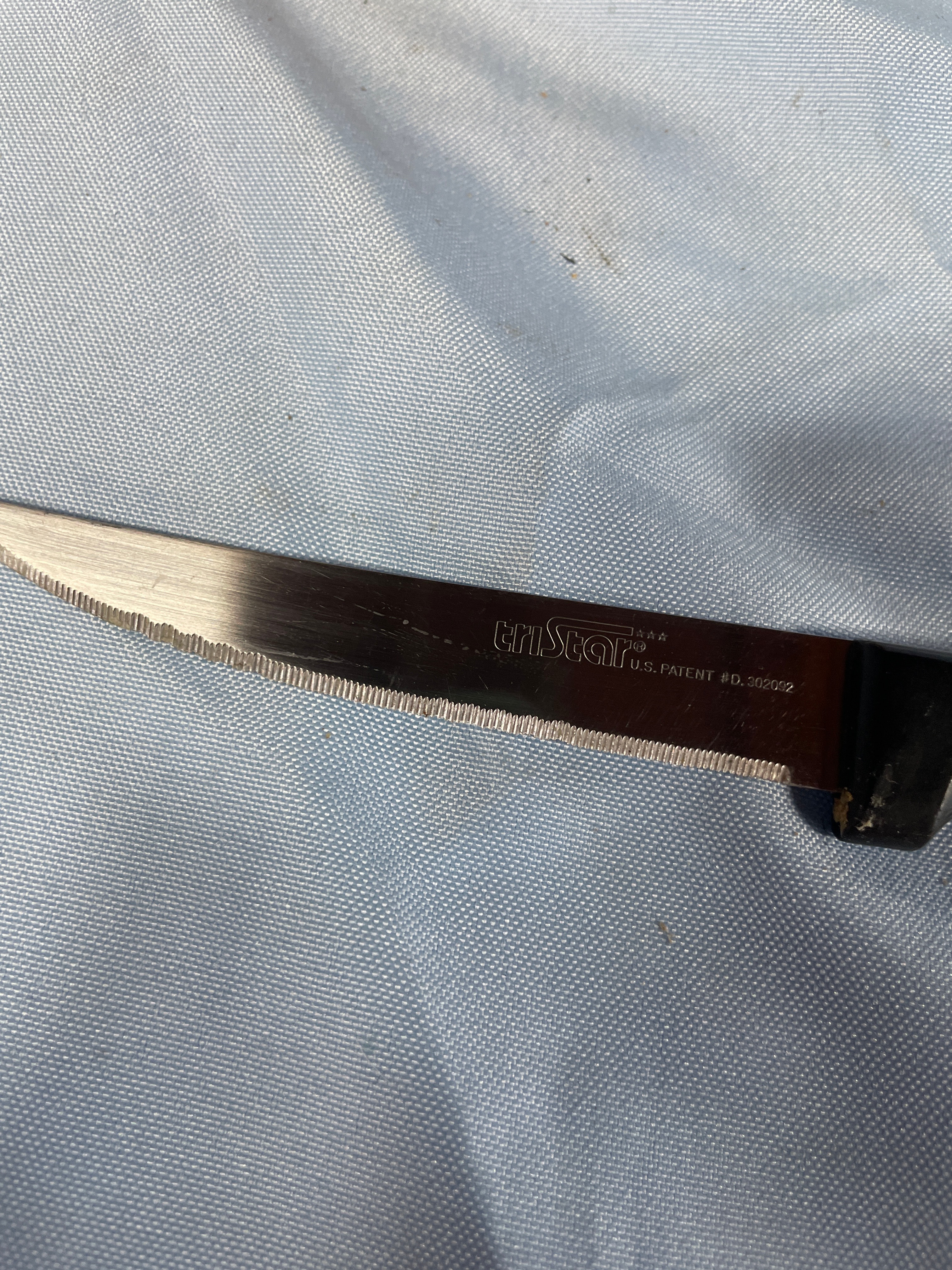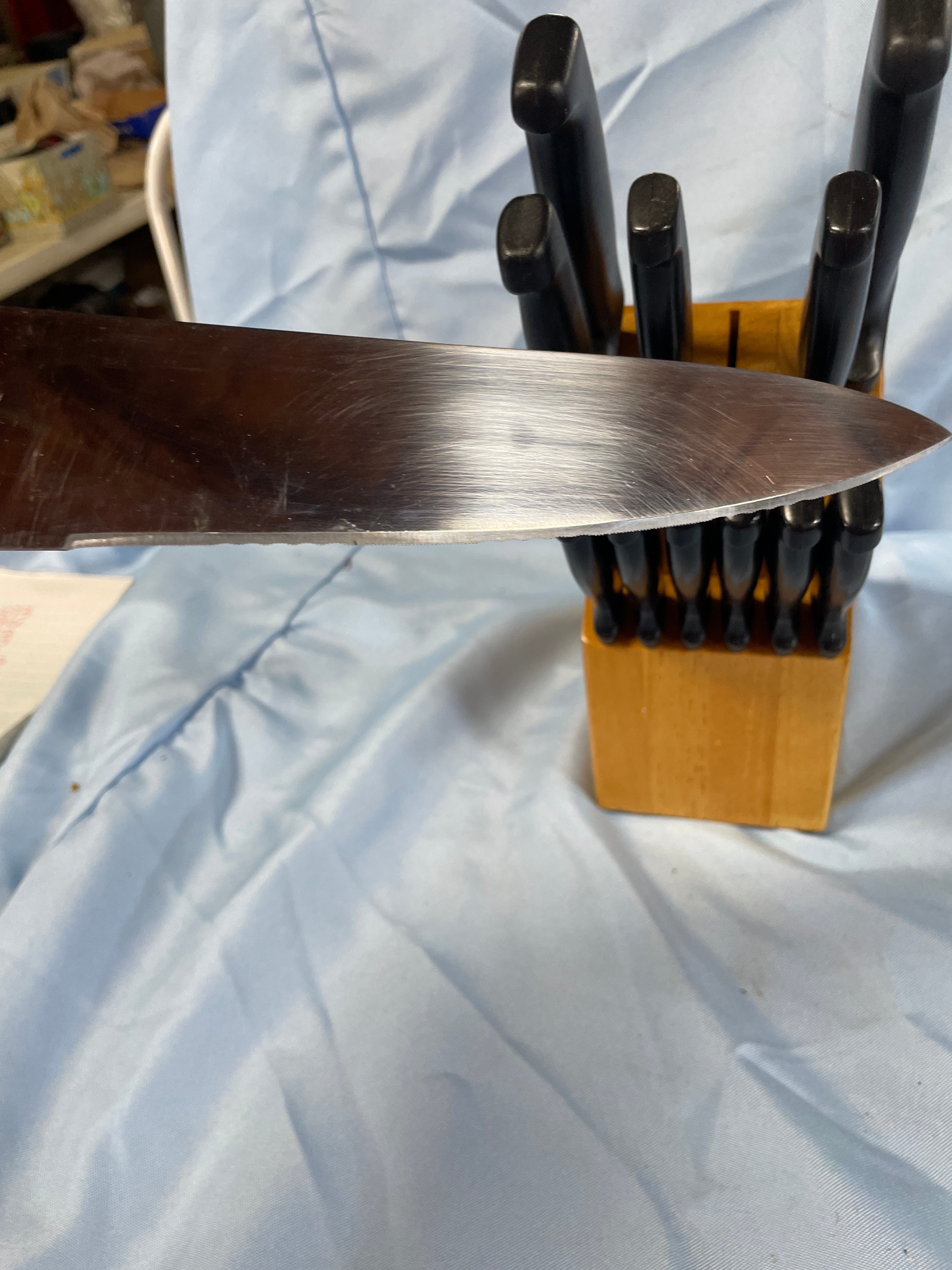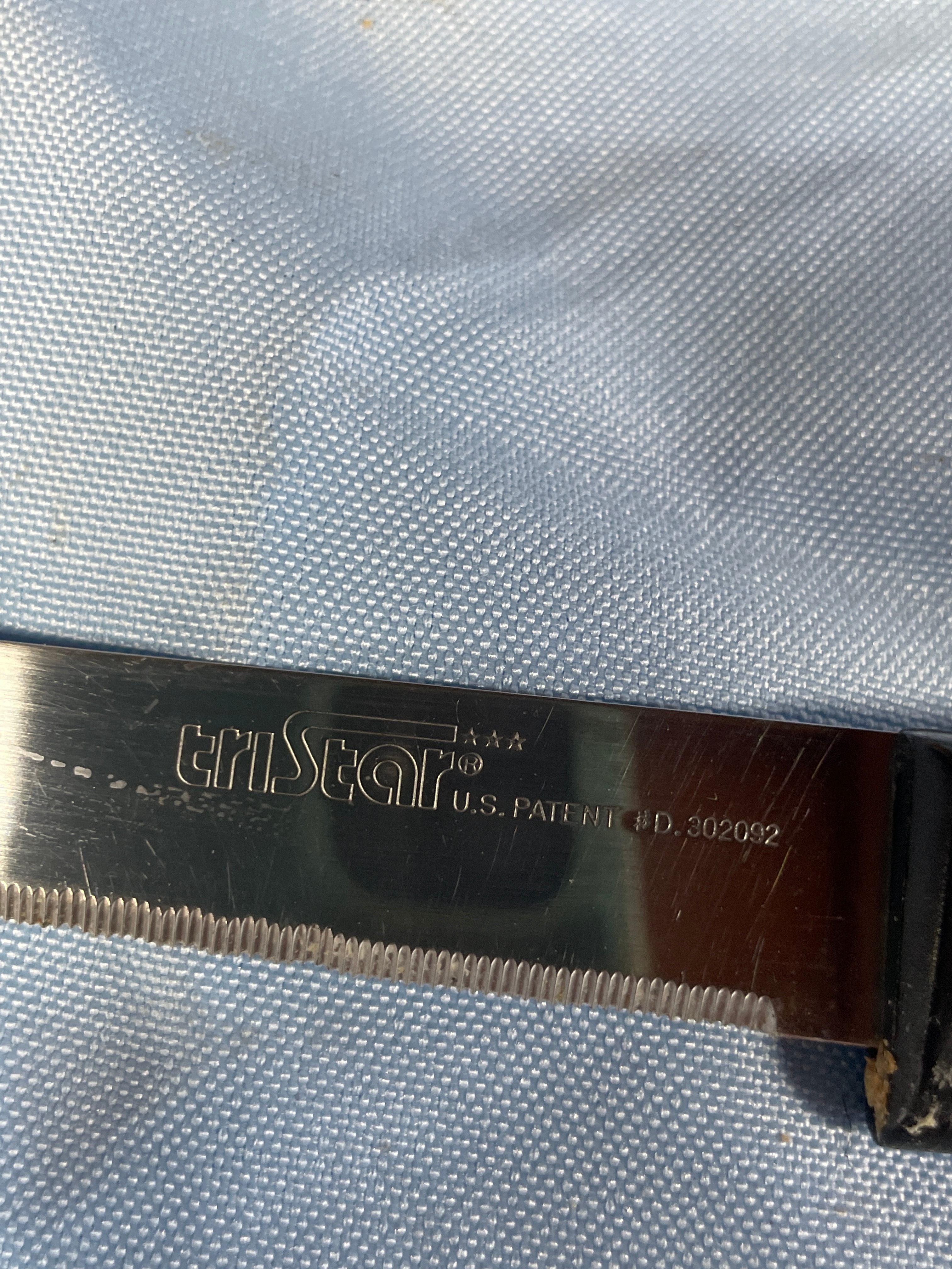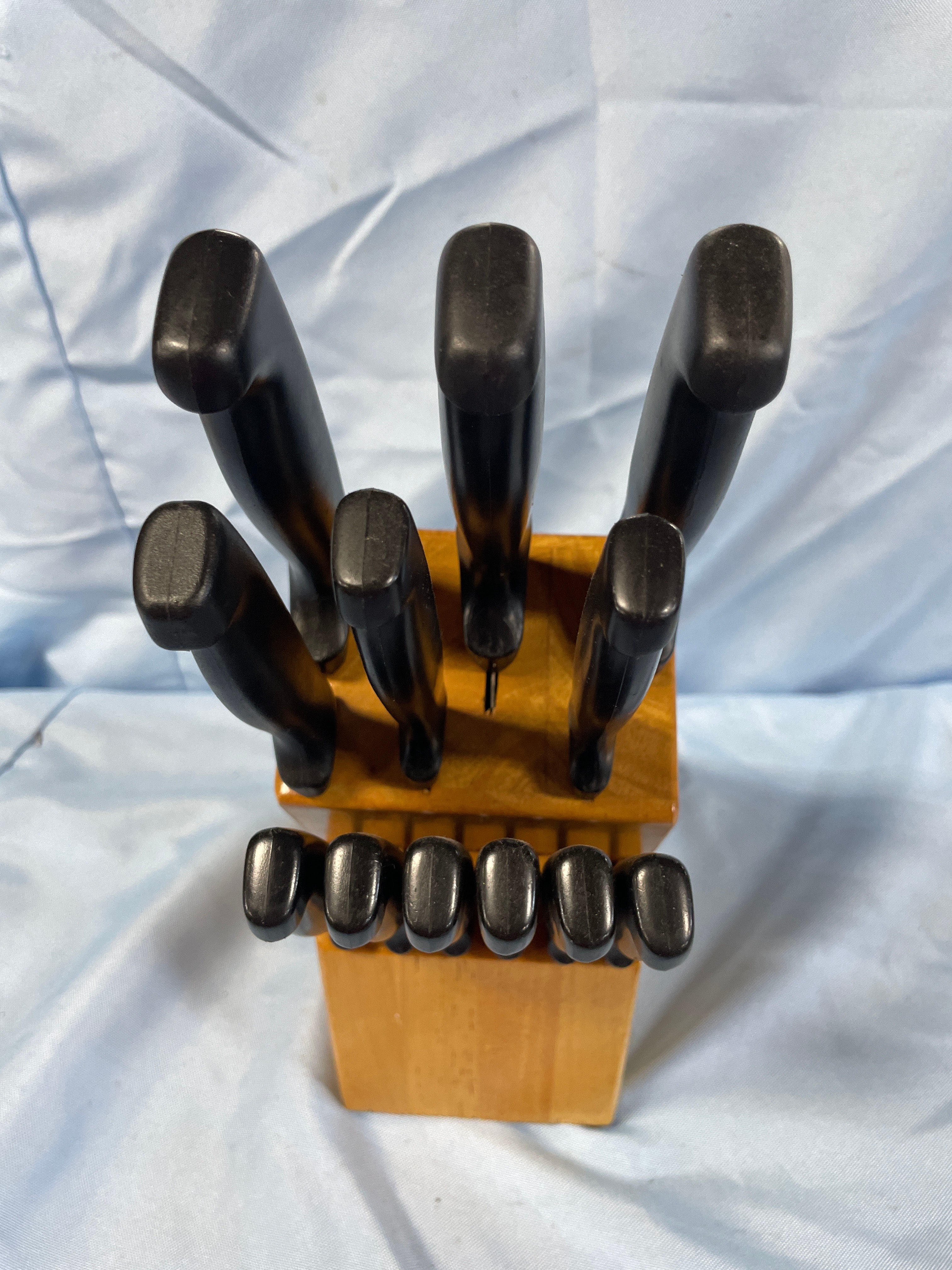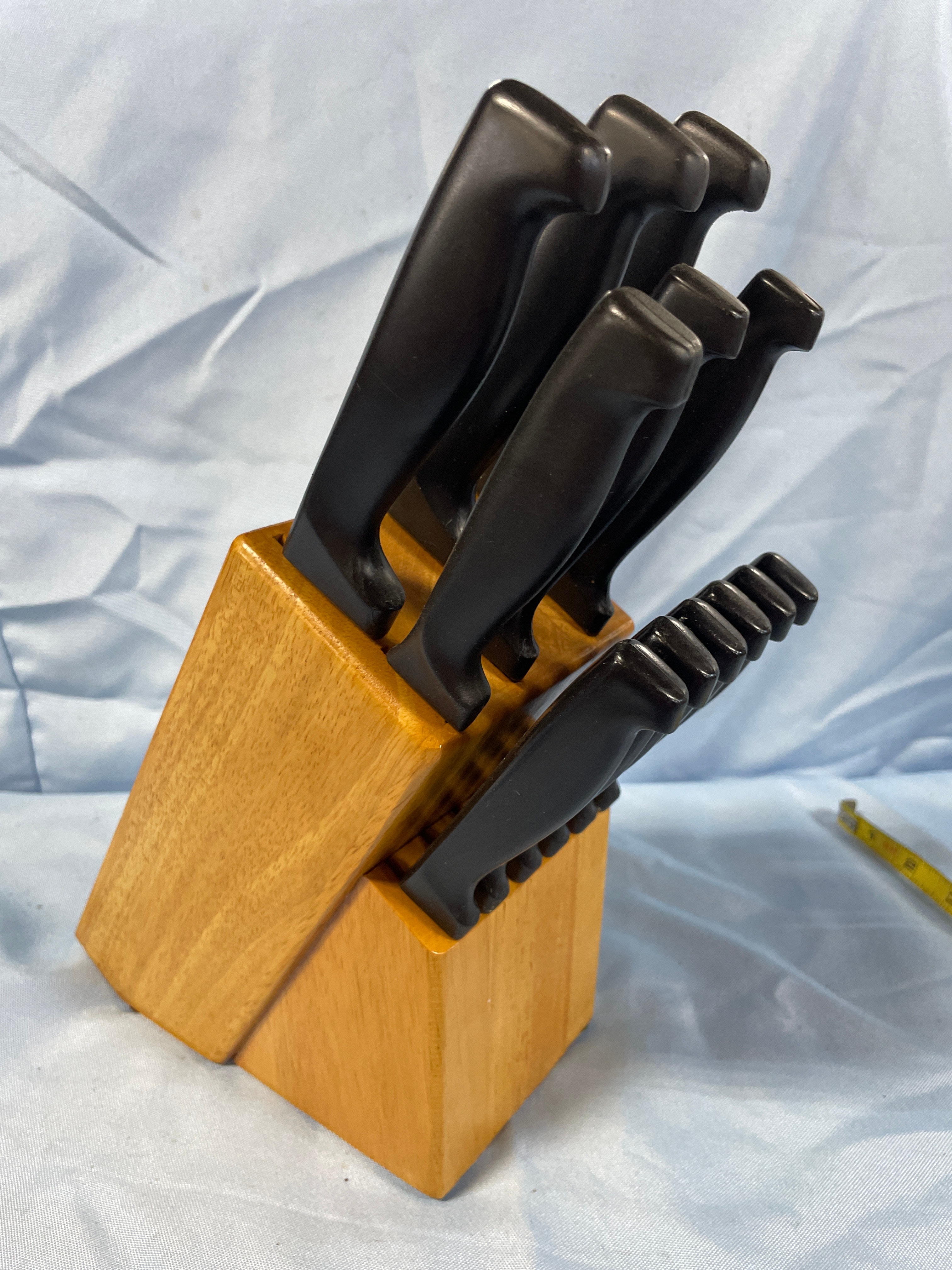 A thirteen-piece contemporary kitchen knife block set, comprising a light-colored wooden block holding a variety of knives. The knives are fitted with black plastic or composite handles and polished stainless steel blades. One knife blade is clearly marked ‘triStar®’ alongside three stars and ‘U.S. PATENT # D. 302092.’