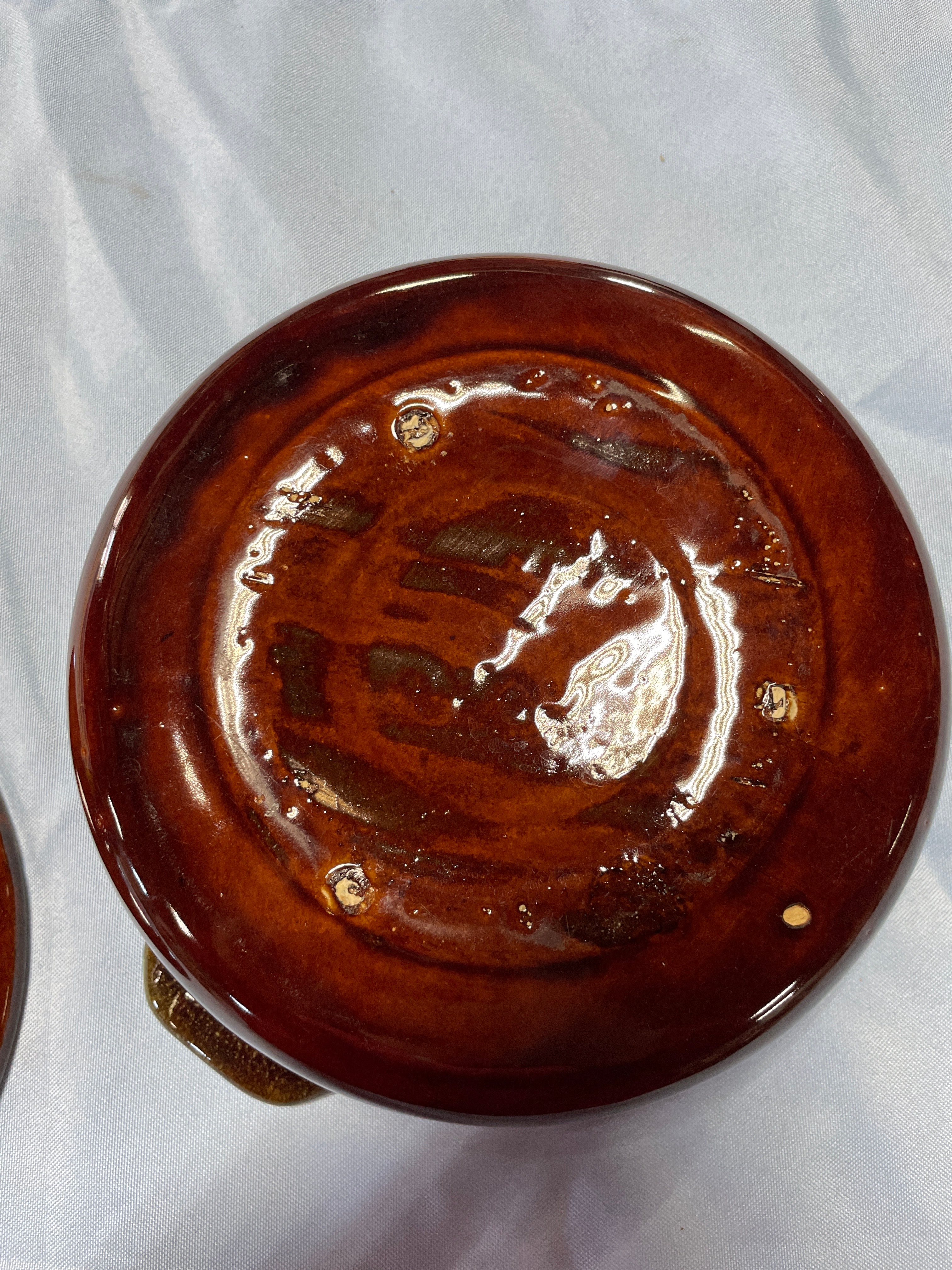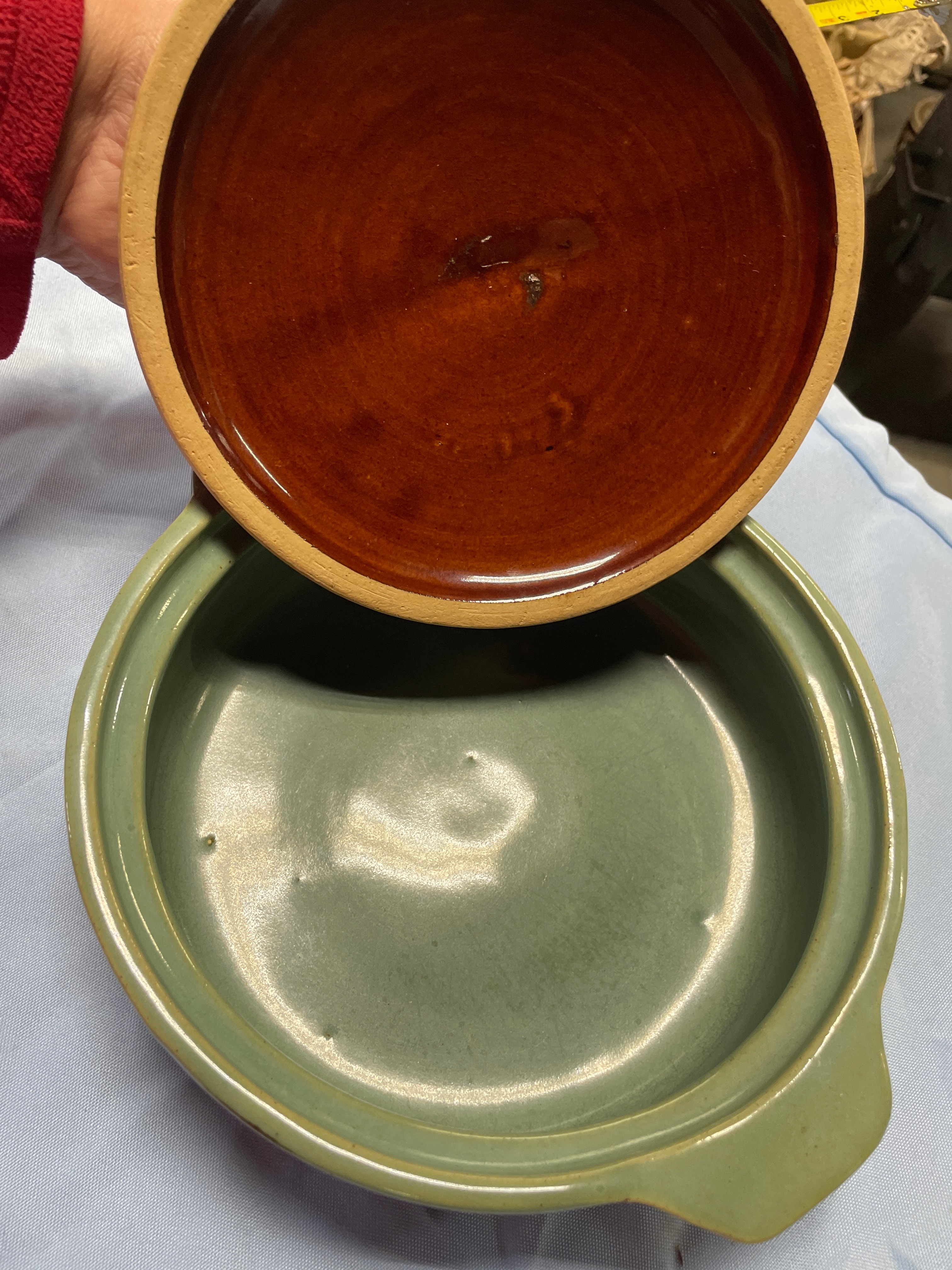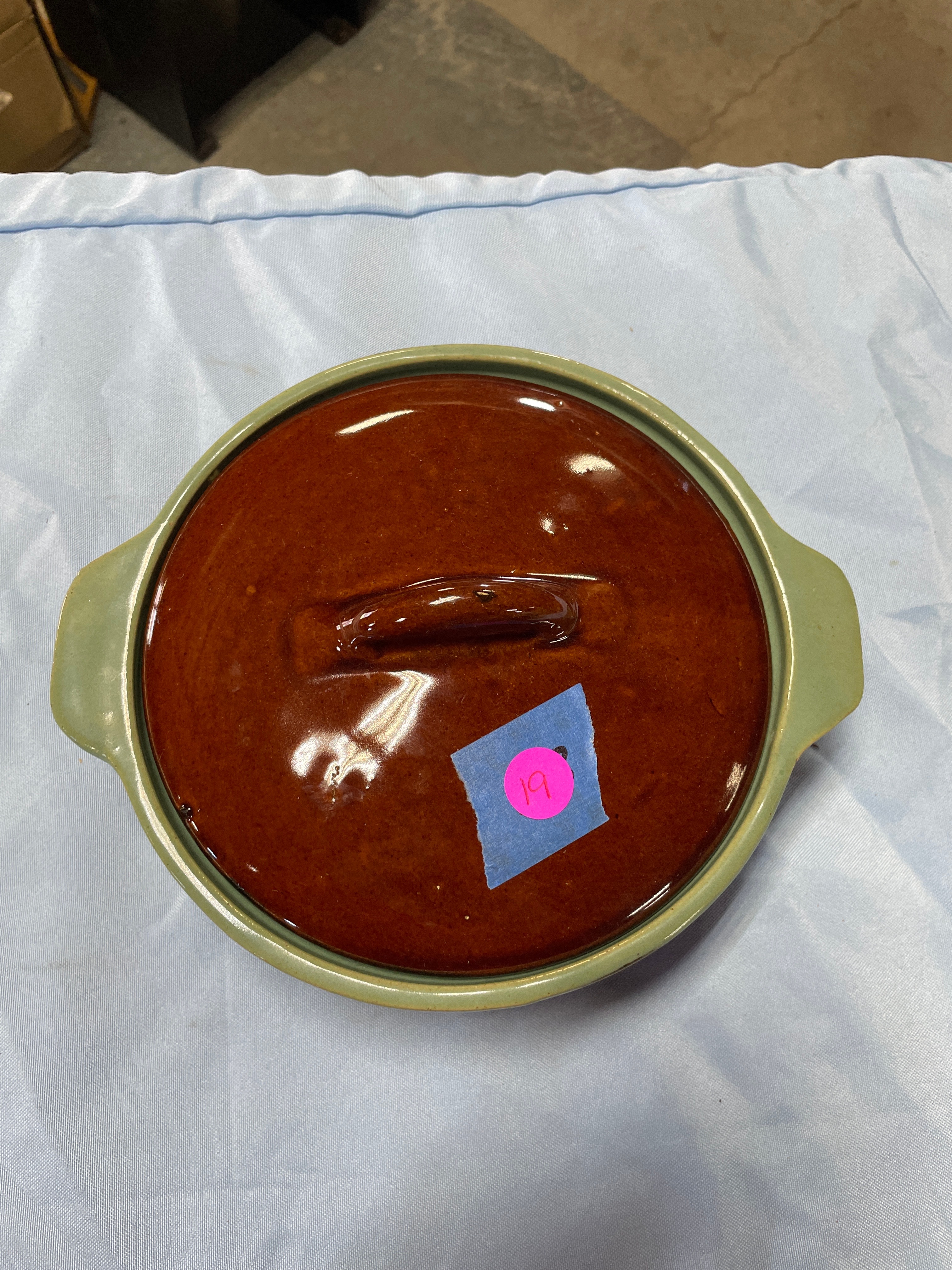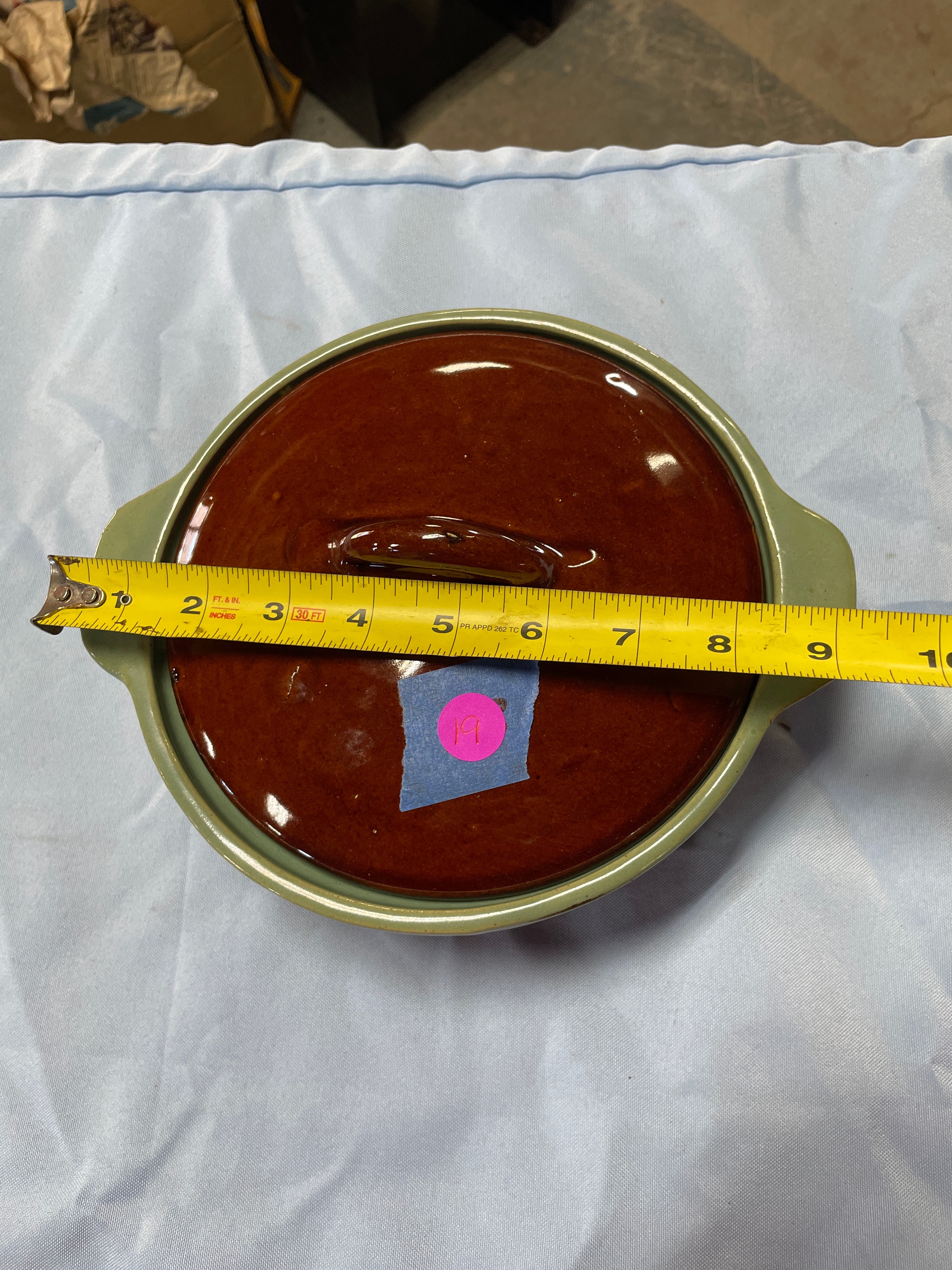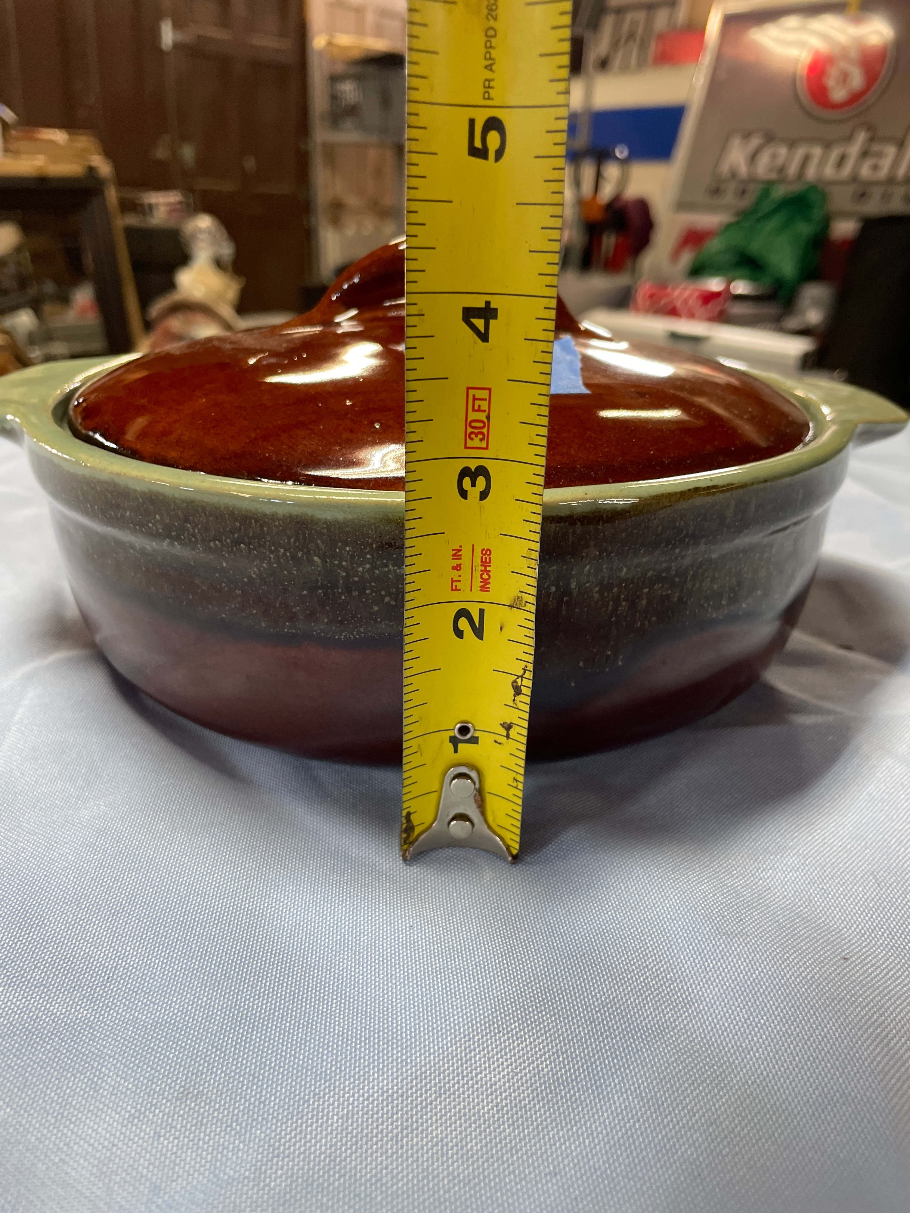 A ceramic Country Fare covered casserole dish with reddish-brown body, dark drip glaze, light green rim and handles, and a glossy reddish-brown lid, measuring approximately 4.5 inches high and 9.5 inches wide.