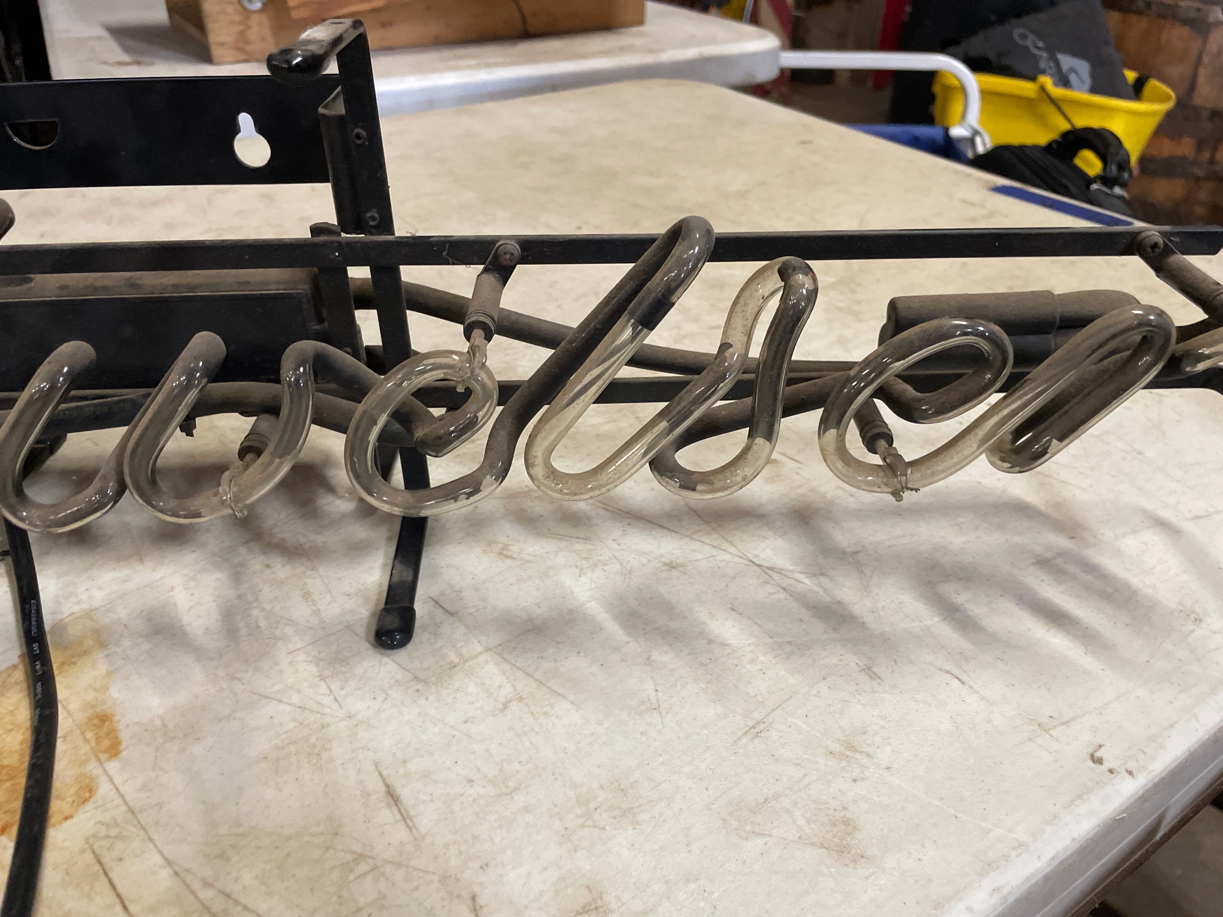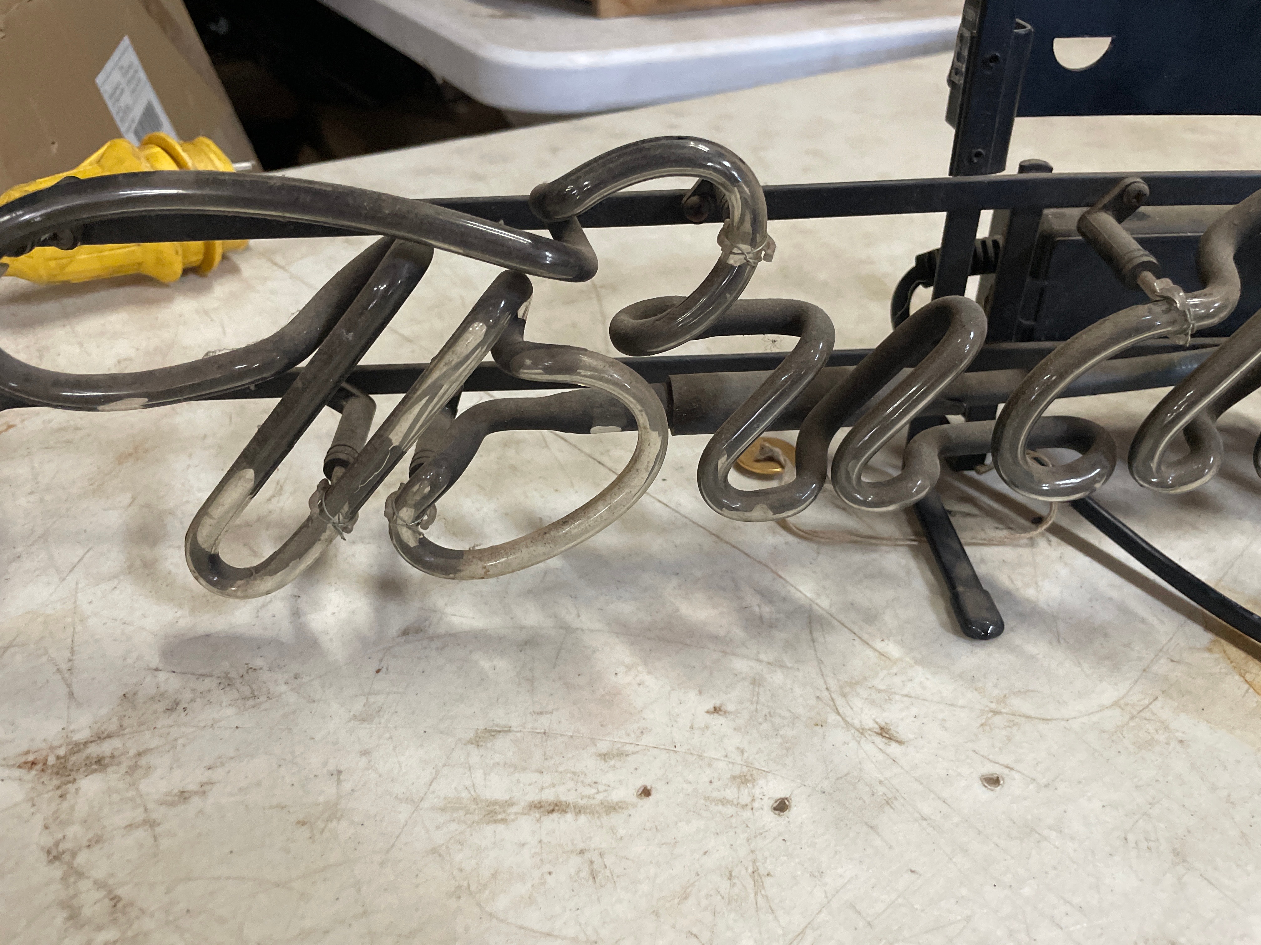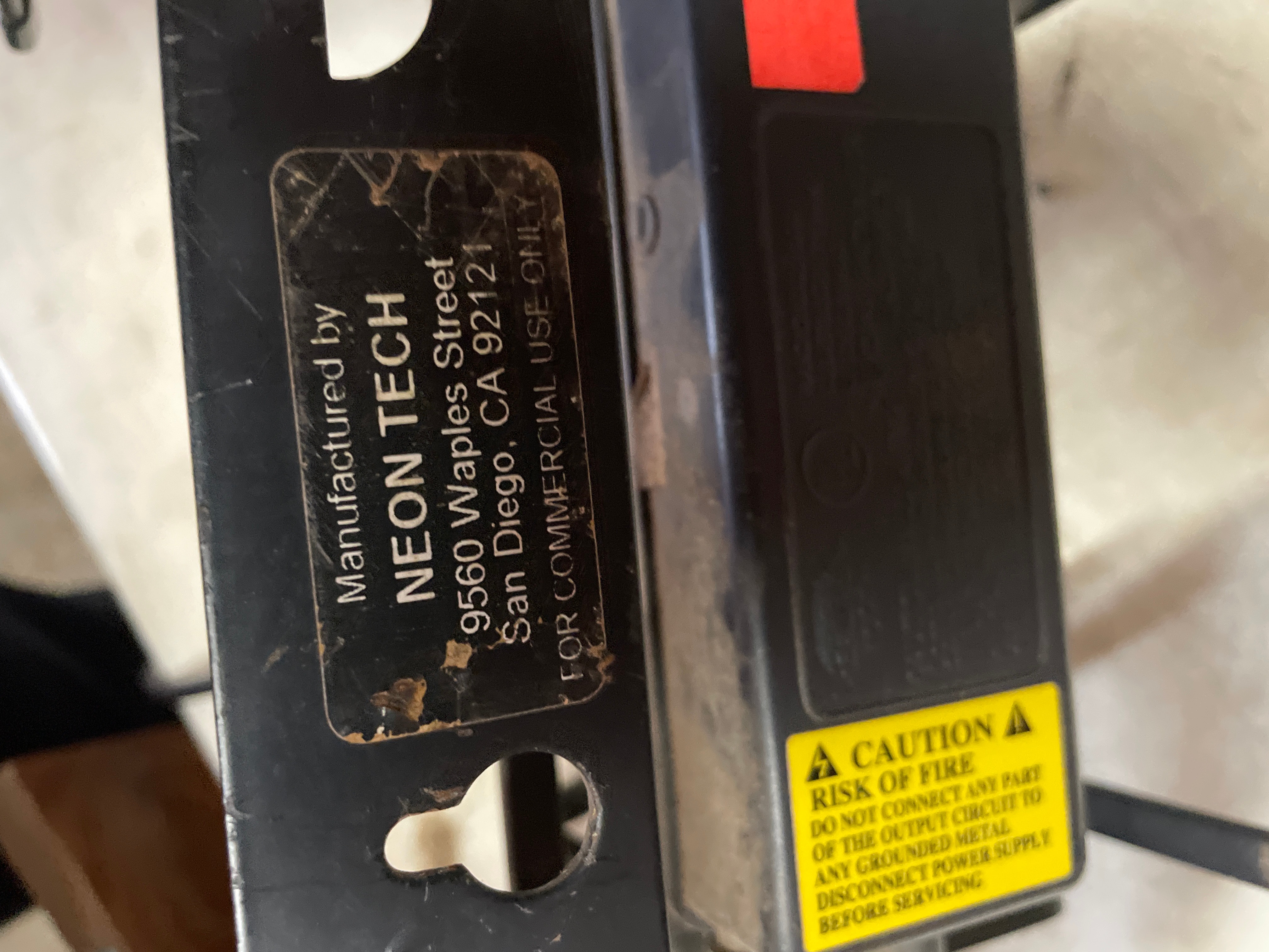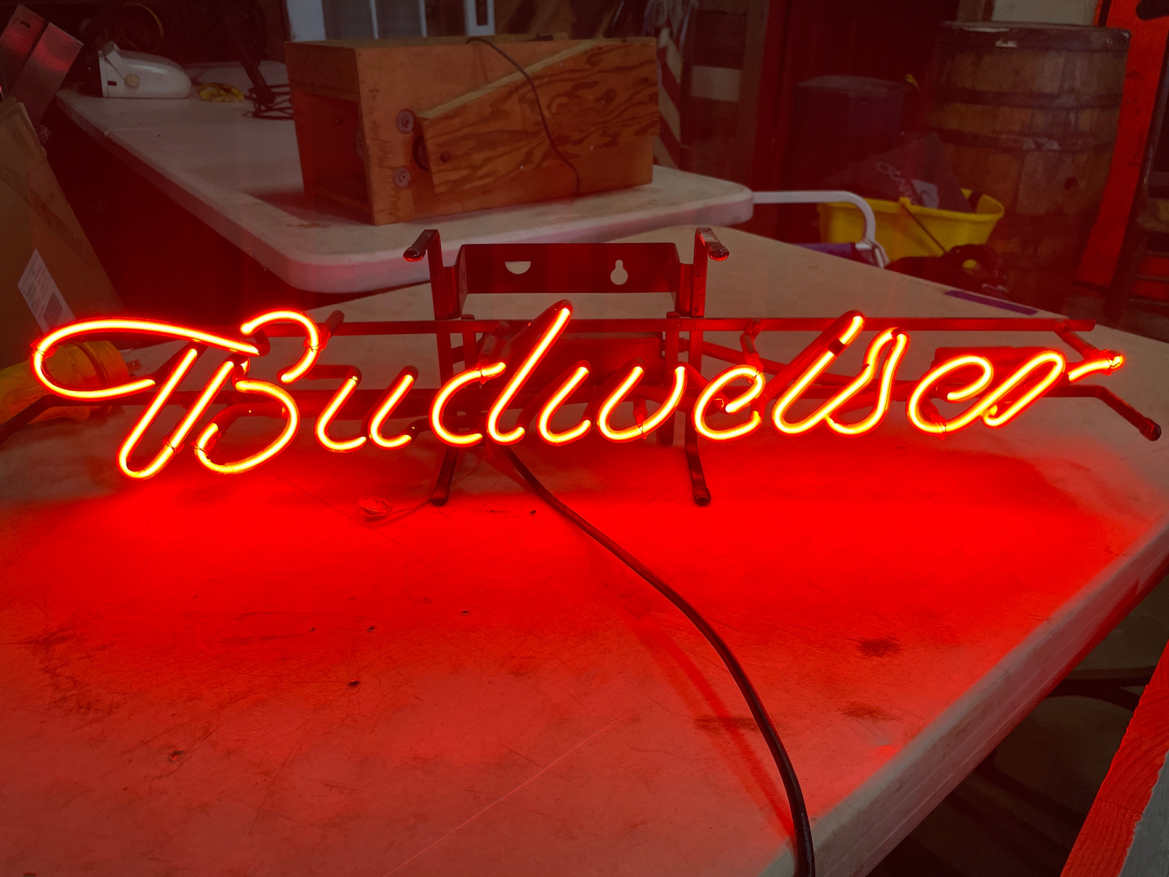 A Budweiser neon sign manufactured by NEON TECH. This illuminated sign displays the brand name “Budweiser” in a script font, glowing vibrant red when lit. It is constructed from clear glass tubing mounted on a black painted metal frame, with visible electrical components and wiring. A label on the frame identifies the manufacturer as “NEON TECH” of San Diego, CA, and states “FOR COMMERCIAL USE ONLY, ” indicating its purpose as an advertising display. It is a contemporary piece, likely late 20th to early 21st century.
