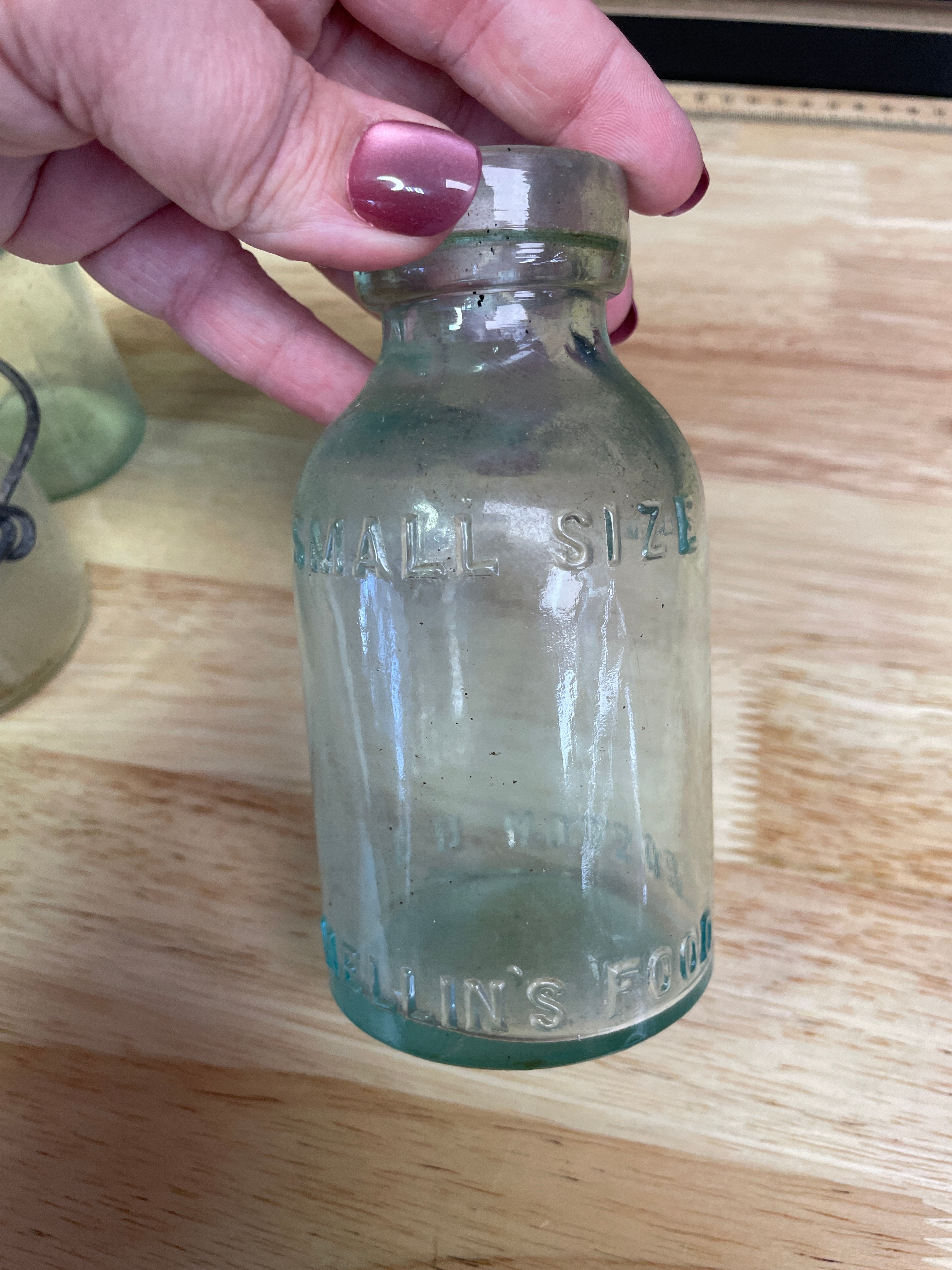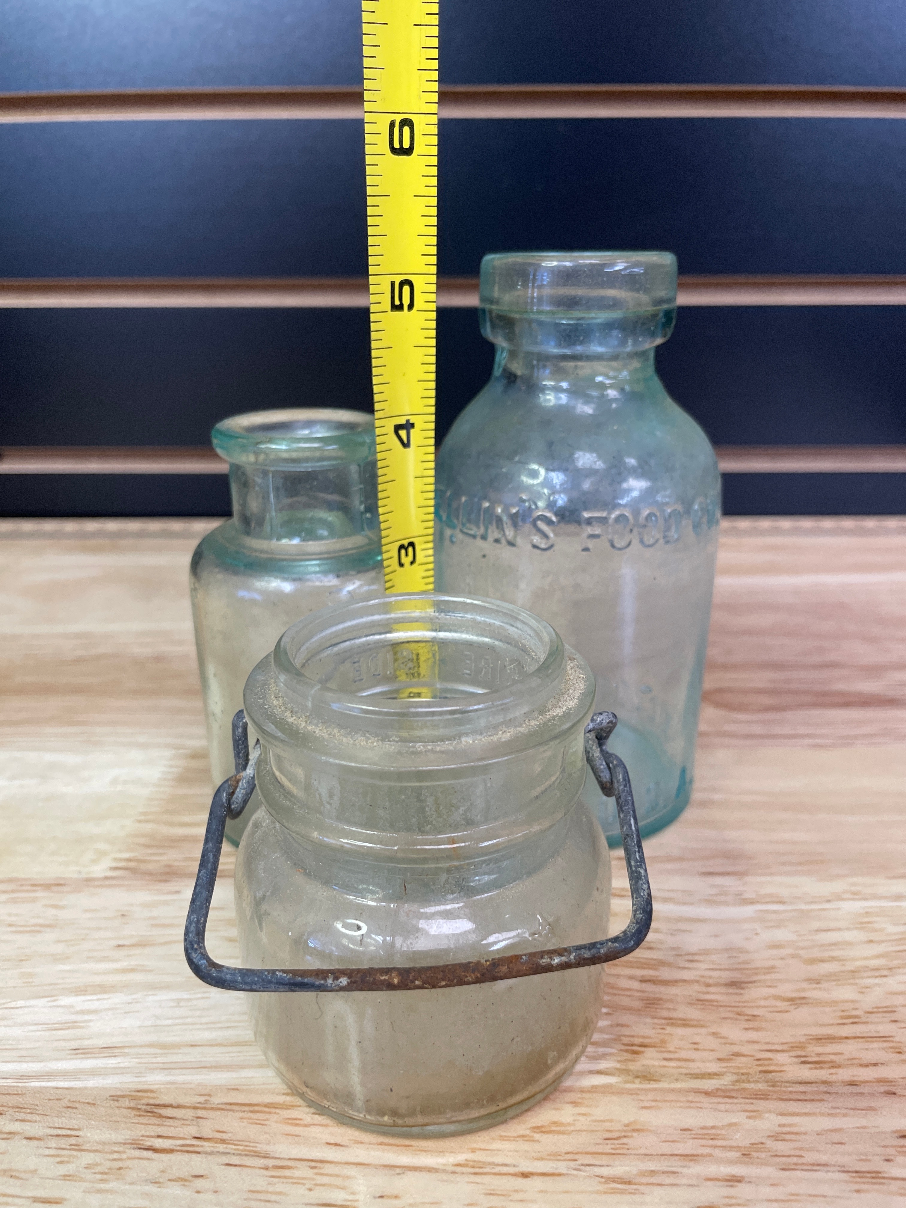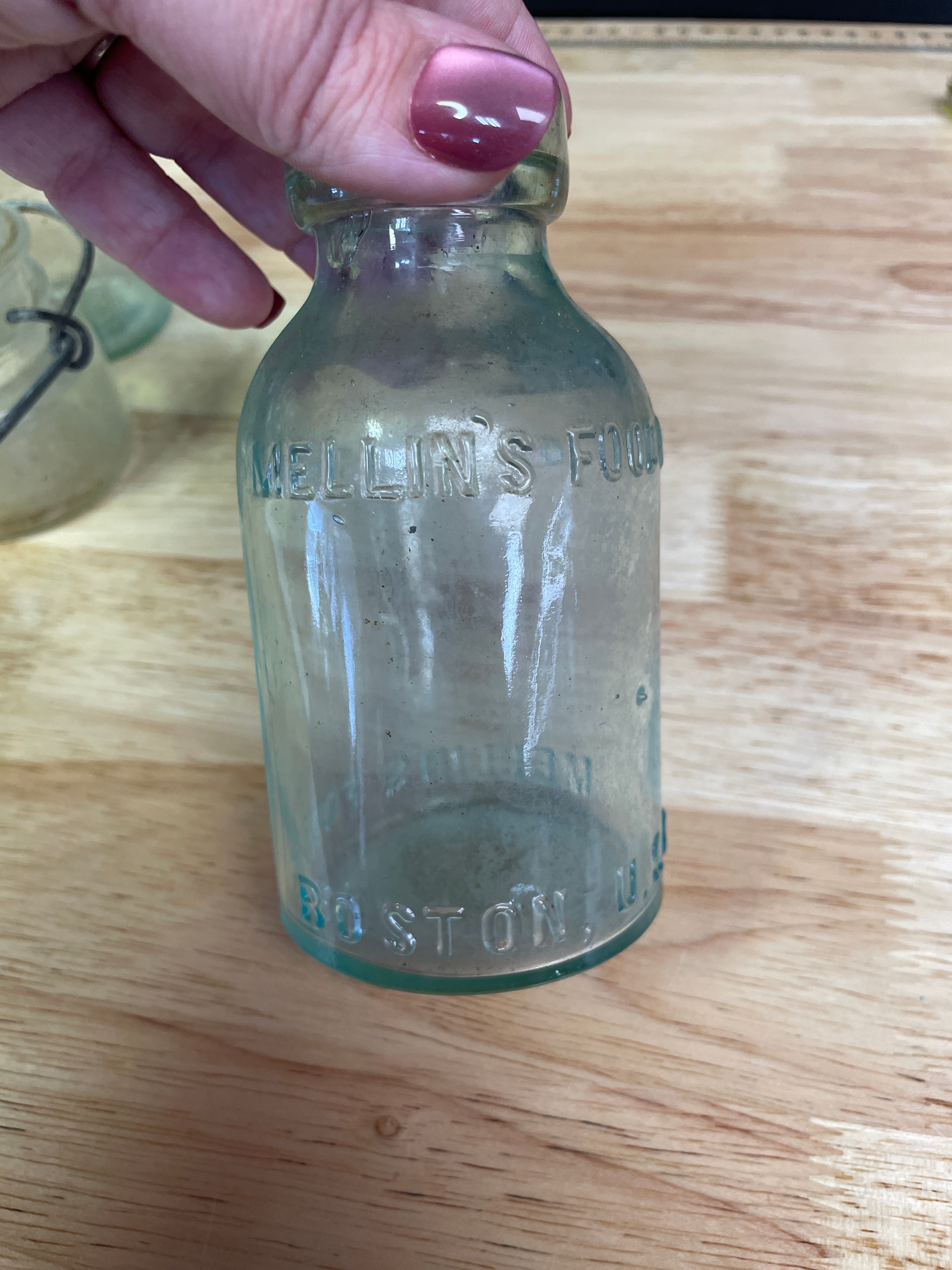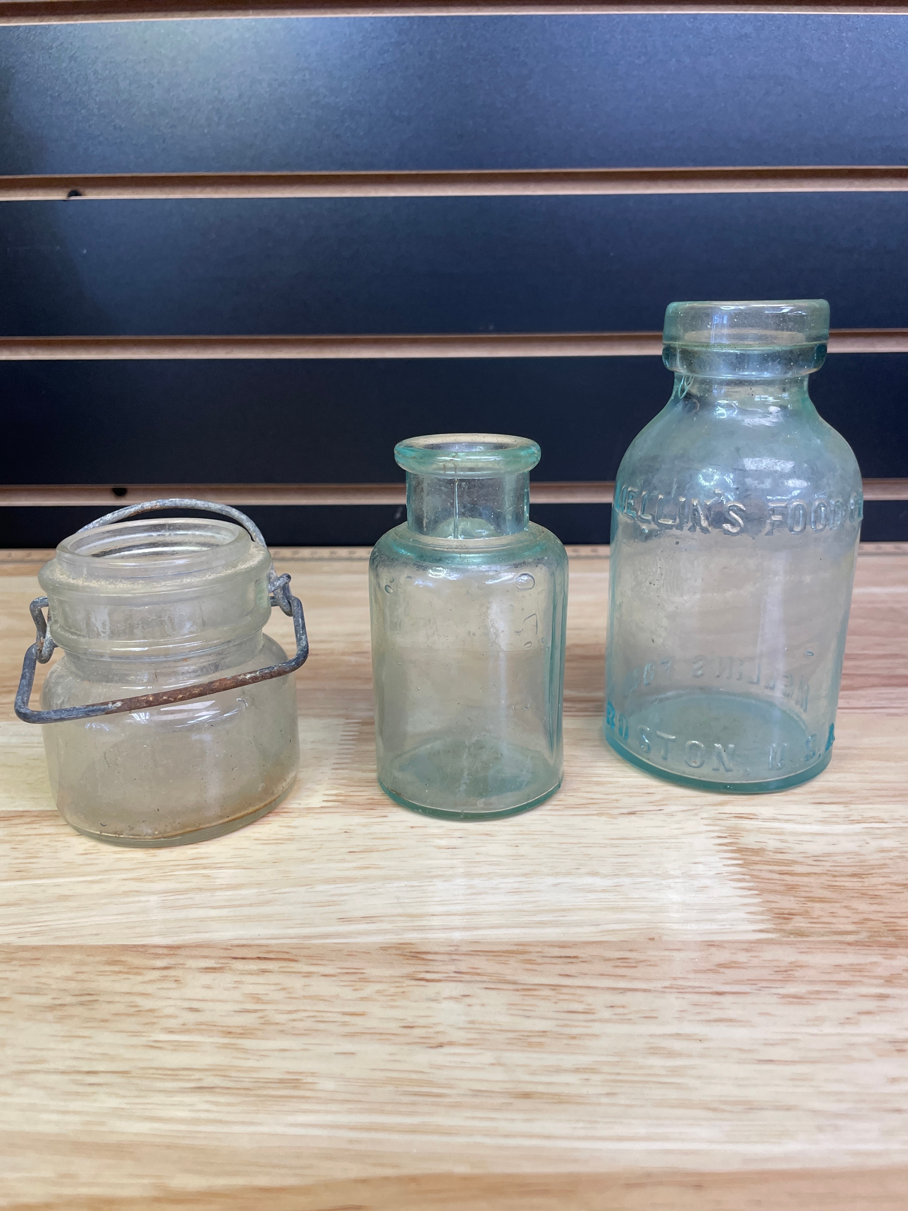 Three vintage glass bottles and jar, including a small clear-to-light-green jar with a wire bail handle embossed ‘WIRE SIDE’ (approx. 3 inches tall), a small plain light greenish-blue bottle, and a larger light greenish-blue bottle embossed ‘MELLIN’S FOOD CO, ‘ ‘SMALL SIZE, ‘ and ‘BOSTON U.S.A., ‘ with a ‘1’ on the bottom.