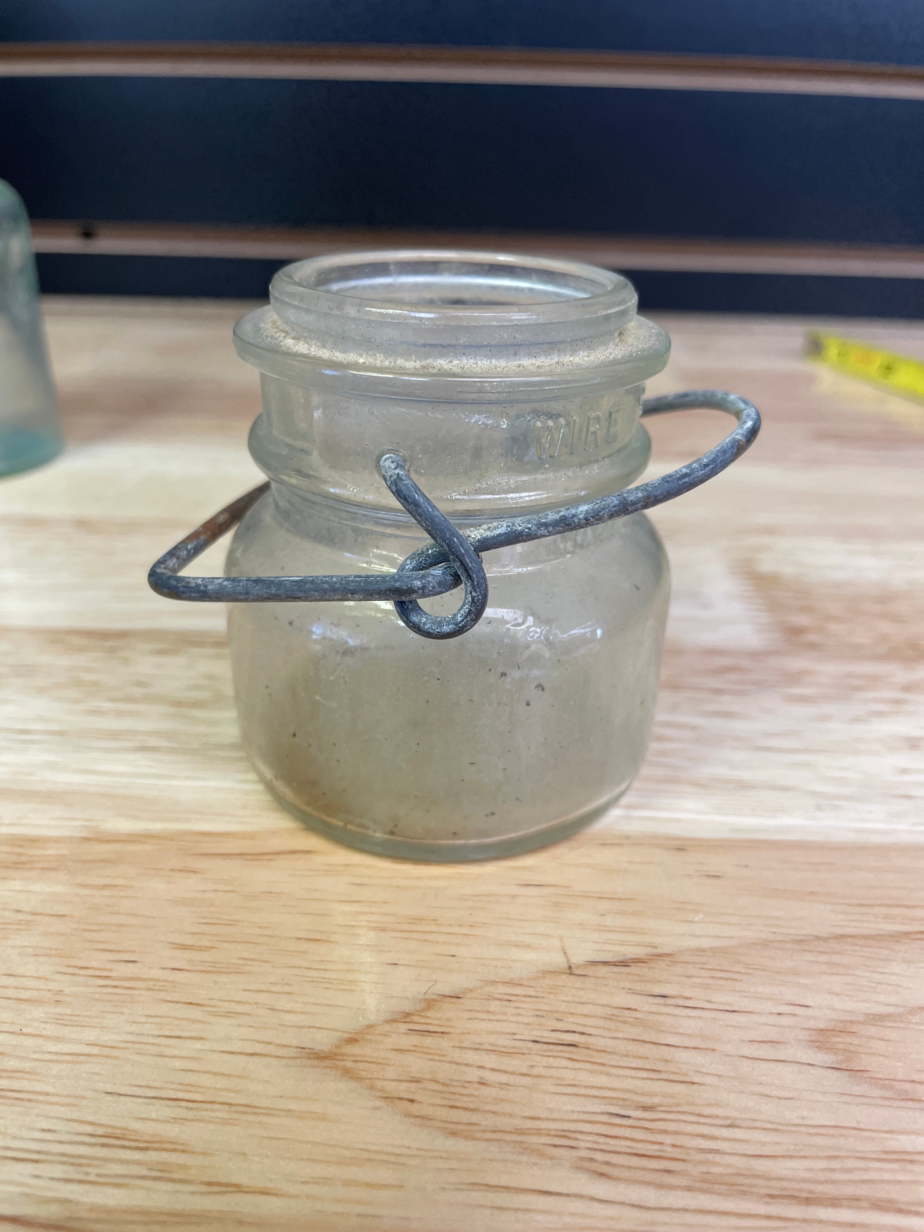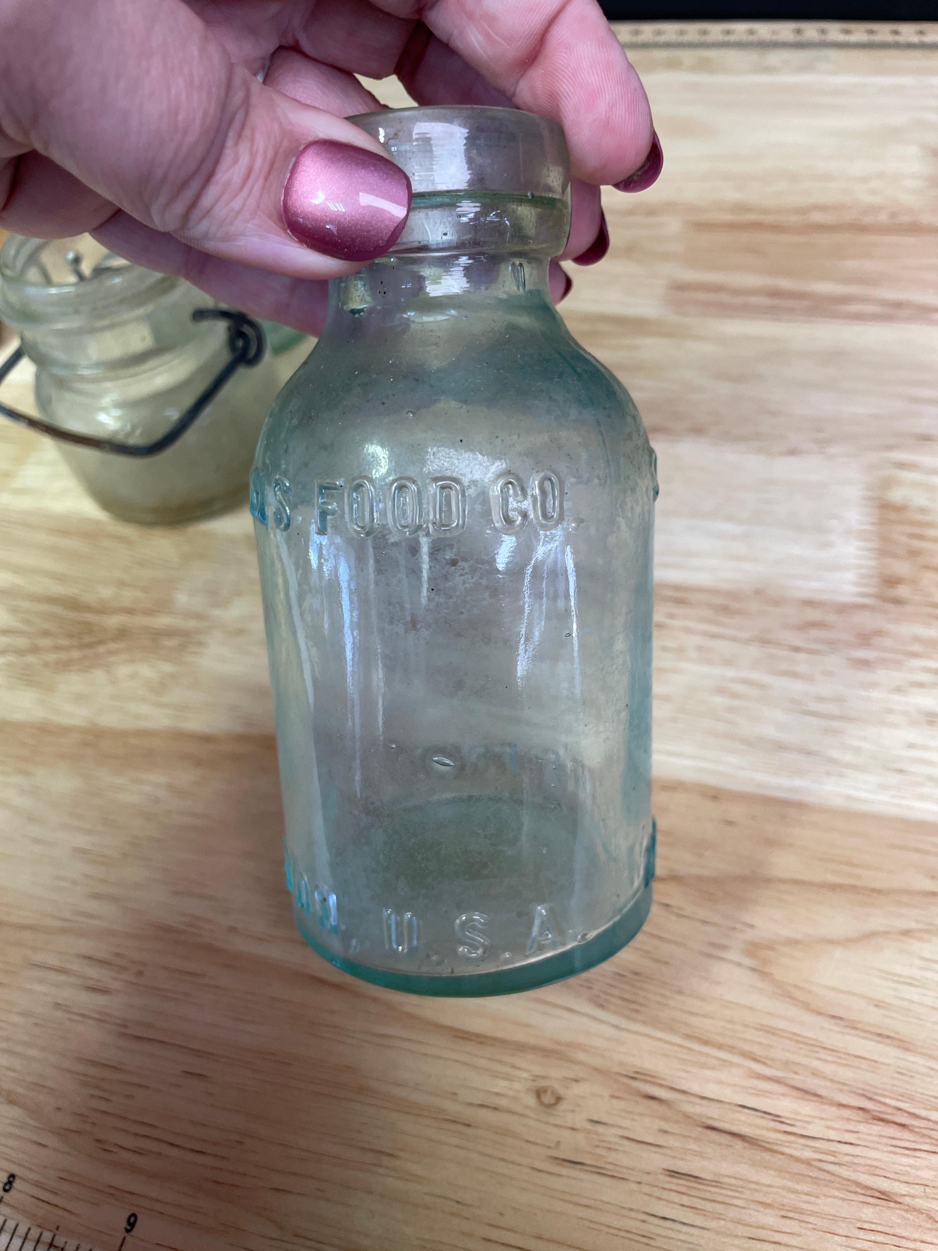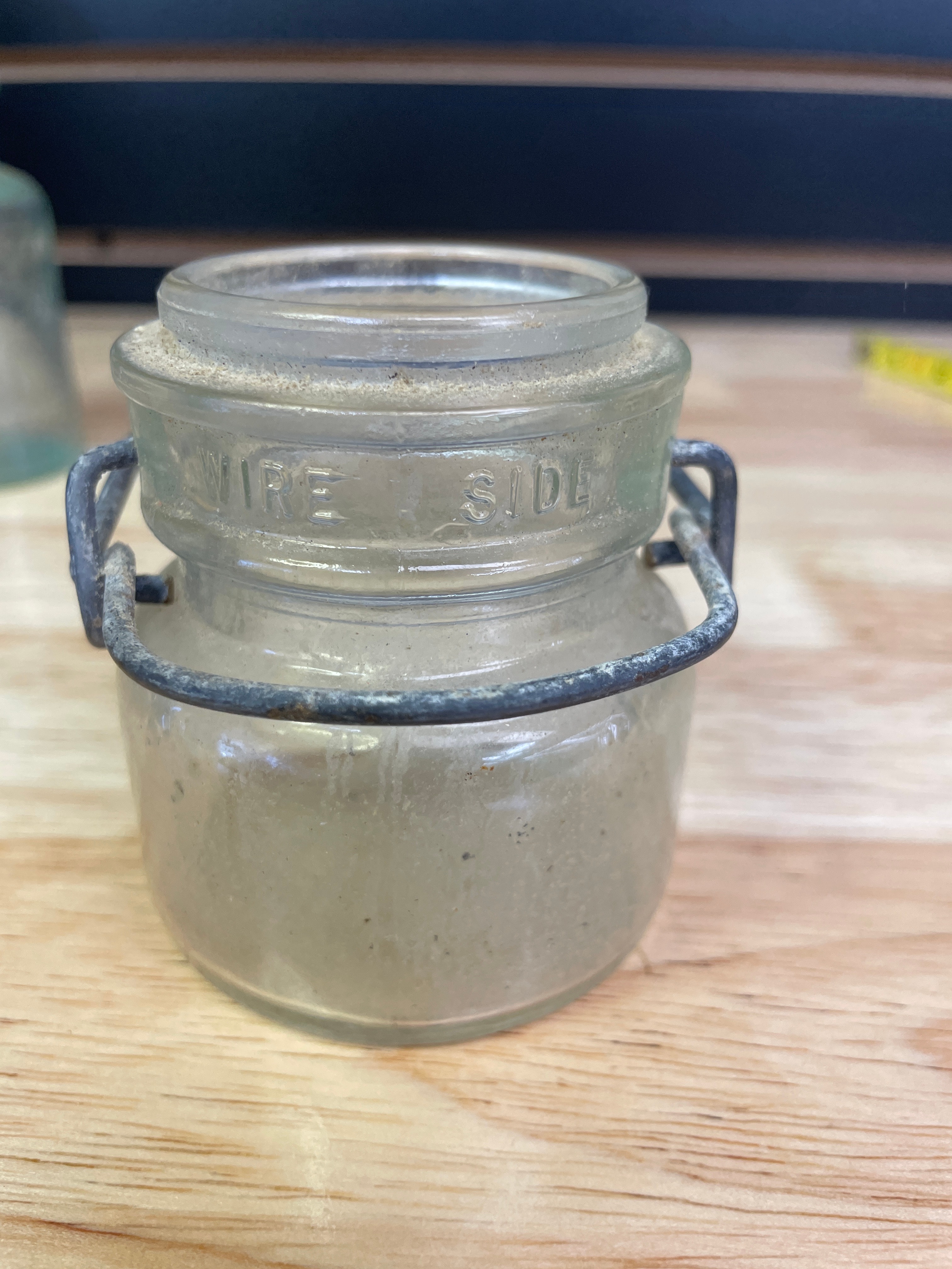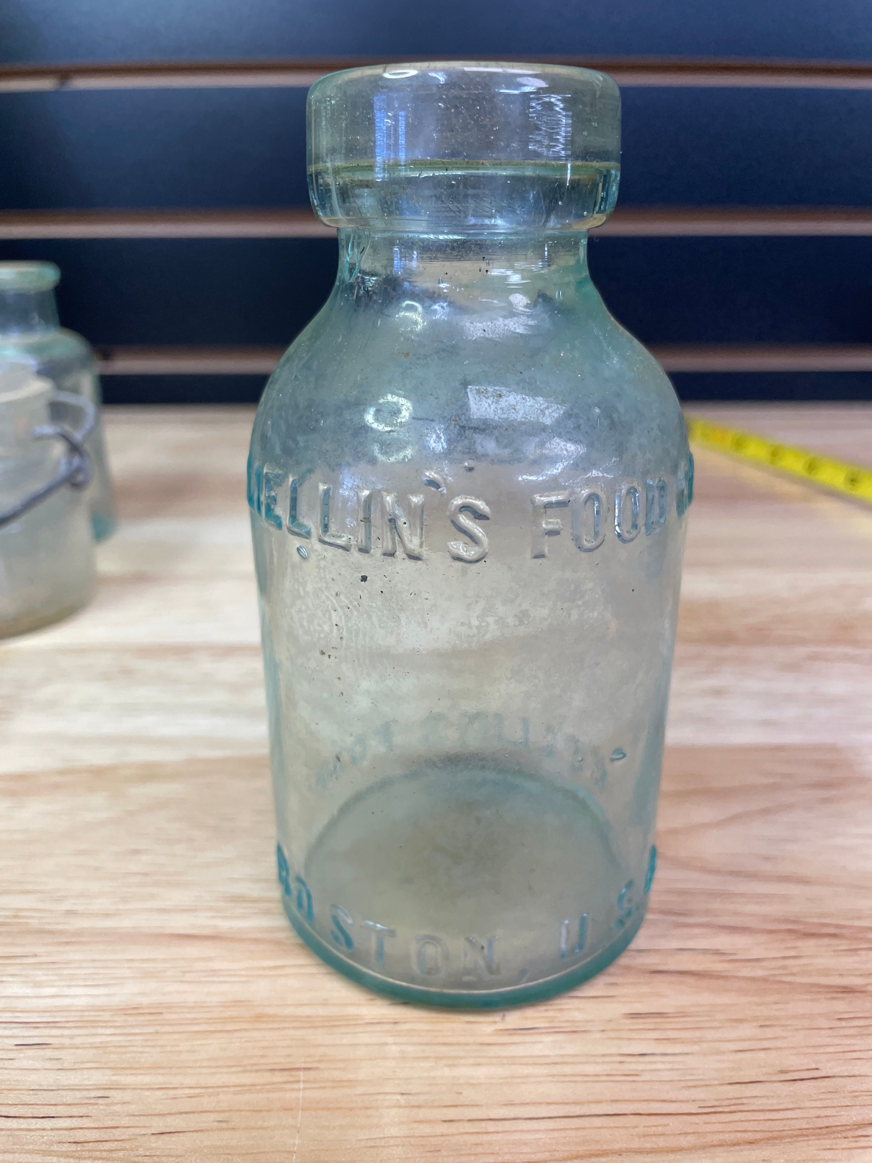 Three vintage glass bottles and jar, including a small clear-to-light-green jar with a wire bail handle embossed ‘WIRE SIDE’ (approx. 3 inches tall), a small plain light greenish-blue bottle, and a larger light greenish-blue bottle embossed ‘MELLIN’S FOOD CO, ‘ ‘SMALL SIZE, ‘ and ‘BOSTON U.S.A., ‘ with a ‘1’ on the bottom.